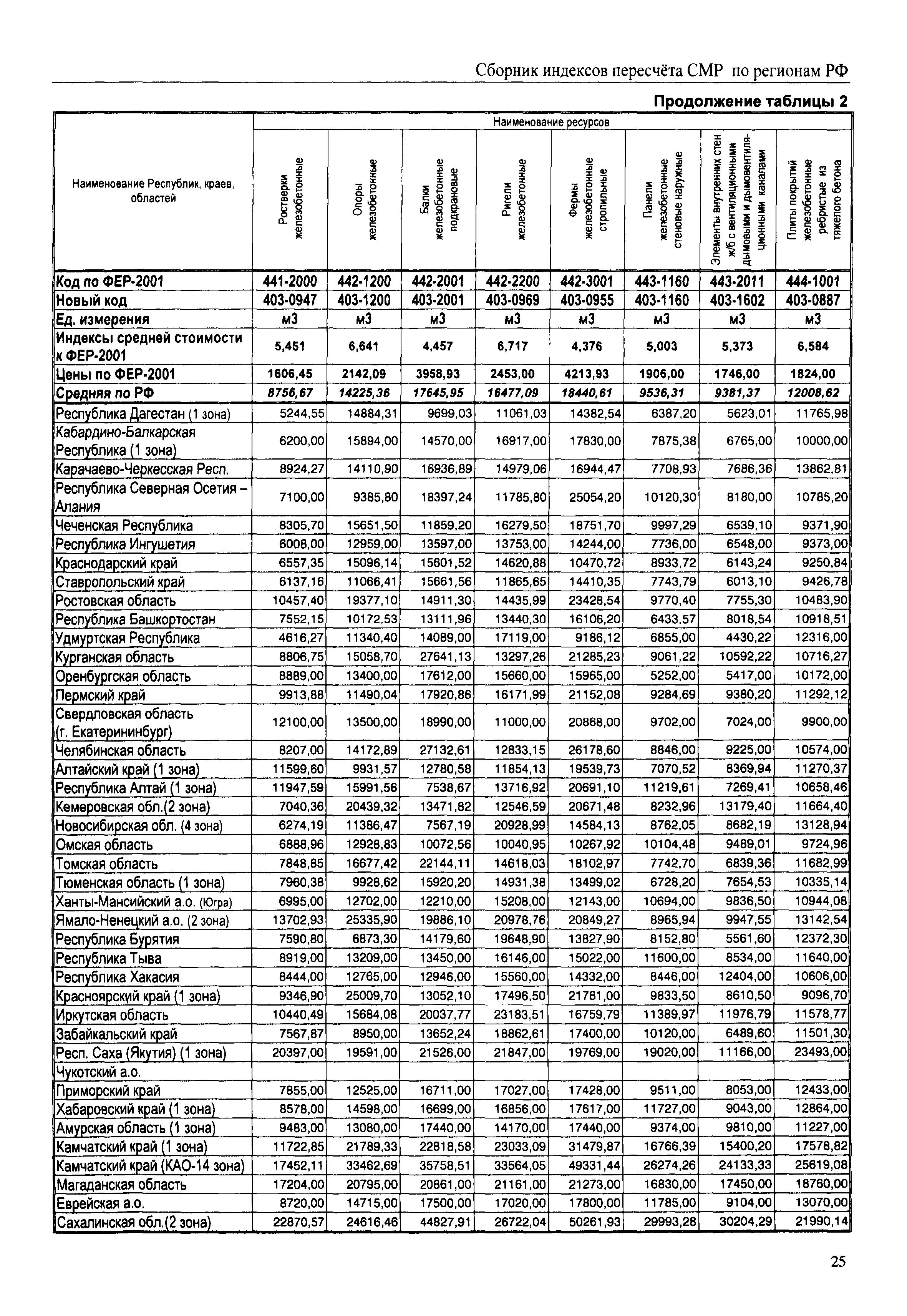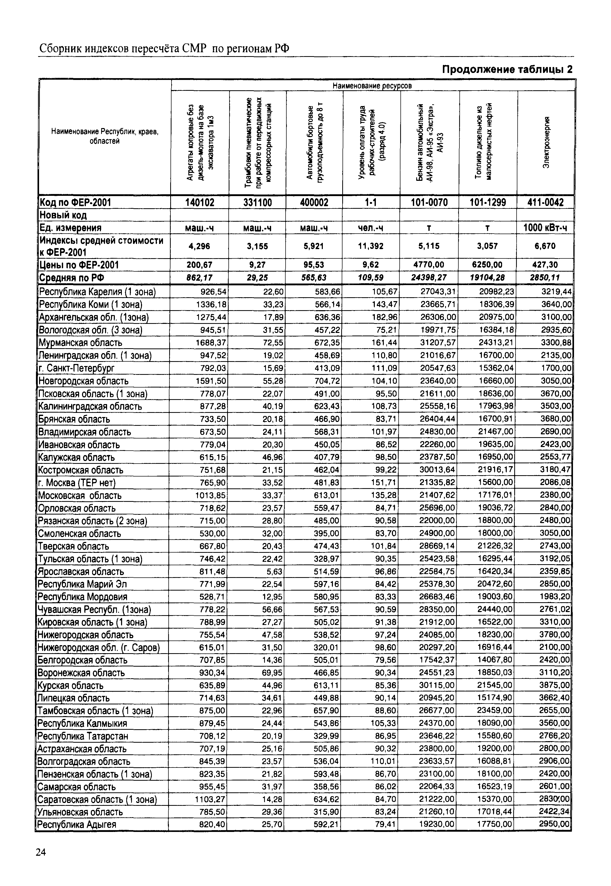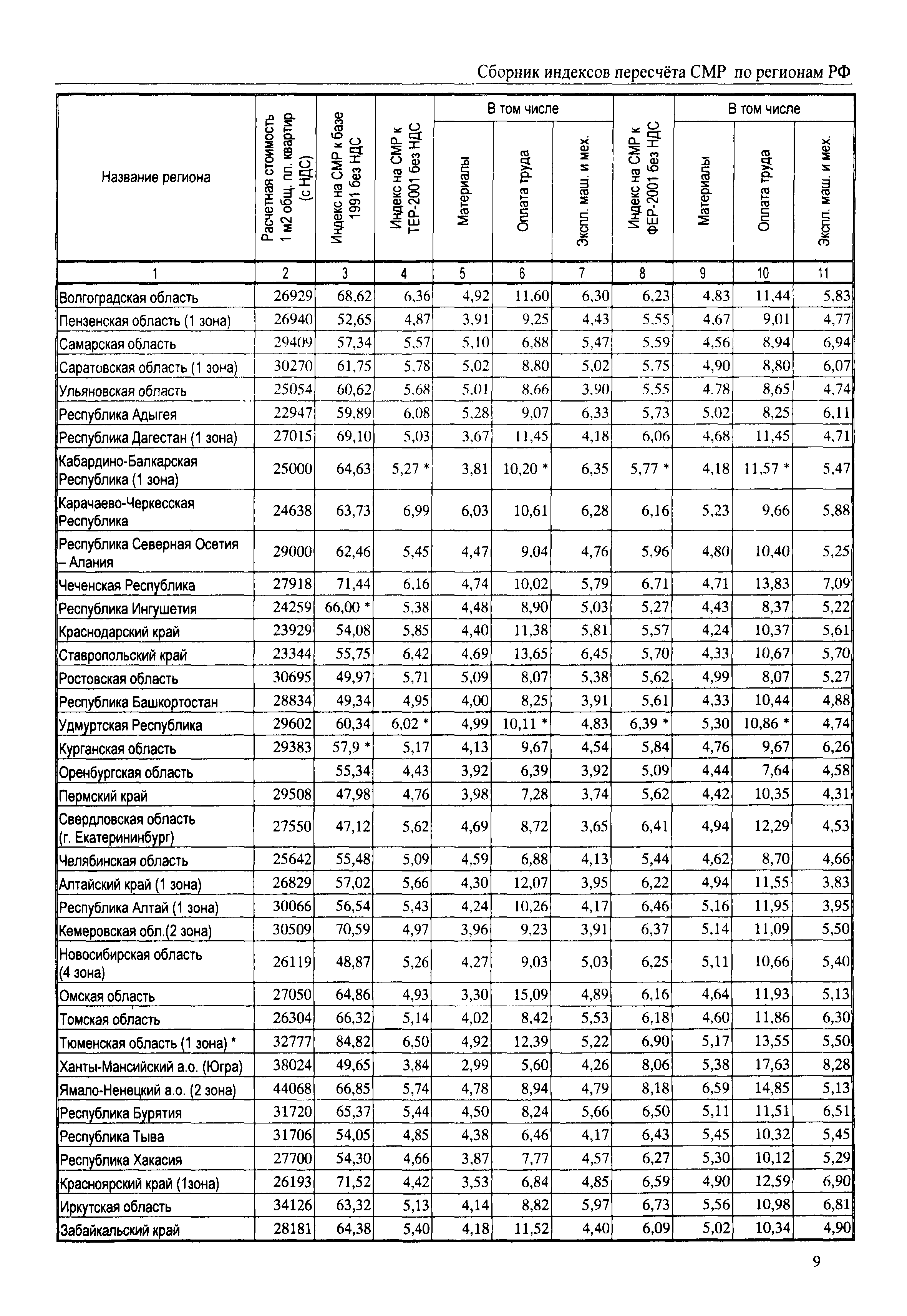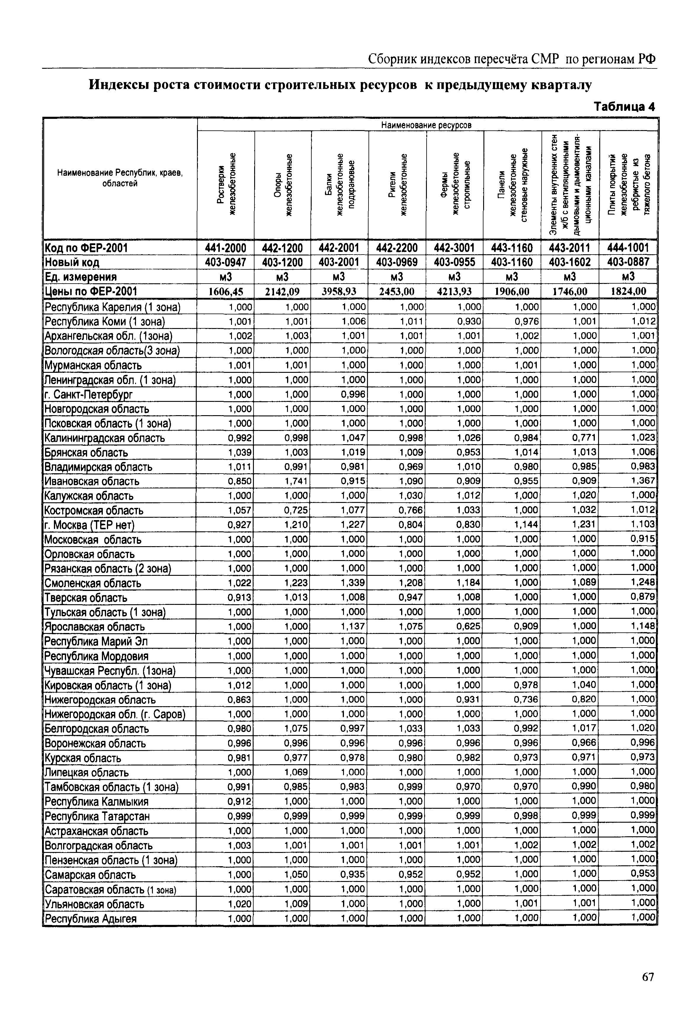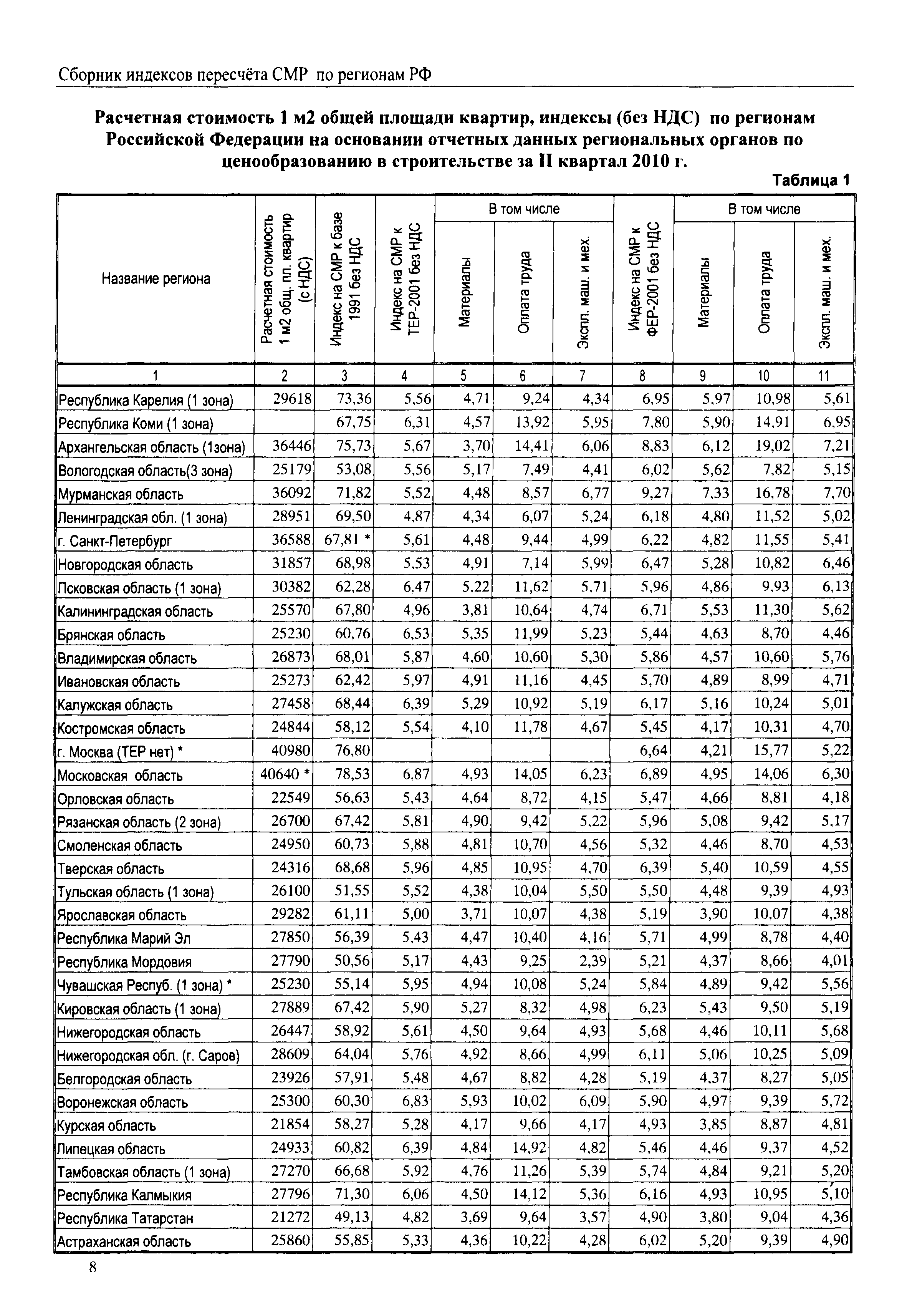 Межрегиональный сборник индексов пересчета сметной стоимости строительно-монтажных работ по субъектам Российской Федерации на II квартал 2010 г.| Статус: | не действует | | Название рус.: | Межрегиональный сборник индексов пересчета сметной стоимости строительно-монтажных работ по субъектам Российской Федерации на II квартал 2010 г. | | Дата добавления в базу: | 01.09.2013 | | Дата актуализации: | 01.09.2013 | | Область применения: | В сборнике приведены сводные таблицы текущих (II квартал 2010 г.) региональных цен на основные ресурсы, применяемые в строительстве, региональные индексы пересчета базисной стоимости строительно-монтажных работ, определяемой с использованием сборников новой сметно-нормативной базы (ФЕР-2001, ТЕР-2001), в территориальный текущий уровень. Индексы разработаны по единой методике, на основании отчетных данных региональных органов по ценообразованию в строительстве о стоимости строительных ресурсов, применяемых в регионе | | Оглавление: | Общая часть Техническая часть (к таблицам 1, 2, 3, 4) Цены на строительную продукцию во II квартале 2010 г. Анализ роста индексов и стоимости 1м2 по субъектам Российской Федерации во II кв. 2010 года. - таблица А Расчетная стоимость 1 м2 общей площади квартир и индексы изменения стоимости строительства по субъектам Российской Федерации за II квартал 2010 г. -Таблица 1 Сметная стоимость строительных ресурсов (без НДС) в руб. -Таблица 2 Индексы на отдельные виды ресурсов (к заложенным в ФЕР-2001) -Таблица 3 Индексы роста стоимости строительных ресурсов к предыдущему кварталу -Таблица 4 Региональные индексы к ФЕР-2001 по основным видам объектов строительства - Таблица 5 Индексы на оборудование за II квартал 2010 г Индексы на прочие работы и затраты за II квартал 2010 г |