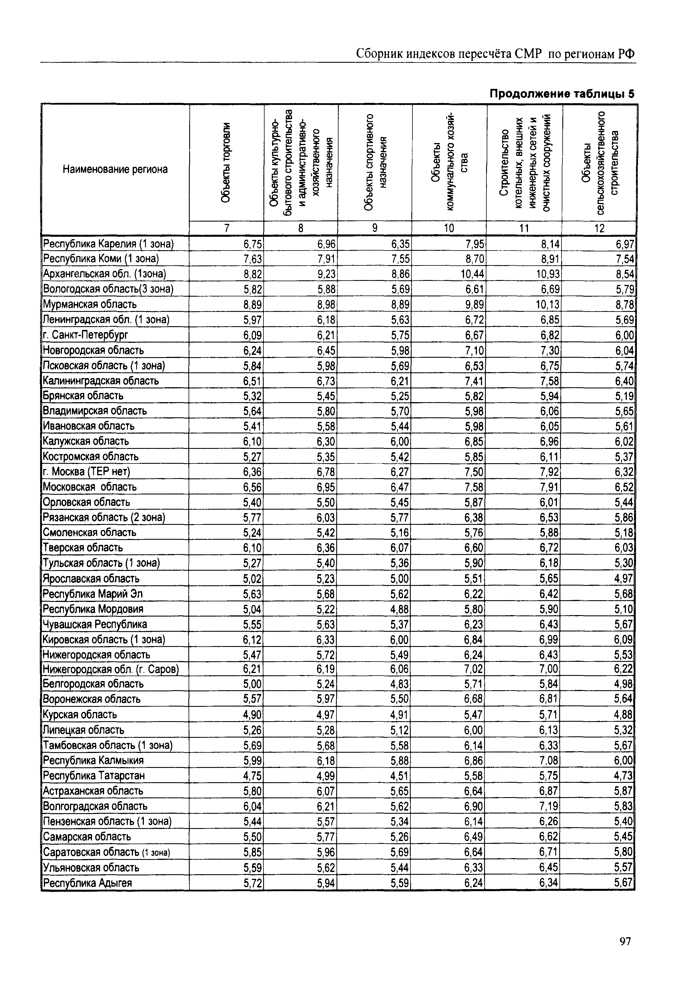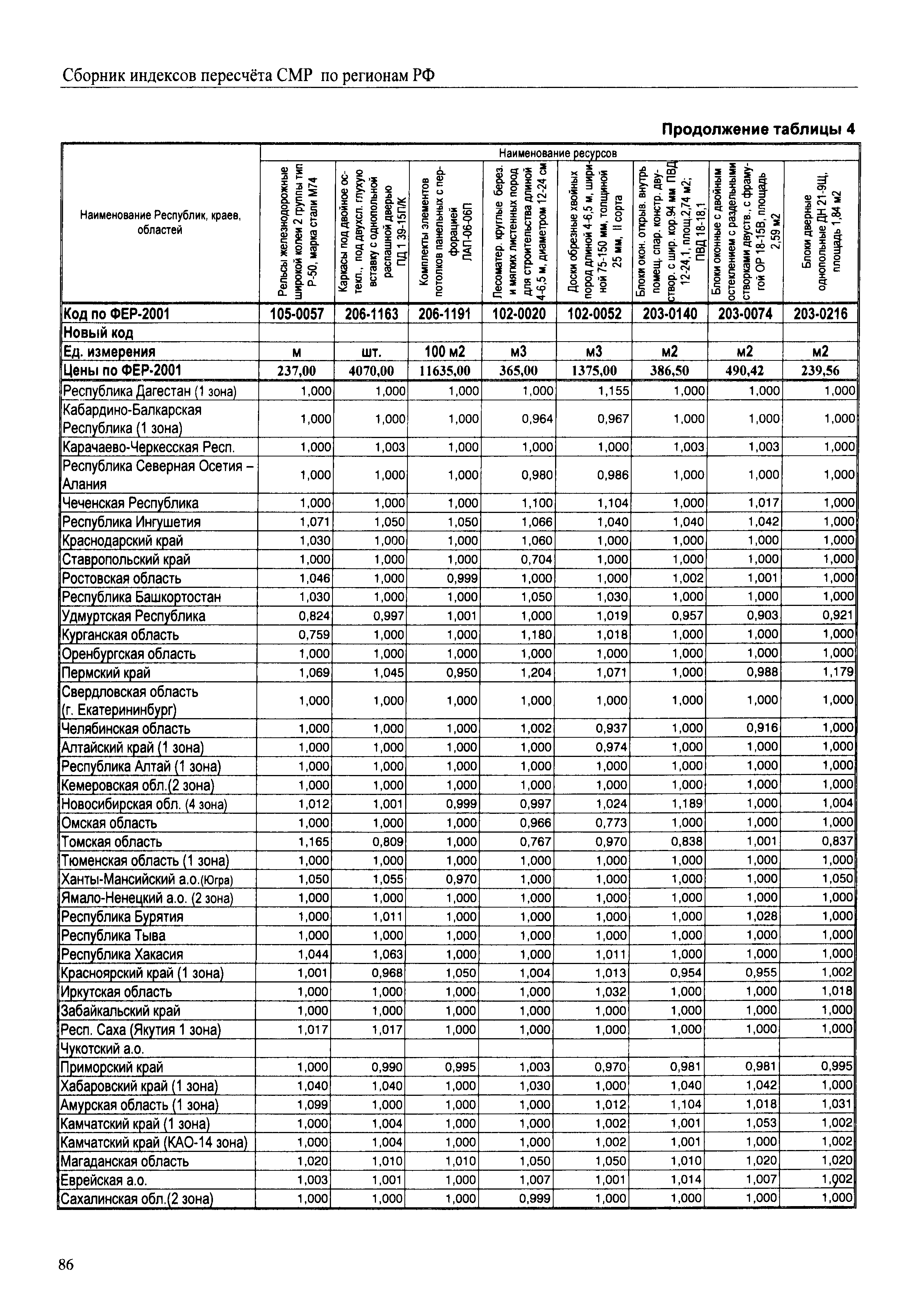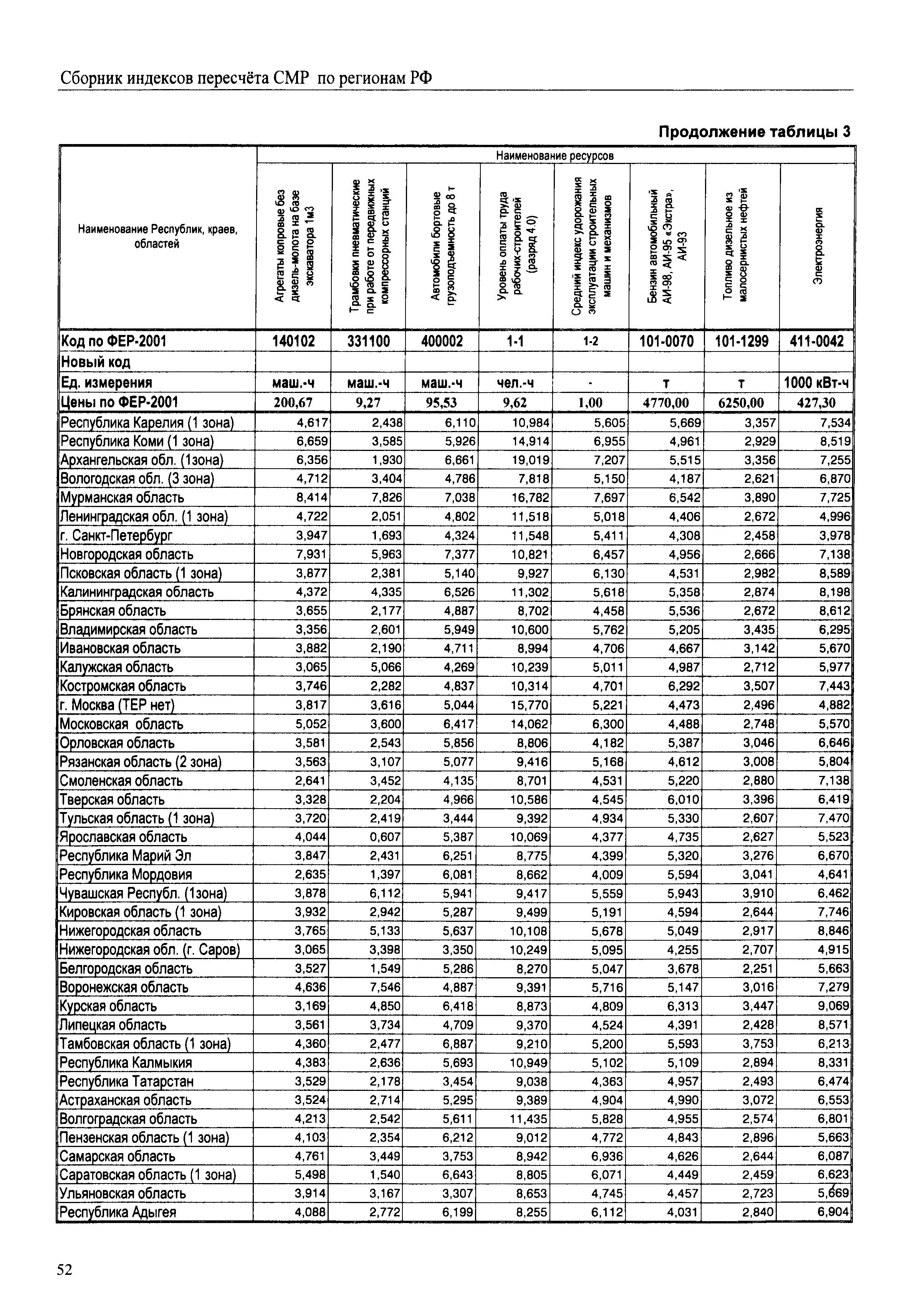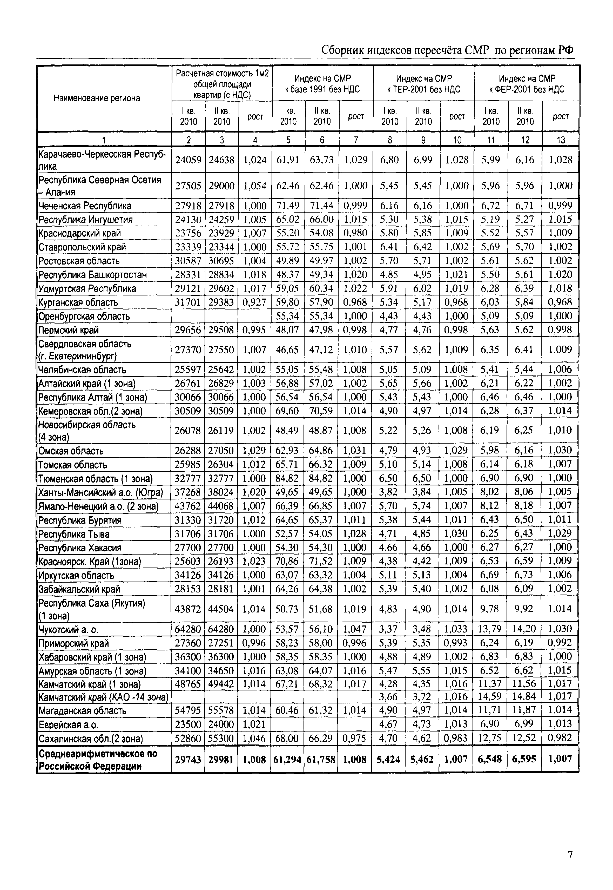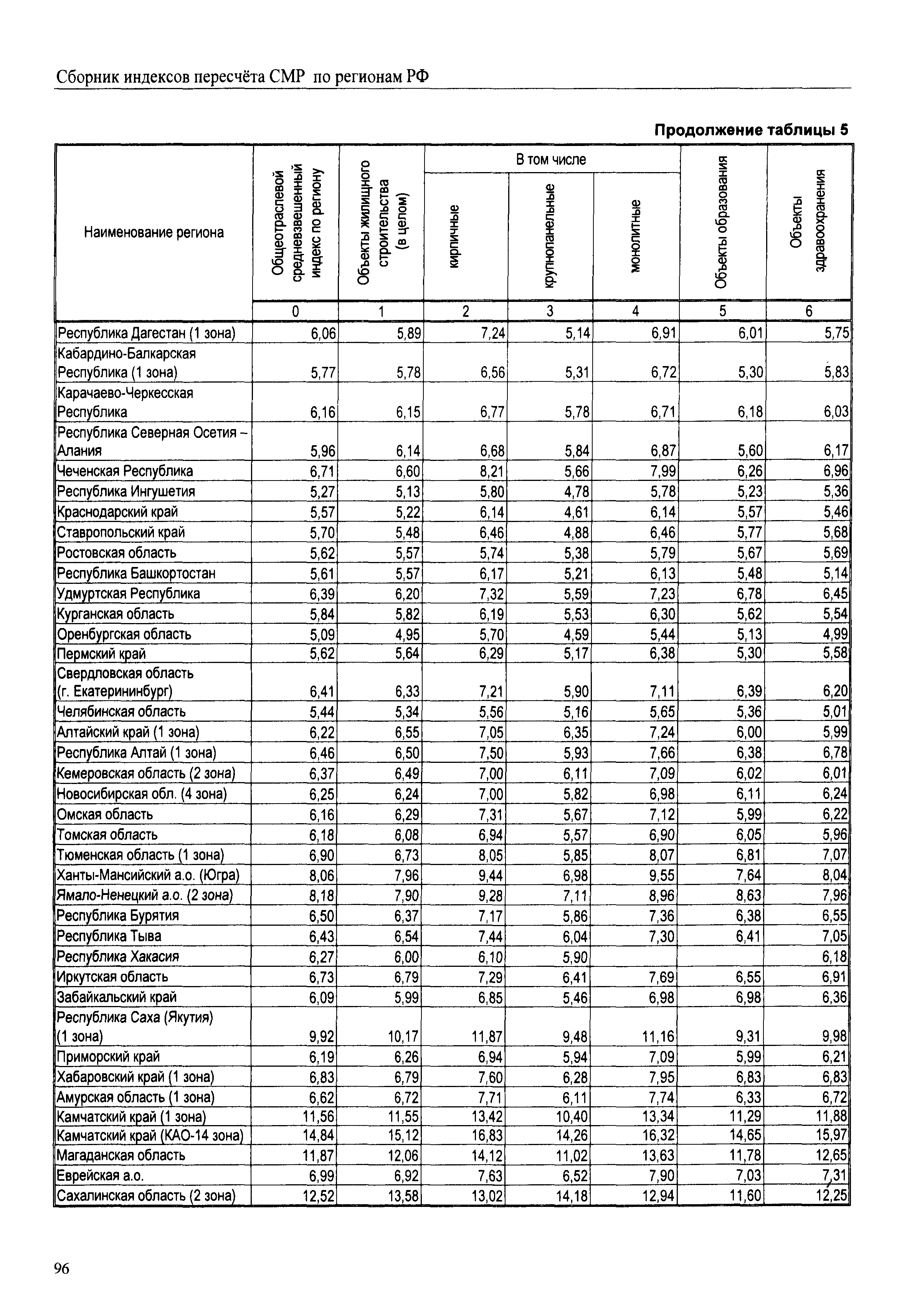 Межрегиональный сборник индексов пересчета сметной стоимости строительно-монтажных работ по субъектам Российской Федерации на II квартал 2010 г.| Статус: | не действует | | Название рус.: | Межрегиональный сборник индексов пересчета сметной стоимости строительно-монтажных работ по субъектам Российской Федерации на II квартал 2010 г. | | Дата добавления в базу: | 01.09.2013 | | Дата актуализации: | 01.09.2013 | | Область применения: | В сборнике приведены сводные таблицы текущих (II квартал 2010 г.) региональных цен на основные ресурсы, применяемые в строительстве, региональные индексы пересчета базисной стоимости строительно-монтажных работ, определяемой с использованием сборников новой сметно-нормативной базы (ФЕР-2001, ТЕР-2001), в территориальный текущий уровень. Индексы разработаны по единой методике, на основании отчетных данных региональных органов по ценообразованию в строительстве о стоимости строительных ресурсов, применяемых в регионе | | Оглавление: | Общая часть Техническая часть (к таблицам 1, 2, 3, 4) Цены на строительную продукцию во II квартале 2010 г. Анализ роста индексов и стоимости 1м2 по субъектам Российской Федерации во II кв. 2010 года. - таблица А Расчетная стоимость 1 м2 общей площади квартир и индексы изменения стоимости строительства по субъектам Российской Федерации за II квартал 2010 г. -Таблица 1 Сметная стоимость строительных ресурсов (без НДС) в руб. -Таблица 2 Индексы на отдельные виды ресурсов (к заложенным в ФЕР-2001) -Таблица 3 Индексы роста стоимости строительных ресурсов к предыдущему кварталу -Таблица 4 Региональные индексы к ФЕР-2001 по основным видам объектов строительства - Таблица 5 Индексы на оборудование за II квартал 2010 г Индексы на прочие работы и затраты за II квартал 2010 г |