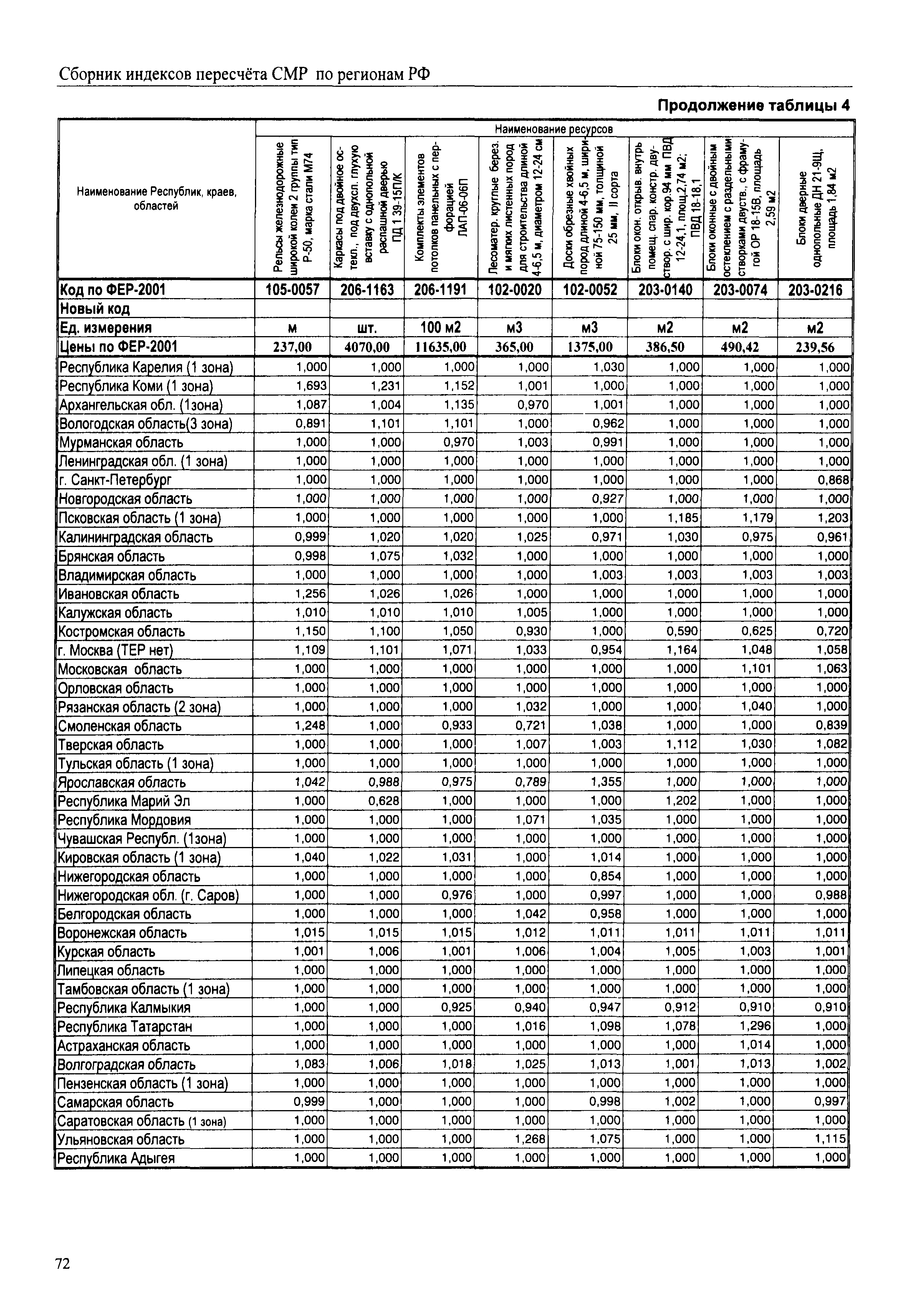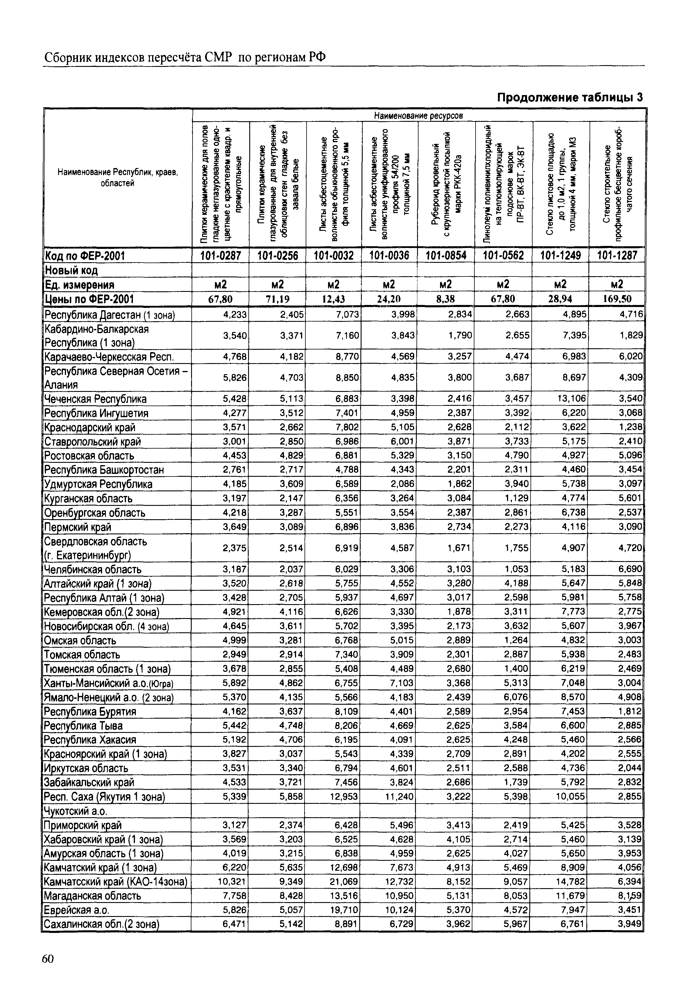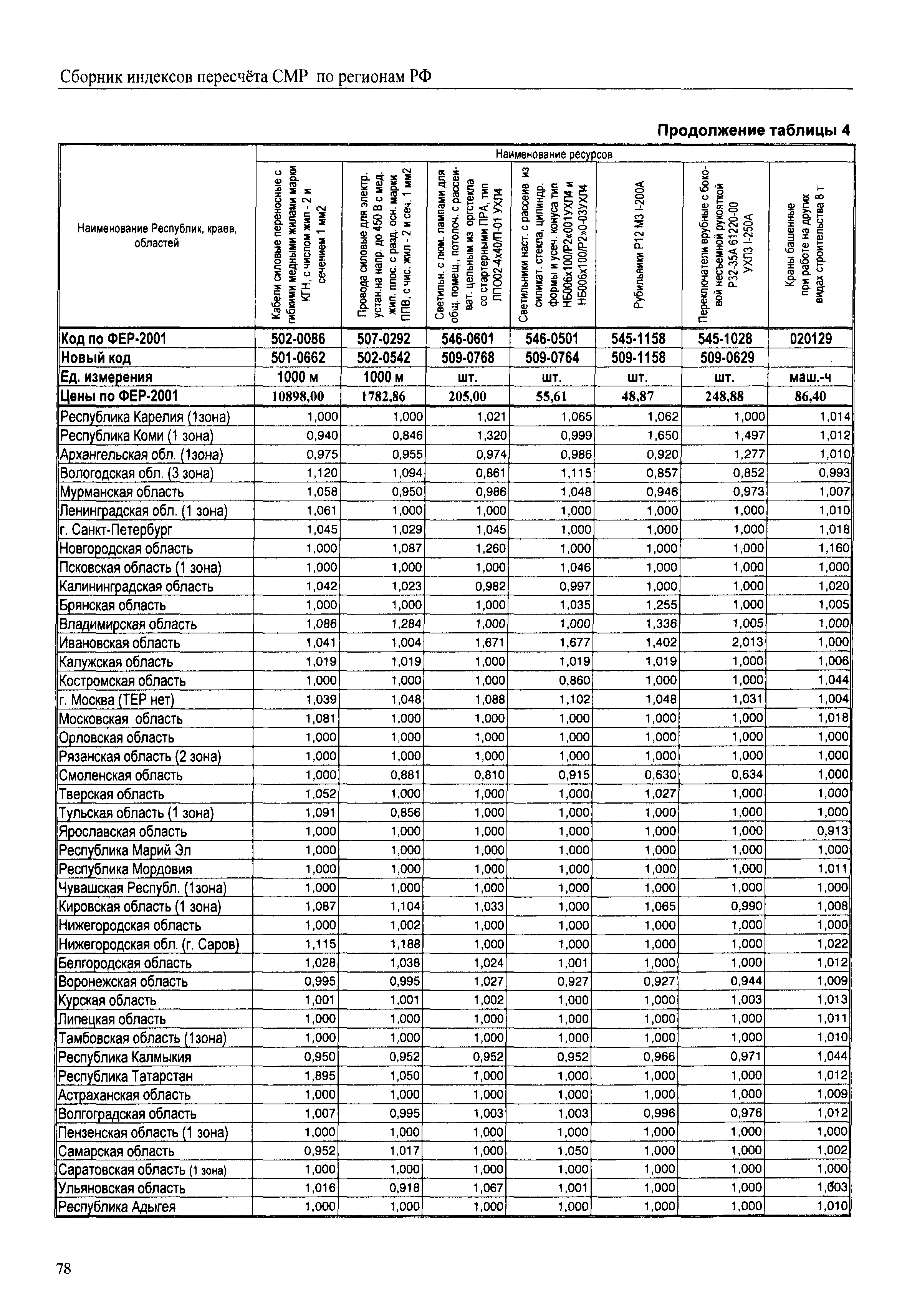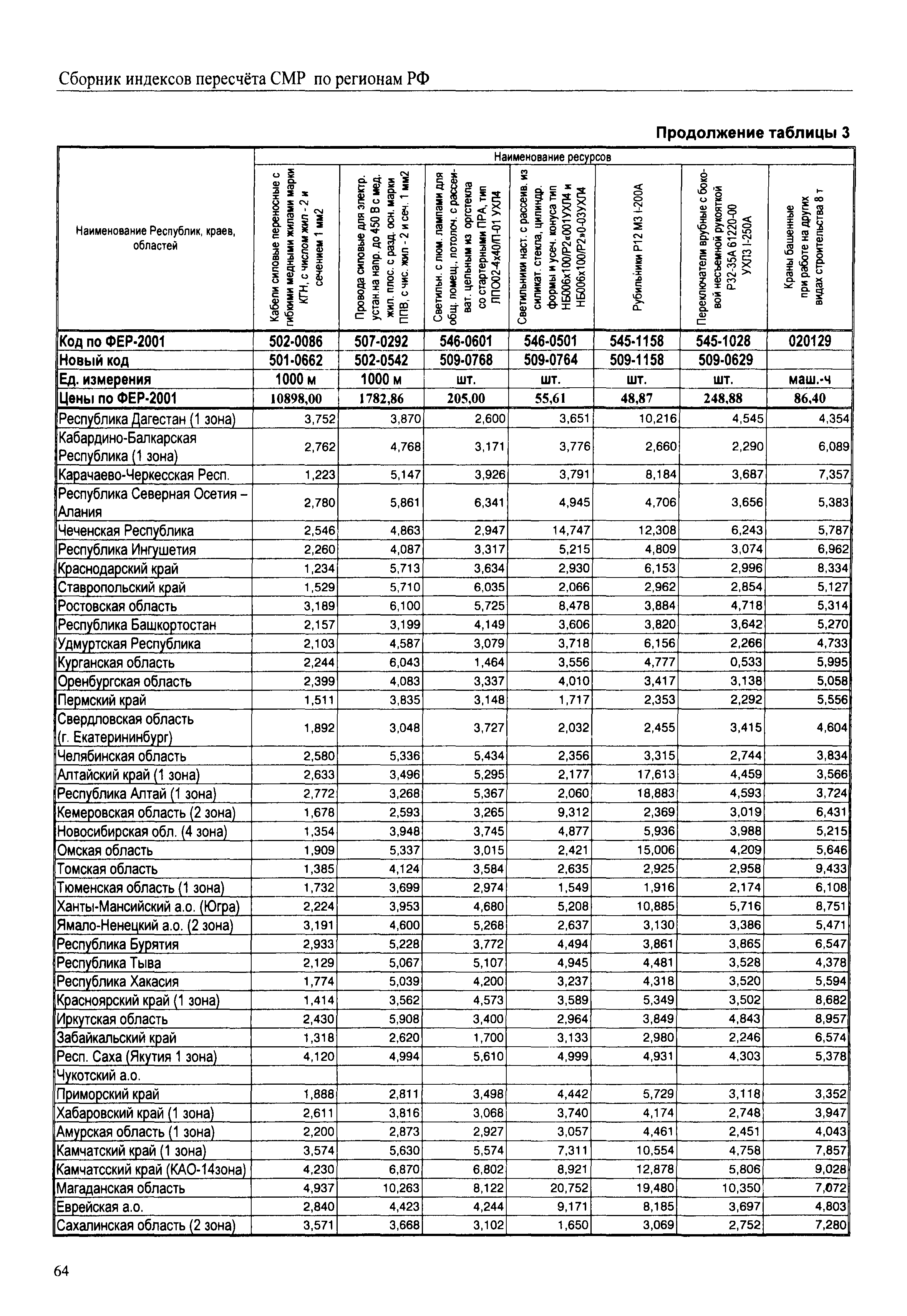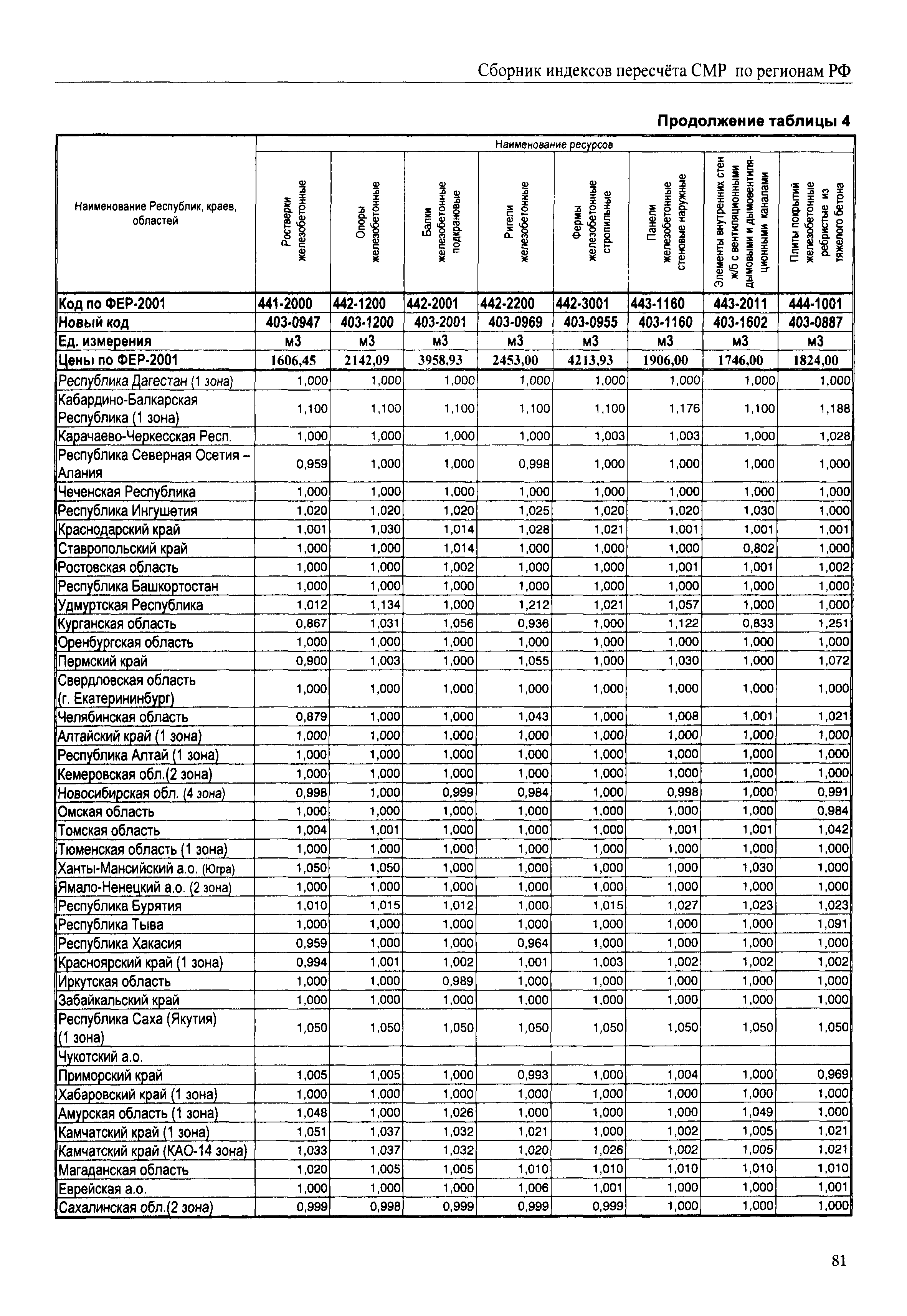 Межрегиональный сборник индексов пересчета сметной стоимости строительно-монтажных работ по субъектам Российской Федерации на II квартал 2010 г.| Статус: | не действует | | Название рус.: | Межрегиональный сборник индексов пересчета сметной стоимости строительно-монтажных работ по субъектам Российской Федерации на II квартал 2010 г. | | Дата добавления в базу: | 01.09.2013 | | Дата актуализации: | 01.09.2013 | | Область применения: | В сборнике приведены сводные таблицы текущих (II квартал 2010 г.) региональных цен на основные ресурсы, применяемые в строительстве, региональные индексы пересчета базисной стоимости строительно-монтажных работ, определяемой с использованием сборников новой сметно-нормативной базы (ФЕР-2001, ТЕР-2001), в территориальный текущий уровень. Индексы разработаны по единой методике, на основании отчетных данных региональных органов по ценообразованию в строительстве о стоимости строительных ресурсов, применяемых в регионе | | Оглавление: | Общая часть Техническая часть (к таблицам 1, 2, 3, 4) Цены на строительную продукцию во II квартале 2010 г. Анализ роста индексов и стоимости 1м2 по субъектам Российской Федерации во II кв. 2010 года. - таблица А Расчетная стоимость 1 м2 общей площади квартир и индексы изменения стоимости строительства по субъектам Российской Федерации за II квартал 2010 г. -Таблица 1 Сметная стоимость строительных ресурсов (без НДС) в руб. -Таблица 2 Индексы на отдельные виды ресурсов (к заложенным в ФЕР-2001) -Таблица 3 Индексы роста стоимости строительных ресурсов к предыдущему кварталу -Таблица 4 Региональные индексы к ФЕР-2001 по основным видам объектов строительства - Таблица 5 Индексы на оборудование за II квартал 2010 г Индексы на прочие работы и затраты за II квартал 2010 г |
