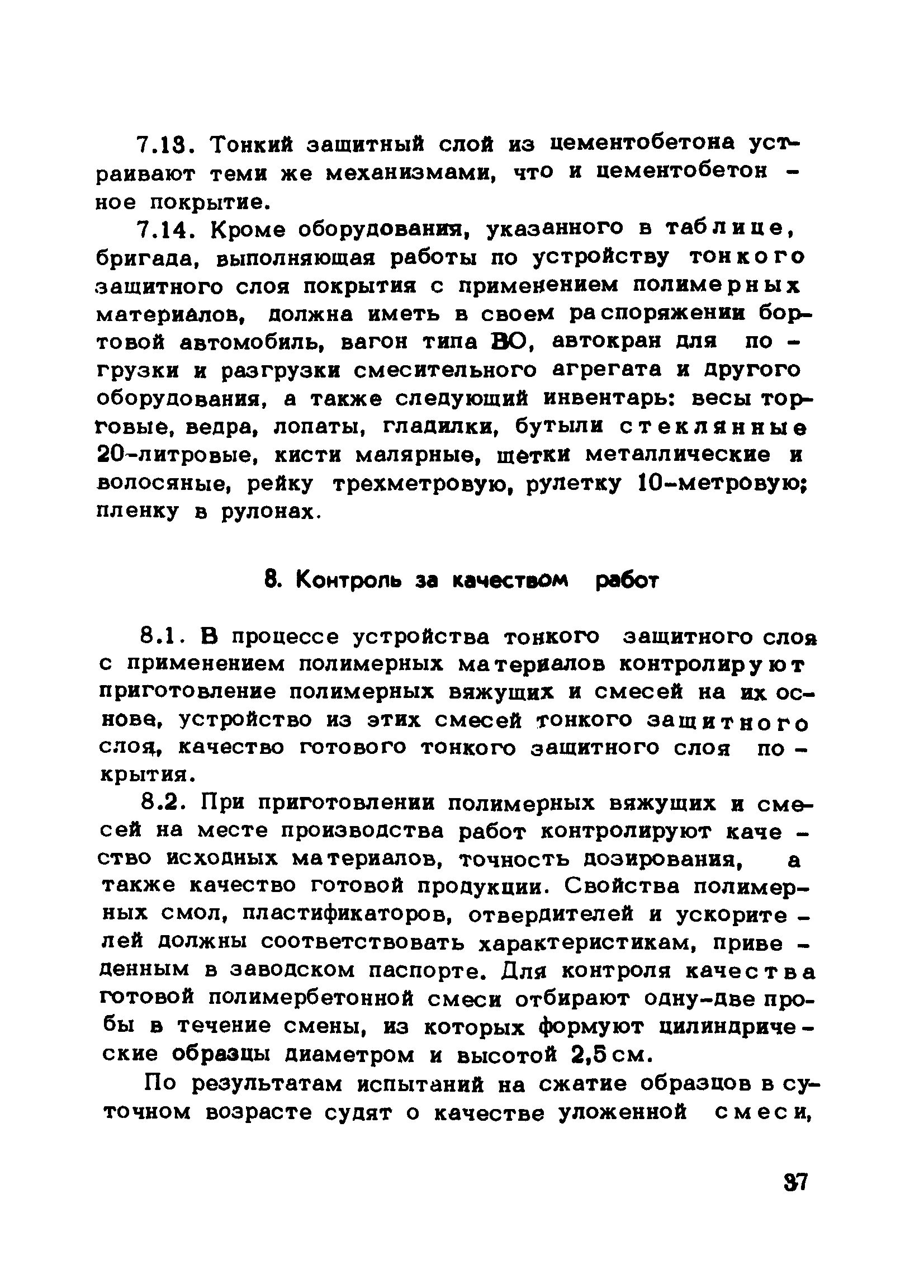| Оглавление: | Предисловие 1 Общие положения 2 Требования к материалам для устройства тонкого защитного слоя покрытия 3 Требования к конструкции тонких защитных слоев 4 Подготовка покрытий к устройству тонких защитных слоев 5 Устройство тонкого защитного слоя на покрытии с применением полимерных материалов 6 Устройство тонкого защитного слоя на покрытии с применением цементобетона 7 Механизация устройства тонкого защитного слоя на покрытии 8 Контроль за качеством работ 9 Техника безопасности Приложение |