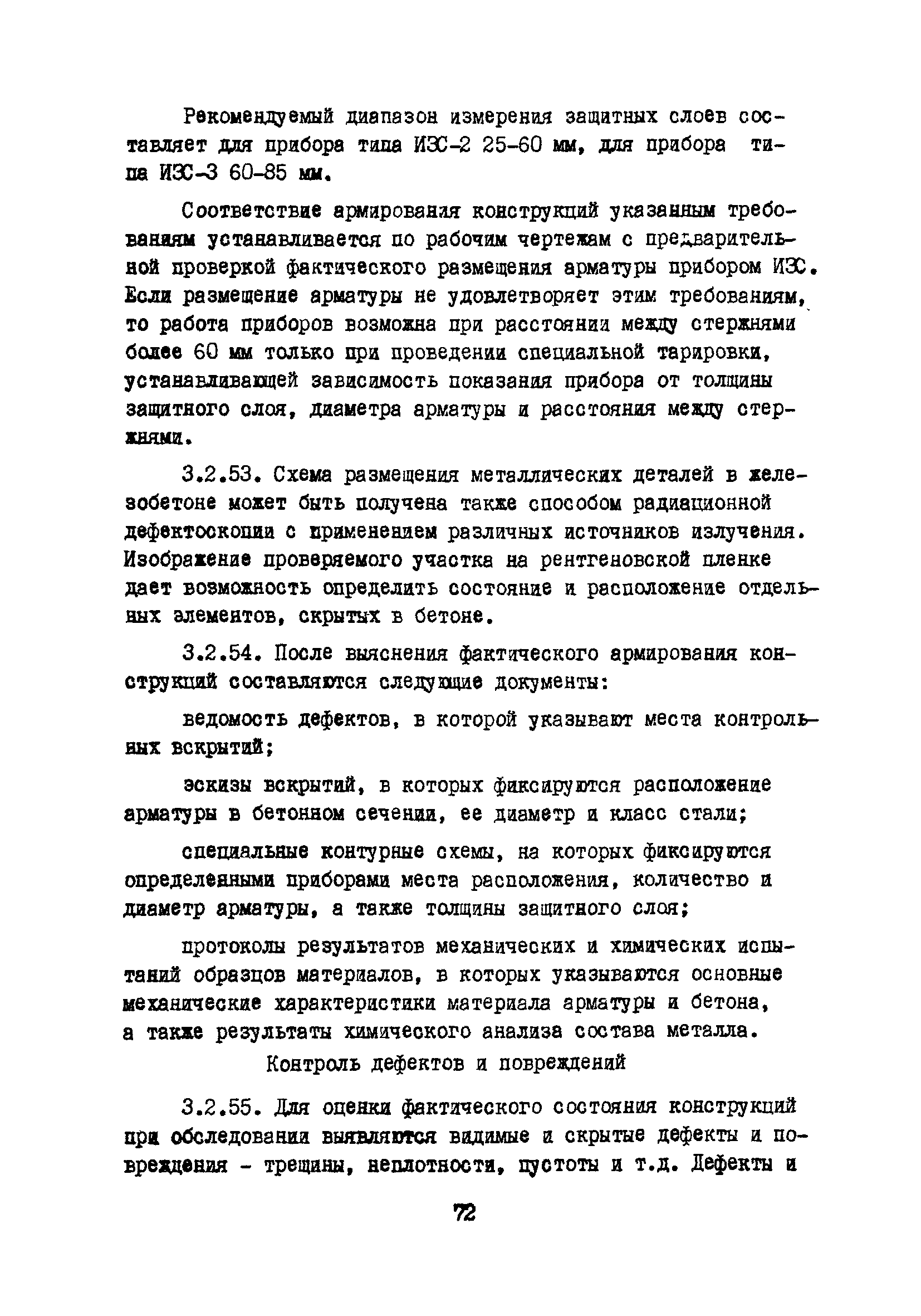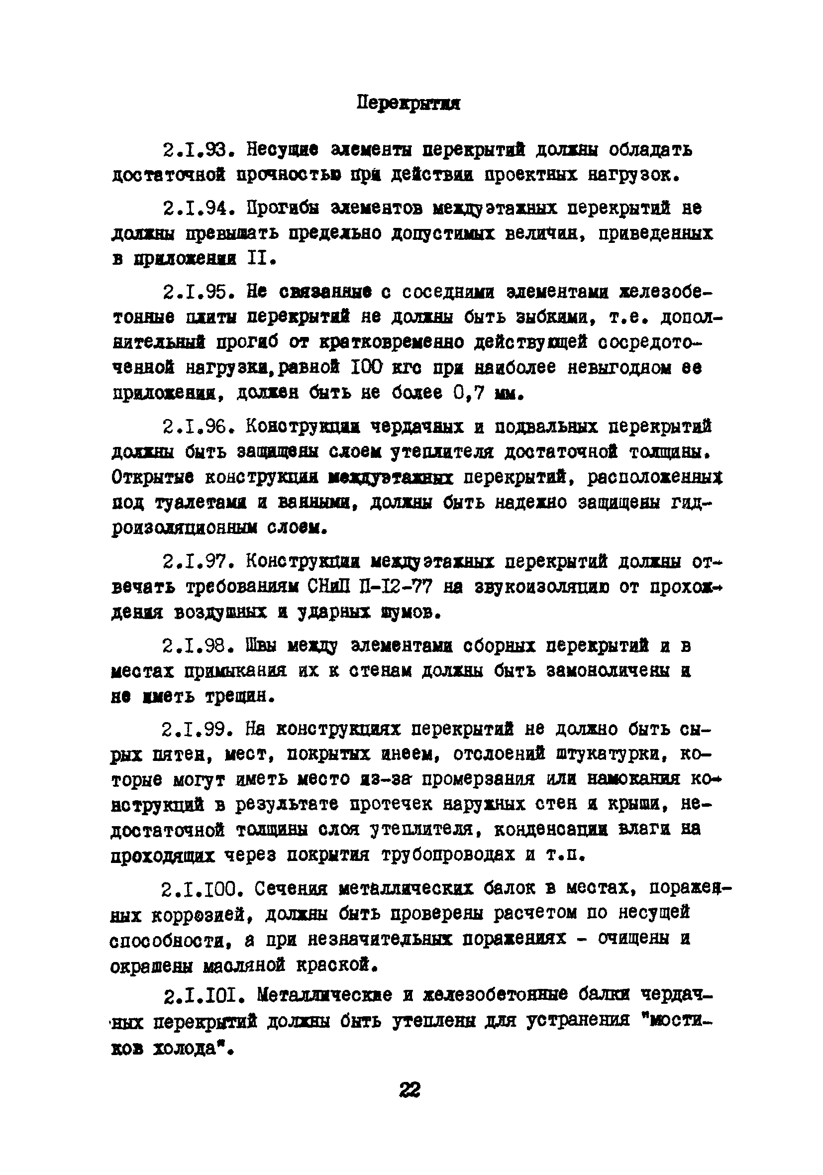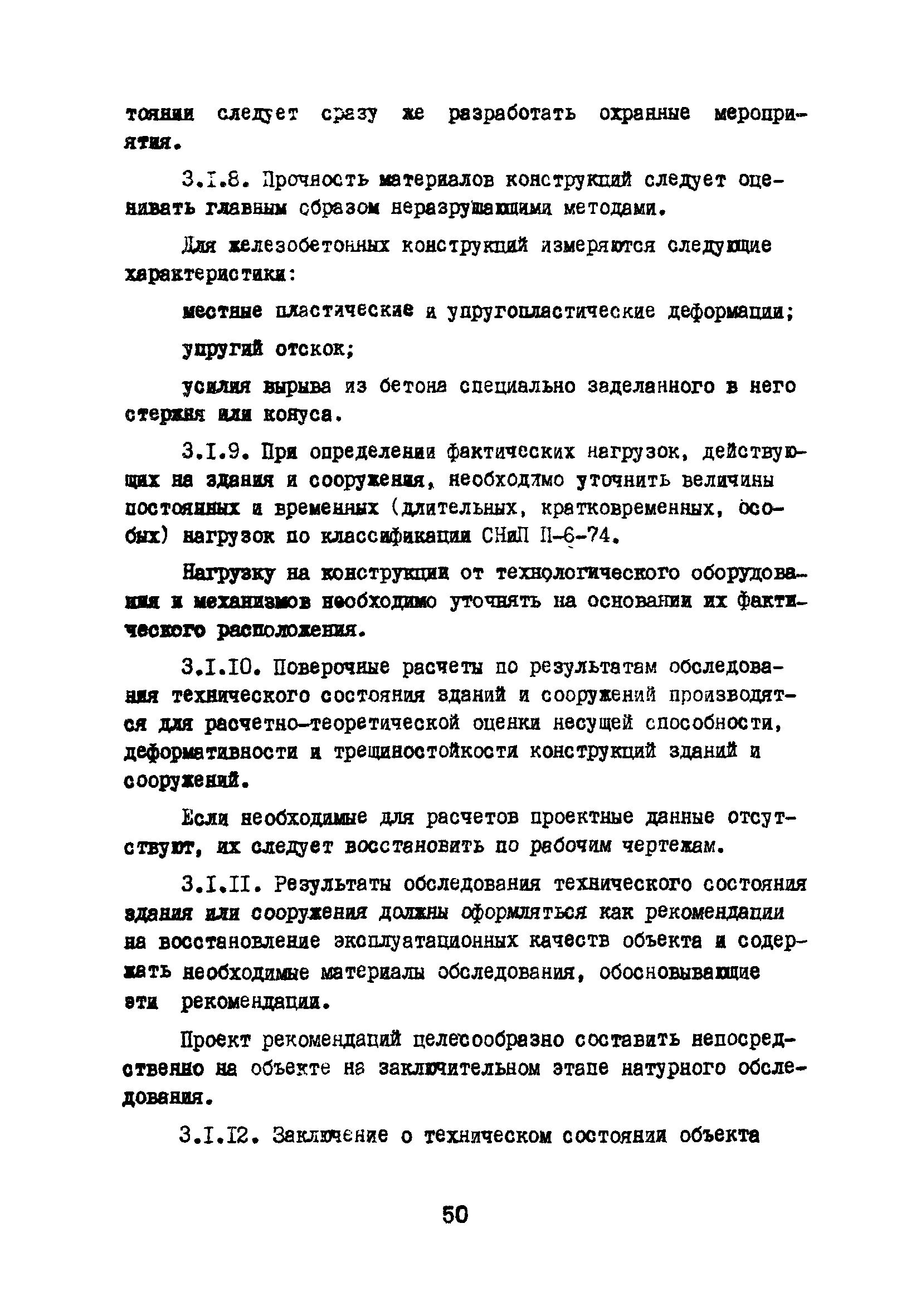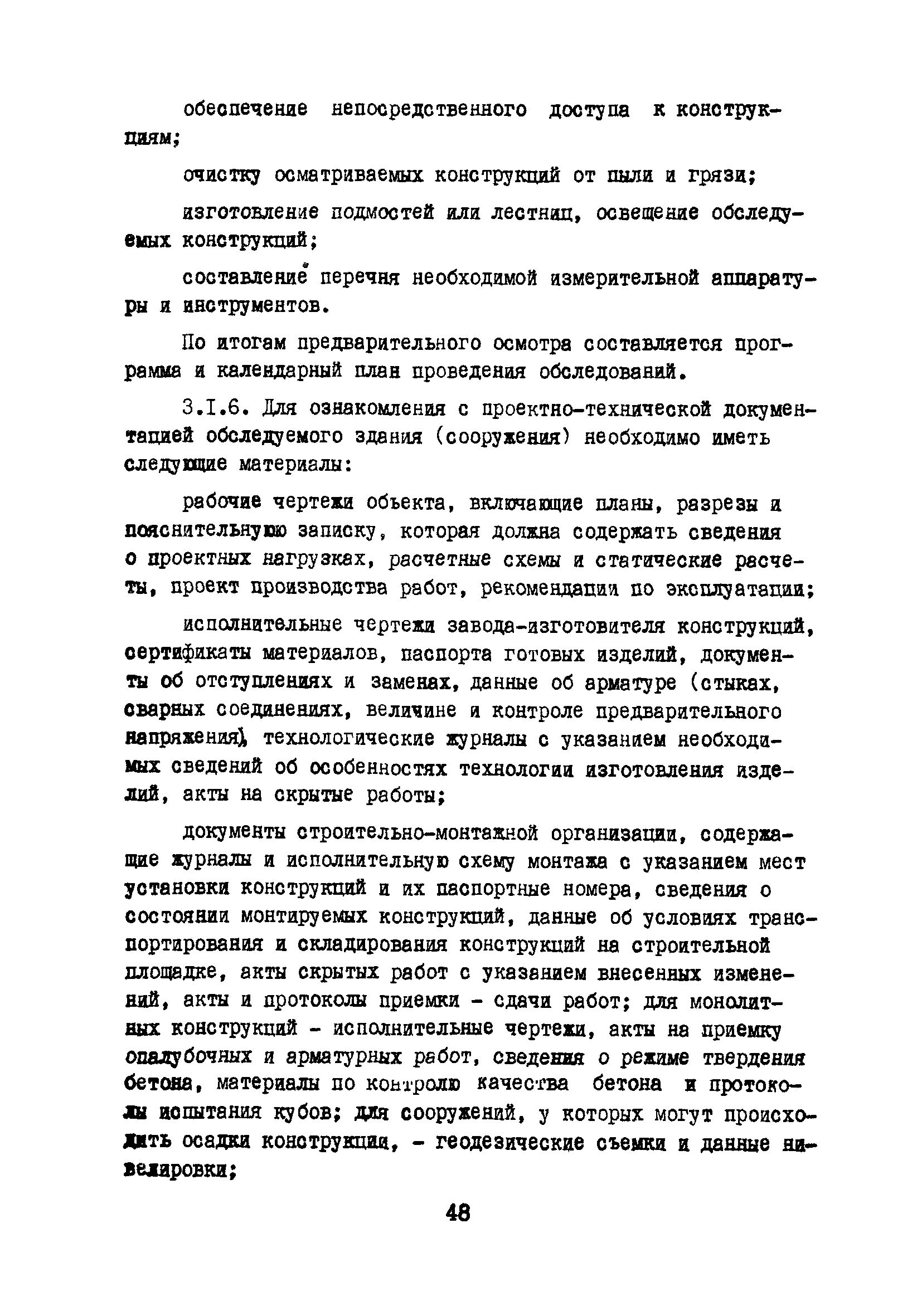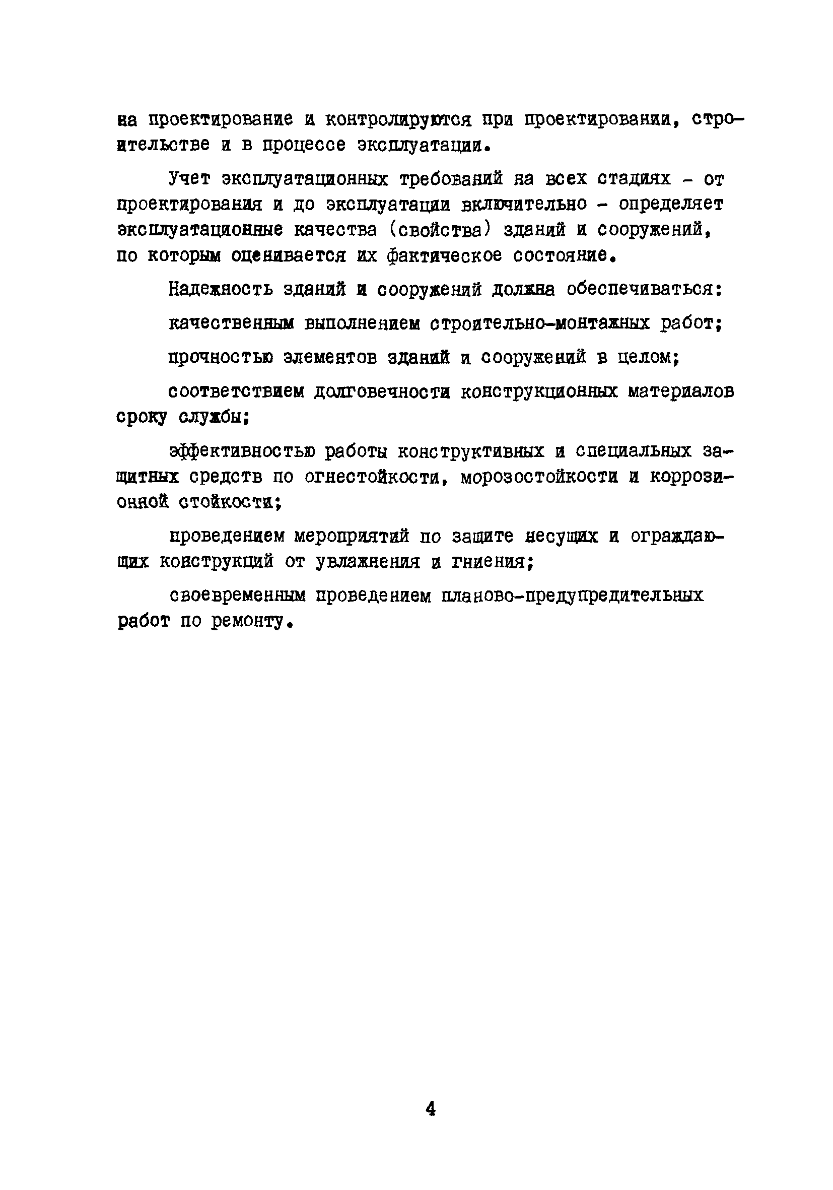 | Оглавление: | 1. Общие положения 2. Технические требования к эксплуатационным качествам зданий и сооружений 2.1 Требования к основаниям и элементам зданий и сооружений Общие положения Основания Фундаменты Стены и перегородки Колонны Перекрытия Покрытия, крыши и кровли Лестницы Полы Двери, ворота, окна и фонари 2.2 Требования к эксплуатационным и физическим качествам зданий, сооружений и их конструктивных элементов Теплотехнические качества Звукоизоляционные качества, освещенность 2.3 Требования к антикоррозионной защите конструкций 3. Методика обследования зданий и сооружений по эксплуатационной пригодности 3.1 Порядок проведения обследования технического состояния зданий и сооружений 3.2 Методы и средства контроля эксплуатационной пригодности зданий и сооружений Исследование грунтов оснований Контроль прочностных и деформационных характеристик бетонов и каменных материалов Контроль прочностных и деформационных характеристик металлов Контроль перемещений конструкций Контроль армирования, наличия закладных элементов и толщины защитного слоя в железобетонных и армокаменных конструкциях Контроль дефектов и повреждений Контроль уровня шума Контроль уровня вибрации Контроль теплозащитных качеств ограждающих конструкций Контроль герметичности ограждающих конструкций Контроль агрессивности среды и степени коррозии конструкций 3.3 Обследование оснований и конструктивных элементов зданий и сооружений Основания Фундаменты Каркасы зданий Стены и перегородки Колонны Перекрытия Покрытия, крыши и кровли Лестницы Полы Двери, ворота, окна и фонари 3.4 Определение фактических нагрузок и воздействий 3.5 Проведение поверочных расчетов 3.6 Составление заключения и состоянии обследованного здания (сооружения) 4. Рекомендации по совершенствованию эксплуатационных качеств зданий и сооружений 4.1 Восстановление и улучшение эксплуатационных качеств оснований и конструктивных элементов зданий и сооружений Основания Фундаменты Стены и перегородки Колонны Перекрытия и полы Покрытия, крыши и кровли Лестницы 4.2 Улучшение физических качеств зданий и сооружений Защита наружных конструкций от увлажнения Гидроизоляция фундаментов и подвалов Герметизация ограждающих конструкций Снижение теплопотерь Звукоизоляция и виброизоляция Освещенность 4.3 Повышение коррозионной стойкости строительных конструкций Металлические конструкции Бетонные, железобетонные и каменные конструкции Приложения |