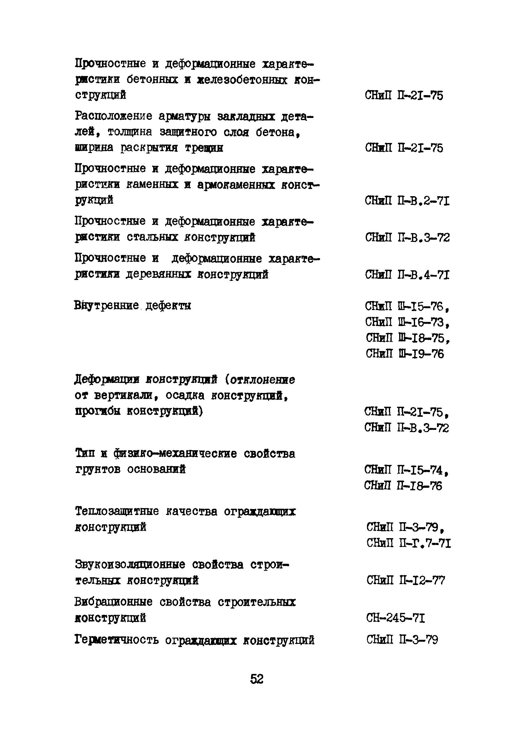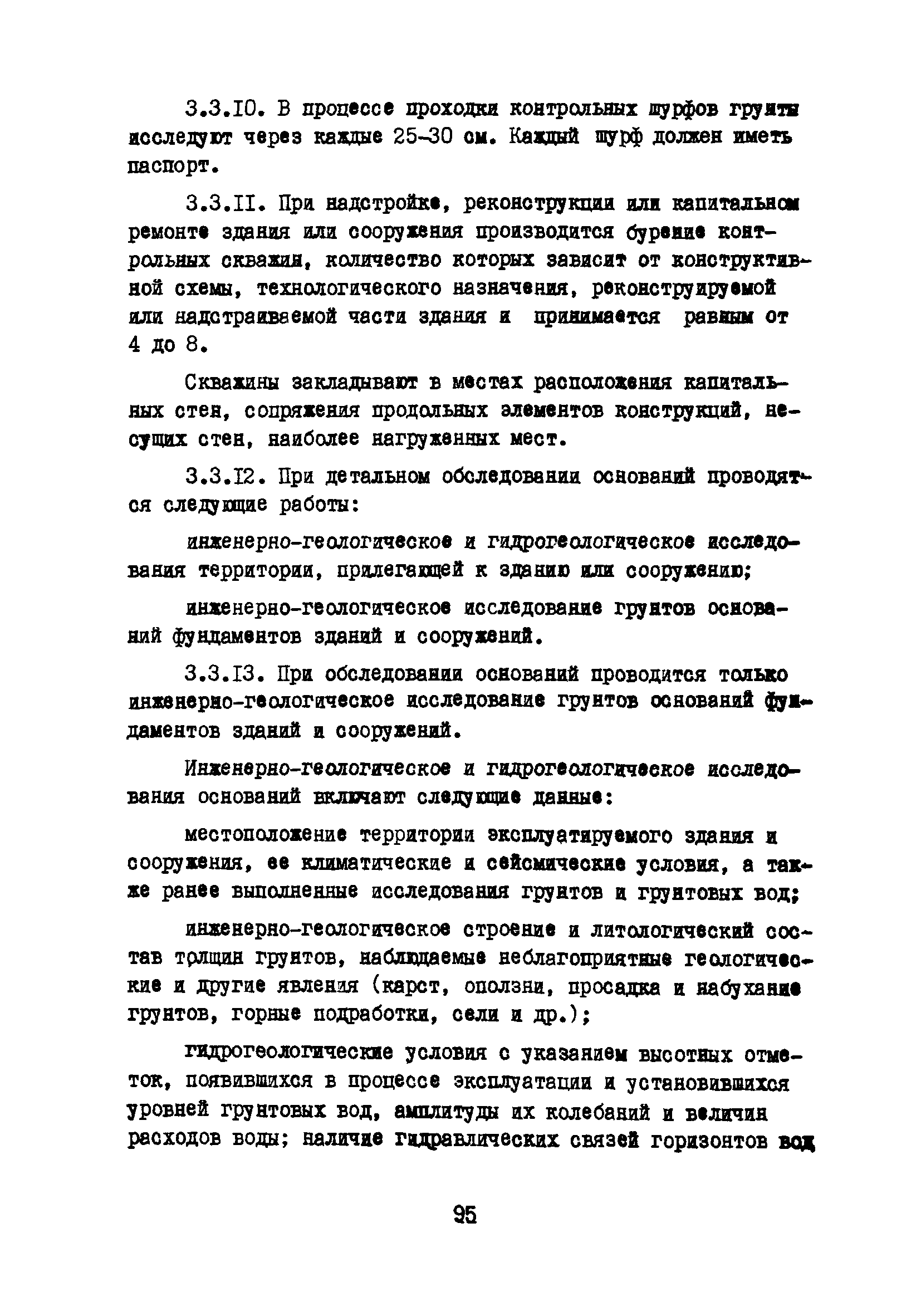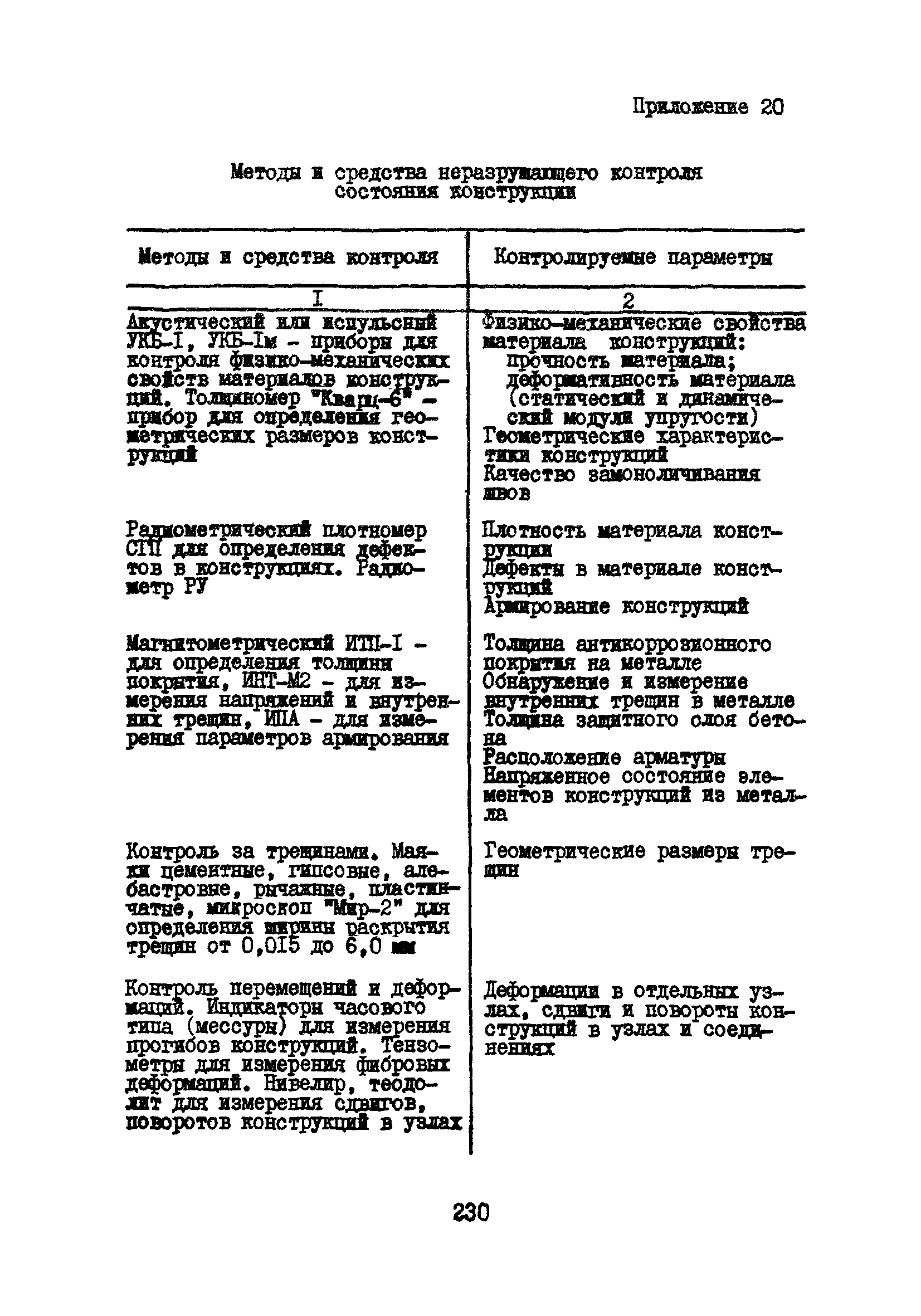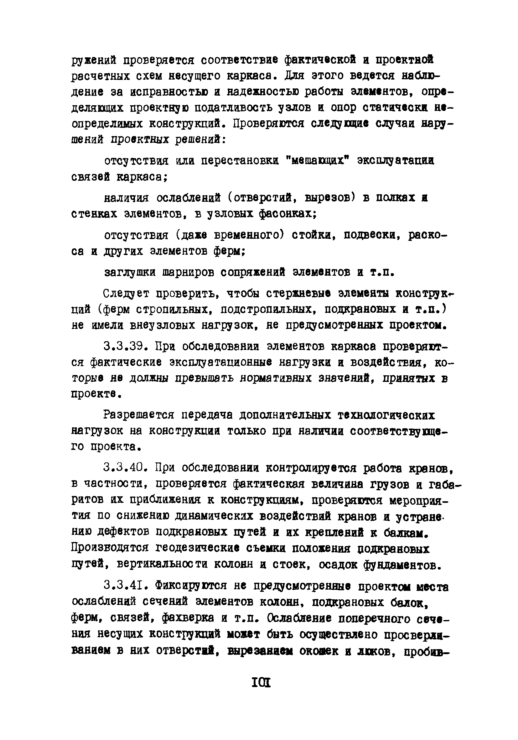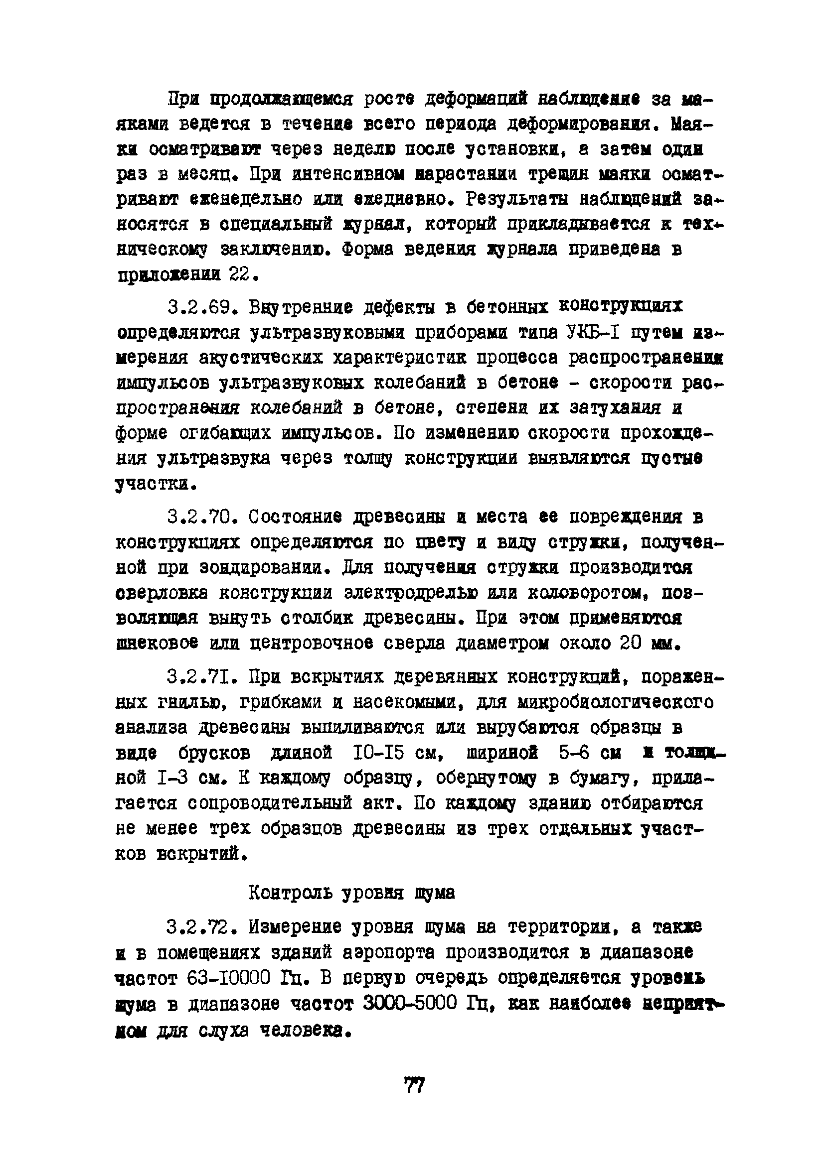 | Оглавление: | 1. Общие положения 2. Технические требования к эксплуатационным качествам зданий и сооружений 2.1 Требования к основаниям и элементам зданий и сооружений Общие положения Основания Фундаменты Стены и перегородки Колонны Перекрытия Покрытия, крыши и кровли Лестницы Полы Двери, ворота, окна и фонари 2.2 Требования к эксплуатационным и физическим качествам зданий, сооружений и их конструктивных элементов Теплотехнические качества Звукоизоляционные качества, освещенность 2.3 Требования к антикоррозионной защите конструкций 3. Методика обследования зданий и сооружений по эксплуатационной пригодности 3.1 Порядок проведения обследования технического состояния зданий и сооружений 3.2 Методы и средства контроля эксплуатационной пригодности зданий и сооружений Исследование грунтов оснований Контроль прочностных и деформационных характеристик бетонов и каменных материалов Контроль прочностных и деформационных характеристик металлов Контроль перемещений конструкций Контроль армирования, наличия закладных элементов и толщины защитного слоя в железобетонных и армокаменных конструкциях Контроль дефектов и повреждений Контроль уровня шума Контроль уровня вибрации Контроль теплозащитных качеств ограждающих конструкций Контроль герметичности ограждающих конструкций Контроль агрессивности среды и степени коррозии конструкций 3.3 Обследование оснований и конструктивных элементов зданий и сооружений Основания Фундаменты Каркасы зданий Стены и перегородки Колонны Перекрытия Покрытия, крыши и кровли Лестницы Полы Двери, ворота, окна и фонари 3.4 Определение фактических нагрузок и воздействий 3.5 Проведение поверочных расчетов 3.6 Составление заключения и состоянии обследованного здания (сооружения) 4. Рекомендации по совершенствованию эксплуатационных качеств зданий и сооружений 4.1 Восстановление и улучшение эксплуатационных качеств оснований и конструктивных элементов зданий и сооружений Основания Фундаменты Стены и перегородки Колонны Перекрытия и полы Покрытия, крыши и кровли Лестницы 4.2 Улучшение физических качеств зданий и сооружений Защита наружных конструкций от увлажнения Гидроизоляция фундаментов и подвалов Герметизация ограждающих конструкций Снижение теплопотерь Звукоизоляция и виброизоляция Освещенность 4.3 Повышение коррозионной стойкости строительных конструкций Металлические конструкции Бетонные, железобетонные и каменные конструкции Приложения |