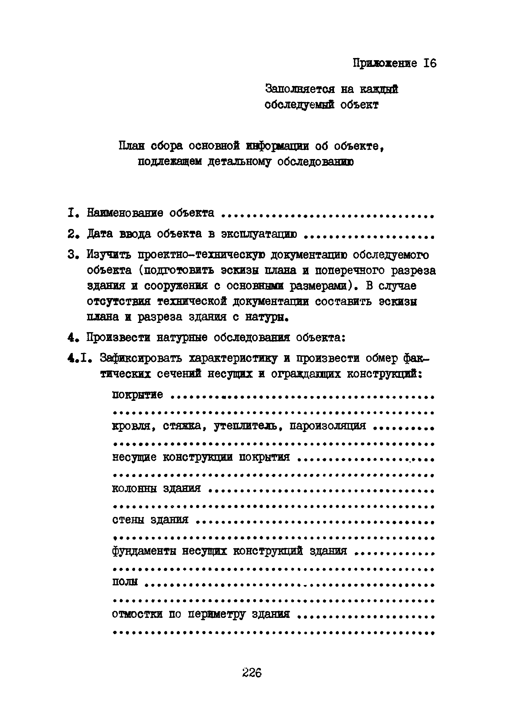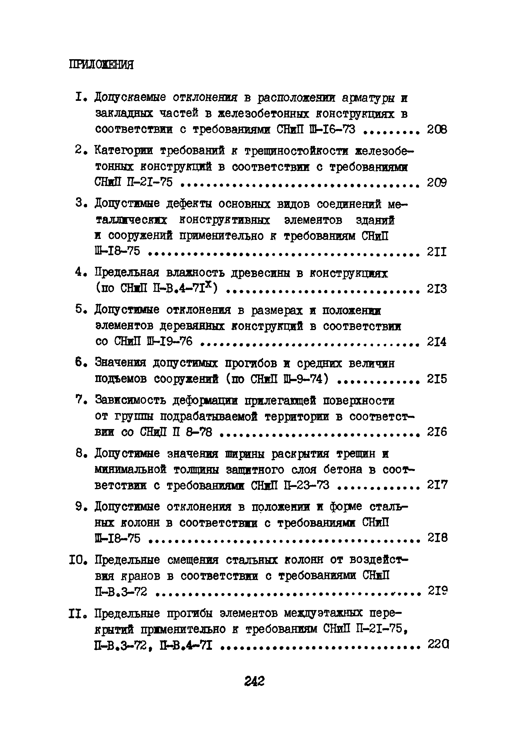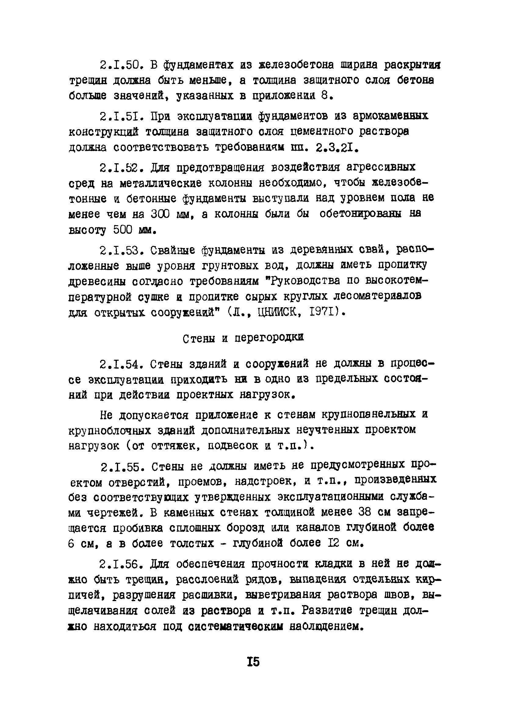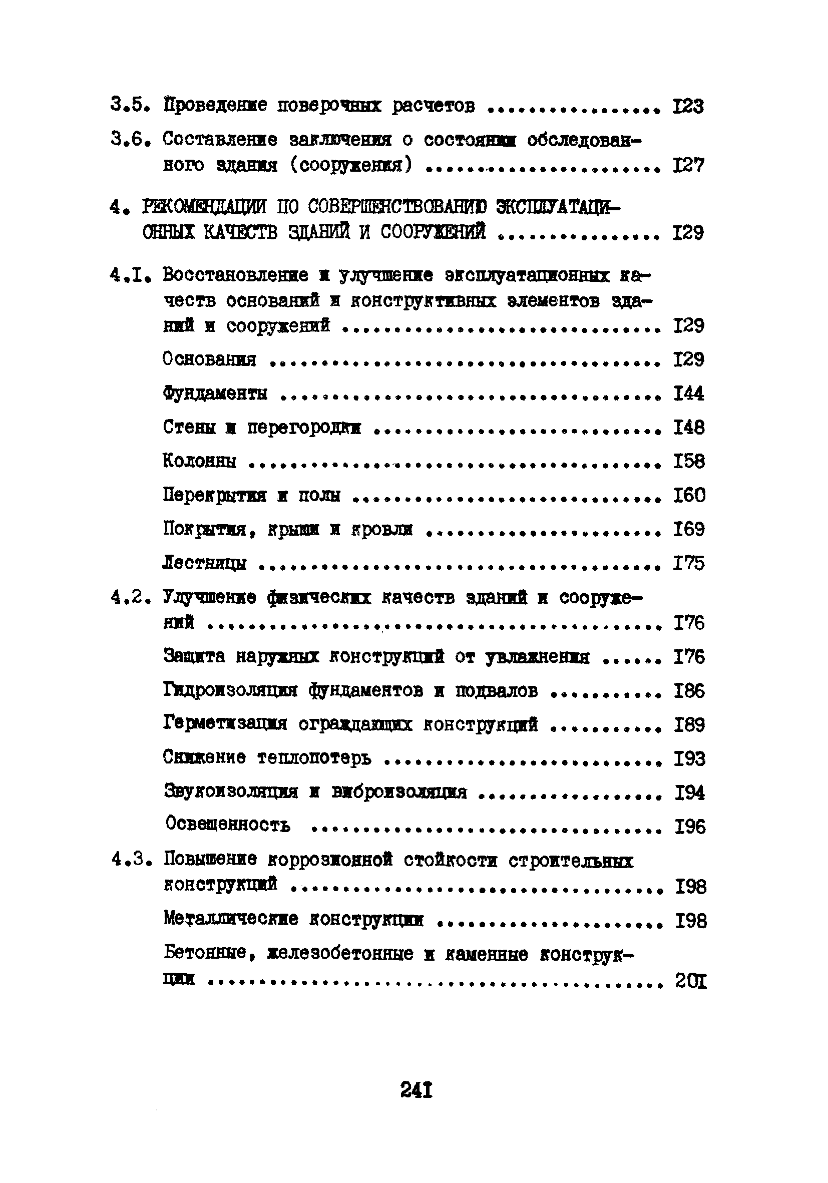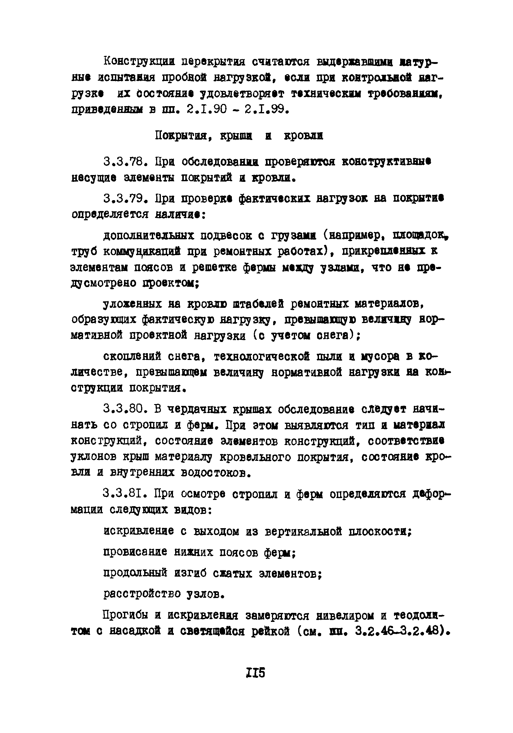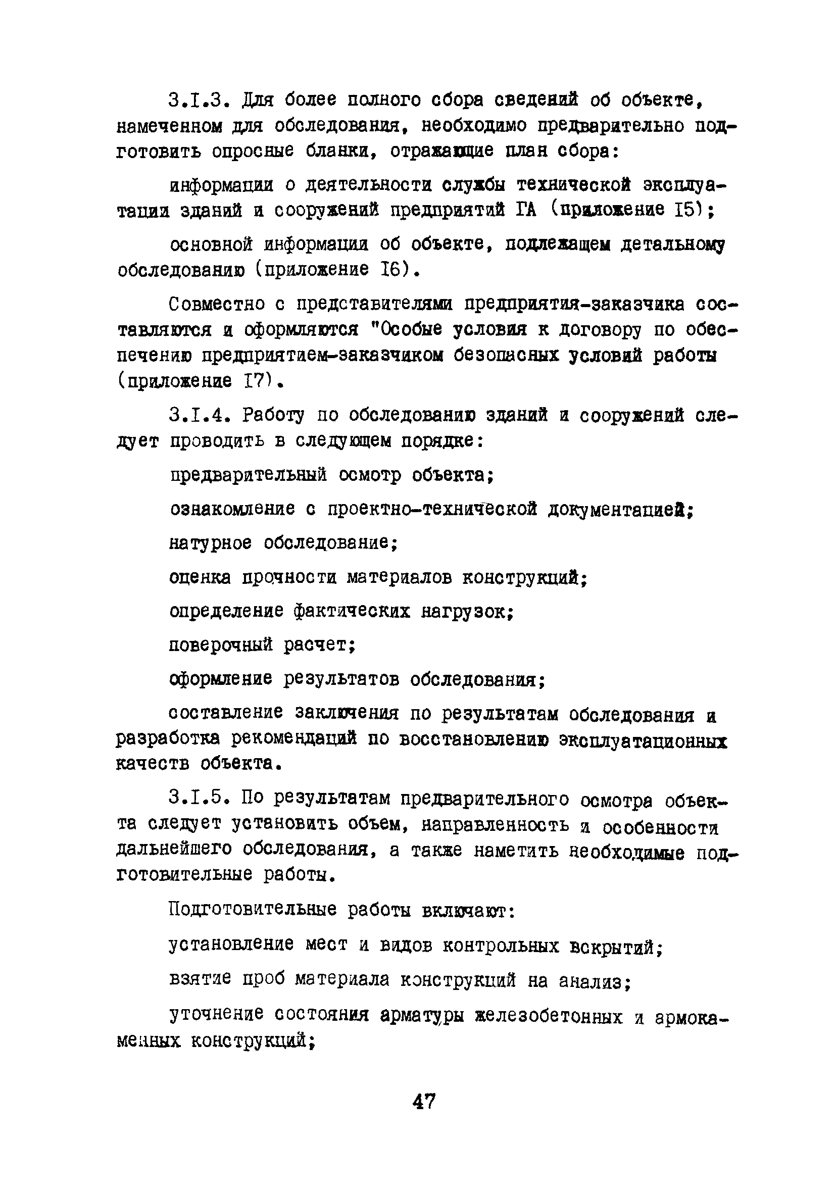 | Оглавление: | 1. Общие положения 2. Технические требования к эксплуатационным качествам зданий и сооружений 2.1 Требования к основаниям и элементам зданий и сооружений Общие положения Основания Фундаменты Стены и перегородки Колонны Перекрытия Покрытия, крыши и кровли Лестницы Полы Двери, ворота, окна и фонари 2.2 Требования к эксплуатационным и физическим качествам зданий, сооружений и их конструктивных элементов Теплотехнические качества Звукоизоляционные качества, освещенность 2.3 Требования к антикоррозионной защите конструкций 3. Методика обследования зданий и сооружений по эксплуатационной пригодности 3.1 Порядок проведения обследования технического состояния зданий и сооружений 3.2 Методы и средства контроля эксплуатационной пригодности зданий и сооружений Исследование грунтов оснований Контроль прочностных и деформационных характеристик бетонов и каменных материалов Контроль прочностных и деформационных характеристик металлов Контроль перемещений конструкций Контроль армирования, наличия закладных элементов и толщины защитного слоя в железобетонных и армокаменных конструкциях Контроль дефектов и повреждений Контроль уровня шума Контроль уровня вибрации Контроль теплозащитных качеств ограждающих конструкций Контроль герметичности ограждающих конструкций Контроль агрессивности среды и степени коррозии конструкций 3.3 Обследование оснований и конструктивных элементов зданий и сооружений Основания Фундаменты Каркасы зданий Стены и перегородки Колонны Перекрытия Покрытия, крыши и кровли Лестницы Полы Двери, ворота, окна и фонари 3.4 Определение фактических нагрузок и воздействий 3.5 Проведение поверочных расчетов 3.6 Составление заключения и состоянии обследованного здания (сооружения) 4. Рекомендации по совершенствованию эксплуатационных качеств зданий и сооружений 4.1 Восстановление и улучшение эксплуатационных качеств оснований и конструктивных элементов зданий и сооружений Основания Фундаменты Стены и перегородки Колонны Перекрытия и полы Покрытия, крыши и кровли Лестницы 4.2 Улучшение физических качеств зданий и сооружений Защита наружных конструкций от увлажнения Гидроизоляция фундаментов и подвалов Герметизация ограждающих конструкций Снижение теплопотерь Звукоизоляция и виброизоляция Освещенность 4.3 Повышение коррозионной стойкости строительных конструкций Металлические конструкции Бетонные, железобетонные и каменные конструкции Приложения |