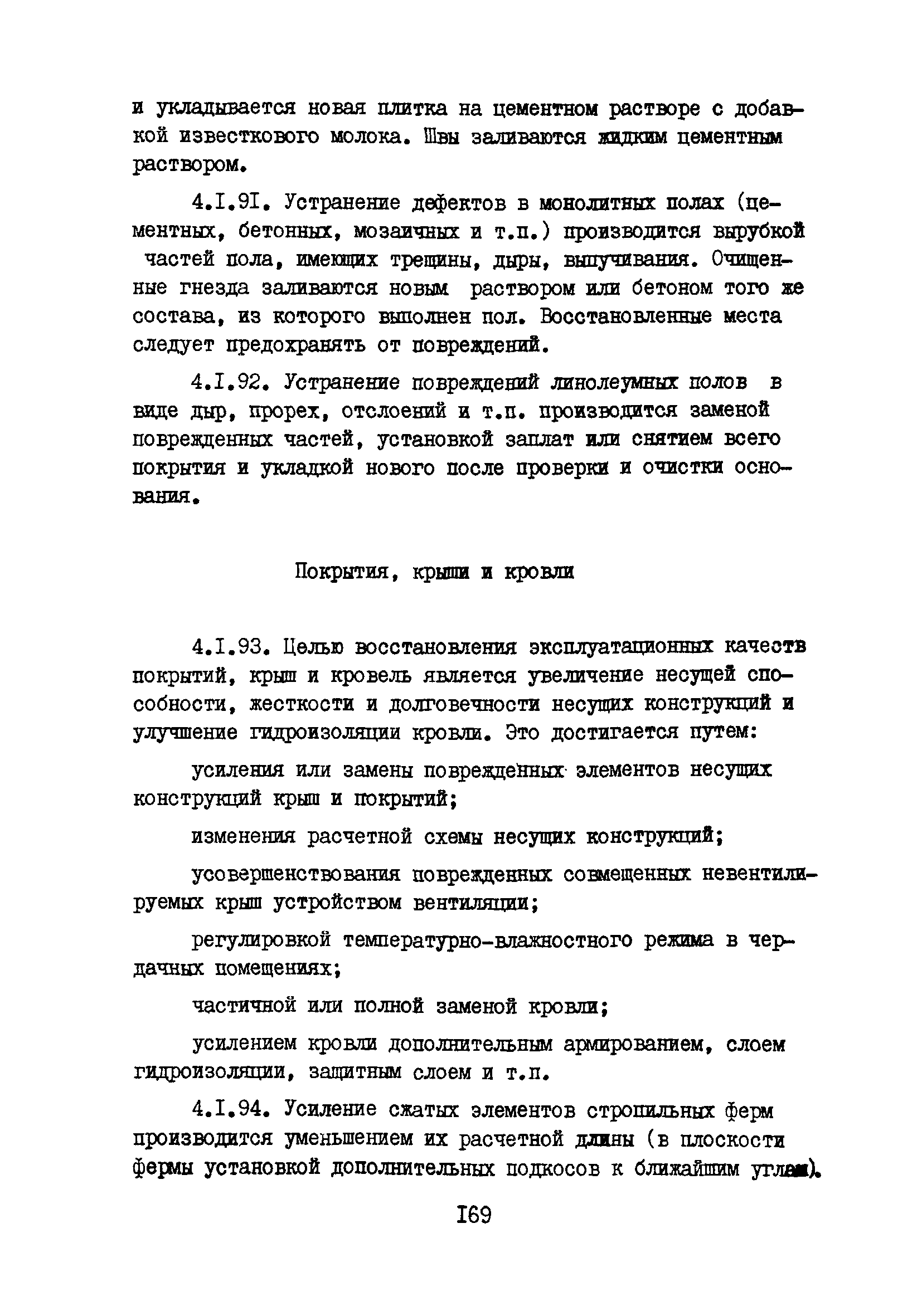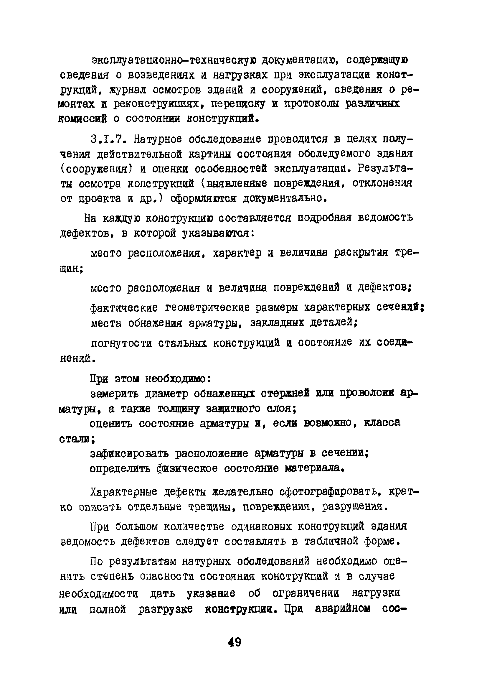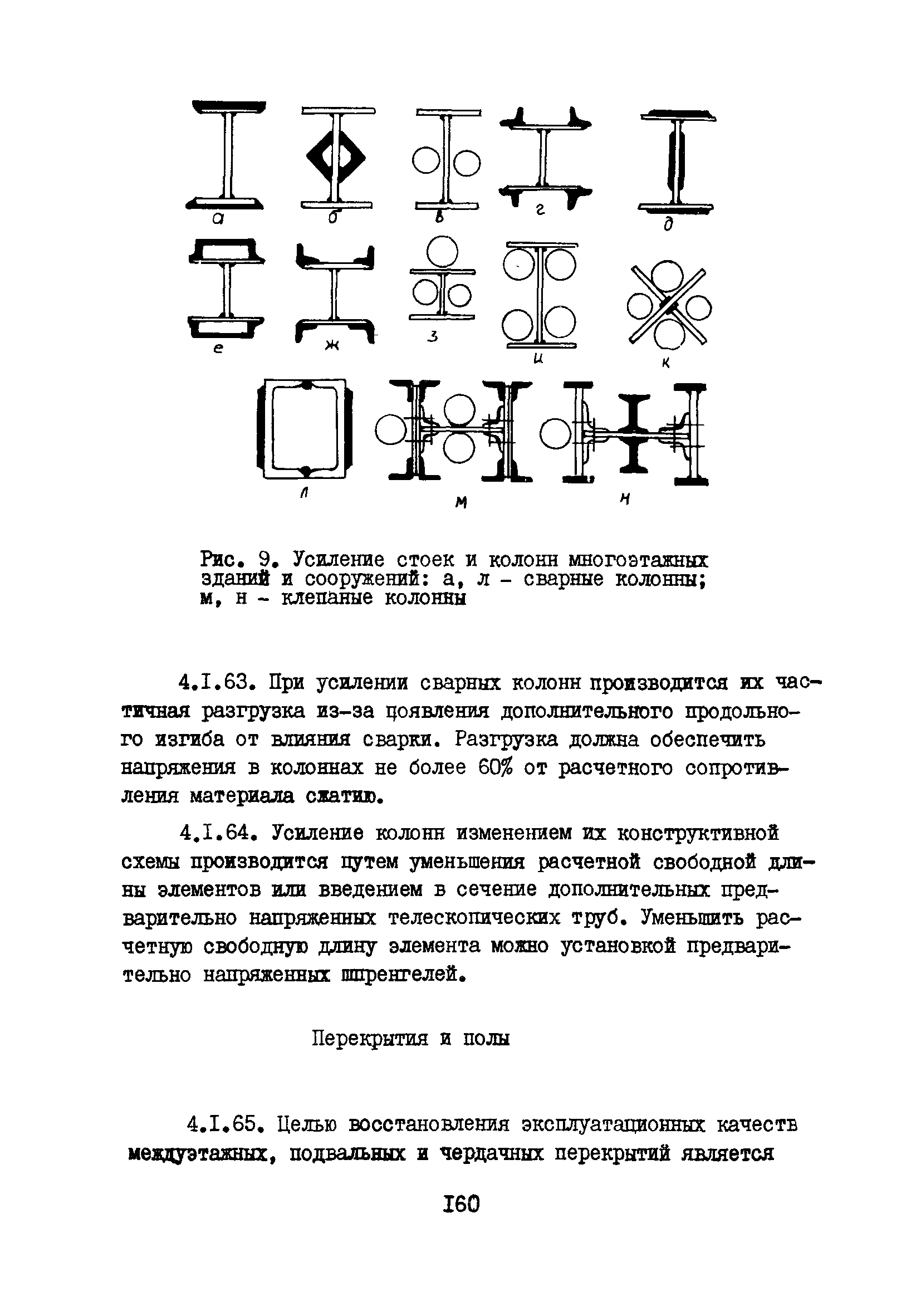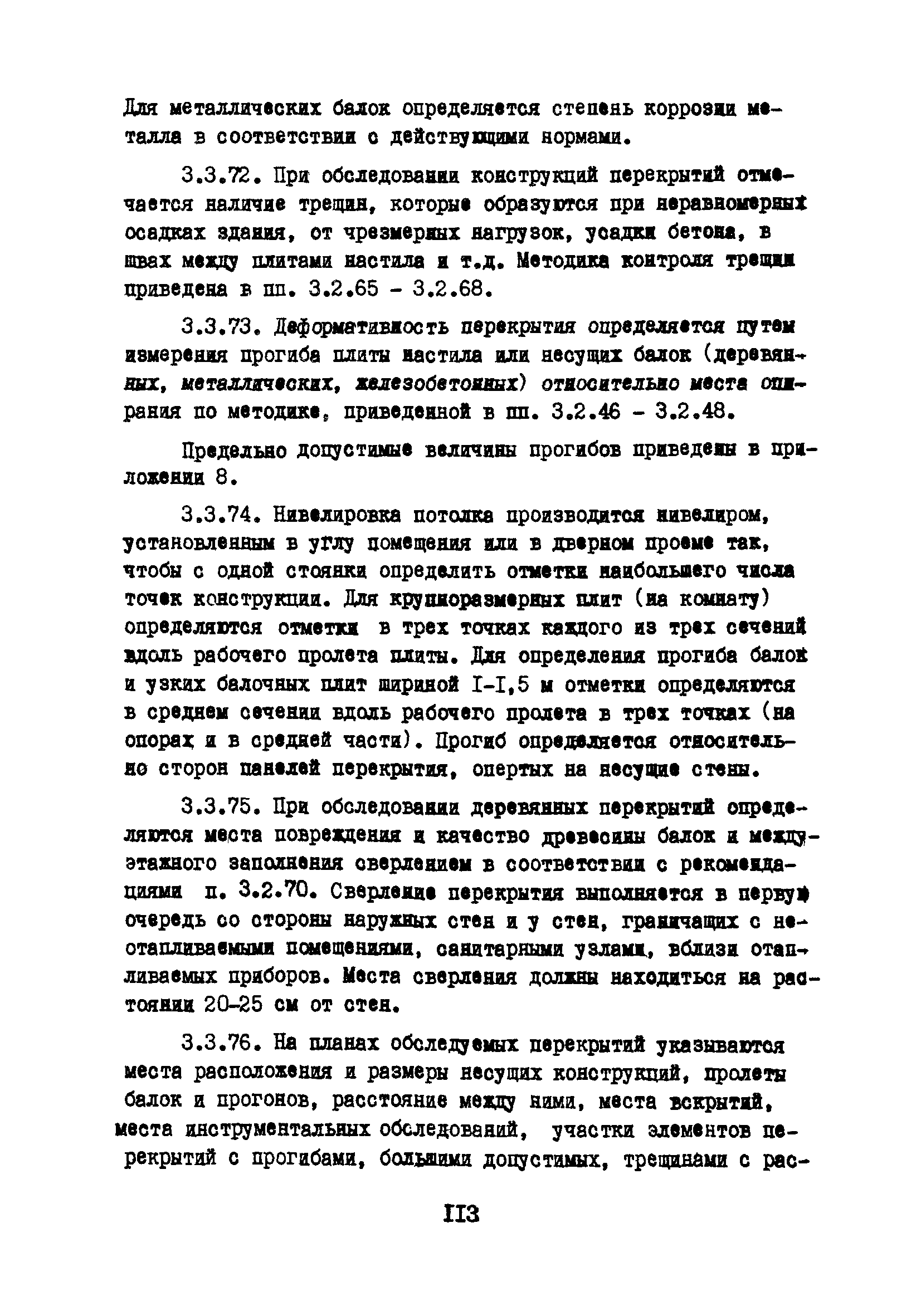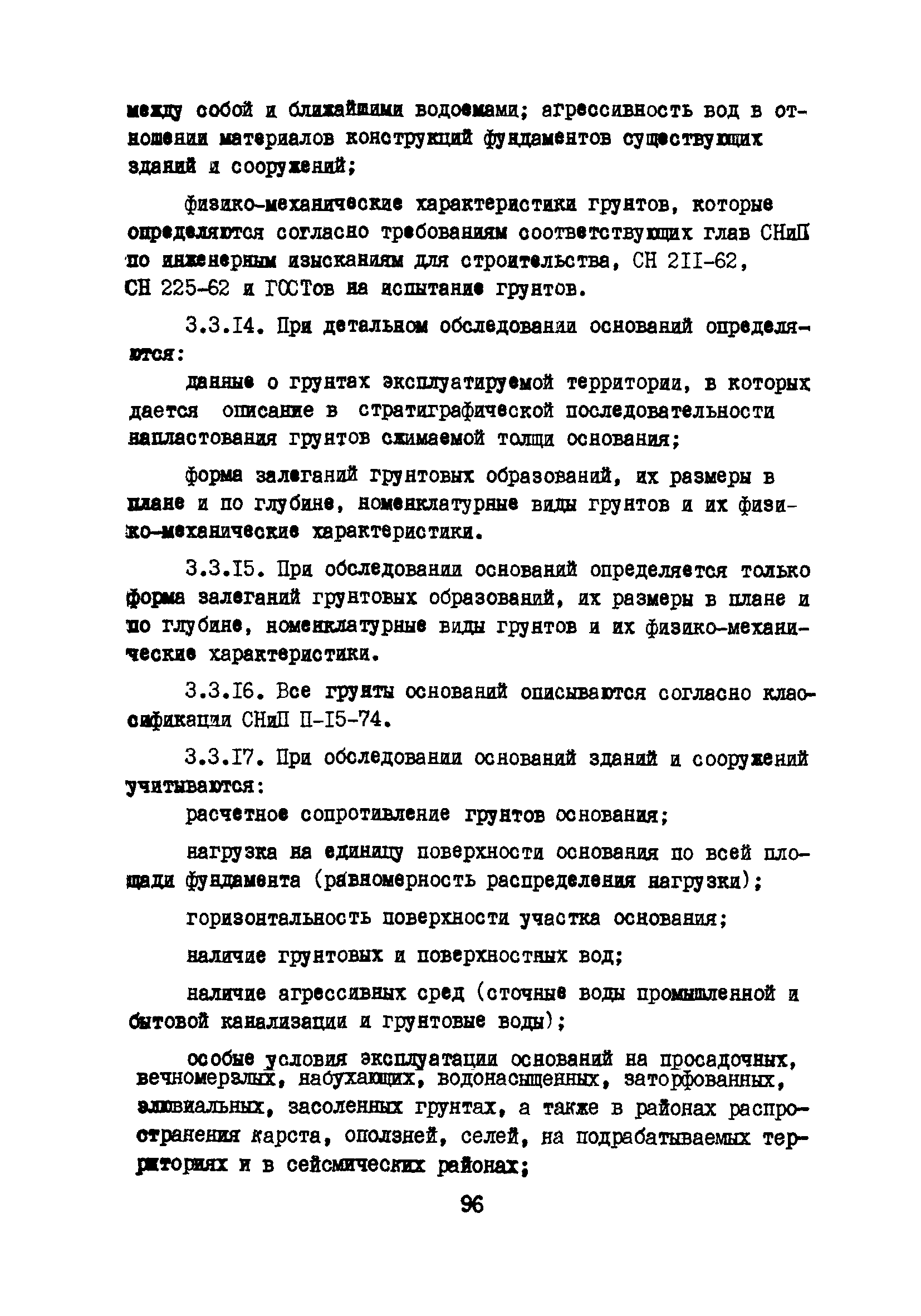 | Оглавление: | 1. Общие положения 2. Технические требования к эксплуатационным качествам зданий и сооружений 2.1 Требования к основаниям и элементам зданий и сооружений Общие положения Основания Фундаменты Стены и перегородки Колонны Перекрытия Покрытия, крыши и кровли Лестницы Полы Двери, ворота, окна и фонари 2.2 Требования к эксплуатационным и физическим качествам зданий, сооружений и их конструктивных элементов Теплотехнические качества Звукоизоляционные качества, освещенность 2.3 Требования к антикоррозионной защите конструкций 3. Методика обследования зданий и сооружений по эксплуатационной пригодности 3.1 Порядок проведения обследования технического состояния зданий и сооружений 3.2 Методы и средства контроля эксплуатационной пригодности зданий и сооружений Исследование грунтов оснований Контроль прочностных и деформационных характеристик бетонов и каменных материалов Контроль прочностных и деформационных характеристик металлов Контроль перемещений конструкций Контроль армирования, наличия закладных элементов и толщины защитного слоя в железобетонных и армокаменных конструкциях Контроль дефектов и повреждений Контроль уровня шума Контроль уровня вибрации Контроль теплозащитных качеств ограждающих конструкций Контроль герметичности ограждающих конструкций Контроль агрессивности среды и степени коррозии конструкций 3.3 Обследование оснований и конструктивных элементов зданий и сооружений Основания Фундаменты Каркасы зданий Стены и перегородки Колонны Перекрытия Покрытия, крыши и кровли Лестницы Полы Двери, ворота, окна и фонари 3.4 Определение фактических нагрузок и воздействий 3.5 Проведение поверочных расчетов 3.6 Составление заключения и состоянии обследованного здания (сооружения) 4. Рекомендации по совершенствованию эксплуатационных качеств зданий и сооружений 4.1 Восстановление и улучшение эксплуатационных качеств оснований и конструктивных элементов зданий и сооружений Основания Фундаменты Стены и перегородки Колонны Перекрытия и полы Покрытия, крыши и кровли Лестницы 4.2 Улучшение физических качеств зданий и сооружений Защита наружных конструкций от увлажнения Гидроизоляция фундаментов и подвалов Герметизация ограждающих конструкций Снижение теплопотерь Звукоизоляция и виброизоляция Освещенность 4.3 Повышение коррозионной стойкости строительных конструкций Металлические конструкции Бетонные, железобетонные и каменные конструкции Приложения |