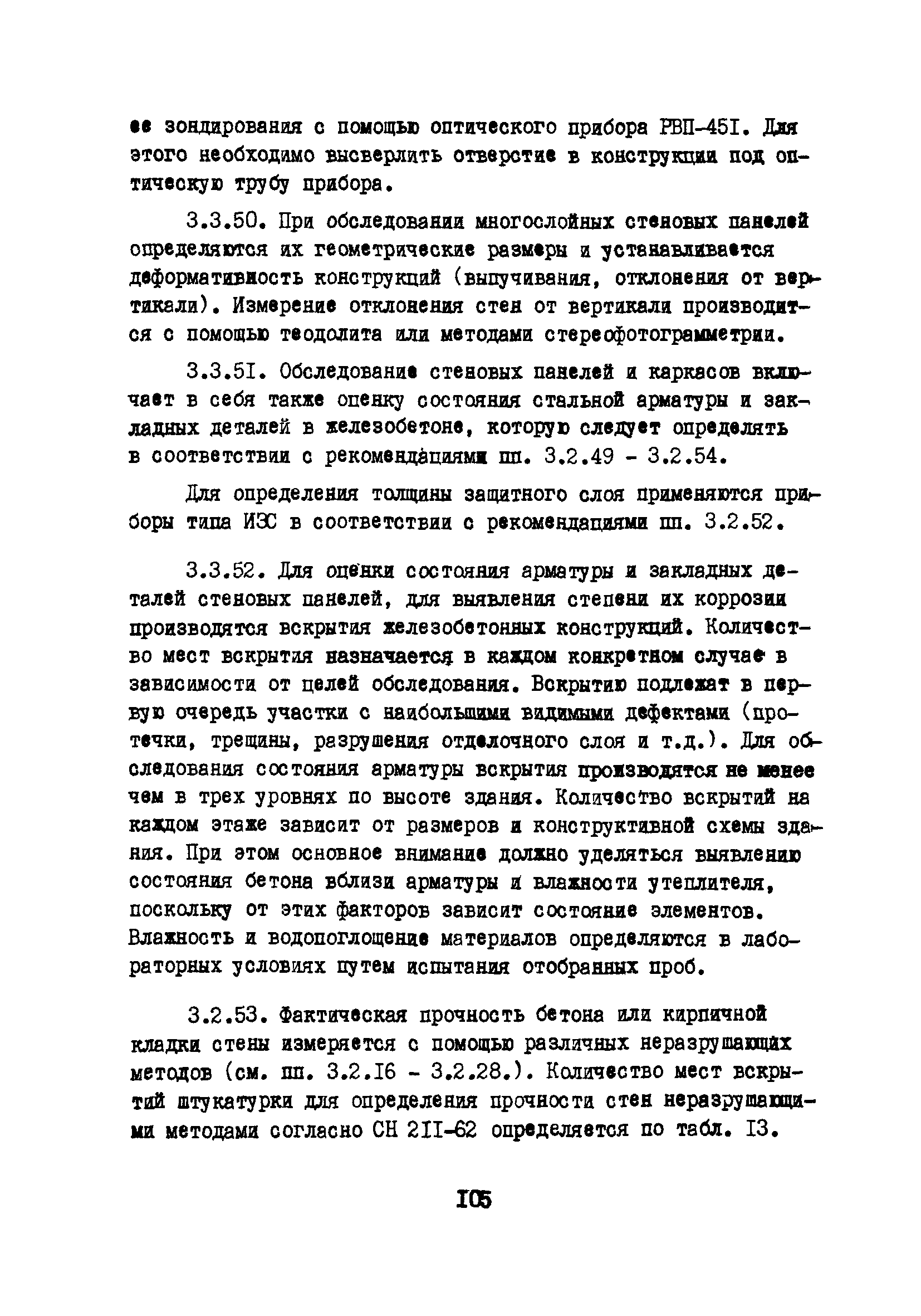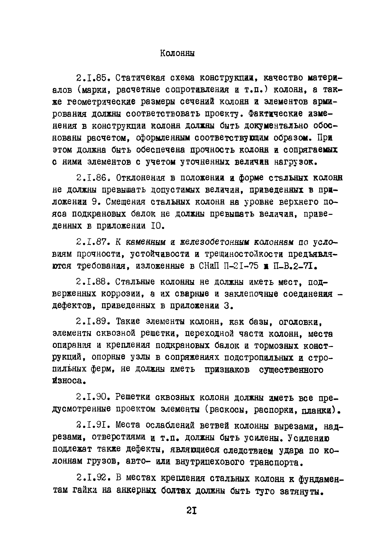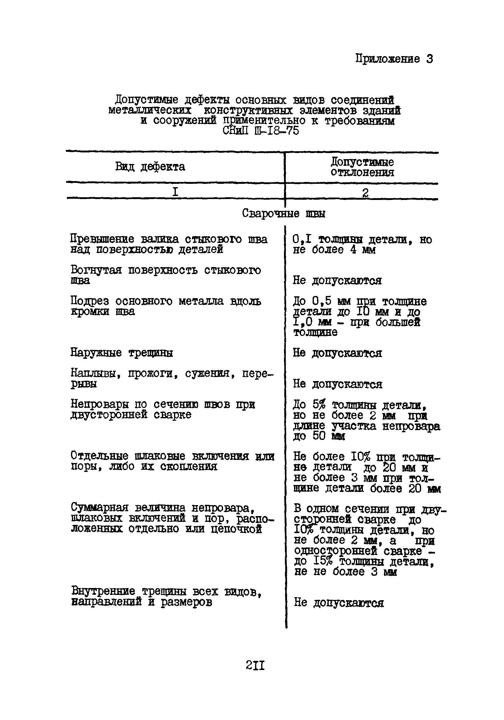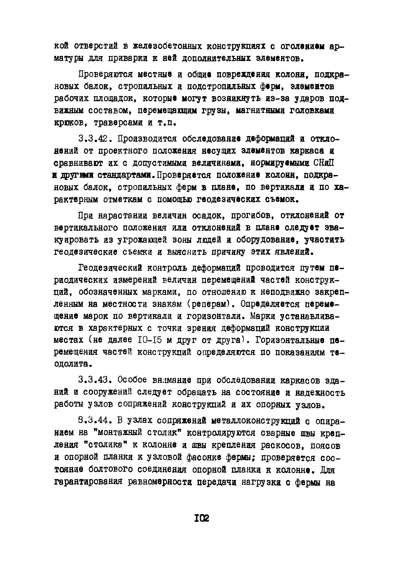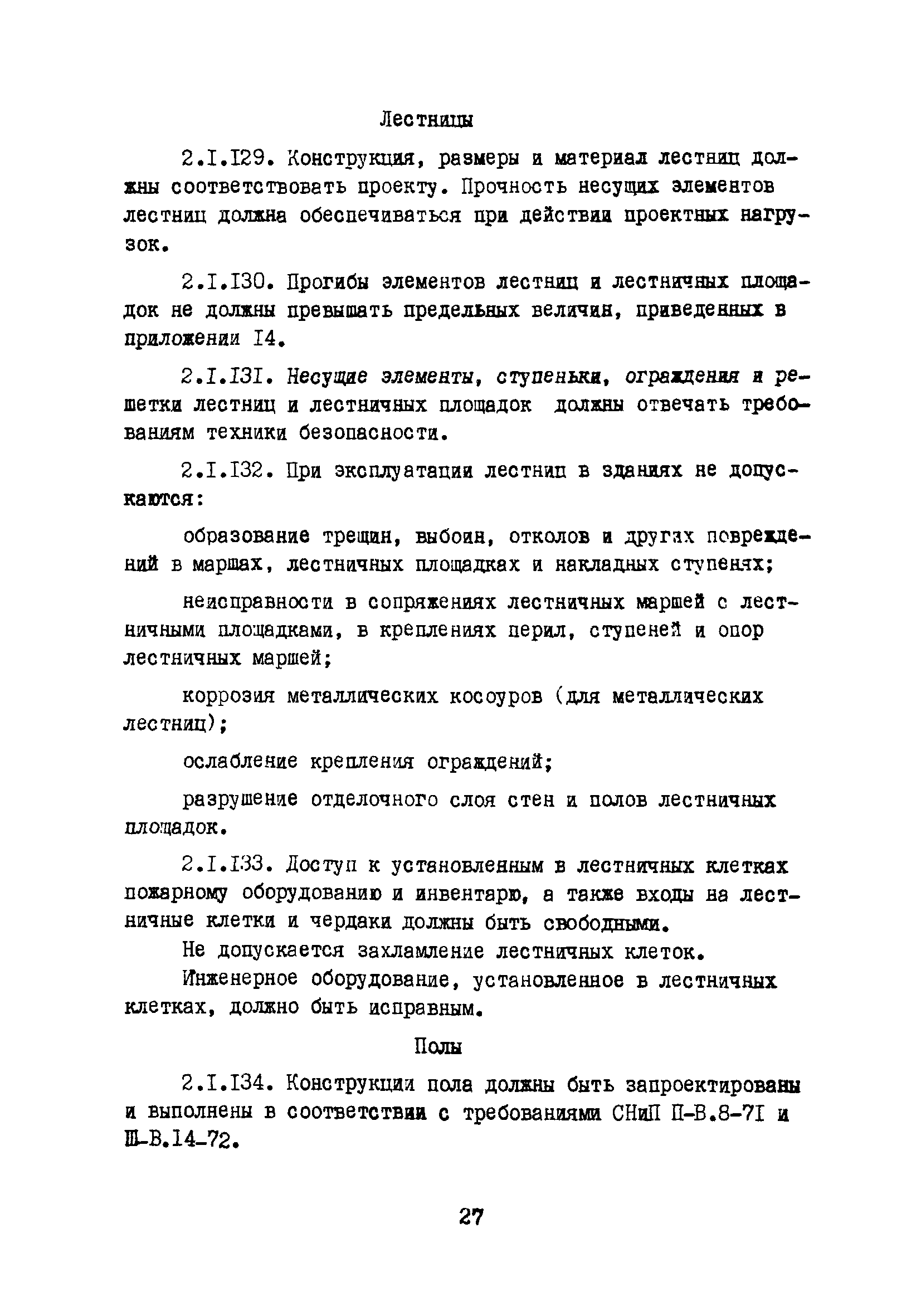 | Оглавление: | 1. Общие положения 2. Технические требования к эксплуатационным качествам зданий и сооружений 2.1 Требования к основаниям и элементам зданий и сооружений Общие положения Основания Фундаменты Стены и перегородки Колонны Перекрытия Покрытия, крыши и кровли Лестницы Полы Двери, ворота, окна и фонари 2.2 Требования к эксплуатационным и физическим качествам зданий, сооружений и их конструктивных элементов Теплотехнические качества Звукоизоляционные качества, освещенность 2.3 Требования к антикоррозионной защите конструкций 3. Методика обследования зданий и сооружений по эксплуатационной пригодности 3.1 Порядок проведения обследования технического состояния зданий и сооружений 3.2 Методы и средства контроля эксплуатационной пригодности зданий и сооружений Исследование грунтов оснований Контроль прочностных и деформационных характеристик бетонов и каменных материалов Контроль прочностных и деформационных характеристик металлов Контроль перемещений конструкций Контроль армирования, наличия закладных элементов и толщины защитного слоя в железобетонных и армокаменных конструкциях Контроль дефектов и повреждений Контроль уровня шума Контроль уровня вибрации Контроль теплозащитных качеств ограждающих конструкций Контроль герметичности ограждающих конструкций Контроль агрессивности среды и степени коррозии конструкций 3.3 Обследование оснований и конструктивных элементов зданий и сооружений Основания Фундаменты Каркасы зданий Стены и перегородки Колонны Перекрытия Покрытия, крыши и кровли Лестницы Полы Двери, ворота, окна и фонари 3.4 Определение фактических нагрузок и воздействий 3.5 Проведение поверочных расчетов 3.6 Составление заключения и состоянии обследованного здания (сооружения) 4. Рекомендации по совершенствованию эксплуатационных качеств зданий и сооружений 4.1 Восстановление и улучшение эксплуатационных качеств оснований и конструктивных элементов зданий и сооружений Основания Фундаменты Стены и перегородки Колонны Перекрытия и полы Покрытия, крыши и кровли Лестницы 4.2 Улучшение физических качеств зданий и сооружений Защита наружных конструкций от увлажнения Гидроизоляция фундаментов и подвалов Герметизация ограждающих конструкций Снижение теплопотерь Звукоизоляция и виброизоляция Освещенность 4.3 Повышение коррозионной стойкости строительных конструкций Металлические конструкции Бетонные, железобетонные и каменные конструкции Приложения |