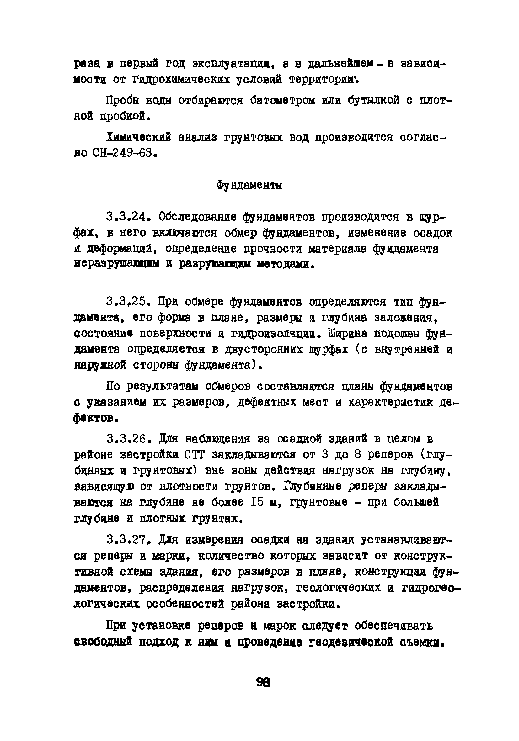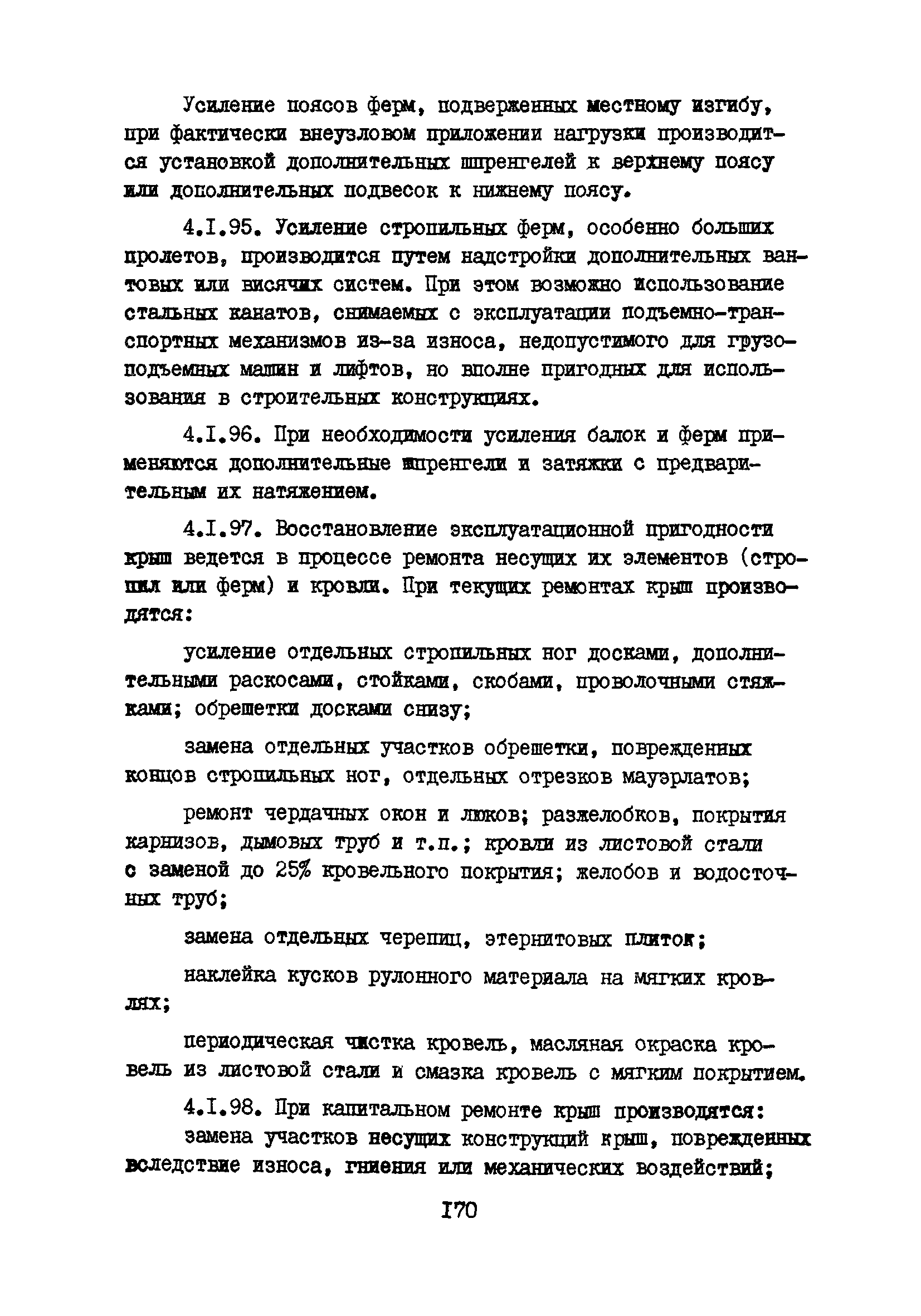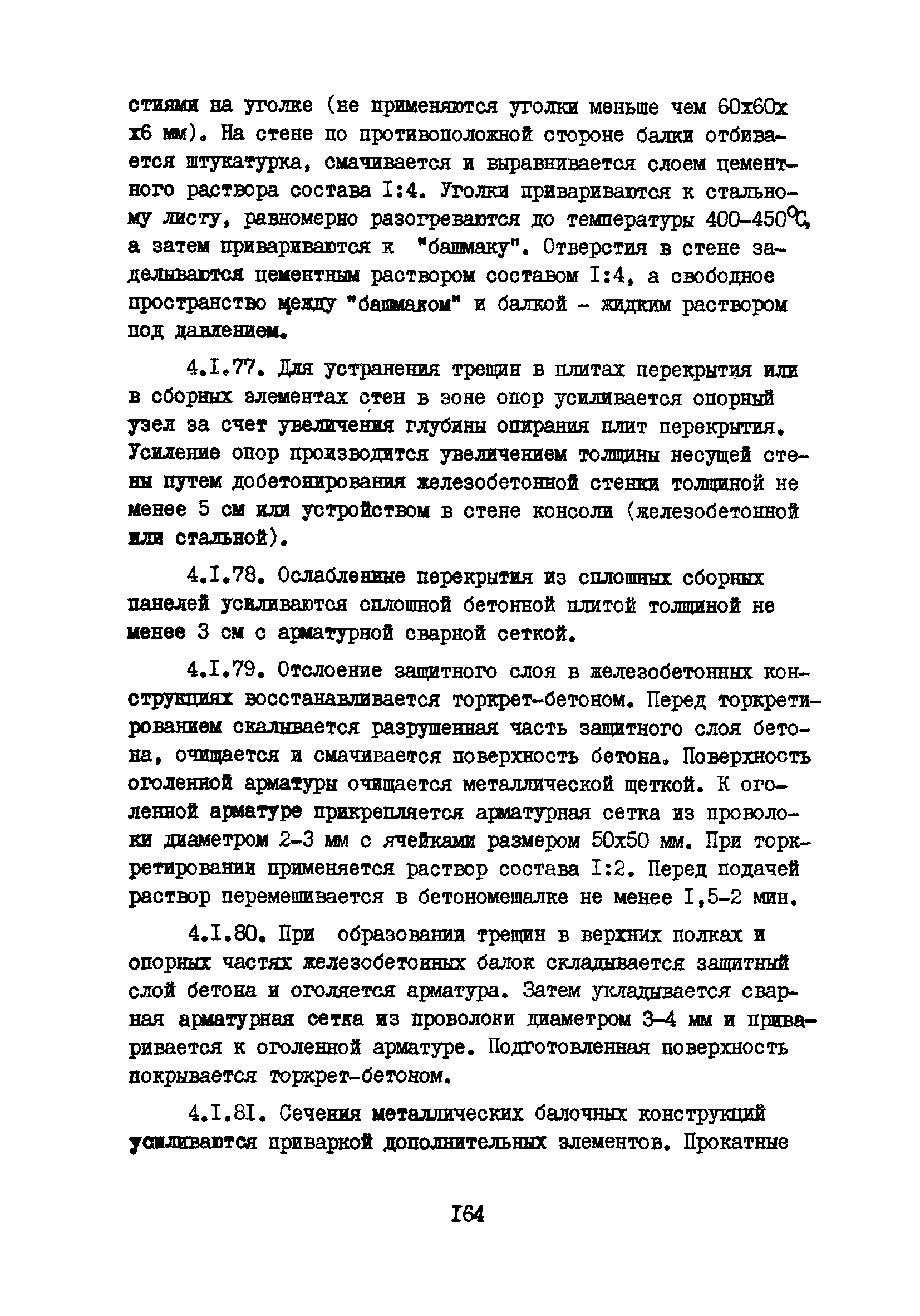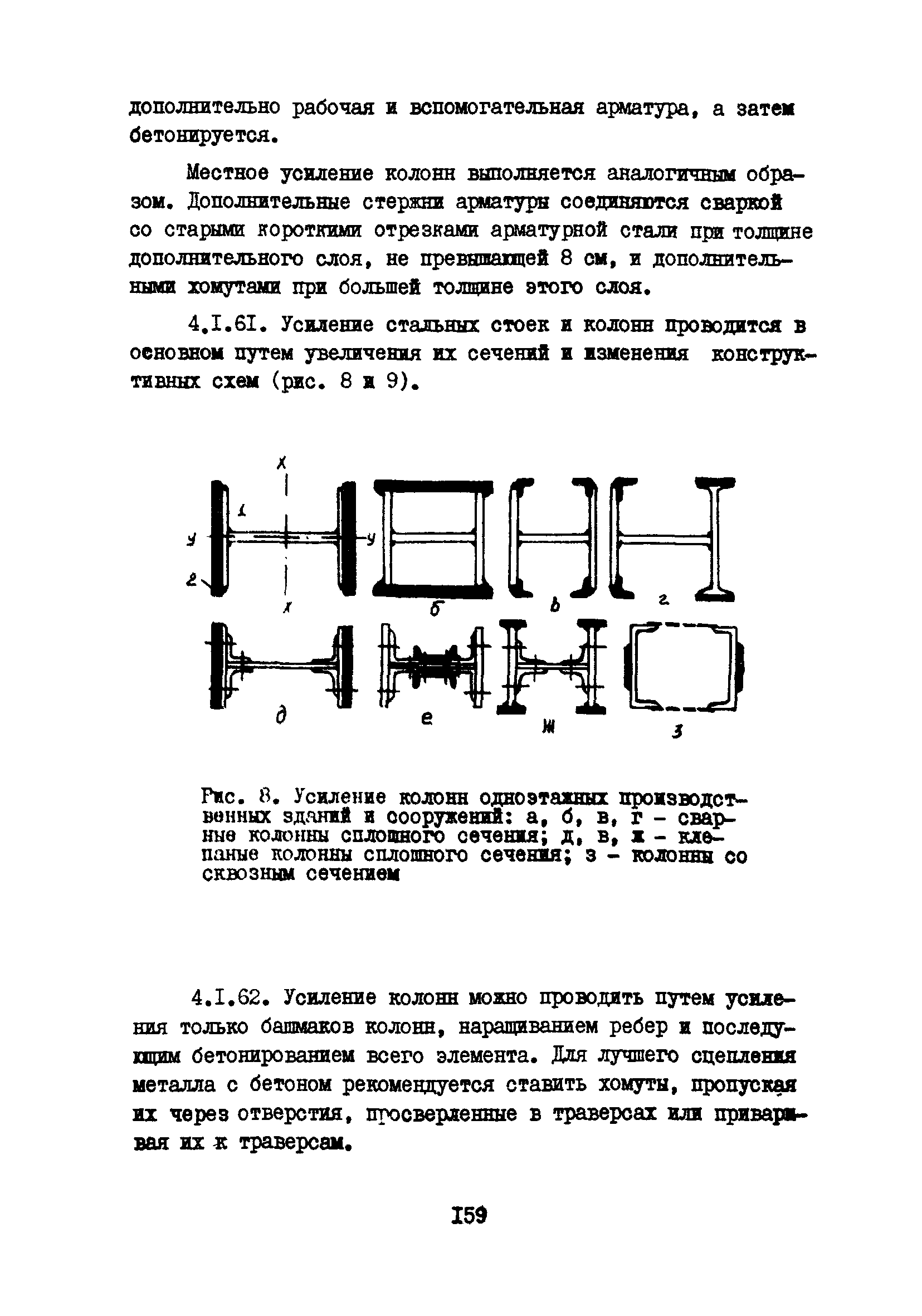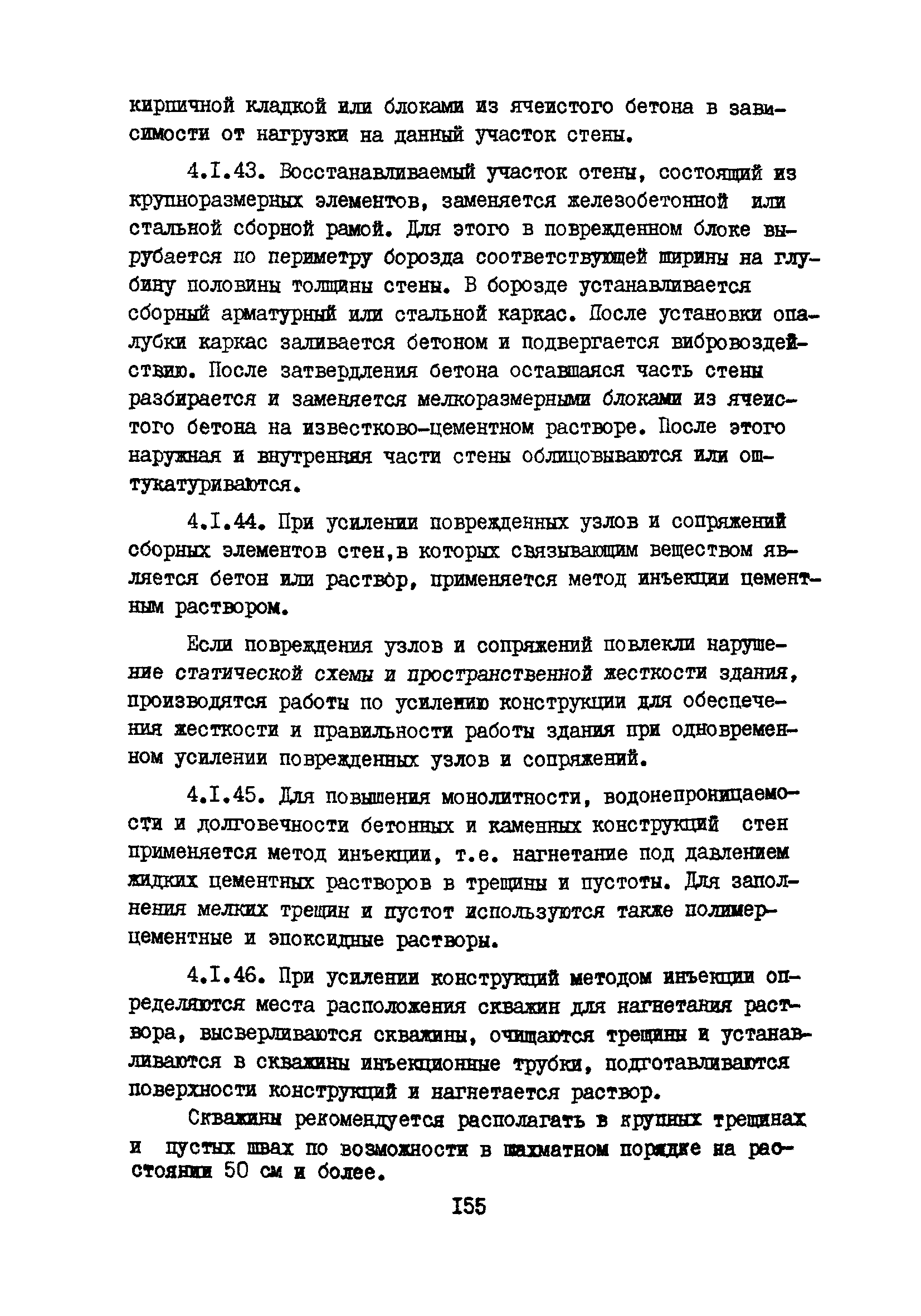 | Оглавление: | 1. Общие положения 2. Технические требования к эксплуатационным качествам зданий и сооружений 2.1 Требования к основаниям и элементам зданий и сооружений Общие положения Основания Фундаменты Стены и перегородки Колонны Перекрытия Покрытия, крыши и кровли Лестницы Полы Двери, ворота, окна и фонари 2.2 Требования к эксплуатационным и физическим качествам зданий, сооружений и их конструктивных элементов Теплотехнические качества Звукоизоляционные качества, освещенность 2.3 Требования к антикоррозионной защите конструкций 3. Методика обследования зданий и сооружений по эксплуатационной пригодности 3.1 Порядок проведения обследования технического состояния зданий и сооружений 3.2 Методы и средства контроля эксплуатационной пригодности зданий и сооружений Исследование грунтов оснований Контроль прочностных и деформационных характеристик бетонов и каменных материалов Контроль прочностных и деформационных характеристик металлов Контроль перемещений конструкций Контроль армирования, наличия закладных элементов и толщины защитного слоя в железобетонных и армокаменных конструкциях Контроль дефектов и повреждений Контроль уровня шума Контроль уровня вибрации Контроль теплозащитных качеств ограждающих конструкций Контроль герметичности ограждающих конструкций Контроль агрессивности среды и степени коррозии конструкций 3.3 Обследование оснований и конструктивных элементов зданий и сооружений Основания Фундаменты Каркасы зданий Стены и перегородки Колонны Перекрытия Покрытия, крыши и кровли Лестницы Полы Двери, ворота, окна и фонари 3.4 Определение фактических нагрузок и воздействий 3.5 Проведение поверочных расчетов 3.6 Составление заключения и состоянии обследованного здания (сооружения) 4. Рекомендации по совершенствованию эксплуатационных качеств зданий и сооружений 4.1 Восстановление и улучшение эксплуатационных качеств оснований и конструктивных элементов зданий и сооружений Основания Фундаменты Стены и перегородки Колонны Перекрытия и полы Покрытия, крыши и кровли Лестницы 4.2 Улучшение физических качеств зданий и сооружений Защита наружных конструкций от увлажнения Гидроизоляция фундаментов и подвалов Герметизация ограждающих конструкций Снижение теплопотерь Звукоизоляция и виброизоляция Освещенность 4.3 Повышение коррозионной стойкости строительных конструкций Металлические конструкции Бетонные, железобетонные и каменные конструкции Приложения |
