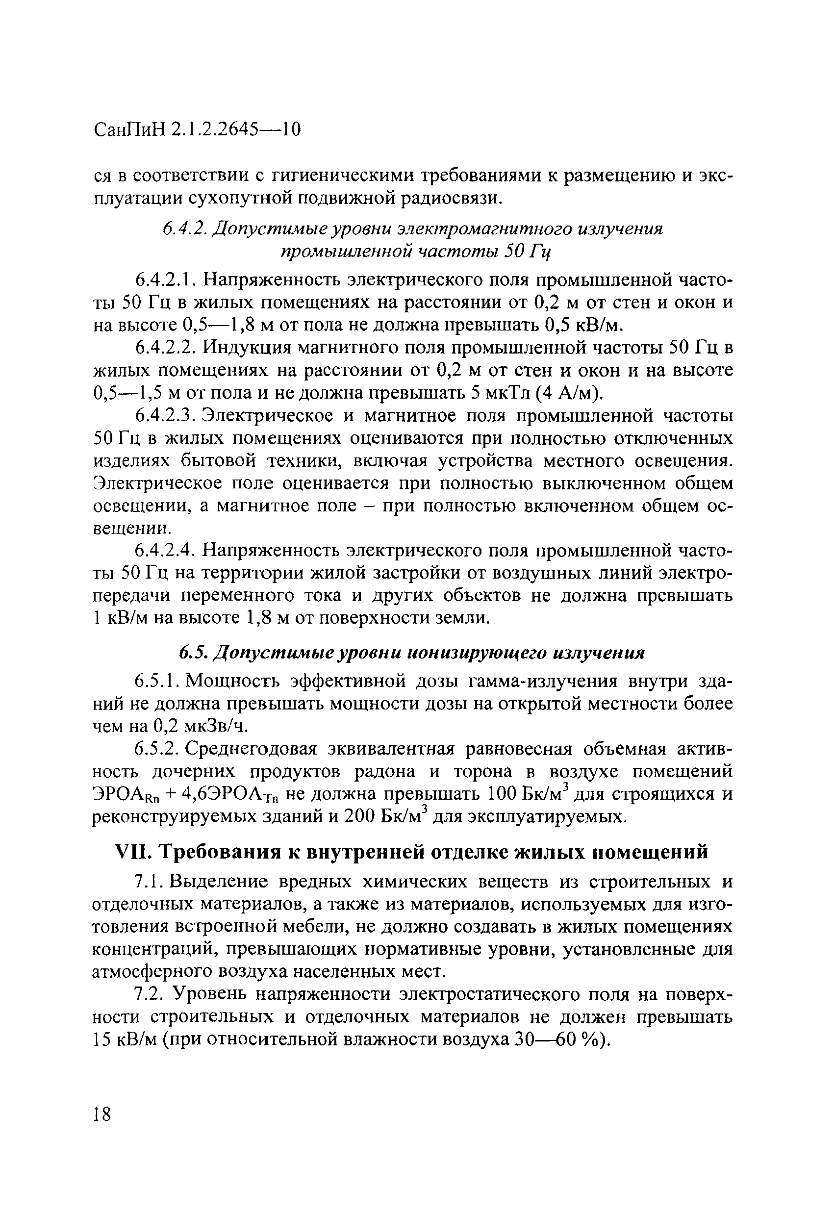 Санитарно-эпидемиологические требования к условиям проживания в жилых зданиях и помещениях| Обозначение: | СанПиН 2.1.2.2645-10 | | Обозначение англ: | SANPIN 2.1.2.2645-10 | | Статус: | действует | | Название рус.: | Санитарно-эпидемиологические требования к условиям проживания в жилых зданиях и помещениях | | Дата добавления в базу: | 01.09.2013 | | Дата актуализации: | 01.01.2021 | | Дата введения: | 15.08.2010 | | Дата окончания срока действия: | 01.01.2021 | | Область применения: | Санитарные правила устанавливают обязательные санитарно-эпидемиологические требования к условиям проживания в жилых зданиях и помещениях, которые следует соблюдать при размещении, проектировании, реконструкции, строительстве и эксплуатации жилых зданий и помещений, предназначенных для постоянного проживания и предназначены для граждан, индивидуальных предпринимателей и юридических лиц, деятельность которых связана с проектированием, строительством, реконструкцией и эксплуатацией жилых зданий и помещений, а также для органов, уполномоченных осуществлять государственный санитарно-эпидемиологический надзор. | | Оглавление: | I. Общие положения и область применения II. Гигиенические требования к участку и территории жилых зданий при их размещении III. Гигиенические требования к жилым помещениям и помещениям общественного назначения, размещаемых в жилых зданиях IV. Гигиенические требования к отоплению, вентиляции, микроклимату и воздушной среде помещений V. Гигиенические требования к естественному и искусственному освещению и инсоляции VI. Гигиенические требования к уровням шума, вибрации, ультразвука и инфразвука, электрических и электромагнитных полей и ионизирующего излучения в помещениях жилых зданий VII. Требования к внутренней отделке жилых помещений VIII. Требования к инженерному оборудованию IX. Требования к содержанию жилых помещений Приложение 1 Нормы освещенности придомовых территорий Приложение 2 Допустимые нормы температуры, относительной влажности и скорости движения воздуха в помещениях жилых зданий Приложение 3 Допустимые уровни звукового давления в октавных полосах частот, эквивалентных и максимальных уровней звука проникающего шума в помещения жилых зданий Приложение 4 Допустимые уровни вибрации в помещениях жилых домов от внутренних и внешних источников Приложение 5 Допустимые уровни инфразвука для жилых помещений Приложение 6 Допустимые уровни электромагнитного излучения радиочастотного диапазона в жилых помещениях (включая балконы и лоджии) Библиографические данные | | Разработан: | Федеральная служба по надзору в сфере защиты прав потребителей и благополучия человека Федеральный научный центр гигиены им. Ф.Ф. Эрисмана Управление Роспотребнадзора по г. Москве