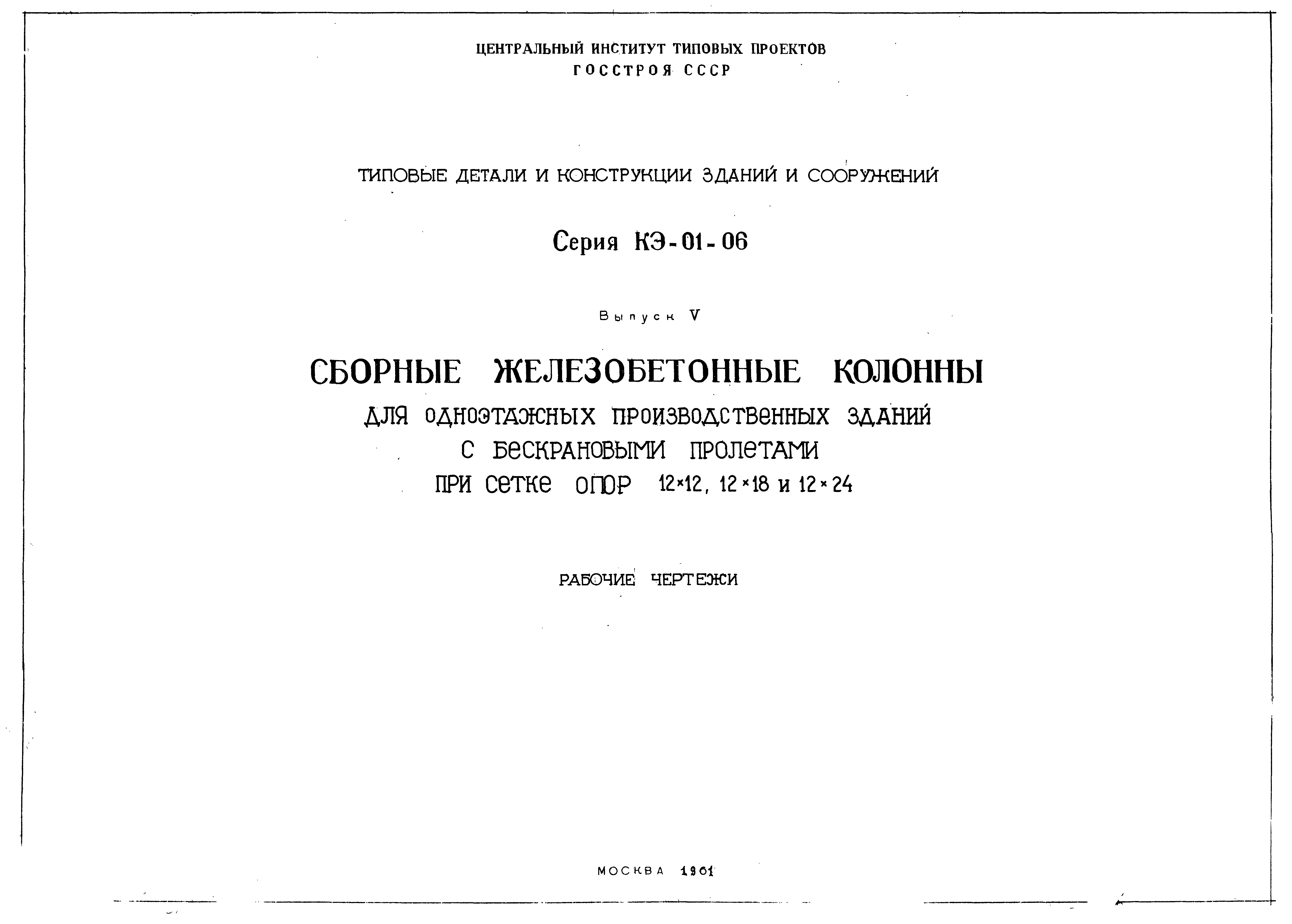 | Название рус.: | Выпуск V. Сборные железобетонные колонны для одноэтажных производственных зданий с бескрановыми пролетами при сетке опор 12х12, 12х18 и 12х24. Рабочие чертежи |