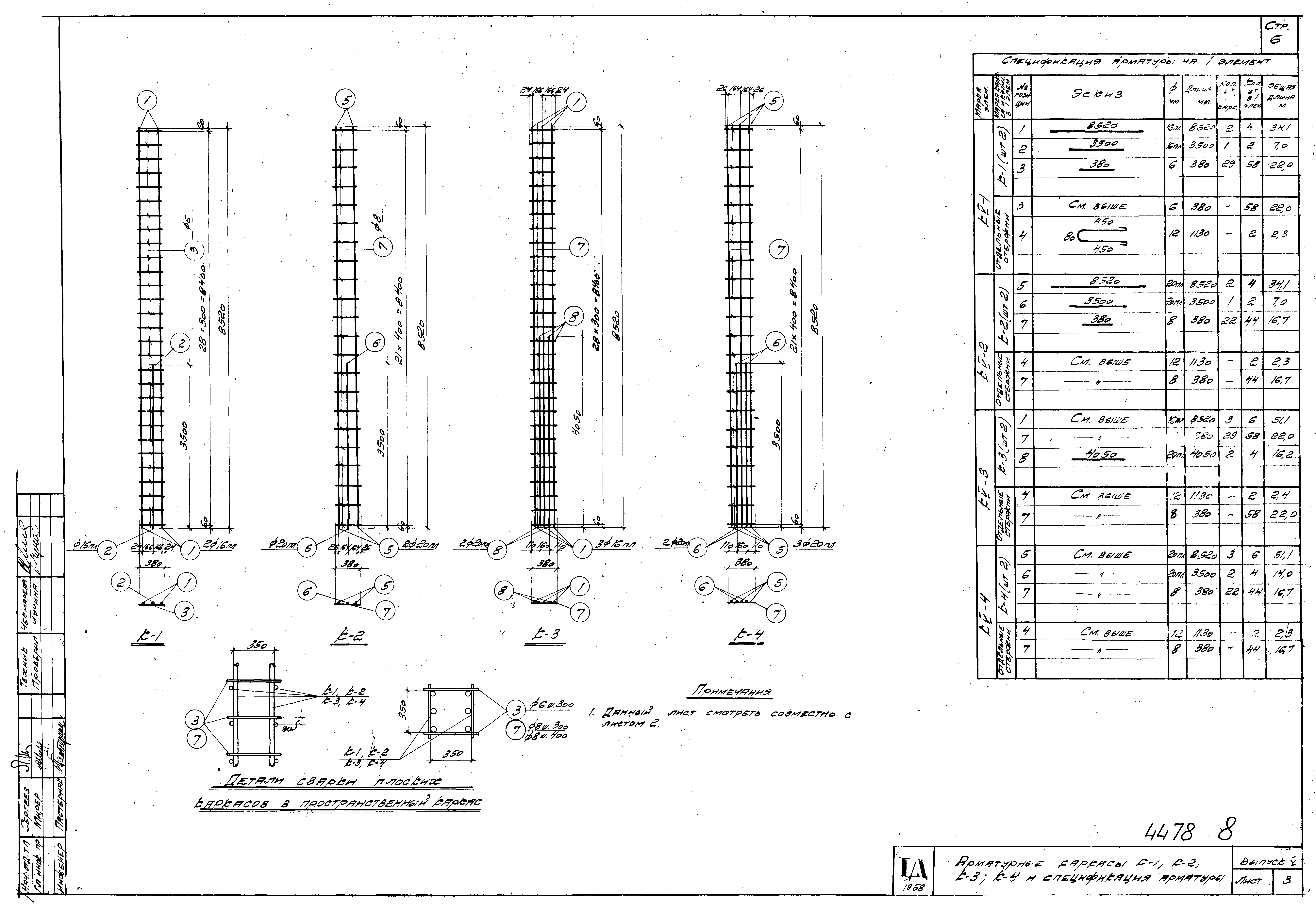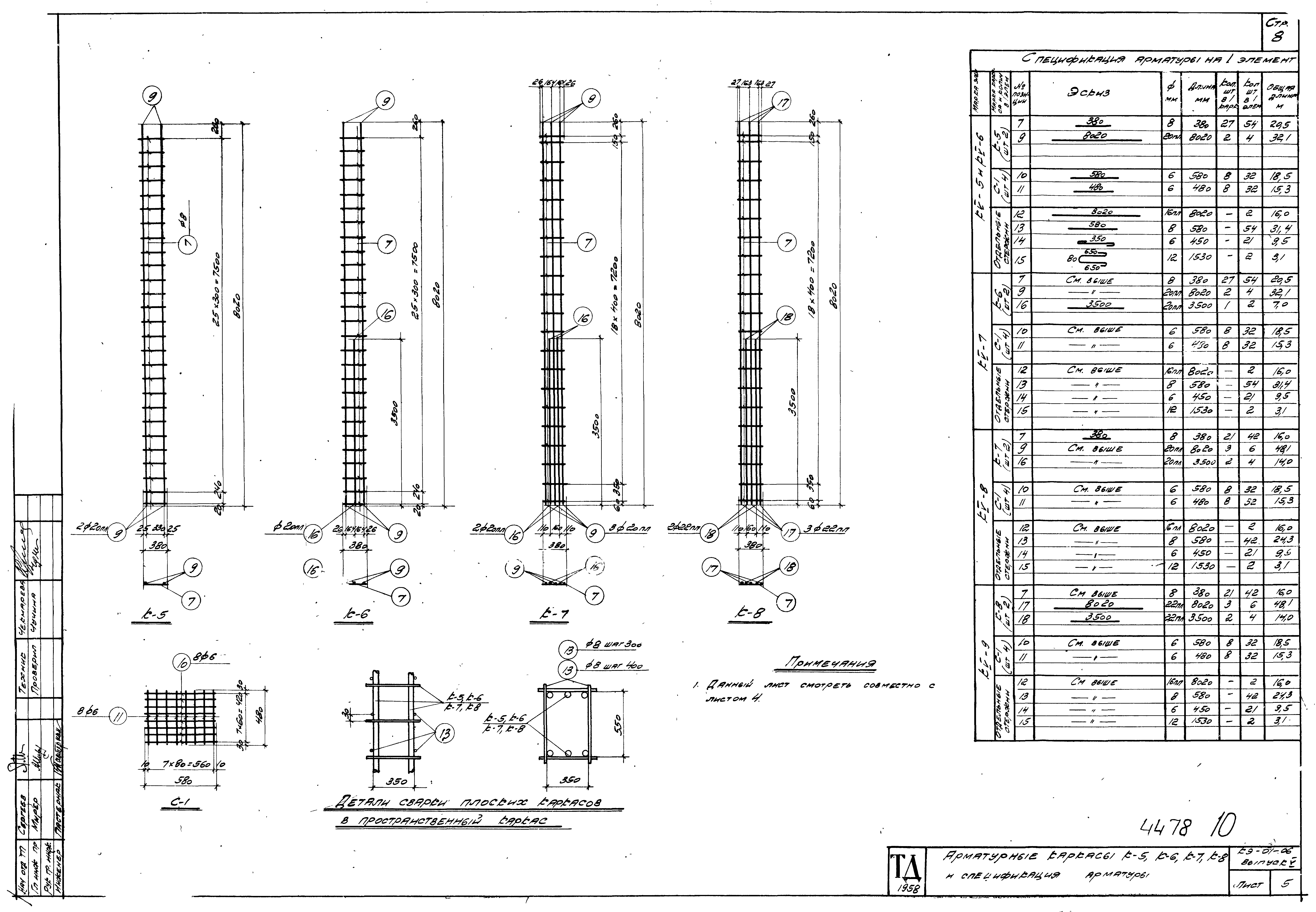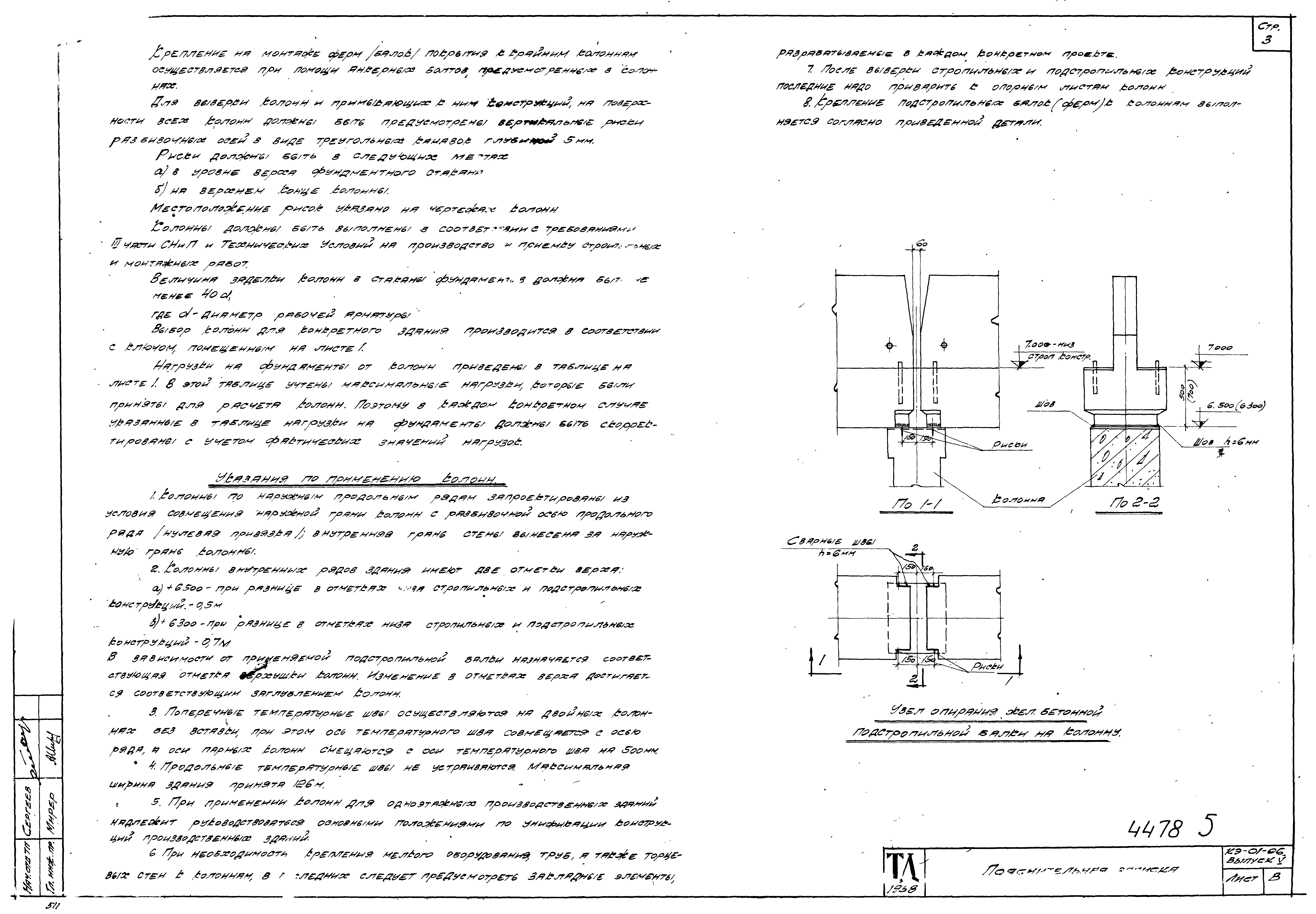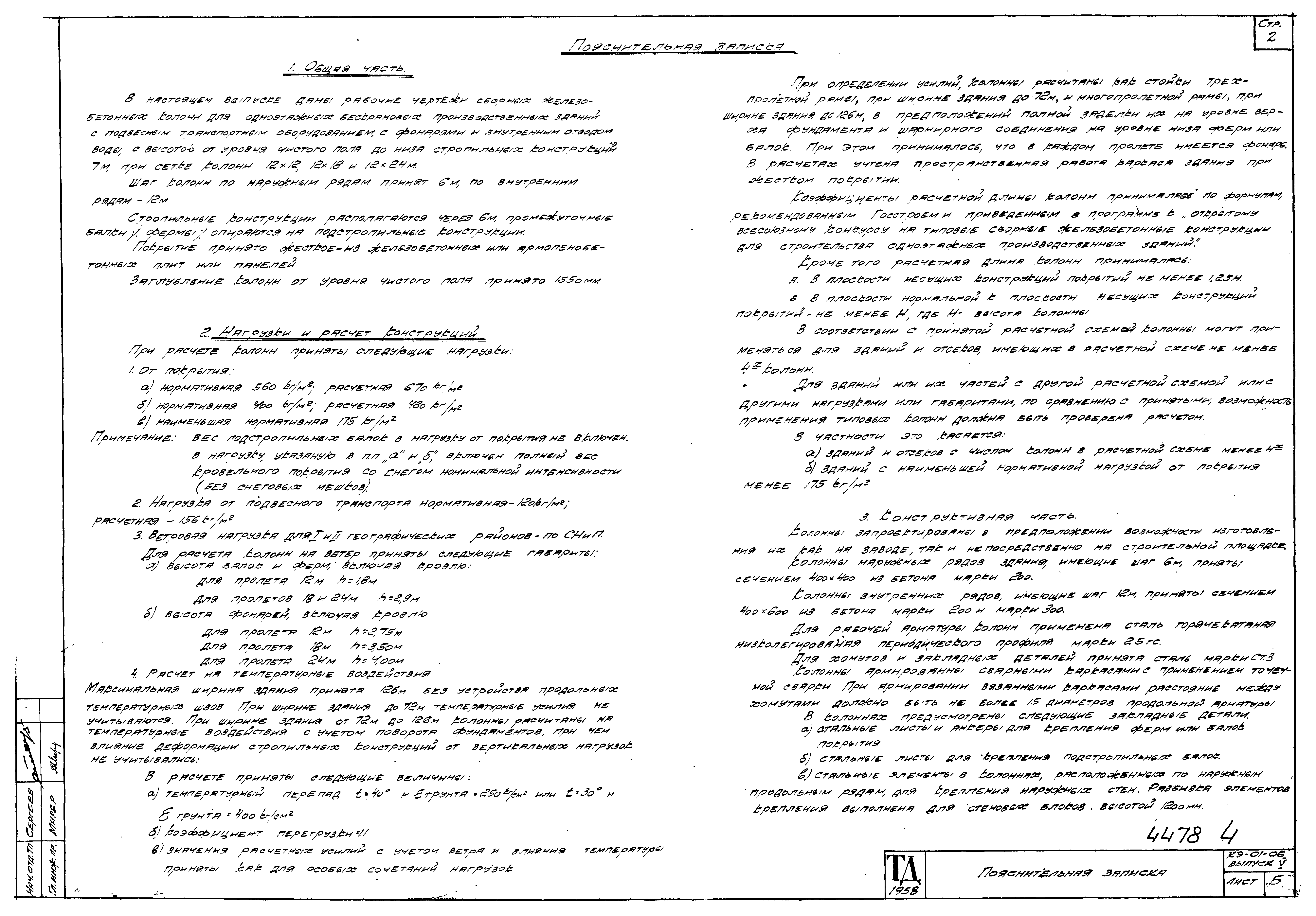 | Оглавление: | КЭ-01-06 Пояснительная записка КЭ-01-06 Лист 1. Нагрузки на фундаменты; ключ к железобетонным колоннам КЭ-01-06 Лист 2. Колонны КV-1,КV-2,КV-3,КV-4 КЭ-01-06 Лист 3. Арматурные каркасы К-1,К-2,К-3,К-4 и спецификация арматуры КЭ-01-06 Лист 4. Колонны КV-5,КV-6,КV-7,КV-8,КV-9 КЭ-01-06 Лист 5. Арматурные каркасы К-5,К-6,К-7,К-8 и спецификация арматуры КЭ-01-06 Лист 6. Закладные элементы М-1,М-2,М-3 и спецификация стали |