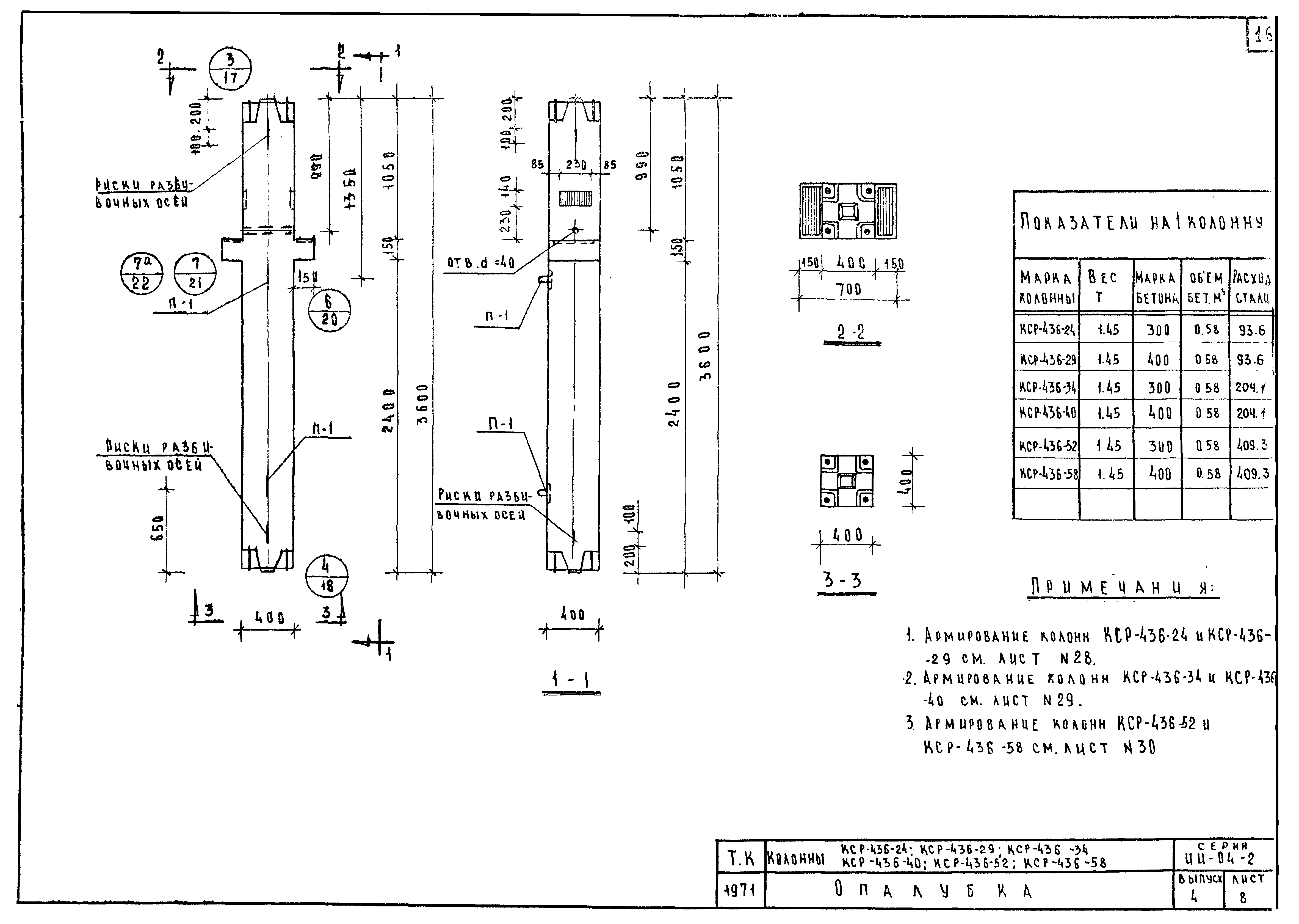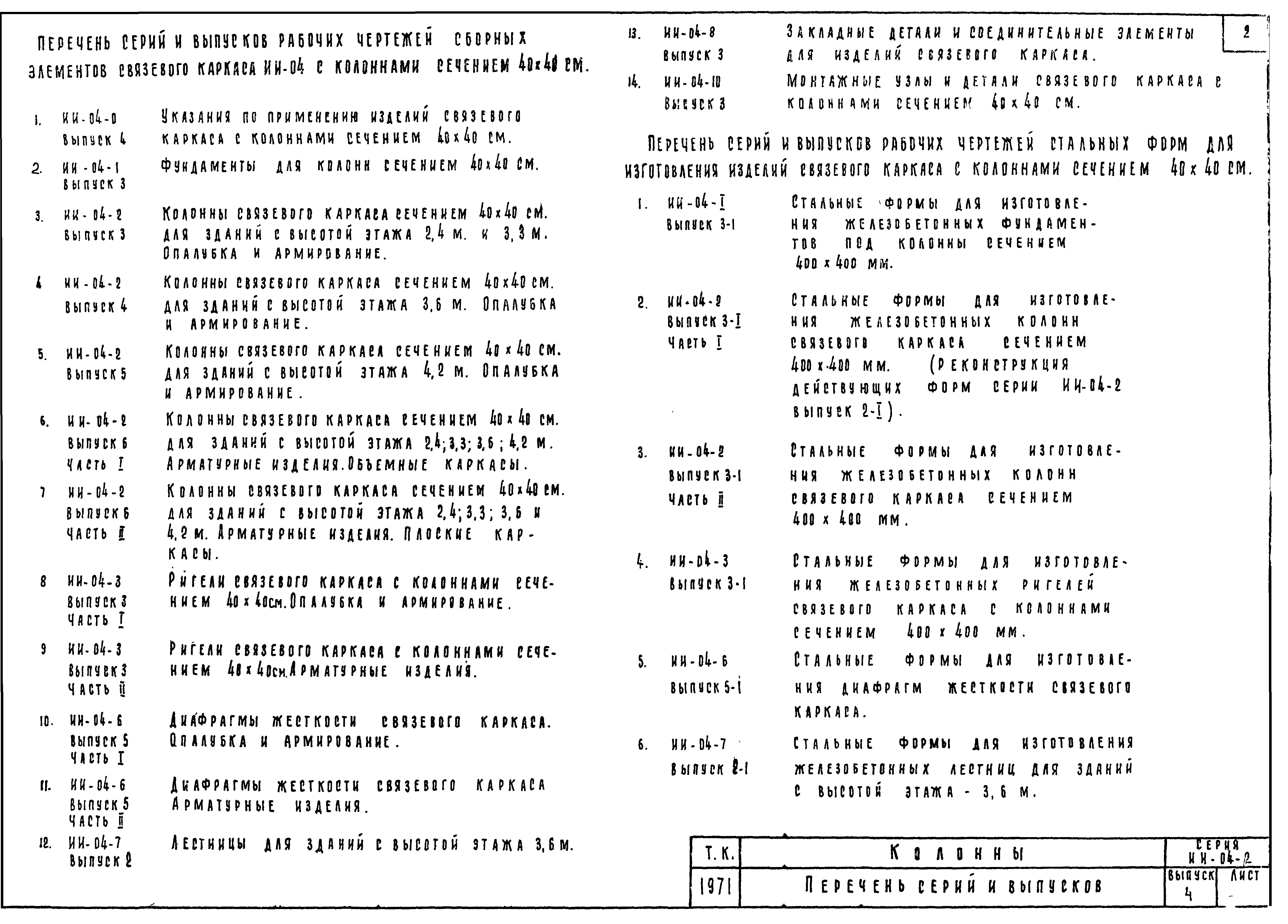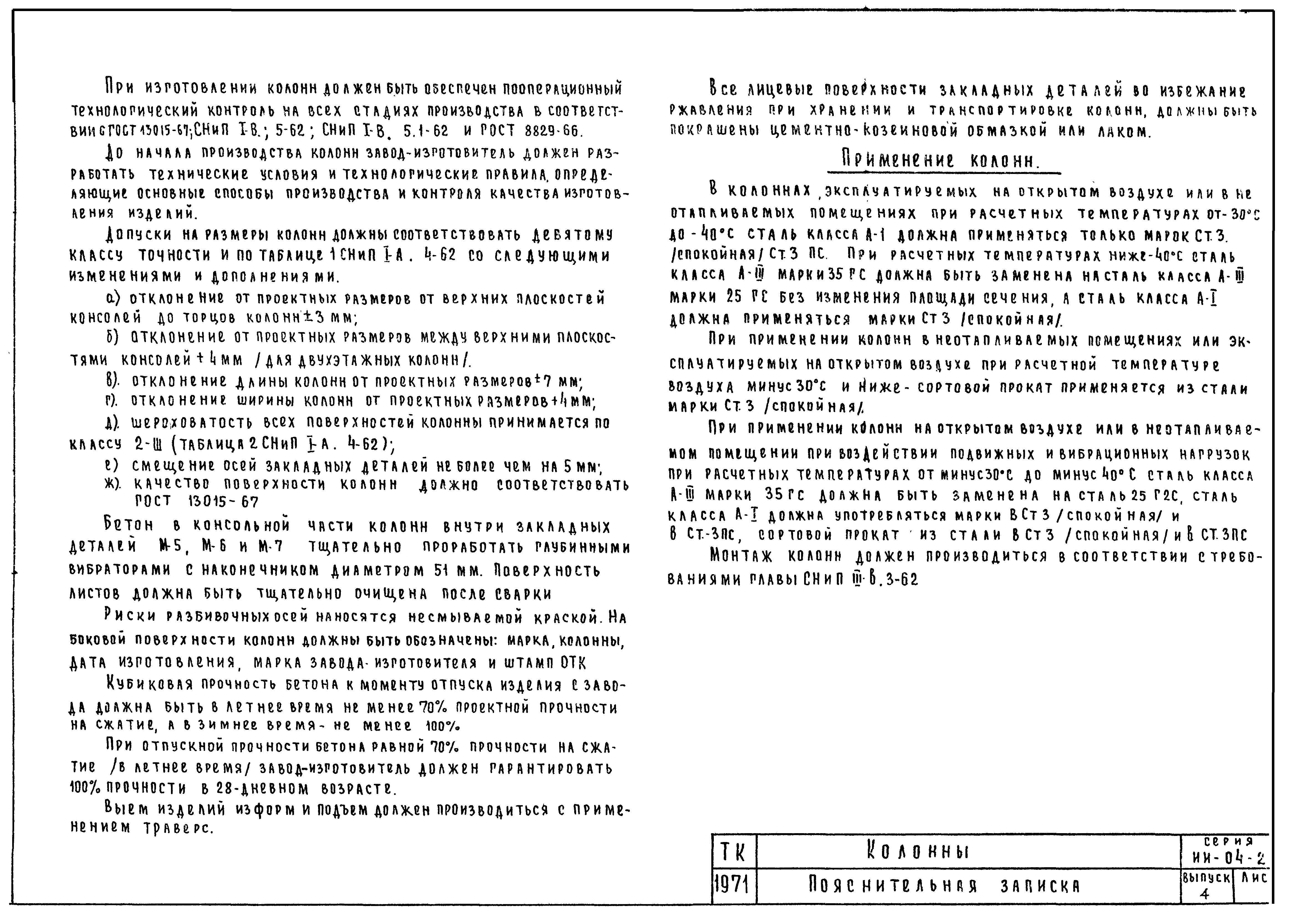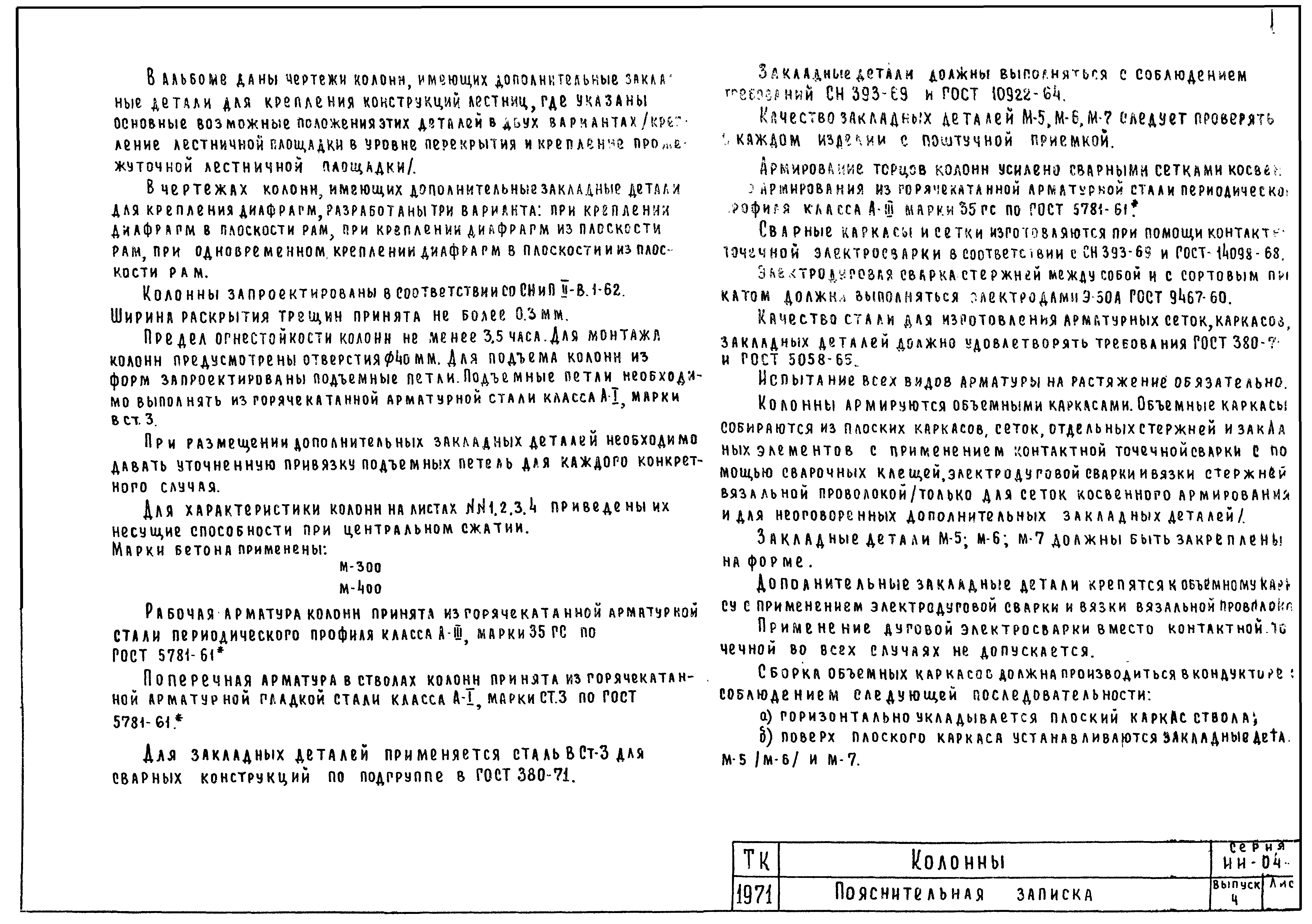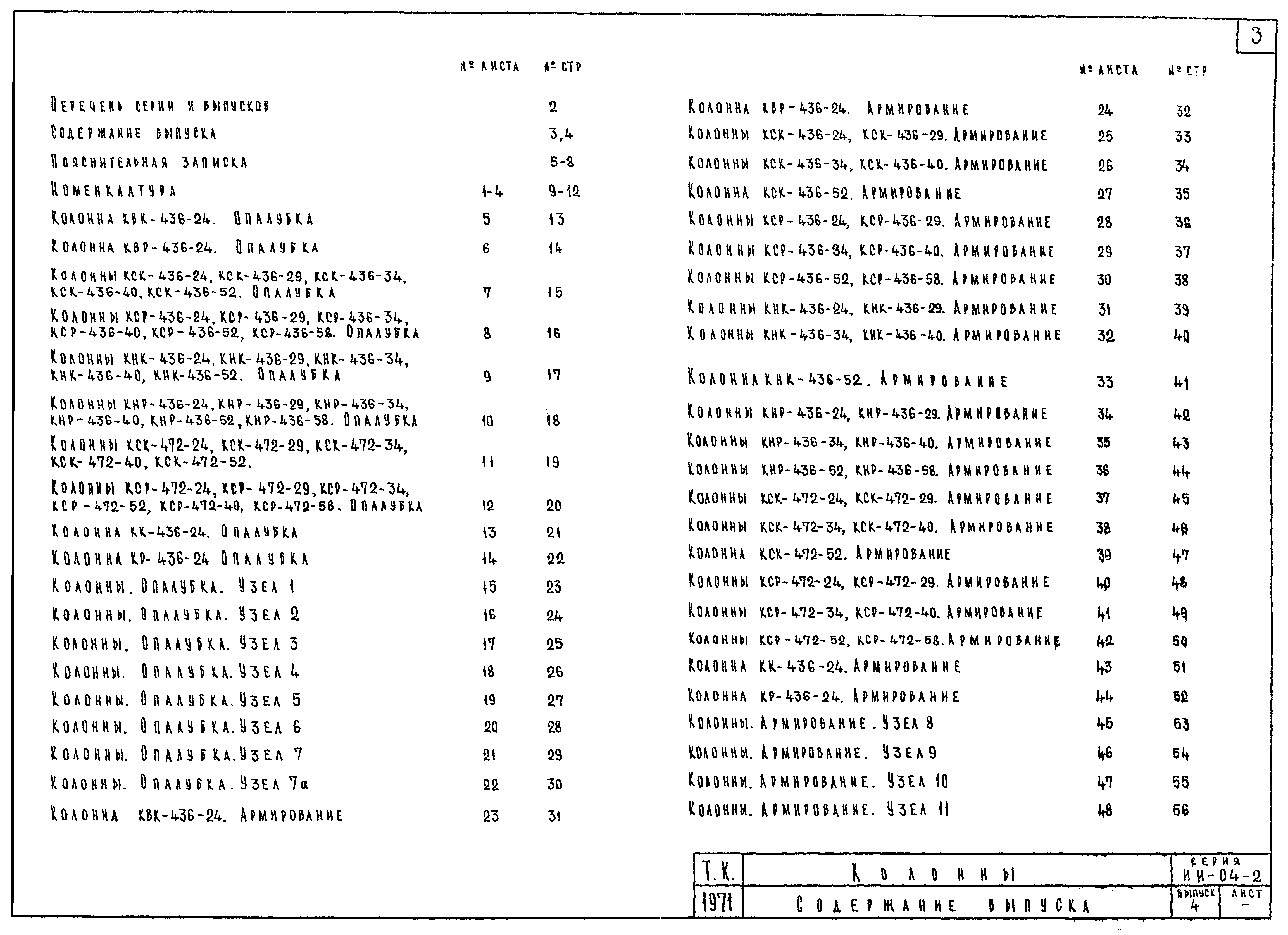 | Оглавление: | ИИ-04-2 Перечень серии и выпусков ИИ-04-2 Содержание выпуска ИИ-04-2 Пояснительная записка ИИ-04-2 Лист 1. Номенклатура ИИ-04-2 Лист 2. Номенклатура ИИ-04-2 Лист 3. Номенклатура ИИ-04-2 Лист 4. Номенклатура ИИ-04-2 Лист 5. Колонна КВК-436-24. Опалубка ИИ-04-2 Лист 6. Колонна КВР-436-24. Опалубка ИИ-04-2 Лист 7. Колонны КСК-436-24,КСК-436-29,КСК-436-34,КСК-436-40,КСК-436-52. Опалубка ИИ-04-2 Лист 8. Колонны КСР-436-24,КСР-436-29,КСР-436-34,КСР-436-40,КСР-436-52,КСР-436-58. Опалубка ИИ-04-2 Лист 9. Колонны КНК-436-24,КНК-436-29,КНК-436-34,КНК-436-40,КНК-436-52. Опалубка ИИ-04-2 Лист 10. Колонны КНР-436-24,КНР-436-29,КНР-436-34,КНР-436-40,КНР-436-52,КНР-436-58. Опалубка ИИ-04-2 Лист 11. Колонны КСК-472-24,КСК-472-29,КСК-472-34,КСК-472-40,КСК-472-52. Опалубка ИИ-04-2 Лист 12. Колонны КСР-472-24,КСР-472-29,КСР-472-34,КСР-472-40,КСР-472-52,КСР-472-58. Опалубка ИИ-04-2 Лист 13. Колонна КК-436-24. Опалубка ИИ-04-2 Лист 14. Колонна КР-436-24. Опалубка ИИ-04-2 Лист 15. Колонны. Опалубка. Узел 1 ИИ-04-2 Лист 16. Колонны. Опалубка. Узел 2 ИИ-04-2 Лист 17. Колонны. Опалубка. Узел 3 ИИ-04-2 Лист 18. Колонны. Опалубка. Узел 4 ИИ-04-2 Лист 19. Колонны. Опалубка. Узел 5 ИИ-04-2 Лист 20. Колонны. Опалубка. Узел 6 ИИ-04-2 Лист 21. Колонны. Опалубка. Узел 7 ИИ-04-2 Лист 22. Колонны. Опалубка. Узел 7а ИИ-04-2 Лист 23. Колонна КВК-436-24. Армирование ИИ-04-2 Лист 24. Колонна КВР-436-24. Армирование ИИ-04-2 Лист 25. Колонны КСК-436-24,КСК-436-29. Армирование ИИ-04-2 Лист 26. Колонны КСК-436-34,КСК-436-40. Армирование ИИ-04-2 Лист 27. Колонна КСК-436-52. Армирование ИИ-04-2 Лист 28. Колонны КСР-436-24,КСР-436-29. Армирование ИИ-04-2 Лист 29. Колонны КСР-436-34,КСР-436-40. Армирование ИИ-04-2 Лист 30. Колонны КСР-436-52,КСР-436-58. Армирование ИИ-04-2 Лист 31. Колонны КНК-436-24,КНК-436-29. Армирование ИИ-04-2 Лист 32. Колонны КНК-436-34,КНК-436-40. Армирование ИИ-04-2 Лист 33. Колонка КНК-436-52. Армирование ИИ-04-2 Лист 34. Колонны КНР-436-24,КНР-436-29. Армирование ИИ-04-2 Лист 35. Колонны КНР-436-34,КНР-436-40. Армирование ИИ-04-2 Лист 36. Колонны КНР-436-52,КНР-436-58. Армирование ИИ-04-2 Лист 37. Колонны КСК-472-24,КСК-472-29. Армирование ИИ-04-2 Лист 38. Колонны КСК-472-34,КСК-472-40. Армирование ИИ-04-2 Лист 39. Колонна КСК-472-52. Армирование ИИ-04-2 Лист 40. Колонны КСР-472-24,КСР-472-29. Армирование ИИ-04-2 Лист 41. Колонны КСР-472-34,КСР-472-40. Армирование ИИ-04-2 Лист 42. Колонны КСР-472-52,КСР-472-58. Армирование ИИ-04-2 Лист 43. Колонна КК-436-24. Армирование ИИ-04-2 Лист 44. Колонна КР-436-24. Армирование ИИ-04-2 Лист 45. Колонны. Армирование. Узел 8 ИИ-04-2 Лист 46. Колонны. Армирование. Узел 9 ИИ-04-2 Лист 47. Колонны. Армирование. Узел 10 ИИ-04-2 Лист 48. Колонны. Армирование. Узел 11 ИИ-04-2 Лист 49. Колонны. Армирование. Узел 12 ИИ-04-2 Лист 50. Колонны. Армирование. Узел 13 ИИ-04-2 Лист 51. Колонны. Армирование. Узел 14 ИИ-04-2 Лист 52. Колонны. Армирование. Узел 15 ИИ-04-2 Лист 53,54. Колонны. Армирование. Узел 16,17 ИИ-04-2 Лист 55. Колонны. Армирование. Узел 18 ИИ-04-2 Лист 56. Колонны. Армирование. Узел 19 ИИ-04-2 Лист 57. Колонны. Армирование. Узел 20 ИИ-04-2 Лист 58. Колонны. Армирование. Узел 21 ИИ-04-2 Лист 59. Колонны. Армирование. Узел 22 ИИ-04-2 Лист 60. Колонны. Армирование. Узел 23 ИИ-04-2 Лист 61. Колонны. Армирование. Узел 24 ИИ-04-2 Лист 62-64. Колонны. Армирование. Узел 25а,25б,25в ИИ-04-2 Лист 65. Колонны. Пример расположения дополнительных закладных деталей для крепления лестниц ИИ-04-2 Лист 66. Колонны. Пример расположения дополнительных закладных деталей для крепления лестниц ИИ-04-2 Лист 67. Колонны. Пример расположения дополнительных закладных деталей для крепления лестниц ИИ-04-2 Лист 68. Колонны. Пример расположения дополнительных закладных деталей для крепления лестниц ИИ-04-2 Лист 69. Колонны. Пример расположения дополнительных заклад