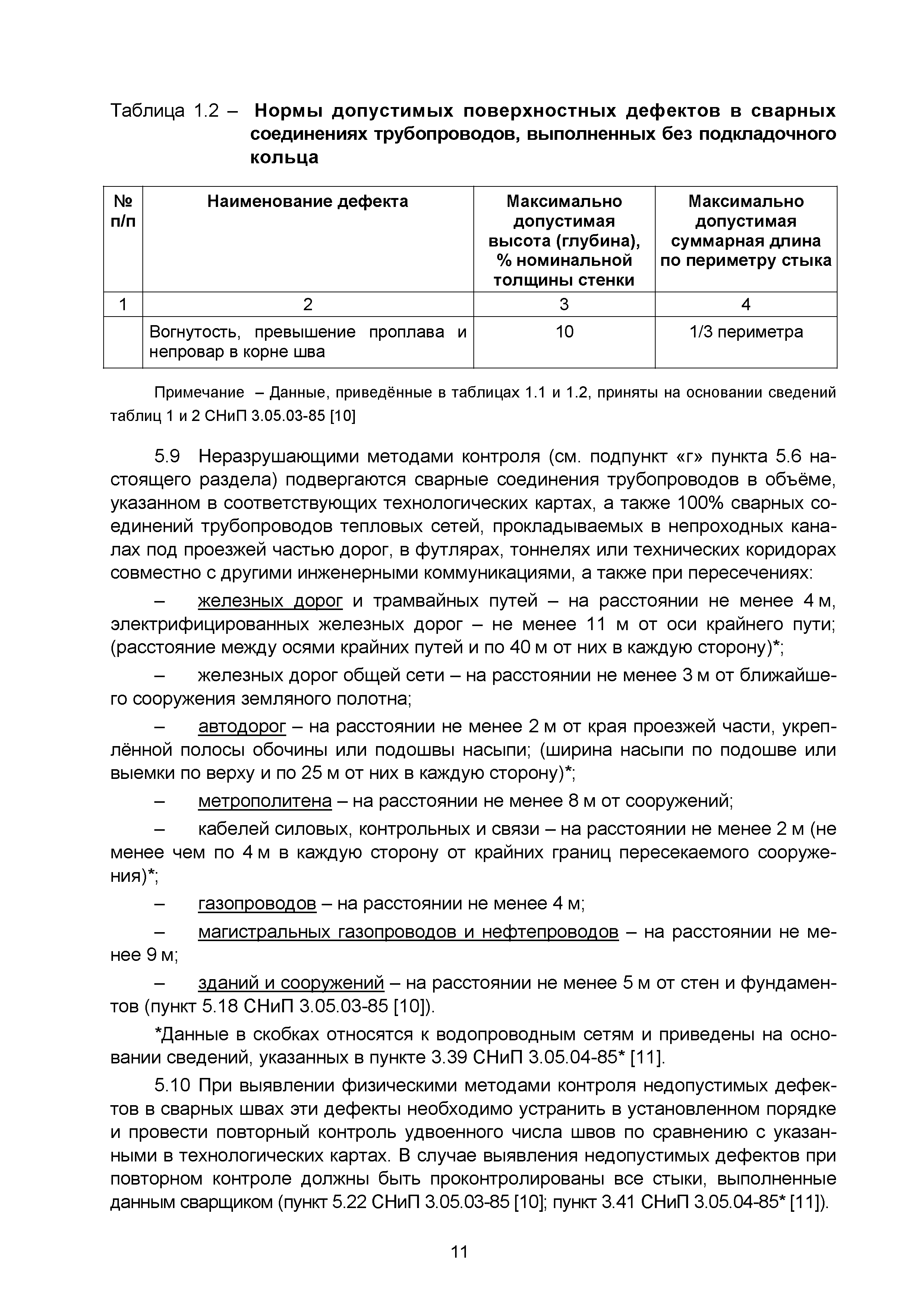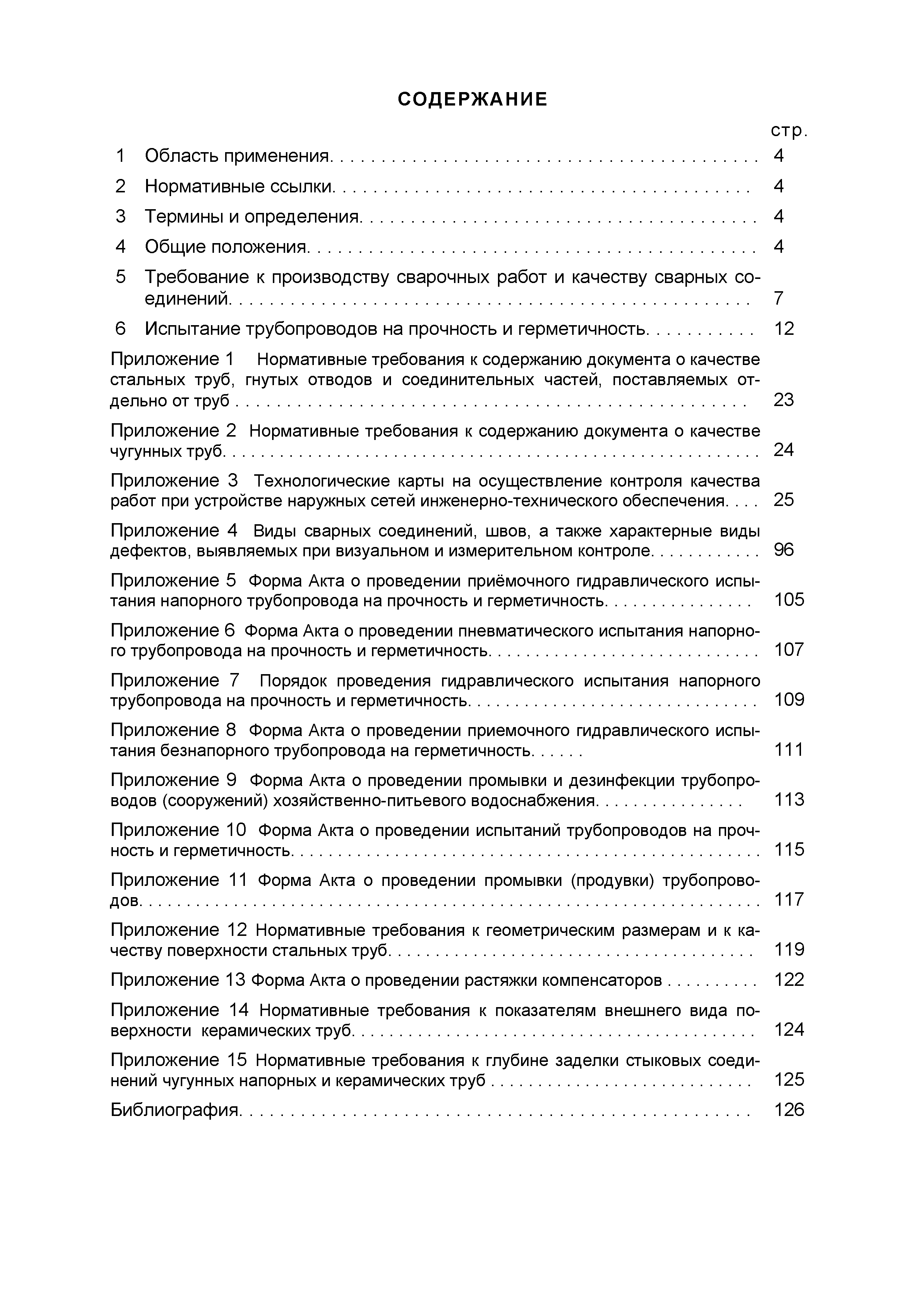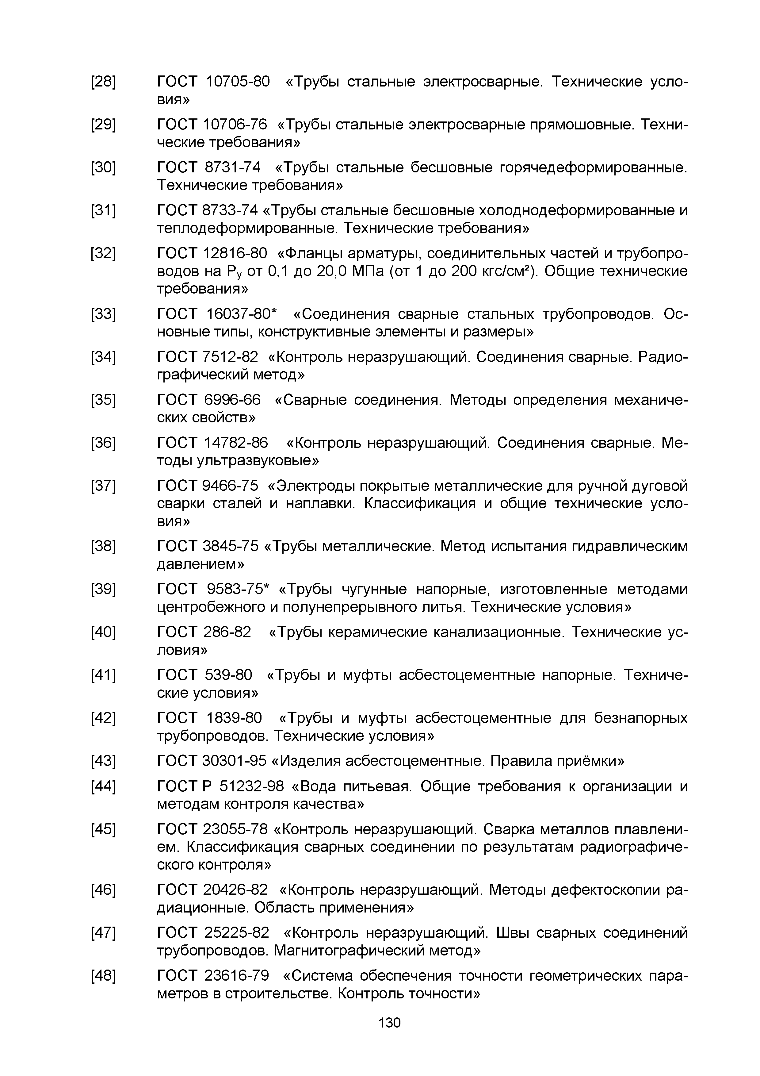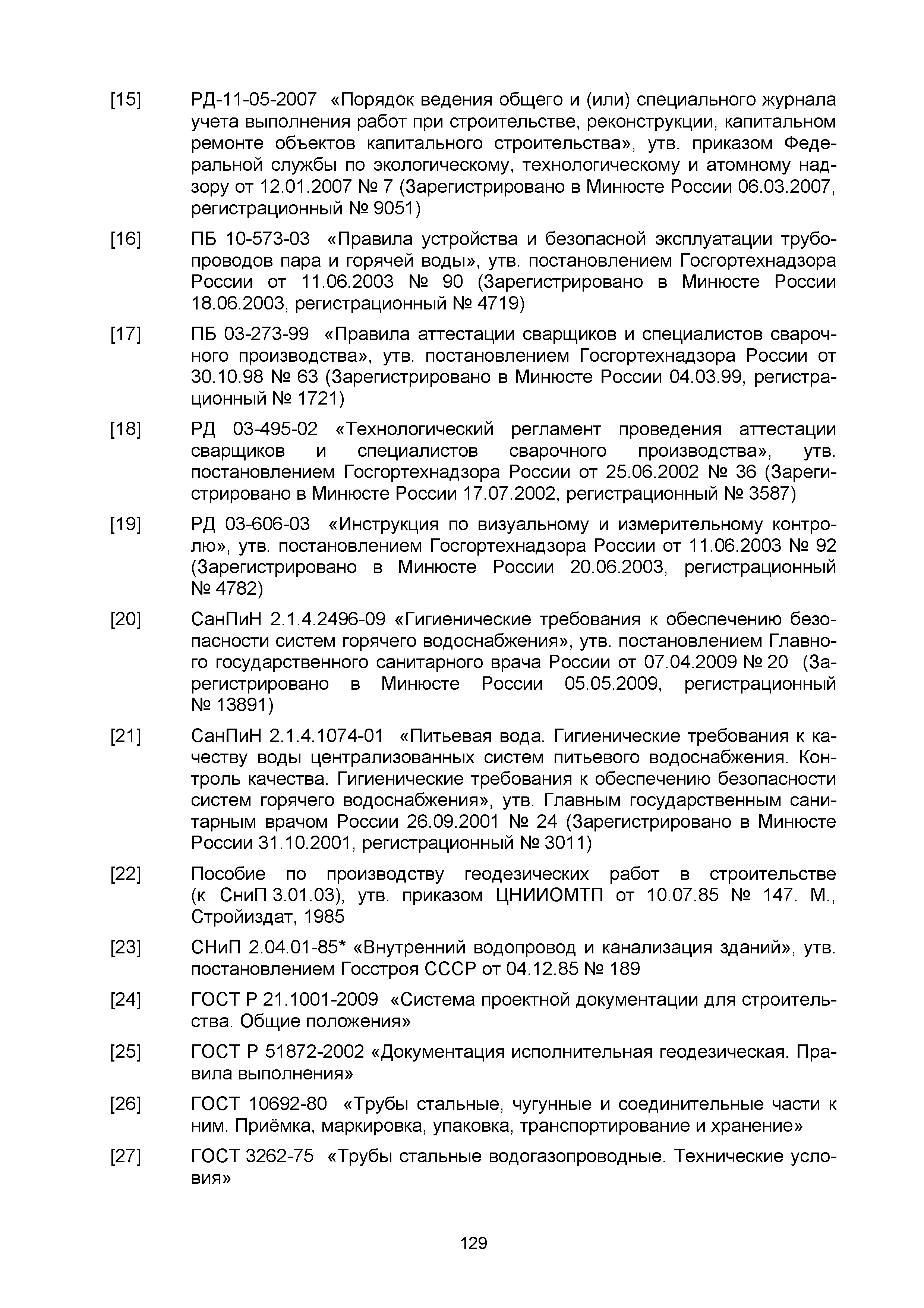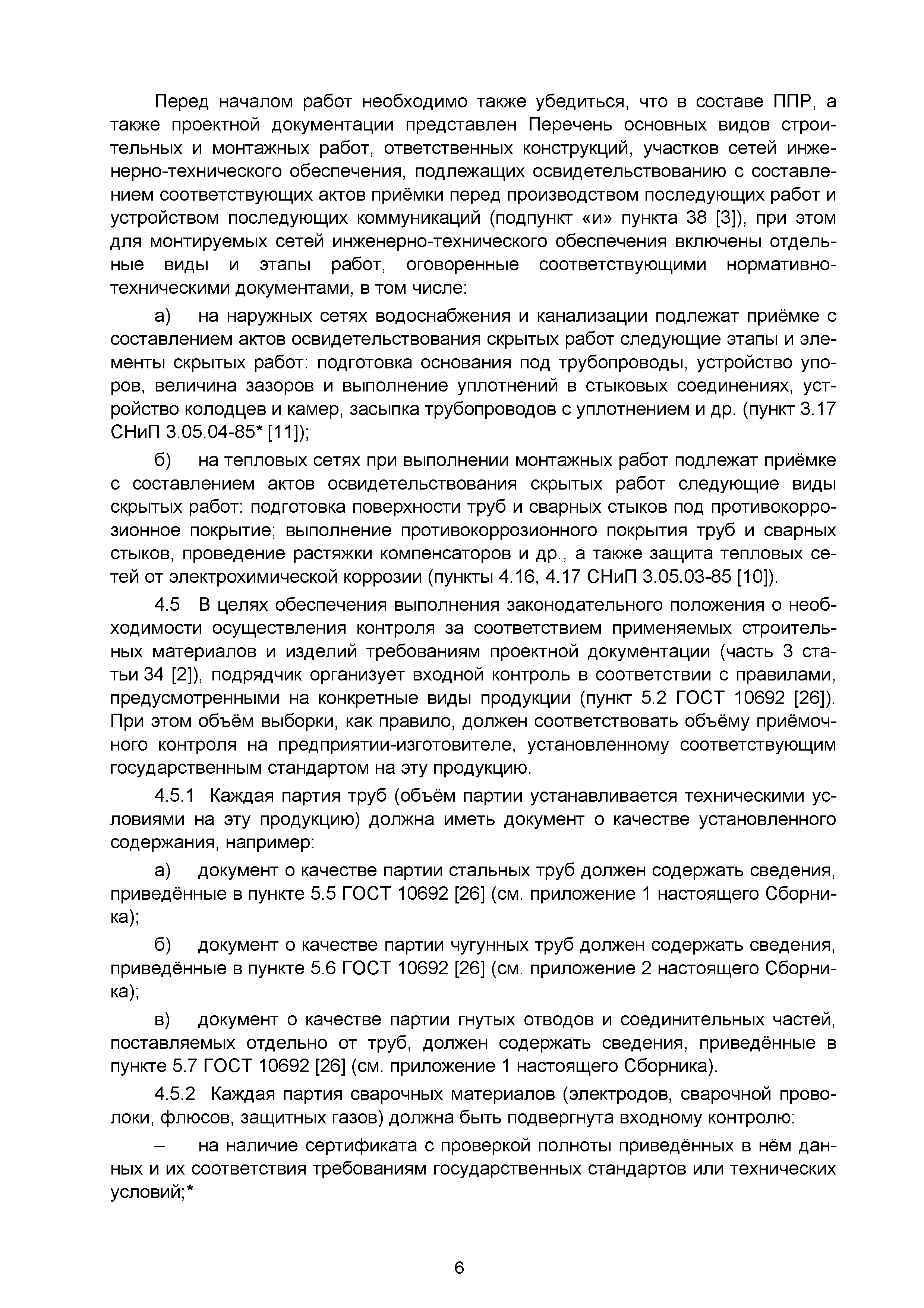 | | Нормативные ссылки: |   СНиП 3.01.03-84 «Геодезические работы в строительстве»  СНиП 3.04.03-85 «Защита строительных конструкций и сооружений от коррозии»  СНиП 2.06.14-85 «Защита горных выработок от подземных и поверхностных вод»  СНиП 2.04.02-84* «Водоснабжение. Наружные сети и сооружения»  СНиП 3.05.04-85* «Наружные сети и сооружения водоснабжения и канализации»  СНиП 3.05.03-85 «Тепловые сети»  СНиП 3.02.01-87 «Земляные сооружения, основания и фундаменты»  СНиП 3.03.01-87 «Несущие и ограждающие конструкции»  ГОСТ 23616-79 «Система обеспечения точности геометрических параметров в строительстве. Контроль точности»  ГОСТ 286-82 «Трубы керамические канализационные. Технические условия»  ГОСТ 539-80 «Трубы и муфты асбестоцементные напорные. Технические условия»  ГОСТ 1839-80 «Трубы и муфты асбестоцементные для безнапорных трубопроводов. Технические условия»  ГОСТ 30301-95 «Изделия асбестоцементные. Правила приемки»  ГОСТ 3262-75 «Трубы стальные водогазопроводные. Технические условия»  ГОСТ 3845-75 «Трубы металлические. Метод испытания гидравлическим давлением»  ГОСТ 6996-66 «Сварные соединения. Методы определения механических свойств»  ГОСТ 7512-82 «Контроль неразрушающий. Соединения сварные. Радиографический метод»  ГОСТ 9466-75 «Электроды покрытые металлические для ручной дуговой сварки сталей и наплавки. Классификация и общие технические условия»  ГОСТ 9583-75 «Трубы чугунные напорные, изготовленные методами центробежного и полунепрерывного литья. Технические условия»  ГОСТ 10692-80 «Трубы стальные, чугунные и соединительные части к ним. Приемка, маркировка, упаковка, транспортирование и хранение»  ГОСТ 10705-80 «Трубы стальные электросварные. Технические условия»  ГОСТ 10706-76 «Трубы стальные электросварные прямошовные. Технические требования»  ГОСТ 14782-86 «Контроль неразрушающий. Соединения сварные. Методы ультразвуковые»  ГОСТ 16037-80 «Соединения сварные стальных трубопроводов. Основные типы, конструктивные элементы и размеры»  ГОСТ 20426-82 «Контроль неразрушающий. Методы дефектоскопии радиационные. Область применения»  ГОСТ 25225-82 «Контроль неразрушающий. Швы сварных соединений трубопроводов. Магнитографический метод»  ГОСТ Р 51232-98 «Вода питьевая. Общие требования к организации и методам контроля качества»  ГОСТ 23118-99 «Конструкции стальные строительные. Общие технические условия»  ПБ 03-273-99 «Правила аттестации сварщиков и специалистов сварочного производства»  ГОСТ 8733-74 «Трубы стальные бесшовные холоднодеформированные и теплодеформированные. Технические требования»  ГОСТ 12816-80 «Фланцы арматуры, соединительных частей и трубопроводов на Ру от 0,1 до 20,0 МПа (от 1 до 200 кгс/см2). Общие технические требования»  ГОСТ 23055-78 «Контроль неразрушающий. Сварка металлов плавлением. Классификация сварных соединений по результатам радиографического контроля»  ГОСТ 8731-74 «Трубы стальные бесшовные горячедеформированные. Технические требования»  СанПиН 2.1.4.1074-01 «Питьевая вода. Гигиенические требования к качеству воды централизованных систем питьевого водоснабжения. Контроль качества. Гигиенические требования к обеспечению безопасности систем горячего водоснабжения»  ГОСТ Р 51872-2002 «Документация исполнительная геодезическая. Правила выполнения»  ПБ 10-573-03 «Правила устройства и безопасной эксплуатации трубопроводов пара и горячей воды»  РД 03-495-02 «Технологический регламент проведения аттестации с