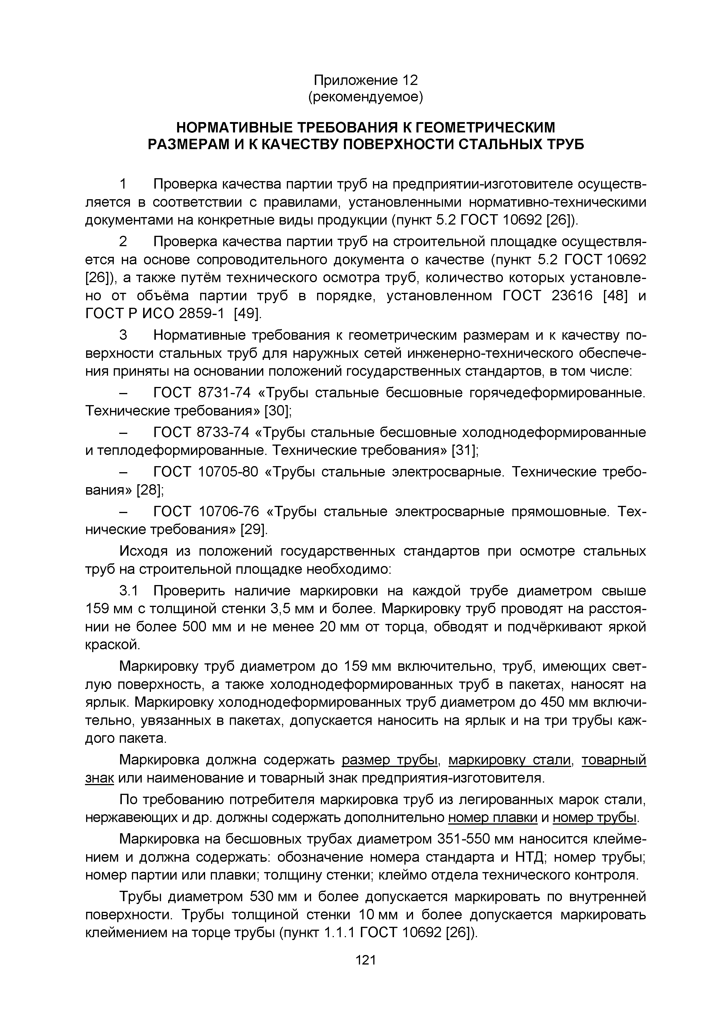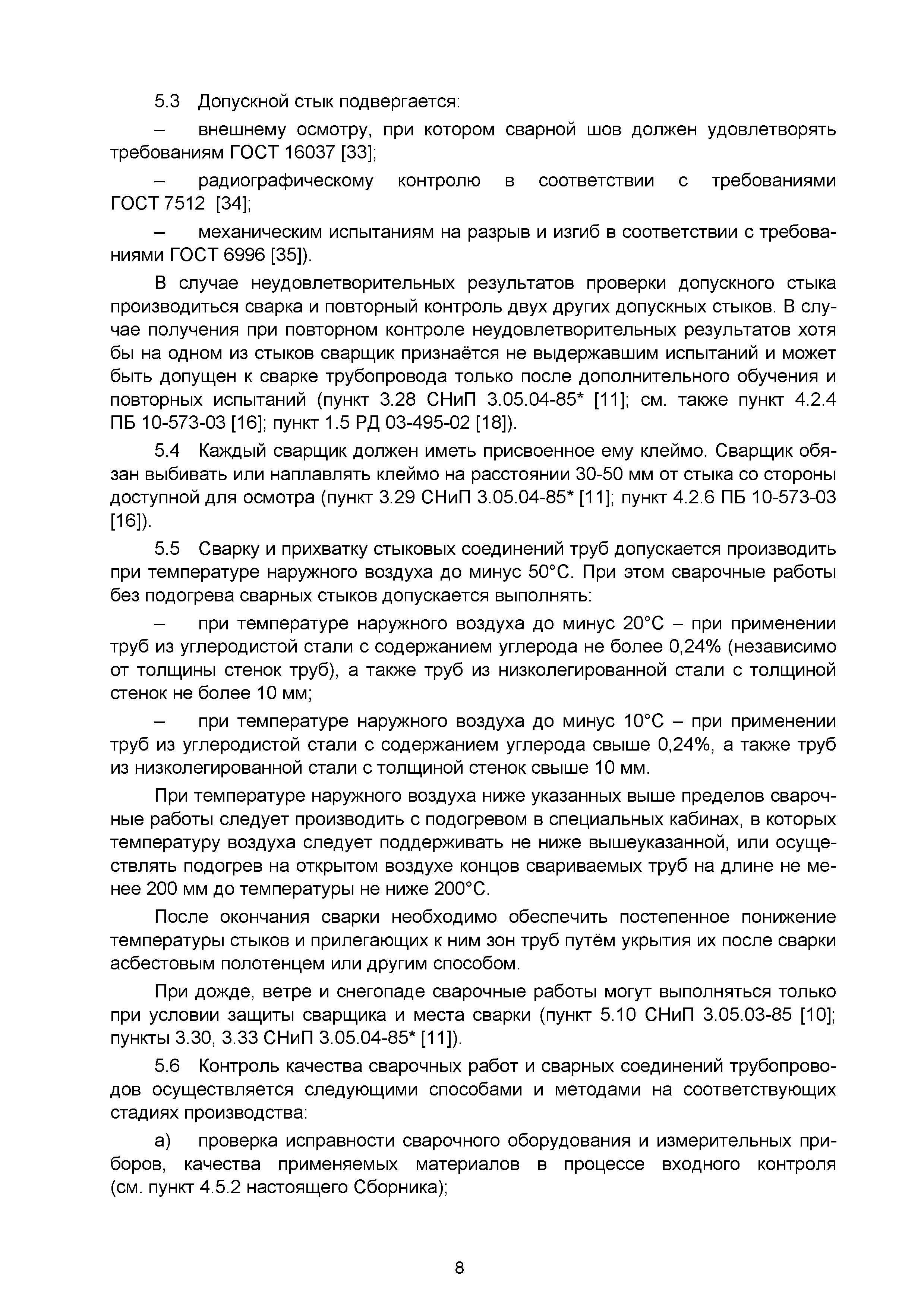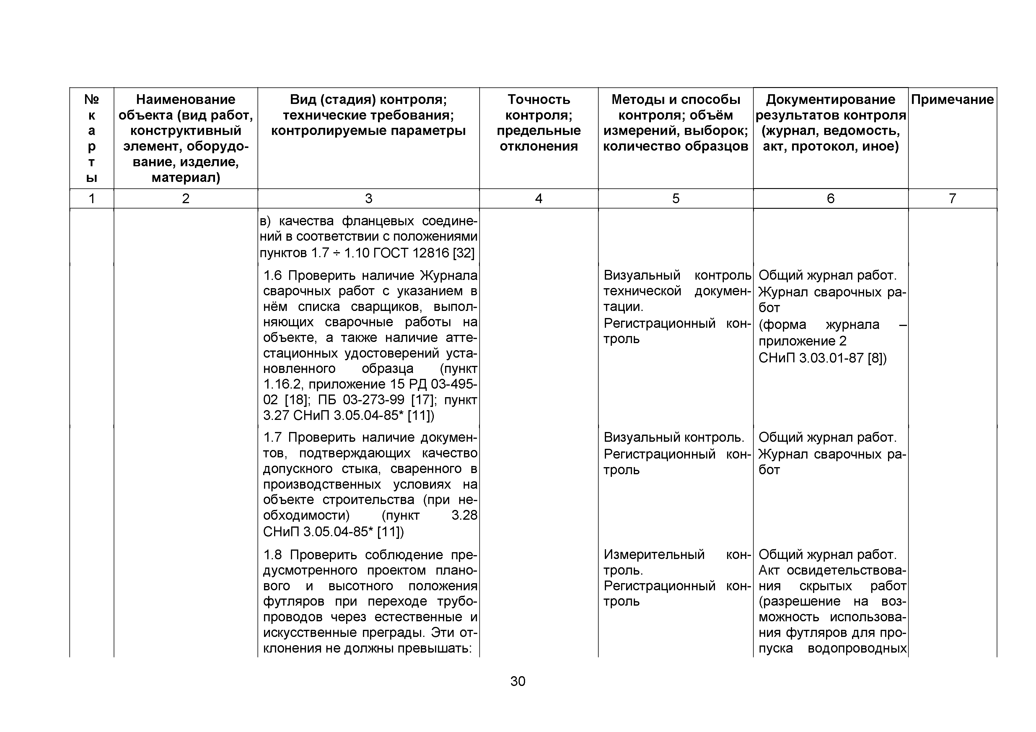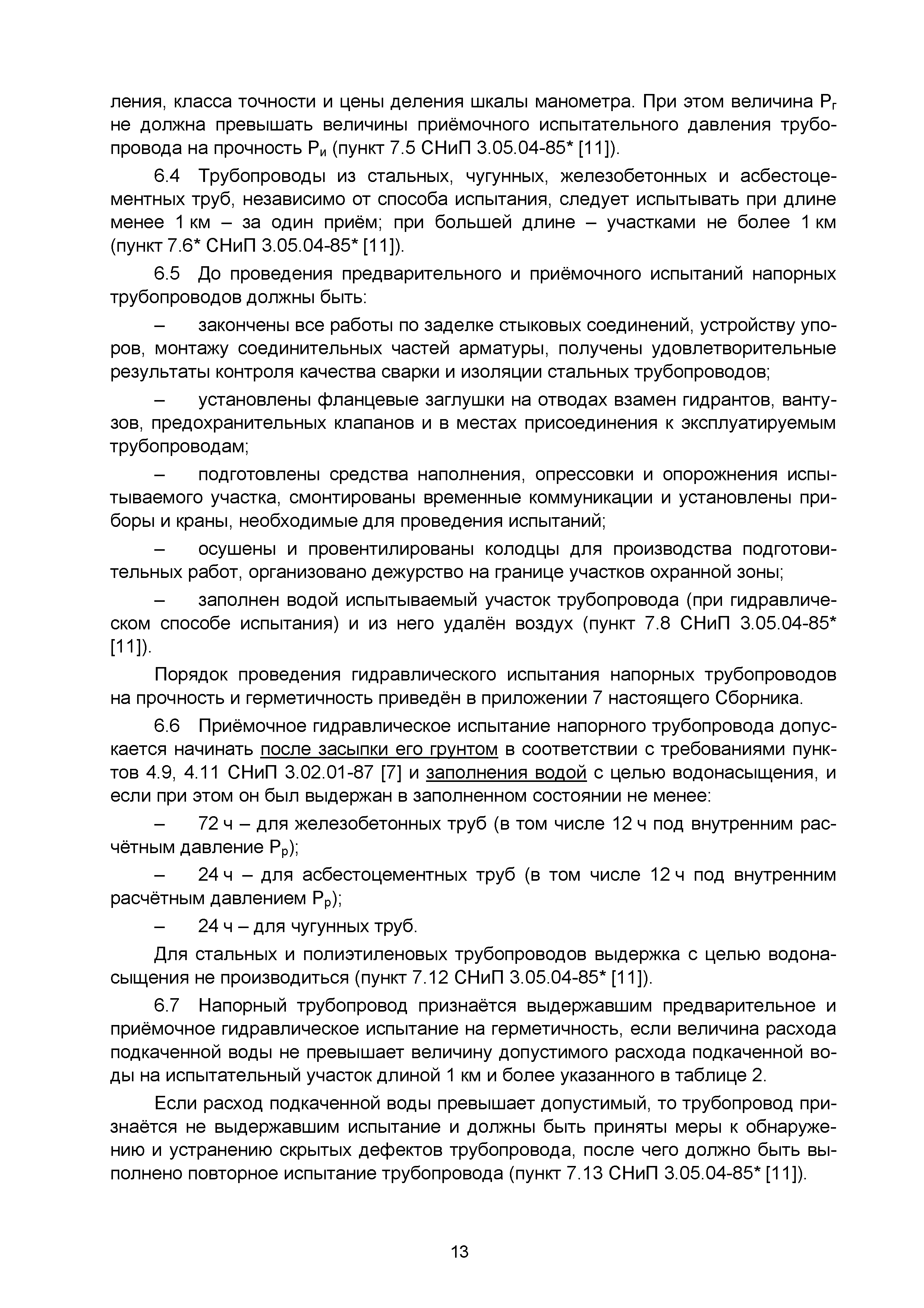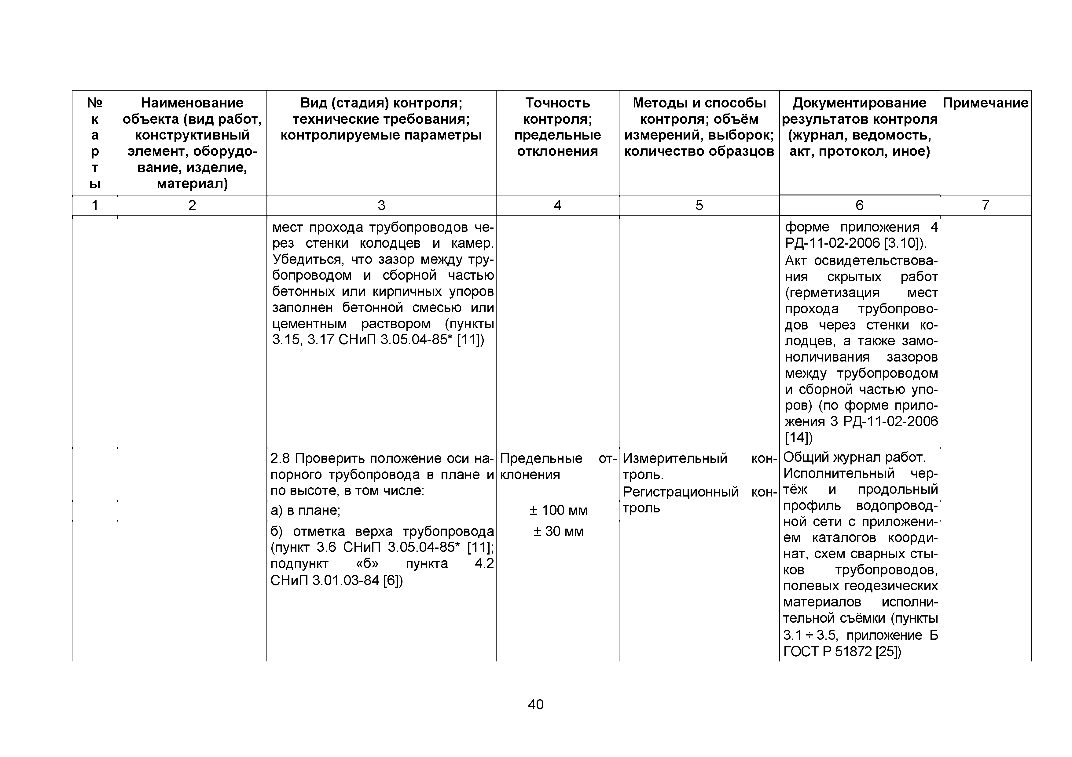 | | Нормативные ссылки: |   СНиП 3.01.03-84 «Геодезические работы в строительстве»  СНиП 3.04.03-85 «Защита строительных конструкций и сооружений от коррозии»  СНиП 2.06.14-85 «Защита горных выработок от подземных и поверхностных вод»  СНиП 2.04.02-84* «Водоснабжение. Наружные сети и сооружения»  СНиП 3.05.04-85* «Наружные сети и сооружения водоснабжения и канализации»  СНиП 3.05.03-85 «Тепловые сети»  СНиП 3.02.01-87 «Земляные сооружения, основания и фундаменты»  СНиП 3.03.01-87 «Несущие и ограждающие конструкции»  ГОСТ 23616-79 «Система обеспечения точности геометрических параметров в строительстве. Контроль точности»  ГОСТ 286-82 «Трубы керамические канализационные. Технические условия»  ГОСТ 539-80 «Трубы и муфты асбестоцементные напорные. Технические условия»  ГОСТ 1839-80 «Трубы и муфты асбестоцементные для безнапорных трубопроводов. Технические условия»  ГОСТ 30301-95 «Изделия асбестоцементные. Правила приемки»  ГОСТ 3262-75 «Трубы стальные водогазопроводные. Технические условия»  ГОСТ 3845-75 «Трубы металлические. Метод испытания гидравлическим давлением»  ГОСТ 6996-66 «Сварные соединения. Методы определения механических свойств»  ГОСТ 7512-82 «Контроль неразрушающий. Соединения сварные. Радиографический метод»  ГОСТ 9466-75 «Электроды покрытые металлические для ручной дуговой сварки сталей и наплавки. Классификация и общие технические условия»  ГОСТ 9583-75 «Трубы чугунные напорные, изготовленные методами центробежного и полунепрерывного литья. Технические условия»  ГОСТ 10692-80 «Трубы стальные, чугунные и соединительные части к ним. Приемка, маркировка, упаковка, транспортирование и хранение»  ГОСТ 10705-80 «Трубы стальные электросварные. Технические условия»  ГОСТ 10706-76 «Трубы стальные электросварные прямошовные. Технические требования»  ГОСТ 14782-86 «Контроль неразрушающий. Соединения сварные. Методы ультразвуковые»  ГОСТ 16037-80 «Соединения сварные стальных трубопроводов. Основные типы, конструктивные элементы и размеры»  ГОСТ 20426-82 «Контроль неразрушающий. Методы дефектоскопии радиационные. Область применения»  ГОСТ 25225-82 «Контроль неразрушающий. Швы сварных соединений трубопроводов. Магнитографический метод»  ГОСТ Р 51232-98 «Вода питьевая. Общие требования к организации и методам контроля качества»  ГОСТ 23118-99 «Конструкции стальные строительные. Общие технические условия»  ПБ 03-273-99 «Правила аттестации сварщиков и специалистов сварочного производства»  ГОСТ 8733-74 «Трубы стальные бесшовные холоднодеформированные и теплодеформированные. Технические требования»  ГОСТ 12816-80 «Фланцы арматуры, соединительных частей и трубопроводов на Ру от 0,1 до 20,0 МПа (от 1 до 200 кгс/см2). Общие технические требования»  ГОСТ 23055-78 «Контроль неразрушающий. Сварка металлов плавлением. Классификация сварных соединений по результатам радиографического контроля»  ГОСТ 8731-74 «Трубы стальные бесшовные горячедеформированные. Технические требования»  СанПиН 2.1.4.1074-01 «Питьевая вода. Гигиенические требования к качеству воды централизованных систем питьевого водоснабжения. Контроль качества. Гигиенические требования к обеспечению безопасности систем горячего водоснабжения»  ГОСТ Р 51872-2002 «Документация исполнительная геодезическая. Правила выполнения»  ПБ 10-573-03 «Правила устройства и безопасной эксплуатации трубопроводов пара и горячей воды»  РД 03-495-02 «Технологический регламент проведения аттестации с