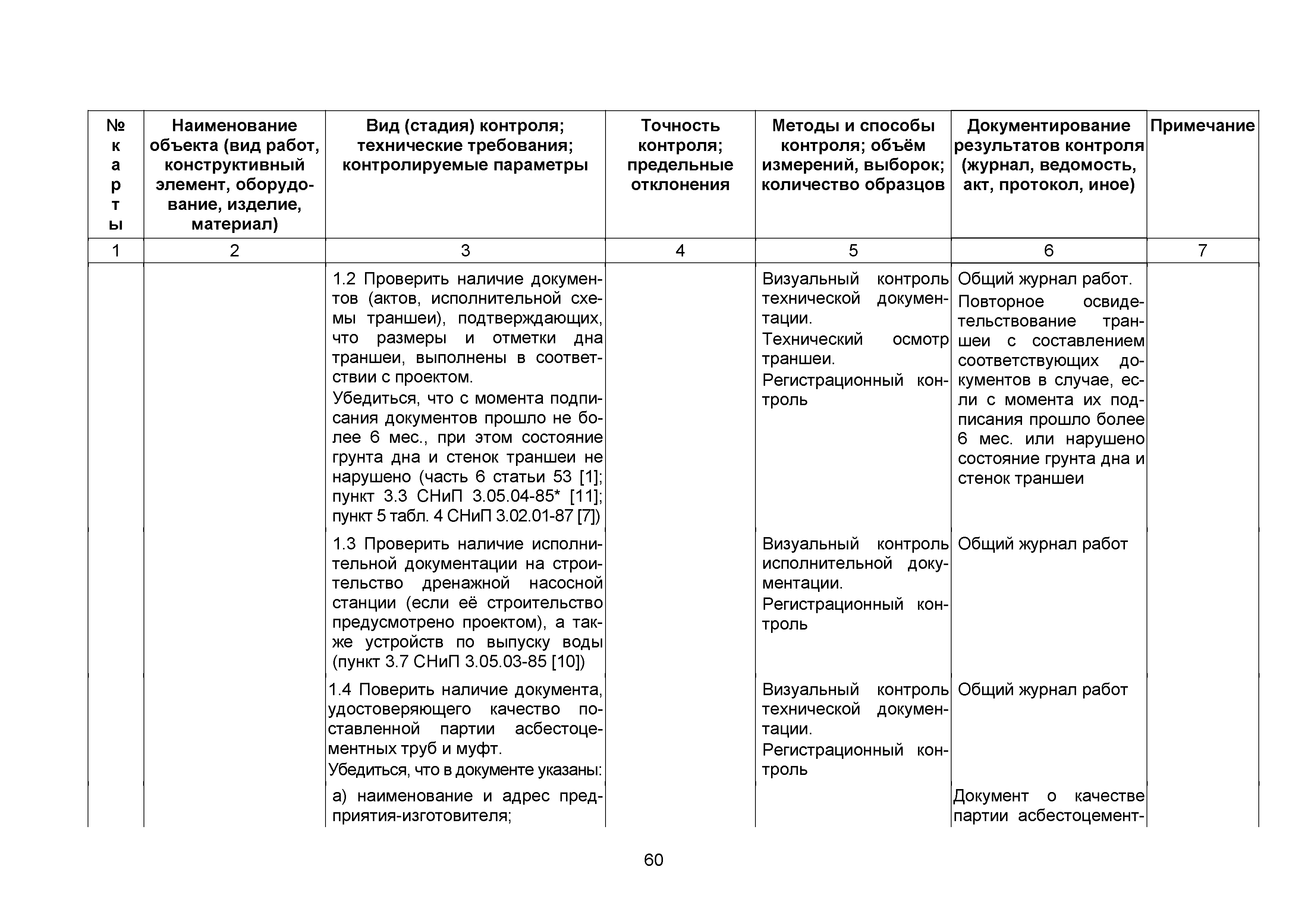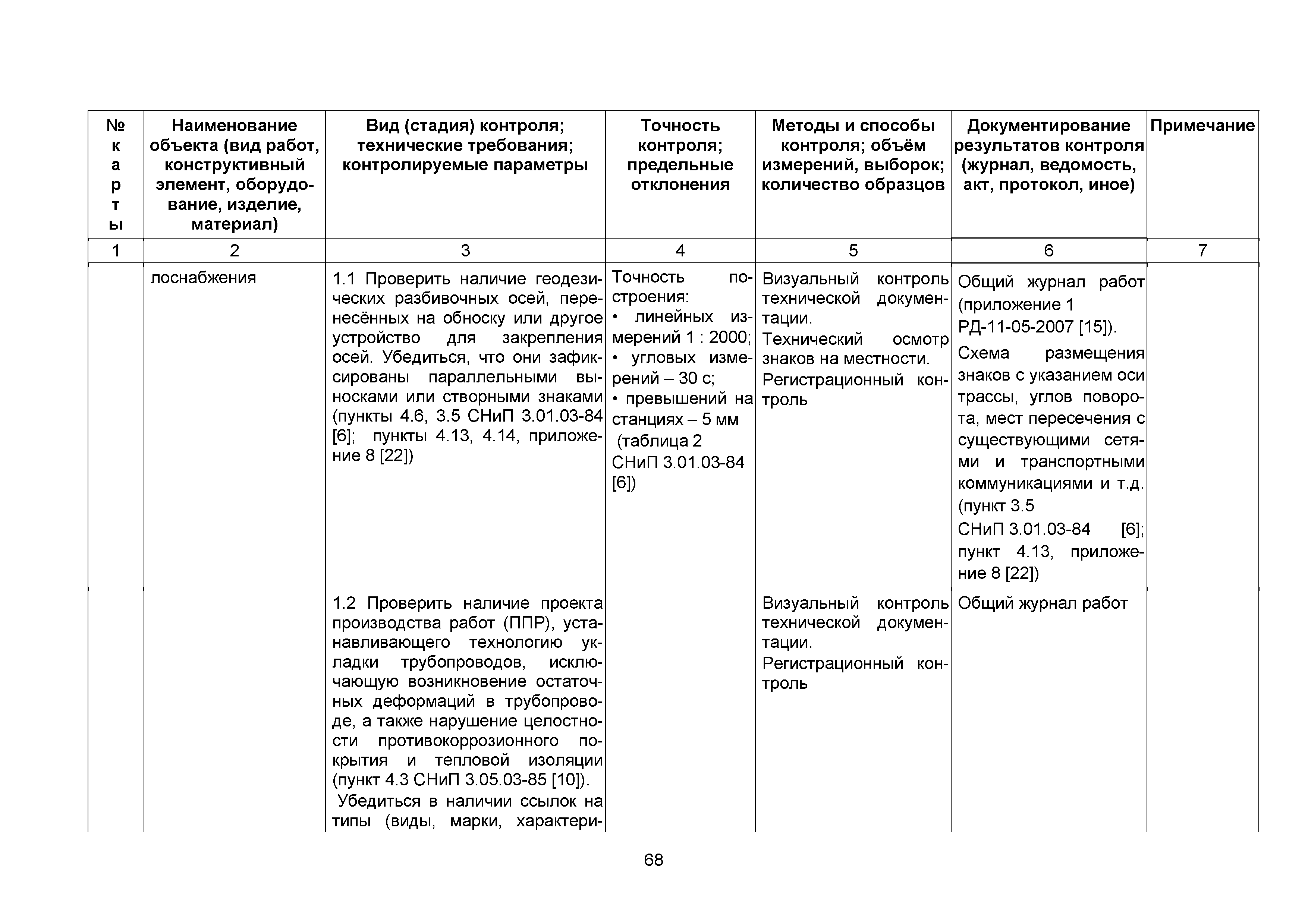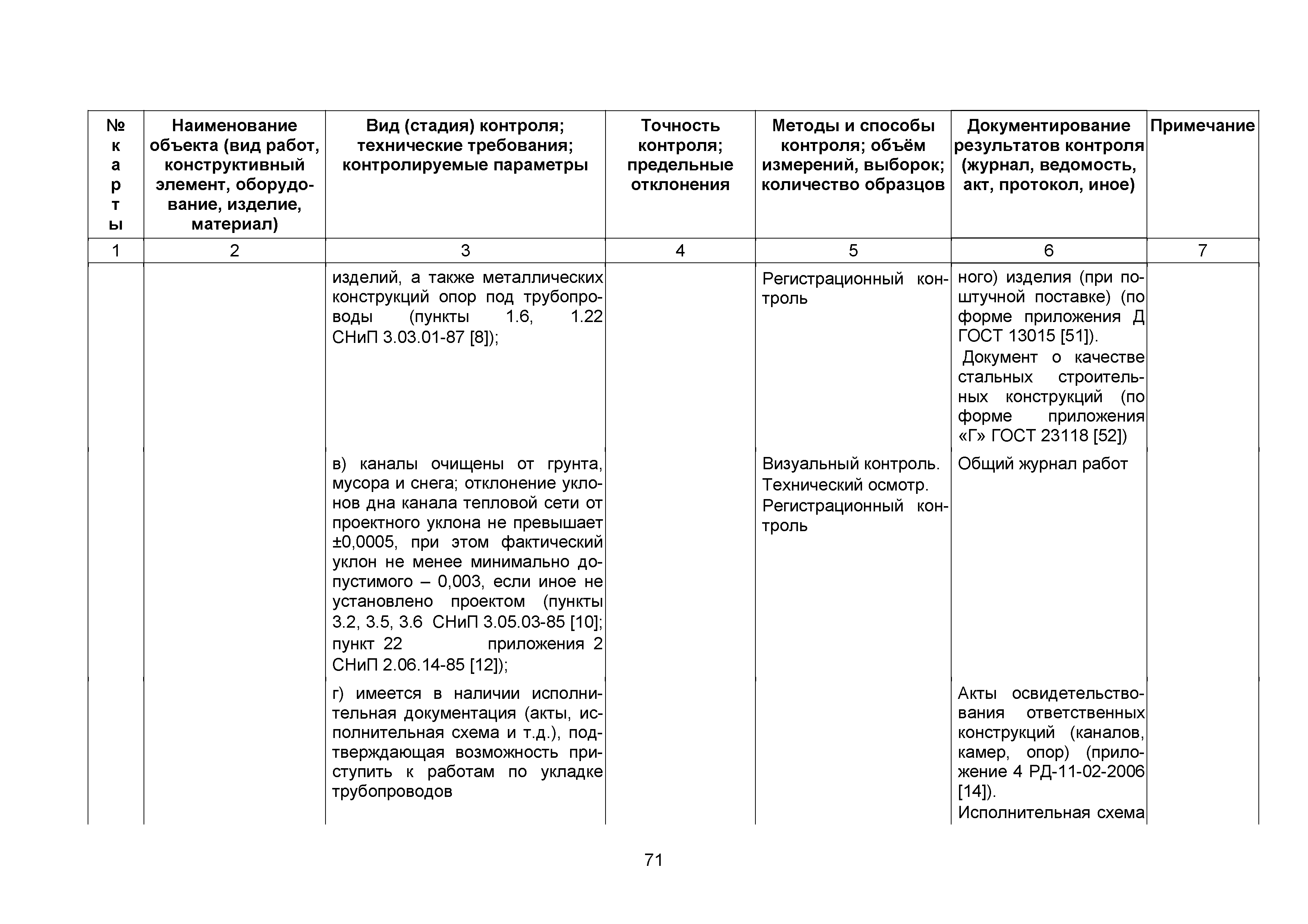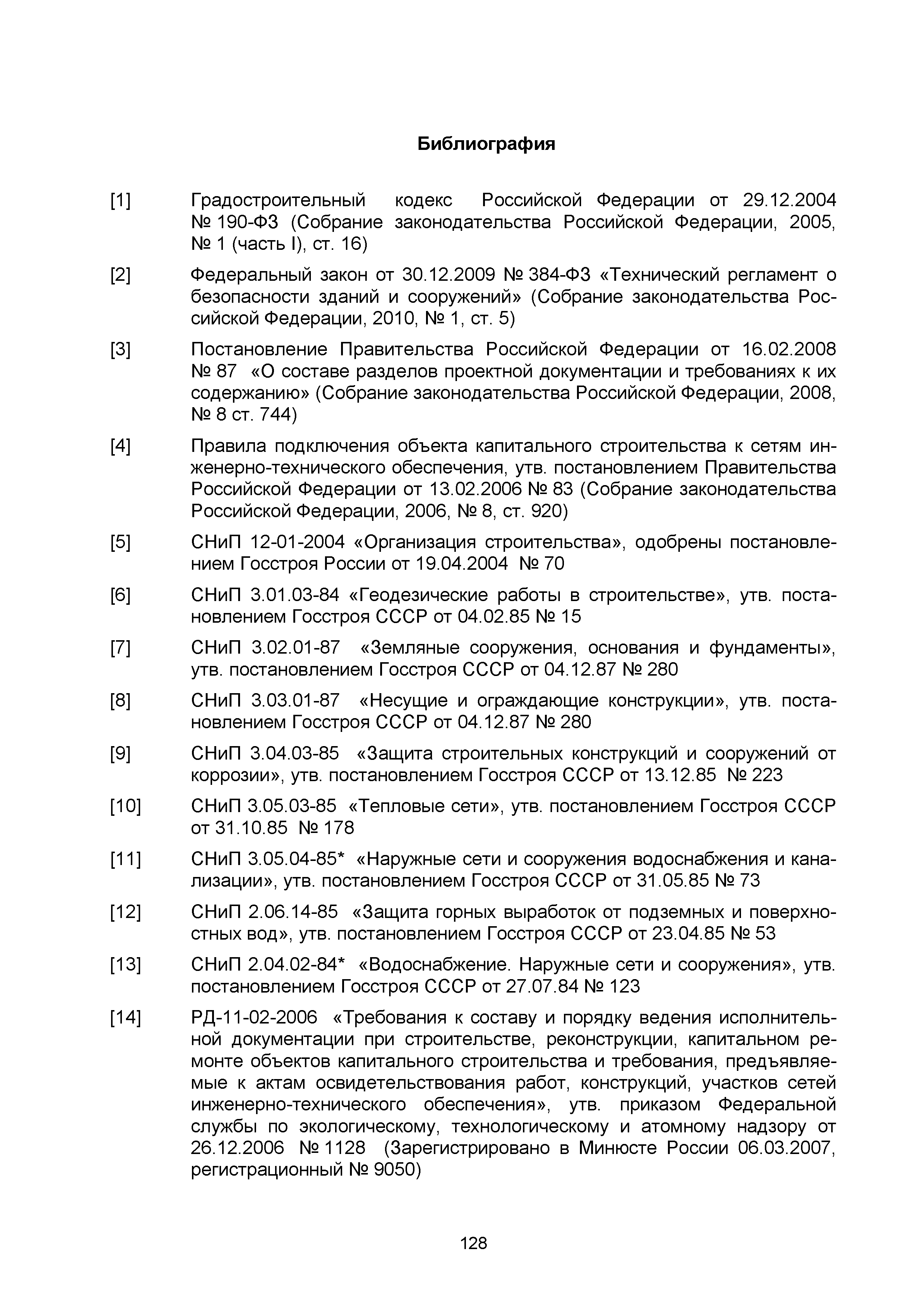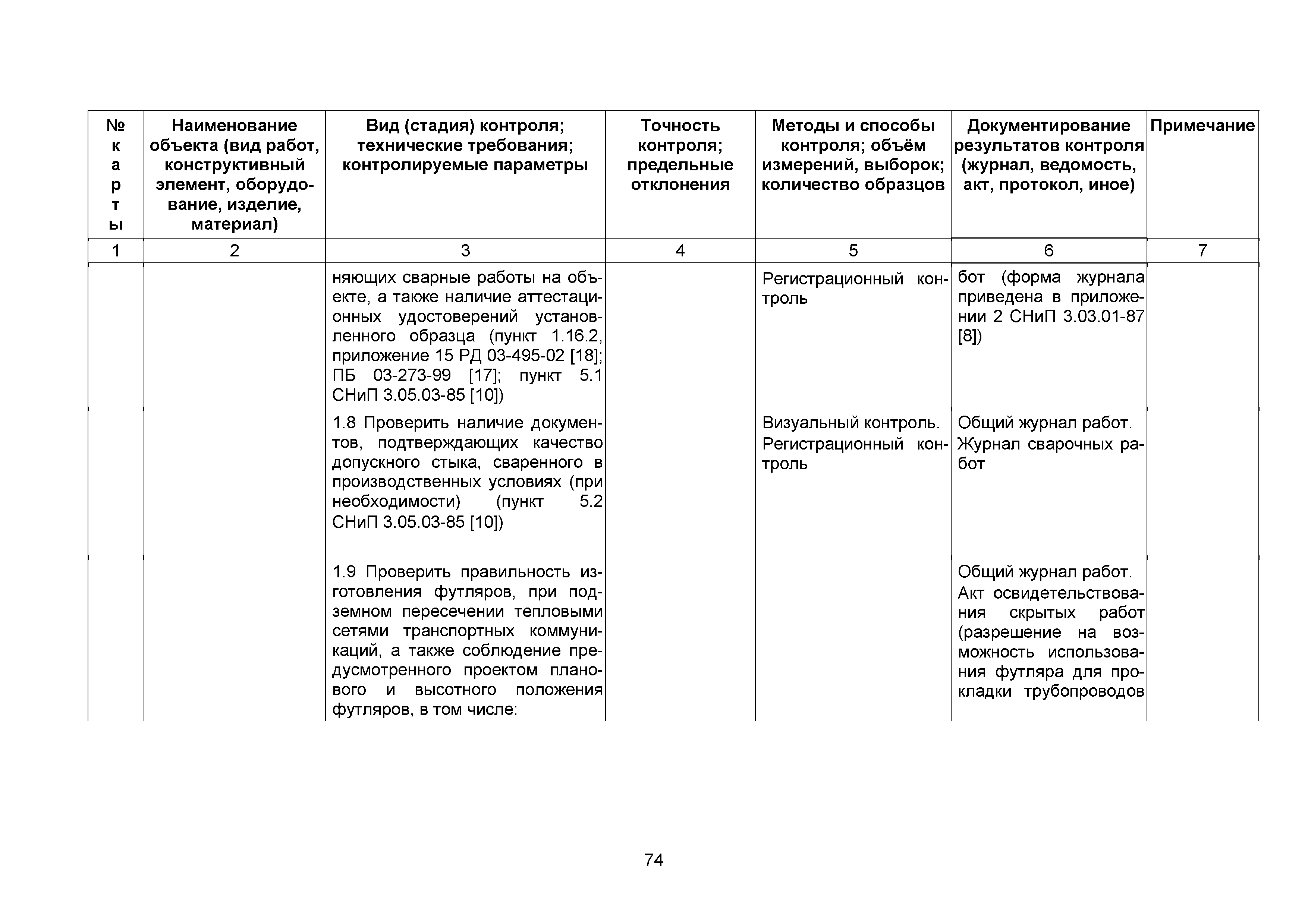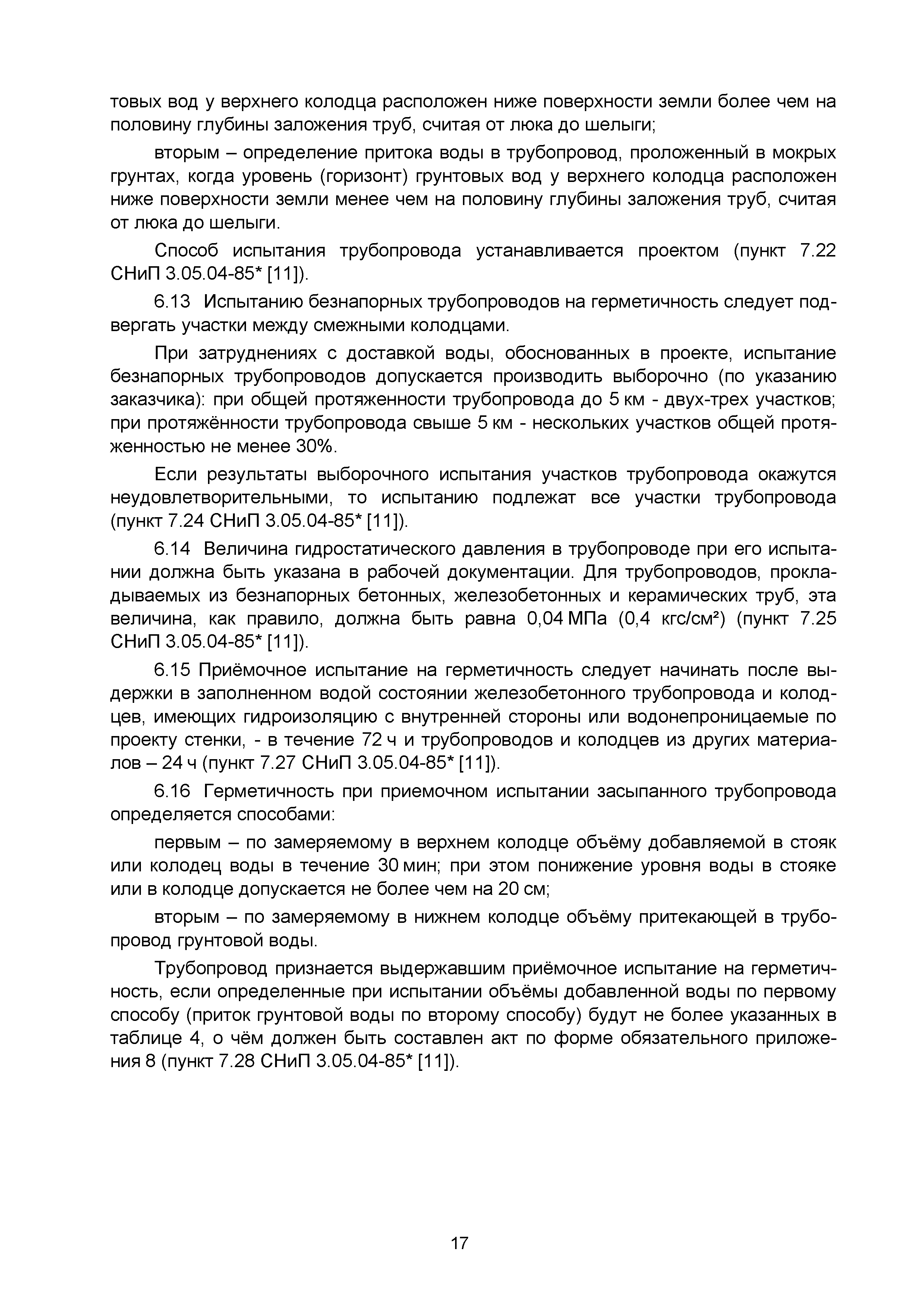 | | Нормативные ссылки: |   СНиП 3.01.03-84 «Геодезические работы в строительстве»  СНиП 3.04.03-85 «Защита строительных конструкций и сооружений от коррозии»  СНиП 2.06.14-85 «Защита горных выработок от подземных и поверхностных вод»  СНиП 2.04.02-84* «Водоснабжение. Наружные сети и сооружения»  СНиП 3.05.04-85* «Наружные сети и сооружения водоснабжения и канализации»  СНиП 3.05.03-85 «Тепловые сети»  СНиП 3.02.01-87 «Земляные сооружения, основания и фундаменты»  СНиП 3.03.01-87 «Несущие и ограждающие конструкции»  ГОСТ 23616-79 «Система обеспечения точности геометрических параметров в строительстве. Контроль точности»  ГОСТ 286-82 «Трубы керамические канализационные. Технические условия»  ГОСТ 539-80 «Трубы и муфты асбестоцементные напорные. Технические условия»  ГОСТ 1839-80 «Трубы и муфты асбестоцементные для безнапорных трубопроводов. Технические условия»  ГОСТ 30301-95 «Изделия асбестоцементные. Правила приемки»  ГОСТ 3262-75 «Трубы стальные водогазопроводные. Технические условия»  ГОСТ 3845-75 «Трубы металлические. Метод испытания гидравлическим давлением»  ГОСТ 6996-66 «Сварные соединения. Методы определения механических свойств»  ГОСТ 7512-82 «Контроль неразрушающий. Соединения сварные. Радиографический метод»  ГОСТ 9466-75 «Электроды покрытые металлические для ручной дуговой сварки сталей и наплавки. Классификация и общие технические условия»  ГОСТ 9583-75 «Трубы чугунные напорные, изготовленные методами центробежного и полунепрерывного литья. Технические условия»  ГОСТ 10692-80 «Трубы стальные, чугунные и соединительные части к ним. Приемка, маркировка, упаковка, транспортирование и хранение»  ГОСТ 10705-80 «Трубы стальные электросварные. Технические условия»  ГОСТ 10706-76 «Трубы стальные электросварные прямошовные. Технические требования»  ГОСТ 14782-86 «Контроль неразрушающий. Соединения сварные. Методы ультразвуковые»  ГОСТ 16037-80 «Соединения сварные стальных трубопроводов. Основные типы, конструктивные элементы и размеры»  ГОСТ 20426-82 «Контроль неразрушающий. Методы дефектоскопии радиационные. Область применения»  ГОСТ 25225-82 «Контроль неразрушающий. Швы сварных соединений трубопроводов. Магнитографический метод»  ГОСТ Р 51232-98 «Вода питьевая. Общие требования к организации и методам контроля качества»  ГОСТ 23118-99 «Конструкции стальные строительные. Общие технические условия»  ПБ 03-273-99 «Правила аттестации сварщиков и специалистов сварочного производства»  ГОСТ 8733-74 «Трубы стальные бесшовные холоднодеформированные и теплодеформированные. Технические требования»  ГОСТ 12816-80 «Фланцы арматуры, соединительных частей и трубопроводов на Ру от 0,1 до 20,0 МПа (от 1 до 200 кгс/см2). Общие технические требования»  ГОСТ 23055-78 «Контроль неразрушающий. Сварка металлов плавлением. Классификация сварных соединений по результатам радиографического контроля»  ГОСТ 8731-74 «Трубы стальные бесшовные горячедеформированные. Технические требования»  СанПиН 2.1.4.1074-01 «Питьевая вода. Гигиенические требования к качеству воды централизованных систем питьевого водоснабжения. Контроль качества. Гигиенические требования к обеспечению безопасности систем горячего водоснабжения»  ГОСТ Р 51872-2002 «Документация исполнительная геодезическая. Правила выполнения»  ПБ 10-573-03 «Правила устройства и безопасной эксплуатации трубопроводов пара и горячей воды»  РД 03-495-02 «Технологический регламент проведения аттестации с