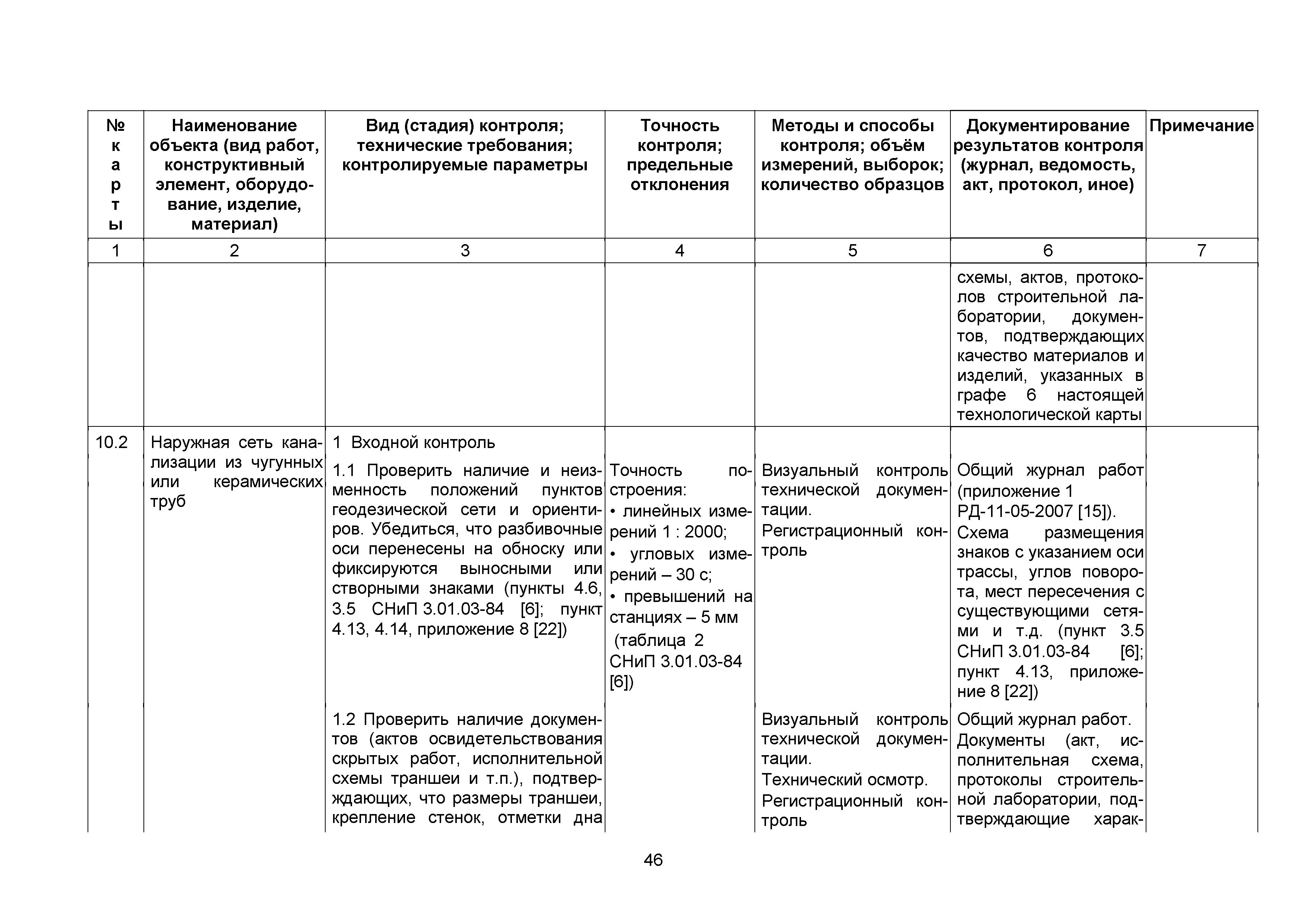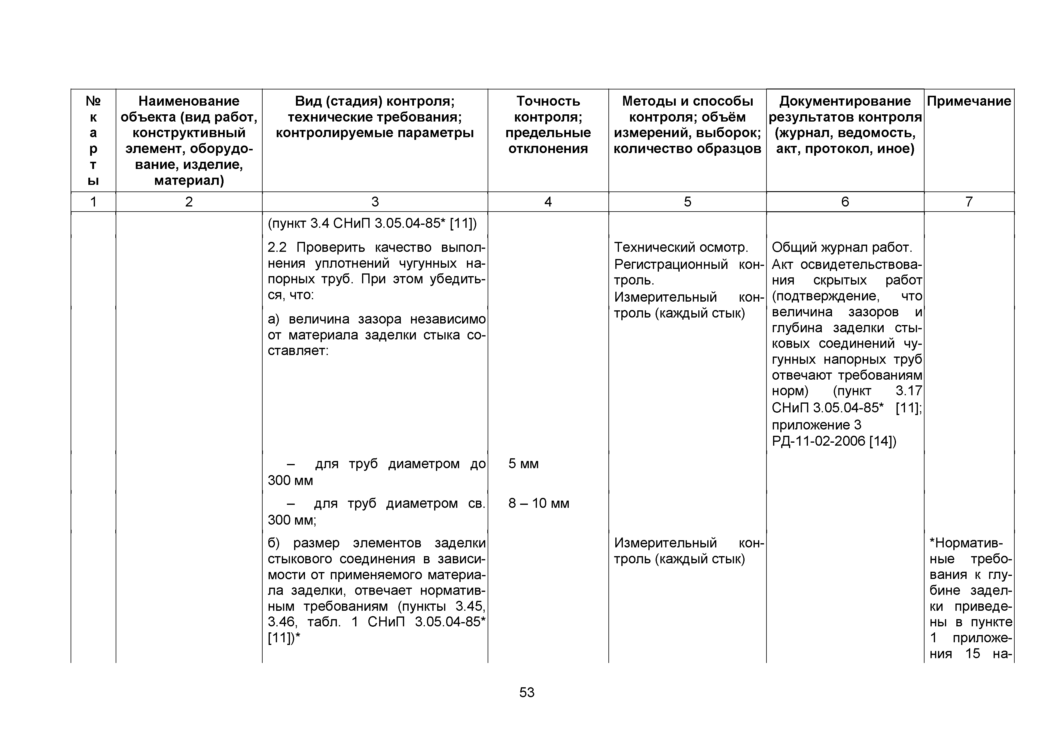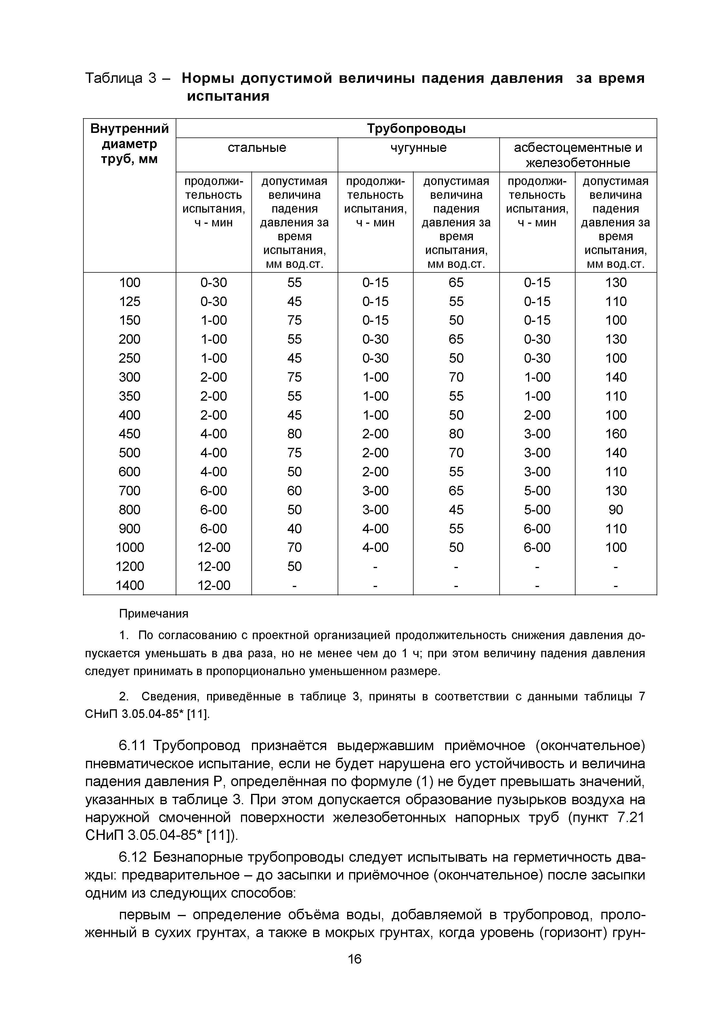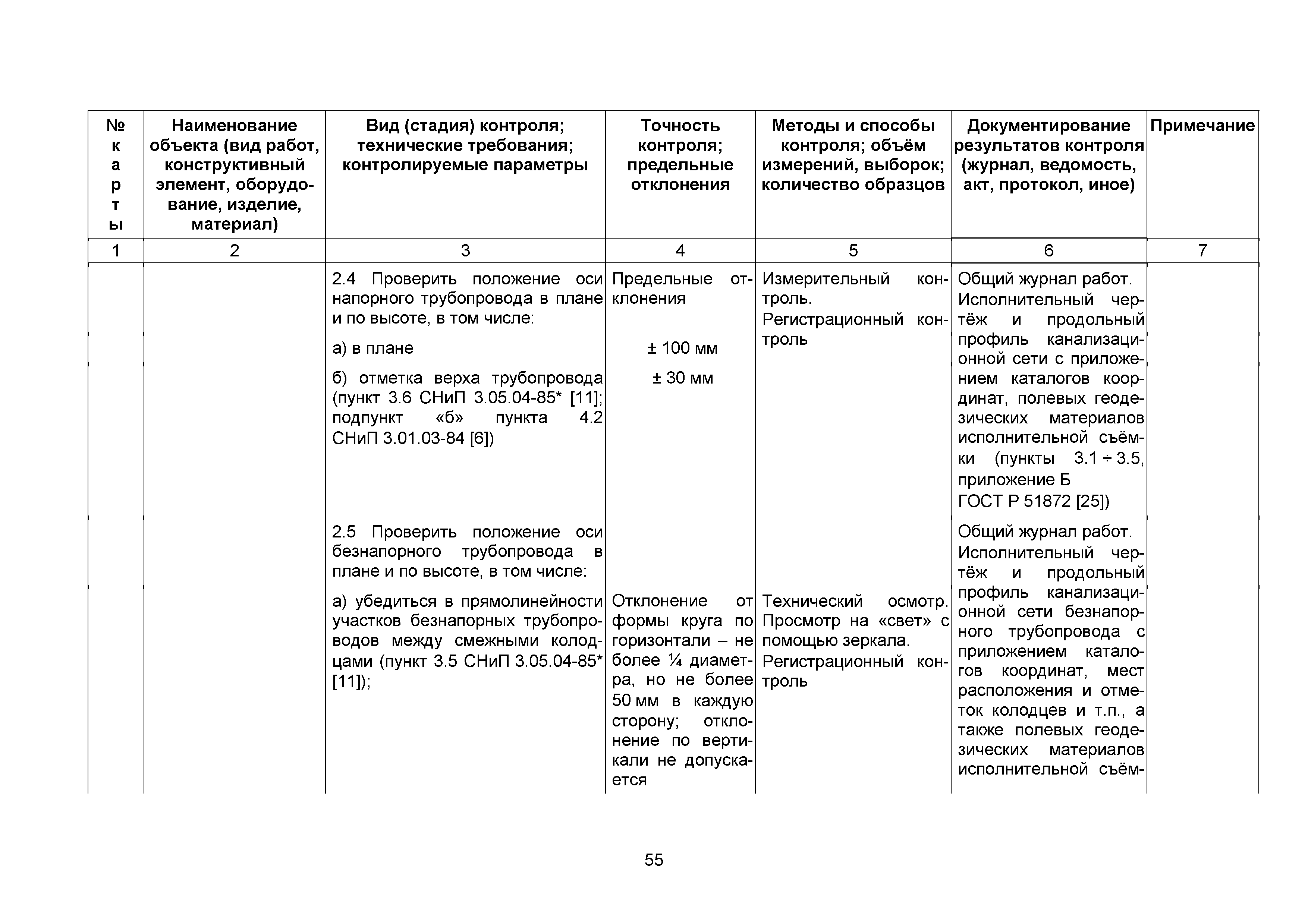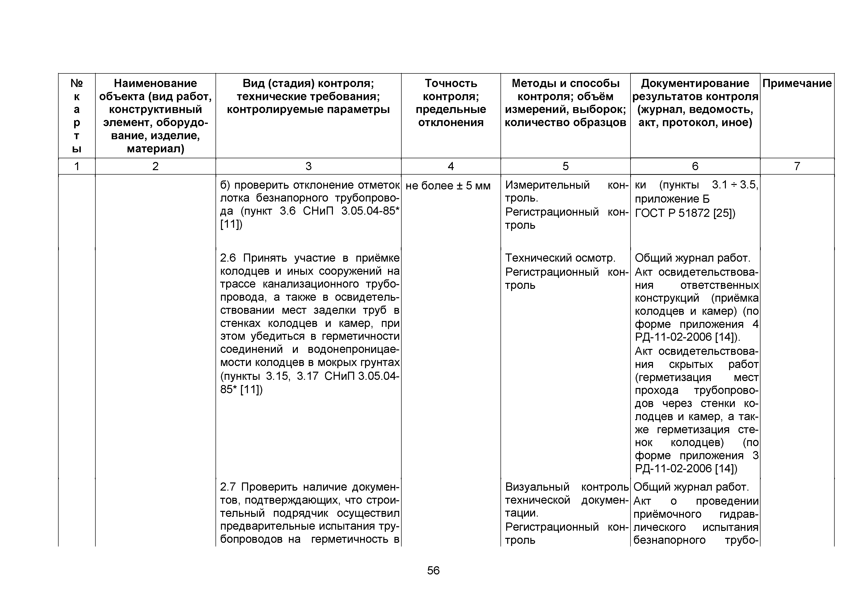 | | Нормативные ссылки: |   СНиП 3.01.03-84 «Геодезические работы в строительстве»  СНиП 3.04.03-85 «Защита строительных конструкций и сооружений от коррозии»  СНиП 2.06.14-85 «Защита горных выработок от подземных и поверхностных вод»  СНиП 2.04.02-84* «Водоснабжение. Наружные сети и сооружения»  СНиП 3.05.04-85* «Наружные сети и сооружения водоснабжения и канализации»  СНиП 3.05.03-85 «Тепловые сети»  СНиП 3.02.01-87 «Земляные сооружения, основания и фундаменты»  СНиП 3.03.01-87 «Несущие и ограждающие конструкции»  ГОСТ 23616-79 «Система обеспечения точности геометрических параметров в строительстве. Контроль точности»  ГОСТ 286-82 «Трубы керамические канализационные. Технические условия»  ГОСТ 539-80 «Трубы и муфты асбестоцементные напорные. Технические условия»  ГОСТ 1839-80 «Трубы и муфты асбестоцементные для безнапорных трубопроводов. Технические условия»  ГОСТ 30301-95 «Изделия асбестоцементные. Правила приемки»  ГОСТ 3262-75 «Трубы стальные водогазопроводные. Технические условия»  ГОСТ 3845-75 «Трубы металлические. Метод испытания гидравлическим давлением»  ГОСТ 6996-66 «Сварные соединения. Методы определения механических свойств»  ГОСТ 7512-82 «Контроль неразрушающий. Соединения сварные. Радиографический метод»  ГОСТ 9466-75 «Электроды покрытые металлические для ручной дуговой сварки сталей и наплавки. Классификация и общие технические условия»  ГОСТ 9583-75 «Трубы чугунные напорные, изготовленные методами центробежного и полунепрерывного литья. Технические условия»  ГОСТ 10692-80 «Трубы стальные, чугунные и соединительные части к ним. Приемка, маркировка, упаковка, транспортирование и хранение»  ГОСТ 10705-80 «Трубы стальные электросварные. Технические условия»  ГОСТ 10706-76 «Трубы стальные электросварные прямошовные. Технические требования»  ГОСТ 14782-86 «Контроль неразрушающий. Соединения сварные. Методы ультразвуковые»  ГОСТ 16037-80 «Соединения сварные стальных трубопроводов. Основные типы, конструктивные элементы и размеры»  ГОСТ 20426-82 «Контроль неразрушающий. Методы дефектоскопии радиационные. Область применения»  ГОСТ 25225-82 «Контроль неразрушающий. Швы сварных соединений трубопроводов. Магнитографический метод»  ГОСТ Р 51232-98 «Вода питьевая. Общие требования к организации и методам контроля качества»  ГОСТ 23118-99 «Конструкции стальные строительные. Общие технические условия»  ПБ 03-273-99 «Правила аттестации сварщиков и специалистов сварочного производства»  ГОСТ 8733-74 «Трубы стальные бесшовные холоднодеформированные и теплодеформированные. Технические требования»  ГОСТ 12816-80 «Фланцы арматуры, соединительных частей и трубопроводов на Ру от 0,1 до 20,0 МПа (от 1 до 200 кгс/см2). Общие технические требования»  ГОСТ 23055-78 «Контроль неразрушающий. Сварка металлов плавлением. Классификация сварных соединений по результатам радиографического контроля»  ГОСТ 8731-74 «Трубы стальные бесшовные горячедеформированные. Технические требования»  СанПиН 2.1.4.1074-01 «Питьевая вода. Гигиенические требования к качеству воды централизованных систем питьевого водоснабжения. Контроль качества. Гигиенические требования к обеспечению безопасности систем горячего водоснабжения»  ГОСТ Р 51872-2002 «Документация исполнительная геодезическая. Правила выполнения»  ПБ 10-573-03 «Правила устройства и безопасной эксплуатации трубопроводов пара и горячей воды»  РД 03-495-02 «Технологический регламент проведения аттестации с