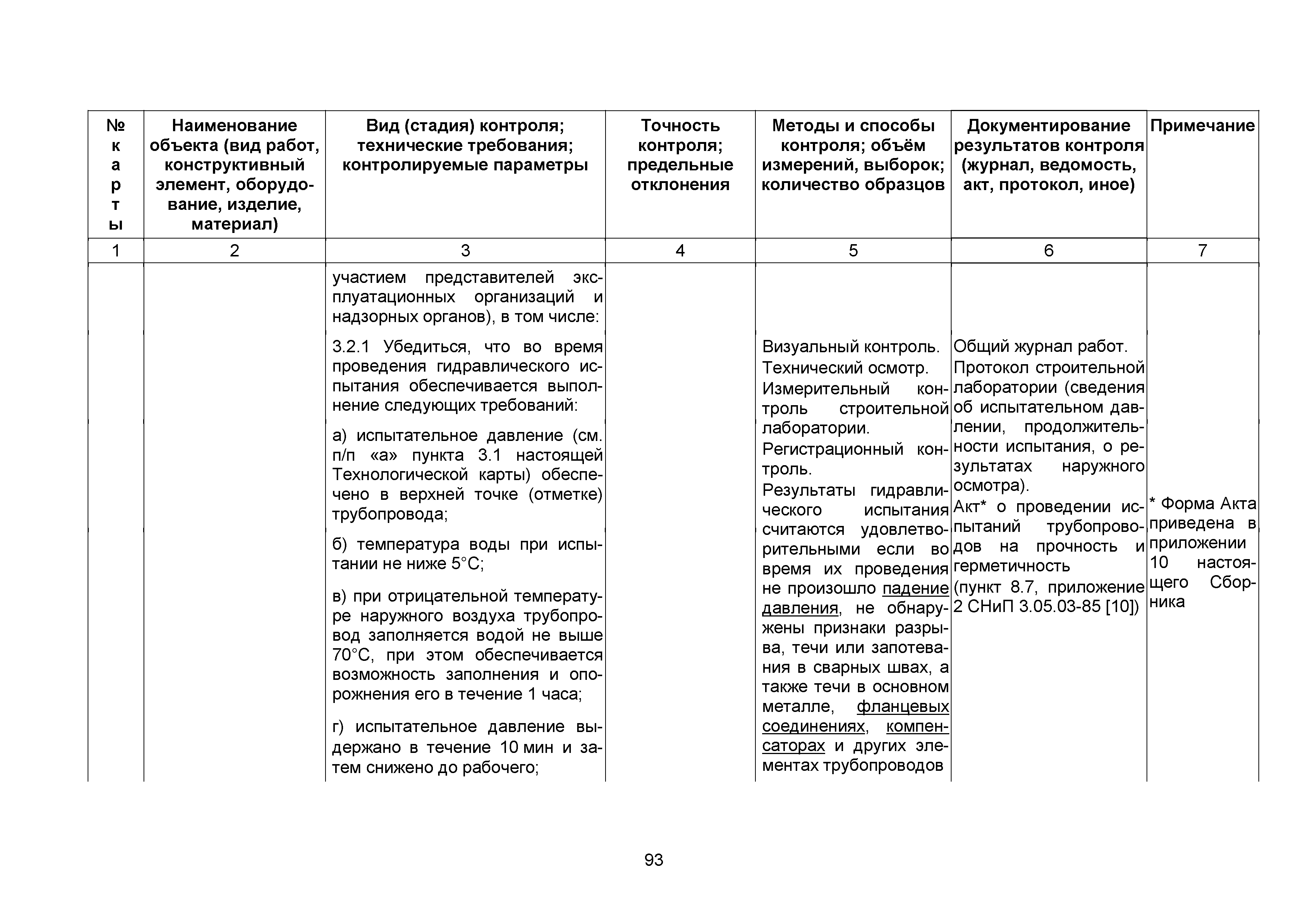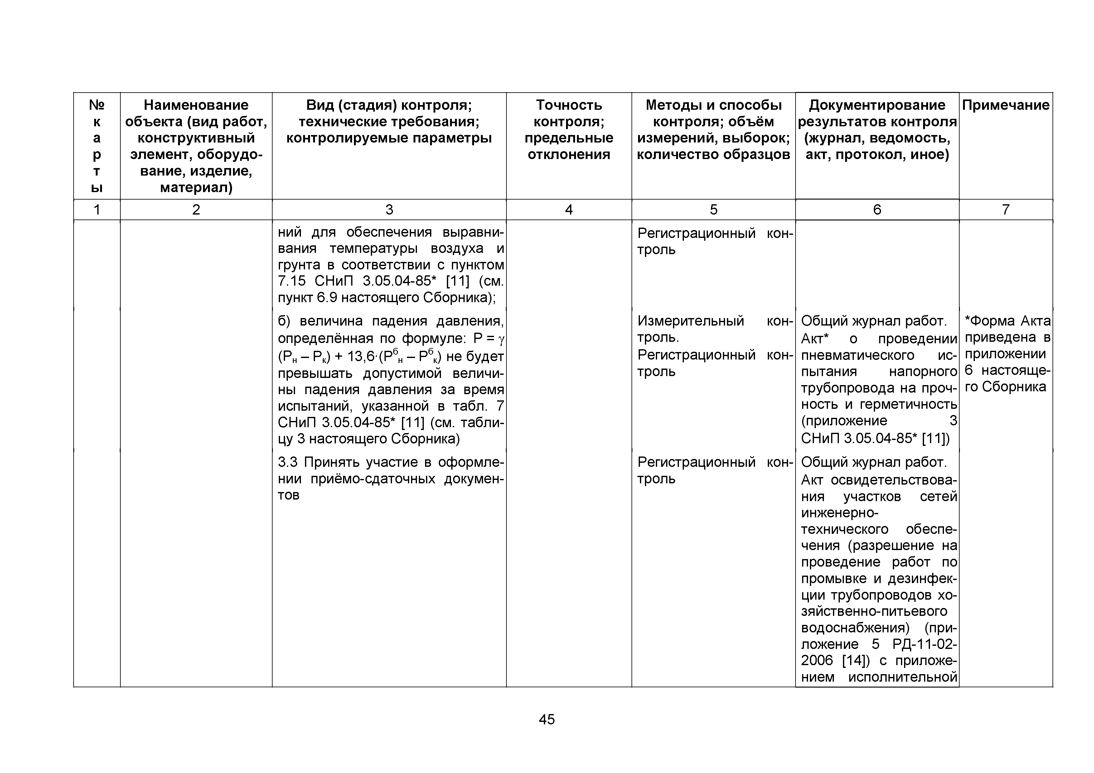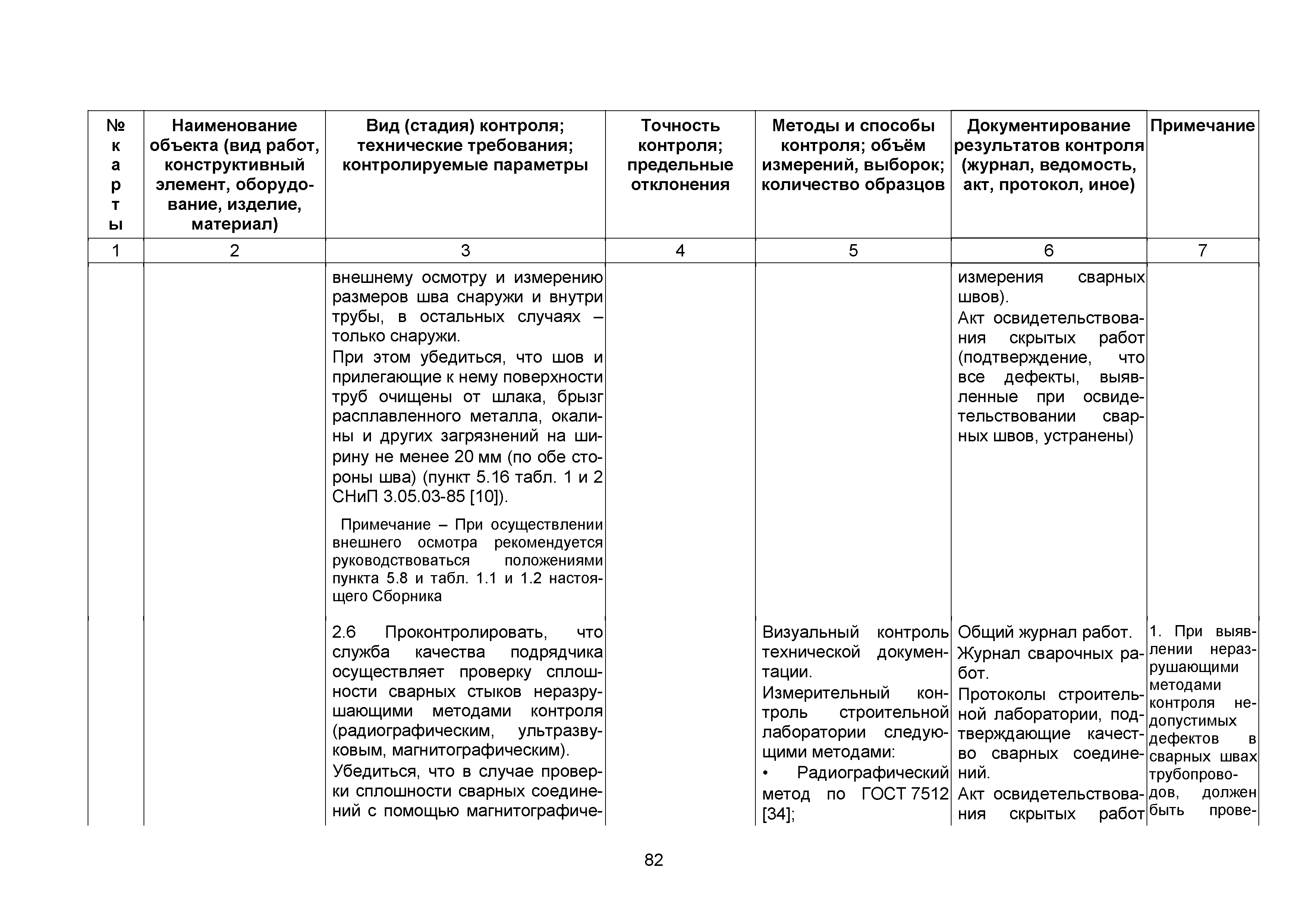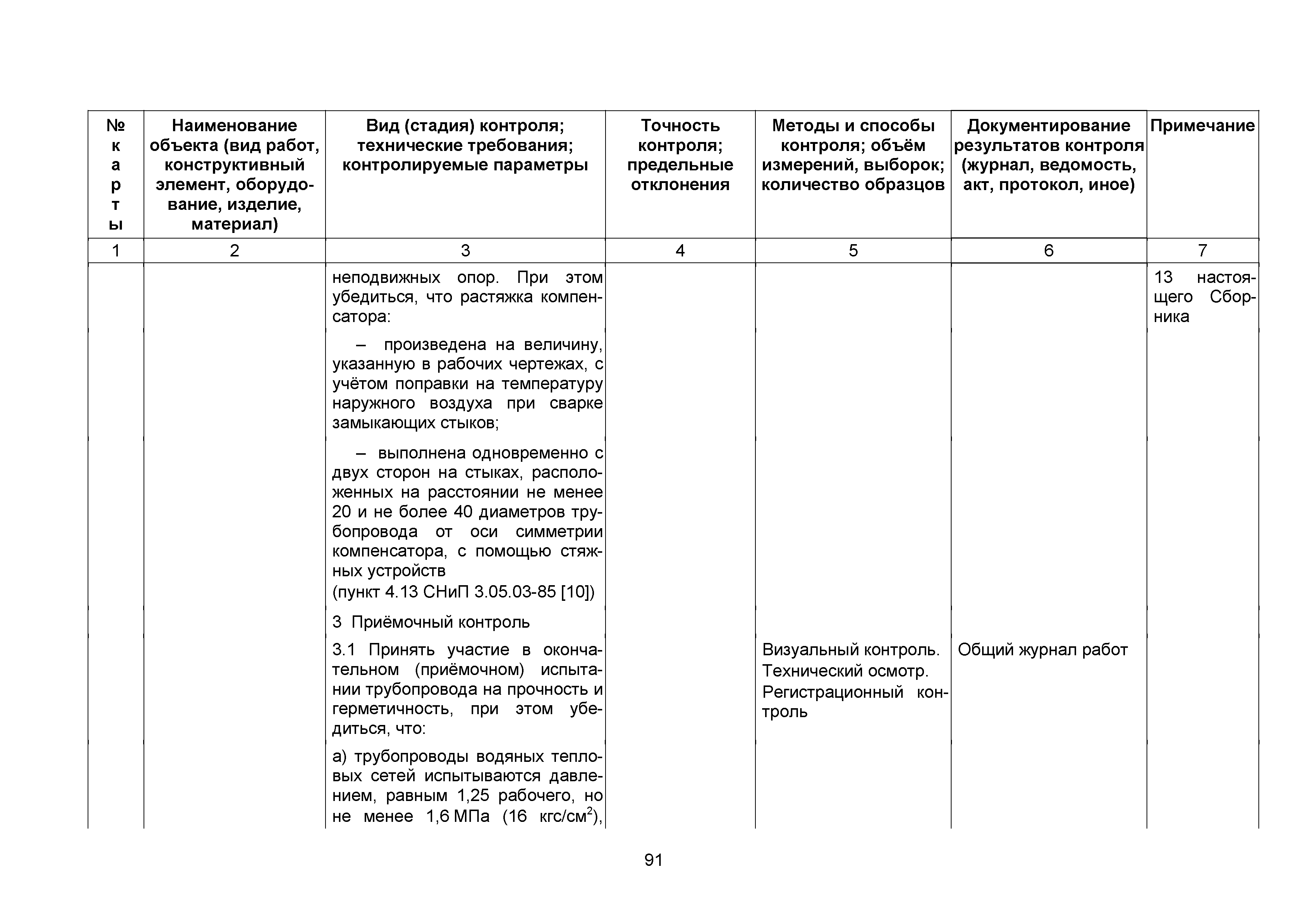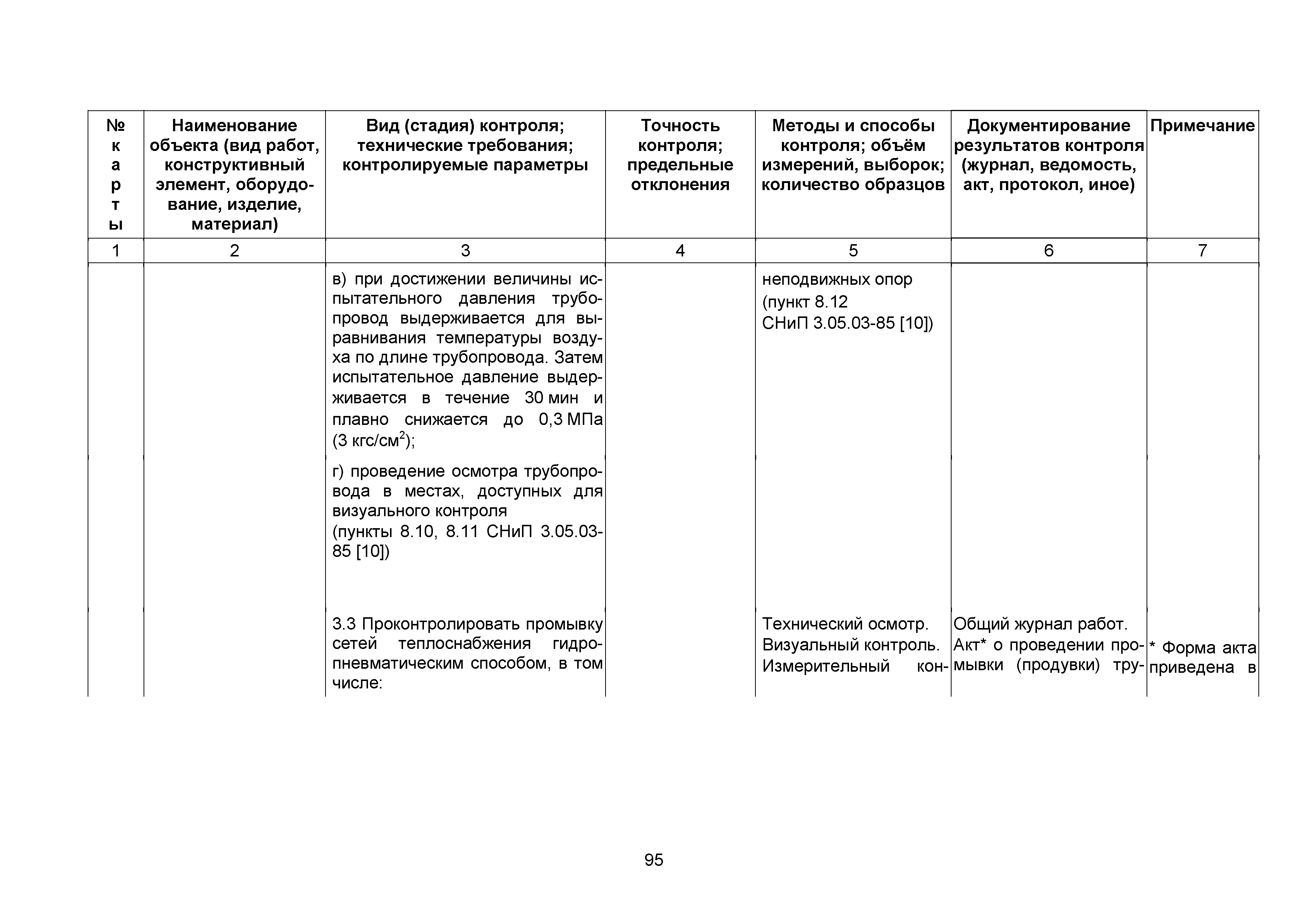 Сборник 10. Технологические карты на осуществление контроля качества работ при устройстве сетей инженерно-технического обеспечения (к Практическому пособию по организации и осуществлению строительного контроля заказчика (технического надзора) за строительством объектов капитального строительства)| Статус: | справочные материалы, мп, тпр | | Название рус.: | Сборник 10. Технологические карты на осуществление контроля качества работ при устройстве сетей инженерно-технического обеспечения (к Практическому пособию по организации и осуществлению строительного контроля заказчика (технического надзора) за строительством объектов капитального строительства) | | Дата добавления в базу: | 01.09.2013 | | Дата актуализации: | 01.01.2021 | | Область применения: | Сборник предназначен для специалистов служб заказчика (застройщика), осуществляющих технический надзор за строительством объектов капитального строительства, и может быть полезен для иных субъектов инвестиционной деятельности (проектировщиков, строительных подрядчиков), принимающих участие в разработке и реализации инвестиционных проектов. | | Оглавление: | 1. Область применения 2. Нормативные ссылки 3. Термины и определения 4. Общие положения 5. Требование к производству сварочных работ и качеству сварных соединений 6. Испытание трубопроводов на прочность и герметичность Приложение 1. Нормативные требования к содержанию документа о качестве стальных труб, гнутых отводов и соединительных частей, поставляемых отдельно от труб Приложение 2. Нормативные требования к содержанию документа о качестве чугунных труб Приложение 3. Технологические карты на осуществление контроля качества работ при устройстве наружных сетей инженерно-технического обеспечения Приложение 4. Виды сварных соединений, швов, а также характерные виды дефектов, выявляемых при визуальном и измерительном контроле Приложение 5. Форма Акта о проведении приемочного гидравлического испытания напорного трубопровода на прочность и герметичность Приложение 6. Форма Акта о проведении пневматического испытания напорного трубопровода на прочность и герметичность Приложение 7. Порядок проведения гидравлического испытания напорного трубопровода на прочность и герметичность Приложение 8. Форма Акта о проведении приемочного гидравлического испытания безнапорного трубопровода на герметичность Приложение 9. Форма Акта о проведении промывки и дезинфекции трубопроводов (сооружений) хозяйственно-питьевого водоснабжения Приложение 10. Форма Акта о проведении испытаний трубопроводов на прочность и герметичность Приложение 11. Форма Акта о проведении промывки (продувки) трубопроводов Приложение 12. Нормативные требования к геометрическим размерам и к качеству поверхности стальных труб Приложение 13. Форма Акта о проведении растяжки компенсаторов Приложение 14. Нормативные требования к показателям внешнего вида поверхности керамических труб Приложение 15. Нормативные требования к глубине заделки стыковых соединений чугунных напорных и керамических труб Библиография | | Разработан: | ОАО Центринвестпроект