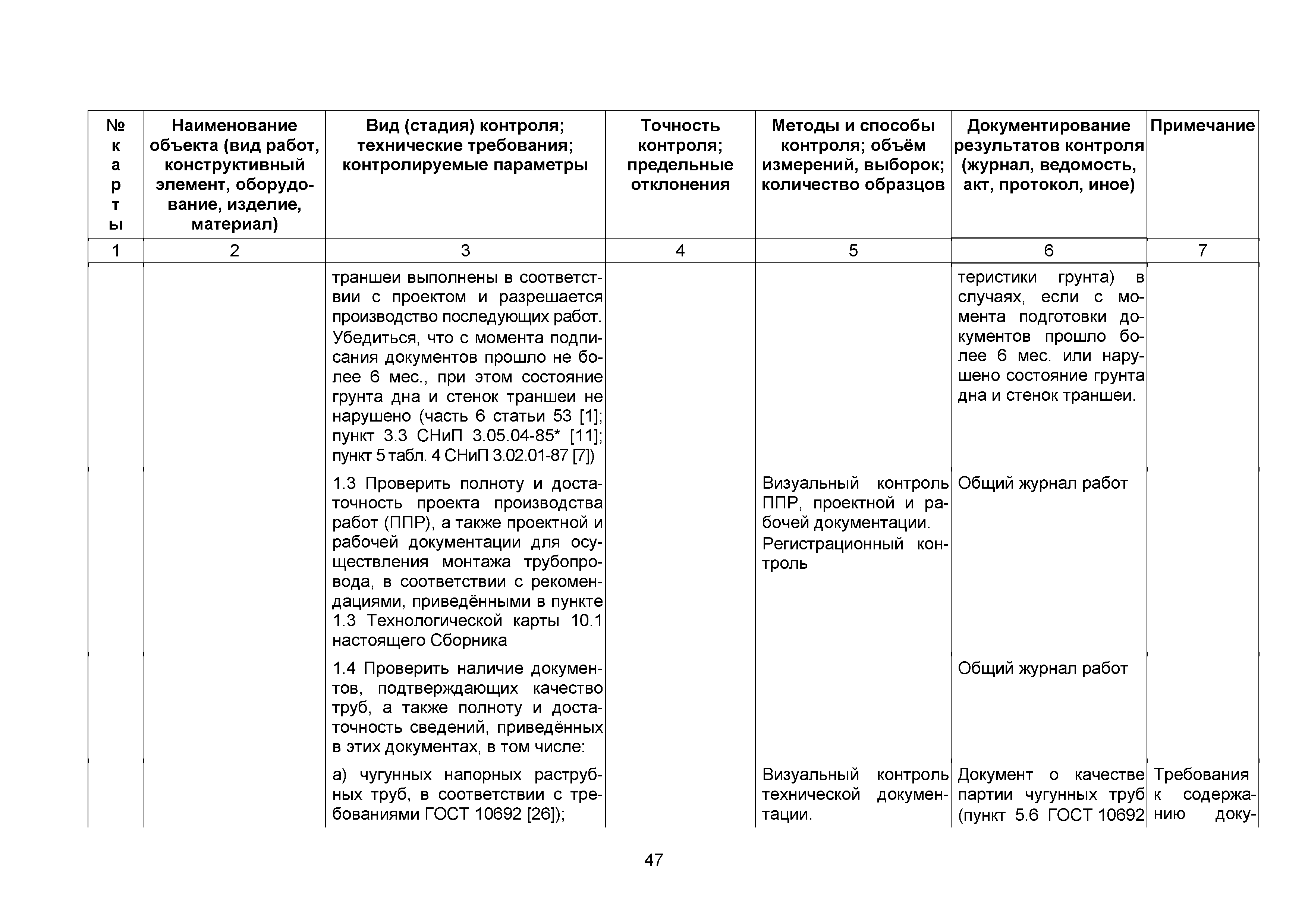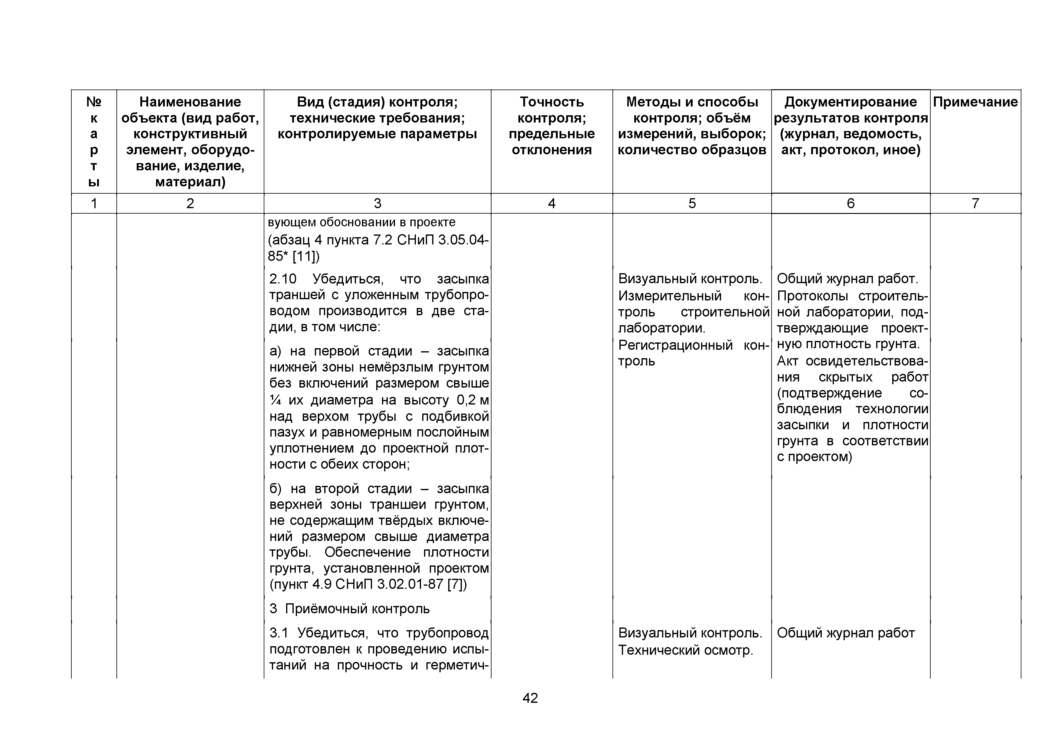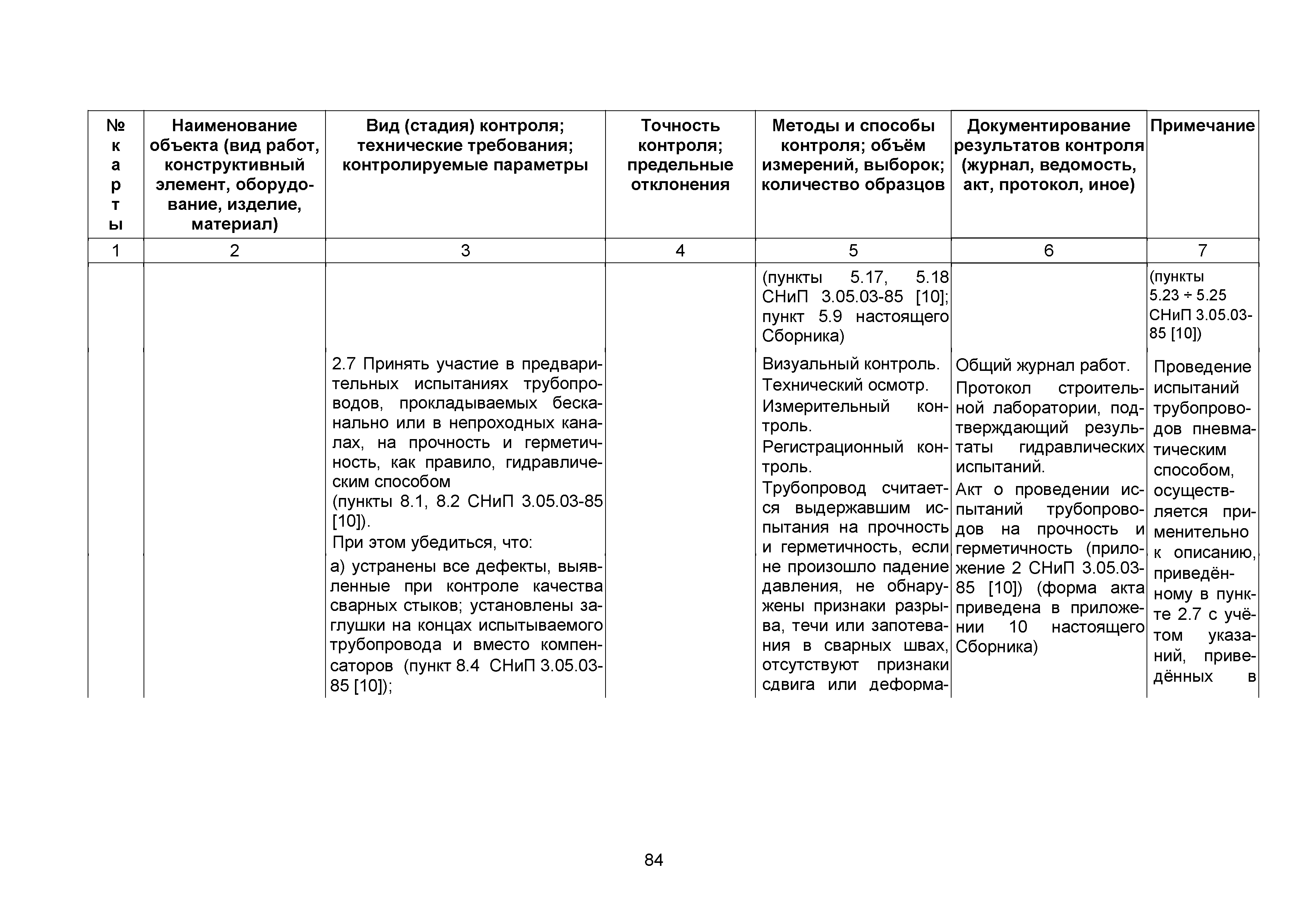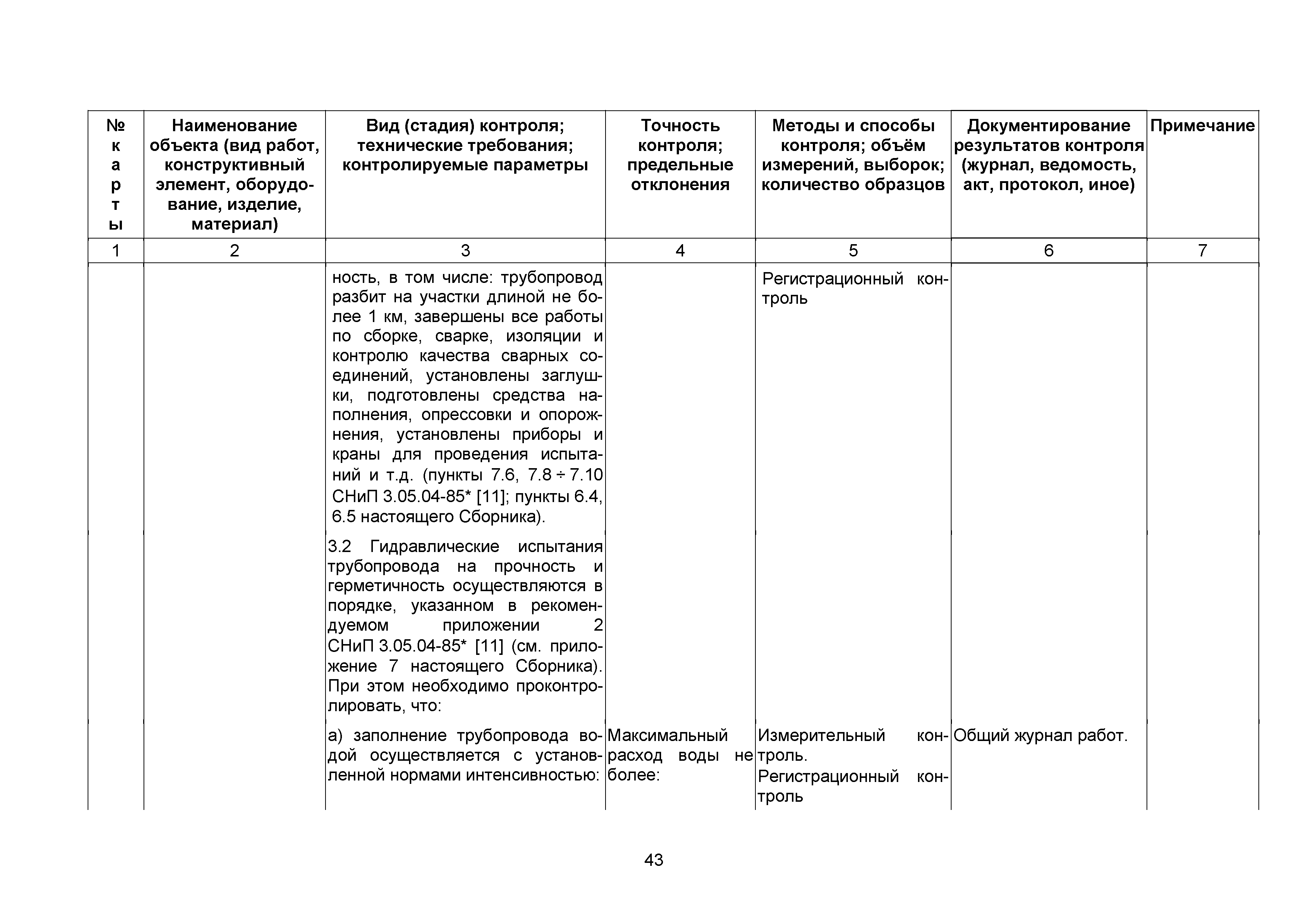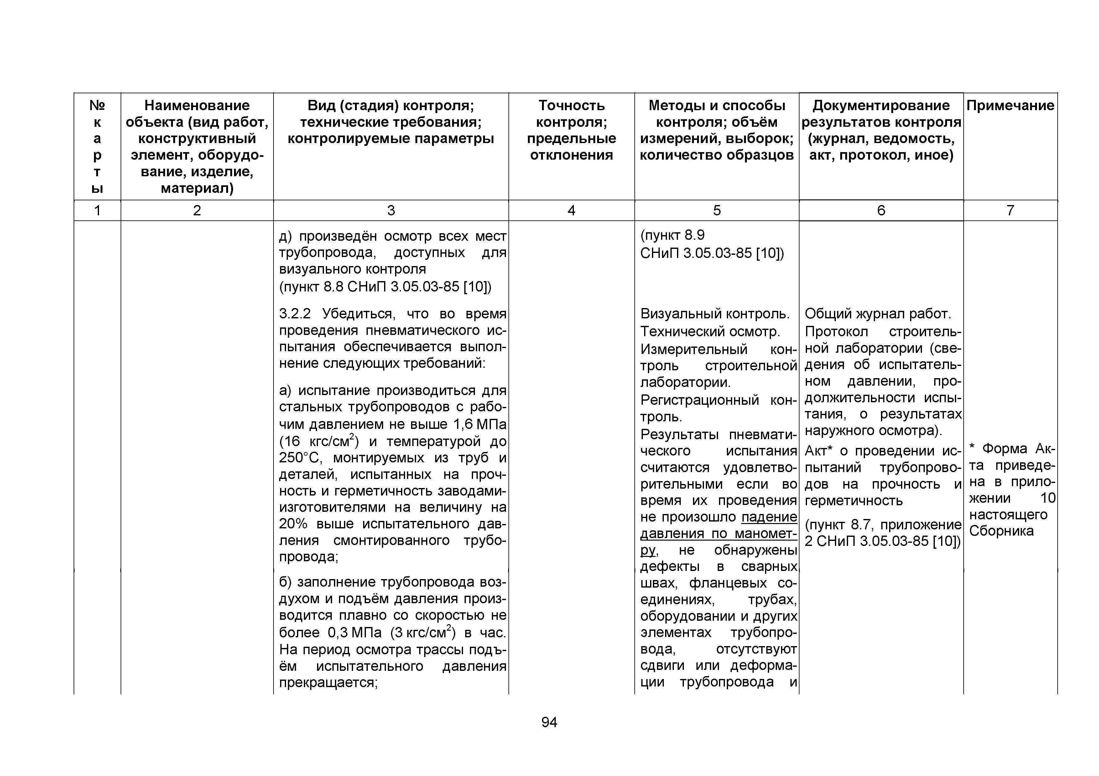 Сборник 10. Технологические карты на осуществление контроля качества работ при устройстве сетей инженерно-технического обеспечения (к Практическому пособию по организации и осуществлению строительного контроля заказчика (технического надзора) за строительством объектов капитального строительства)| Статус: | справочные материалы, мп, тпр | | Название рус.: | Сборник 10. Технологические карты на осуществление контроля качества работ при устройстве сетей инженерно-технического обеспечения (к Практическому пособию по организации и осуществлению строительного контроля заказчика (технического надзора) за строительством объектов капитального строительства) | | Дата добавления в базу: | 01.09.2013 | | Дата актуализации: | 01.01.2021 | | Область применения: | Сборник предназначен для специалистов служб заказчика (застройщика), осуществляющих технический надзор за строительством объектов капитального строительства, и может быть полезен для иных субъектов инвестиционной деятельности (проектировщиков, строительных подрядчиков), принимающих участие в разработке и реализации инвестиционных проектов. | | Оглавление: | 1. Область применения 2. Нормативные ссылки 3. Термины и определения 4. Общие положения 5. Требование к производству сварочных работ и качеству сварных соединений 6. Испытание трубопроводов на прочность и герметичность Приложение 1. Нормативные требования к содержанию документа о качестве стальных труб, гнутых отводов и соединительных частей, поставляемых отдельно от труб Приложение 2. Нормативные требования к содержанию документа о качестве чугунных труб Приложение 3. Технологические карты на осуществление контроля качества работ при устройстве наружных сетей инженерно-технического обеспечения Приложение 4. Виды сварных соединений, швов, а также характерные виды дефектов, выявляемых при визуальном и измерительном контроле Приложение 5. Форма Акта о проведении приемочного гидравлического испытания напорного трубопровода на прочность и герметичность Приложение 6. Форма Акта о проведении пневматического испытания напорного трубопровода на прочность и герметичность Приложение 7. Порядок проведения гидравлического испытания напорного трубопровода на прочность и герметичность Приложение 8. Форма Акта о проведении приемочного гидравлического испытания безнапорного трубопровода на герметичность Приложение 9. Форма Акта о проведении промывки и дезинфекции трубопроводов (сооружений) хозяйственно-питьевого водоснабжения Приложение 10. Форма Акта о проведении испытаний трубопроводов на прочность и герметичность Приложение 11. Форма Акта о проведении промывки (продувки) трубопроводов Приложение 12. Нормативные требования к геометрическим размерам и к качеству поверхности стальных труб Приложение 13. Форма Акта о проведении растяжки компенсаторов Приложение 14. Нормативные требования к показателям внешнего вида поверхности керамических труб Приложение 15. Нормативные требования к глубине заделки стыковых соединений чугунных напорных и керамических труб Библиография | | Разработан: | ОАО Центринвестпроект