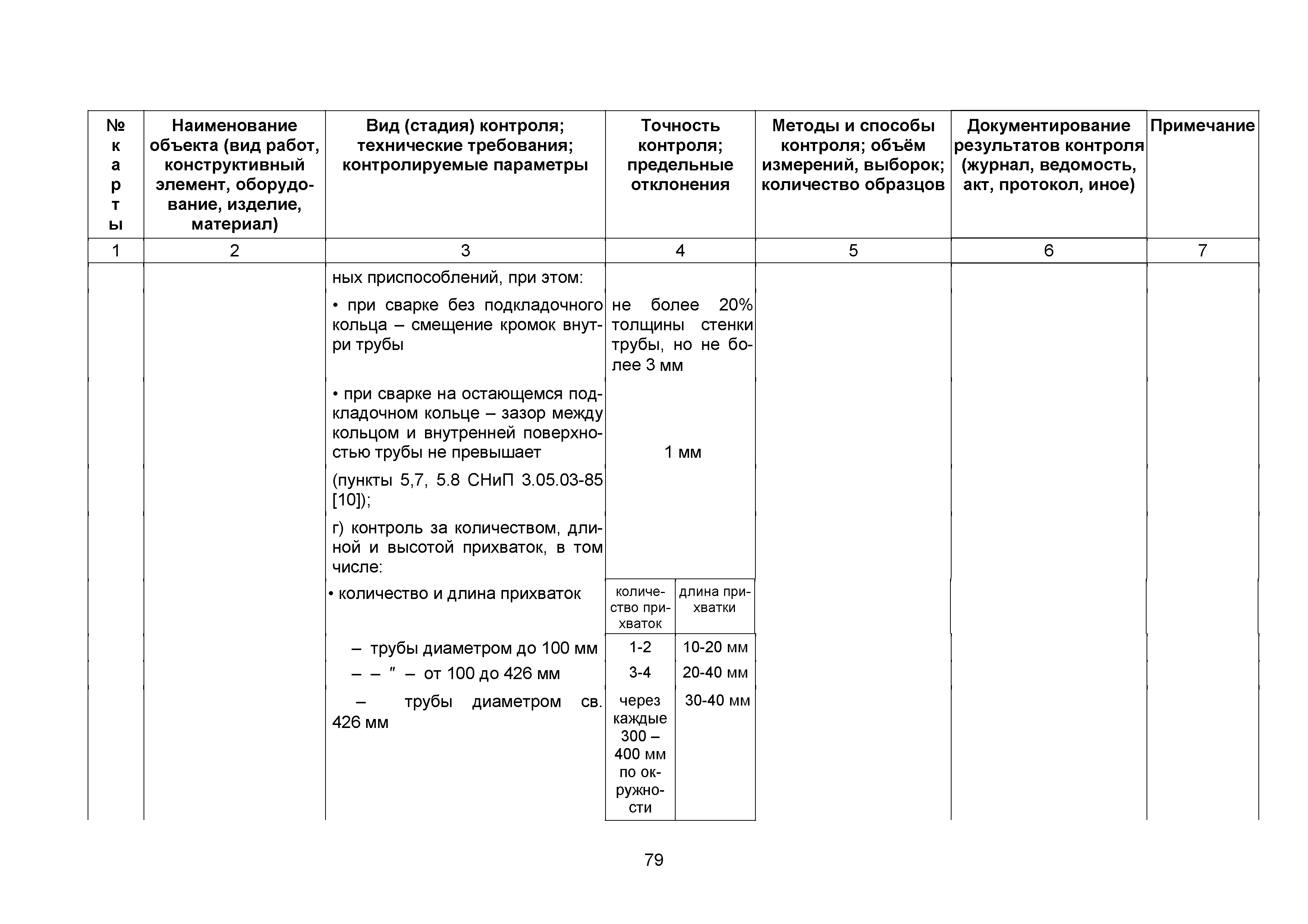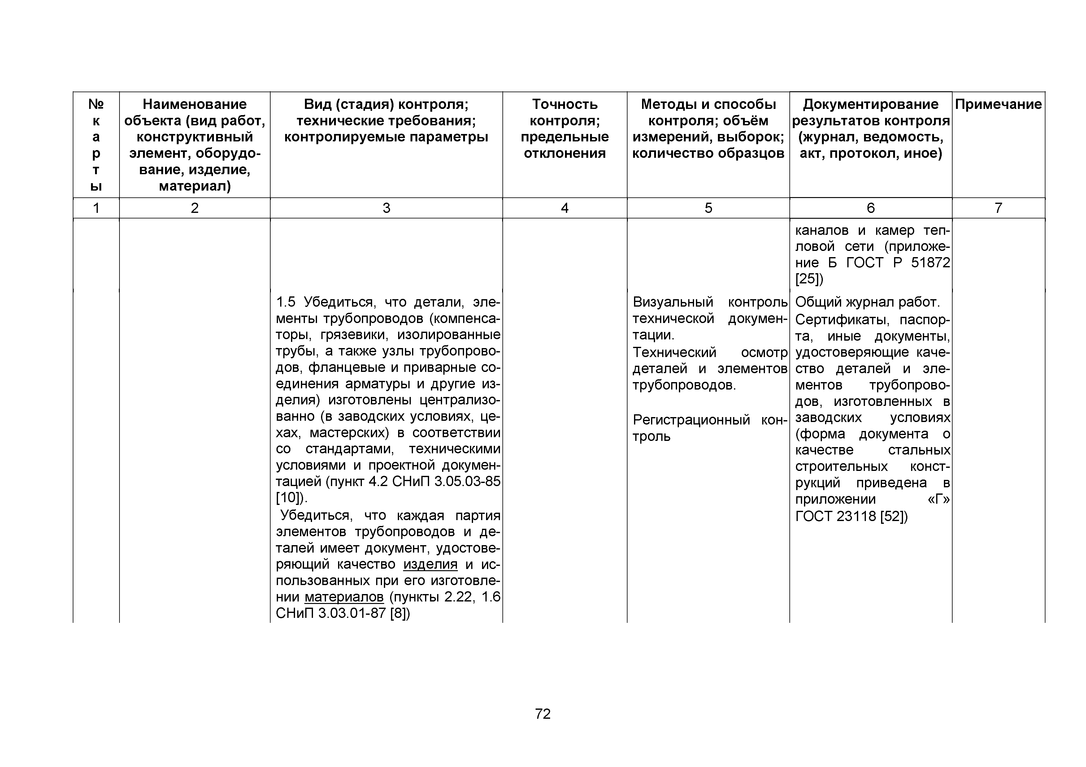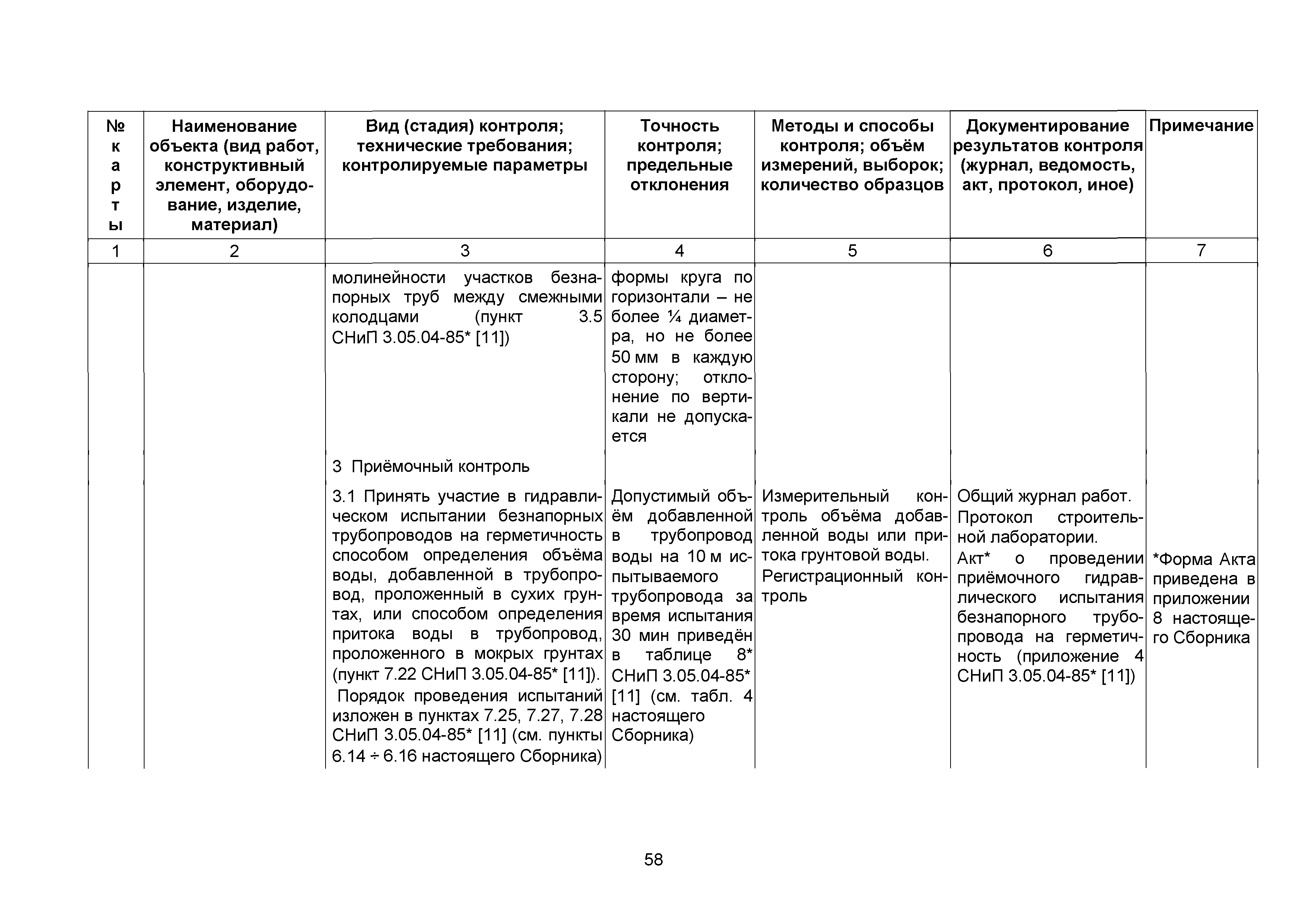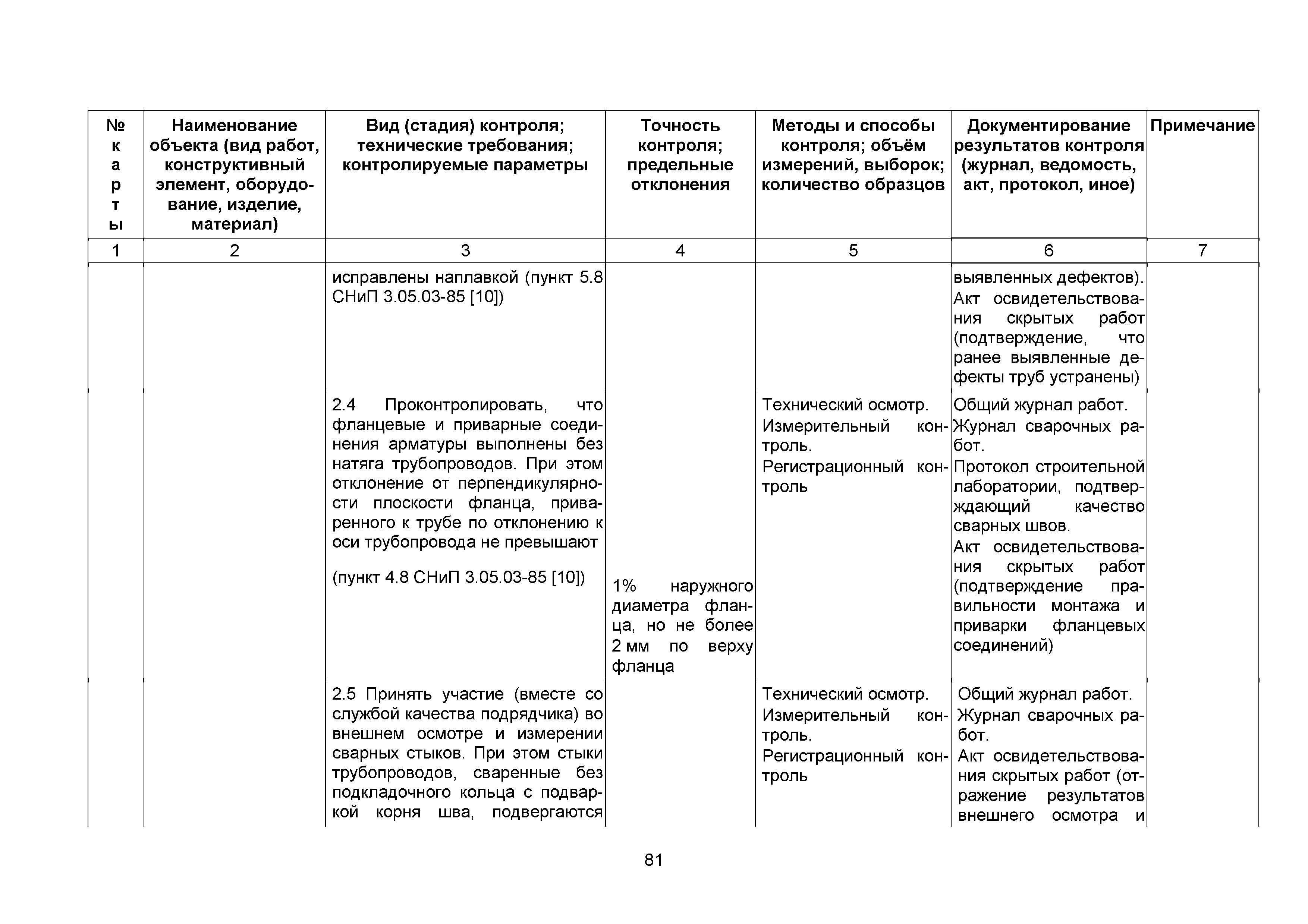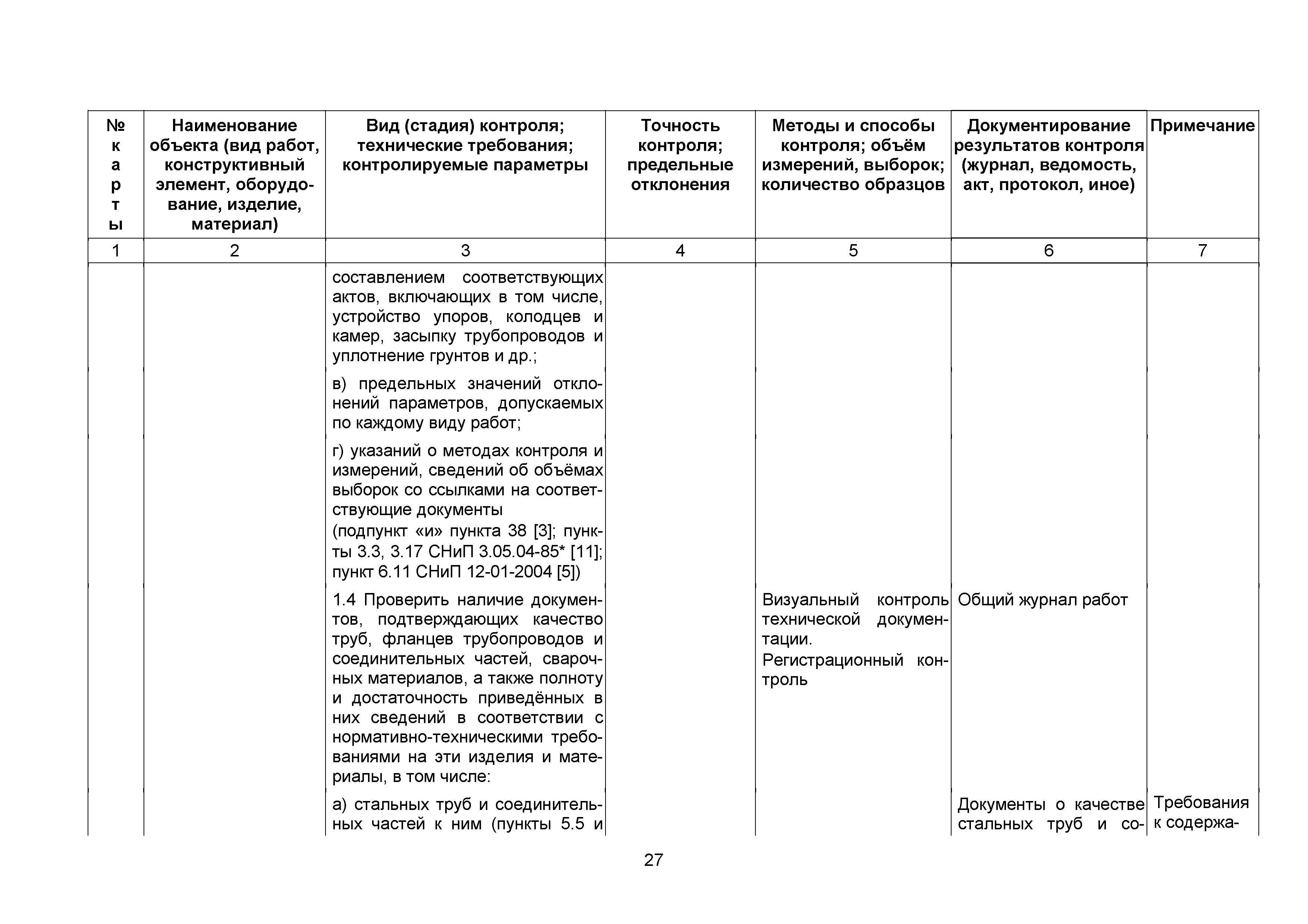 Сборник 10. Технологические карты на осуществление контроля качества работ при устройстве сетей инженерно-технического обеспечения (к Практическому пособию по организации и осуществлению строительного контроля заказчика (технического надзора) за строительством объектов капитального строительства)| Статус: | справочные материалы, мп, тпр | | Название рус.: | Сборник 10. Технологические карты на осуществление контроля качества работ при устройстве сетей инженерно-технического обеспечения (к Практическому пособию по организации и осуществлению строительного контроля заказчика (технического надзора) за строительством объектов капитального строительства) | | Дата добавления в базу: | 01.09.2013 | | Дата актуализации: | 01.01.2021 | | Область применения: | Сборник предназначен для специалистов служб заказчика (застройщика), осуществляющих технический надзор за строительством объектов капитального строительства, и может быть полезен для иных субъектов инвестиционной деятельности (проектировщиков, строительных подрядчиков), принимающих участие в разработке и реализации инвестиционных проектов. | | Оглавление: | 1. Область применения 2. Нормативные ссылки 3. Термины и определения 4. Общие положения 5. Требование к производству сварочных работ и качеству сварных соединений 6. Испытание трубопроводов на прочность и герметичность Приложение 1. Нормативные требования к содержанию документа о качестве стальных труб, гнутых отводов и соединительных частей, поставляемых отдельно от труб Приложение 2. Нормативные требования к содержанию документа о качестве чугунных труб Приложение 3. Технологические карты на осуществление контроля качества работ при устройстве наружных сетей инженерно-технического обеспечения Приложение 4. Виды сварных соединений, швов, а также характерные виды дефектов, выявляемых при визуальном и измерительном контроле Приложение 5. Форма Акта о проведении приемочного гидравлического испытания напорного трубопровода на прочность и герметичность Приложение 6. Форма Акта о проведении пневматического испытания напорного трубопровода на прочность и герметичность Приложение 7. Порядок проведения гидравлического испытания напорного трубопровода на прочность и герметичность Приложение 8. Форма Акта о проведении приемочного гидравлического испытания безнапорного трубопровода на герметичность Приложение 9. Форма Акта о проведении промывки и дезинфекции трубопроводов (сооружений) хозяйственно-питьевого водоснабжения Приложение 10. Форма Акта о проведении испытаний трубопроводов на прочность и герметичность Приложение 11. Форма Акта о проведении промывки (продувки) трубопроводов Приложение 12. Нормативные требования к геометрическим размерам и к качеству поверхности стальных труб Приложение 13. Форма Акта о проведении растяжки компенсаторов Приложение 14. Нормативные требования к показателям внешнего вида поверхности керамических труб Приложение 15. Нормативные требования к глубине заделки стыковых соединений чугунных напорных и керамических труб Библиография | | Разработан: | ОАО Центринвестпроект