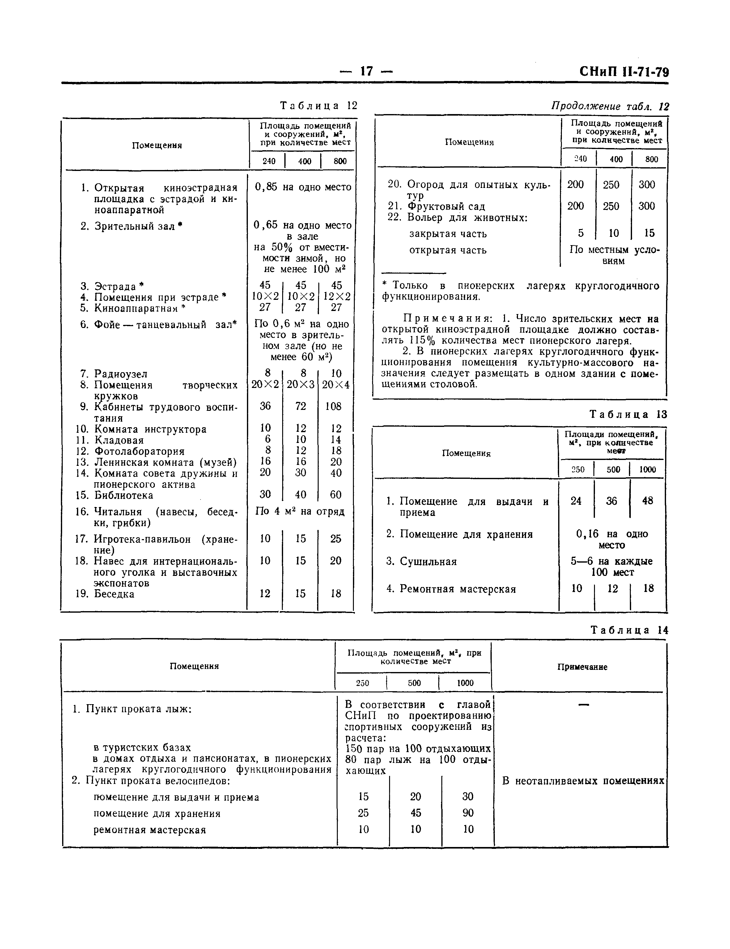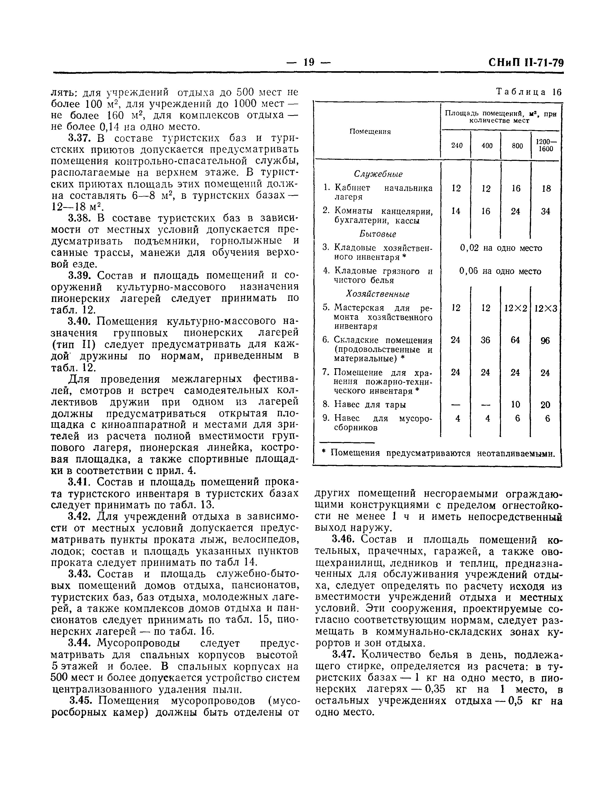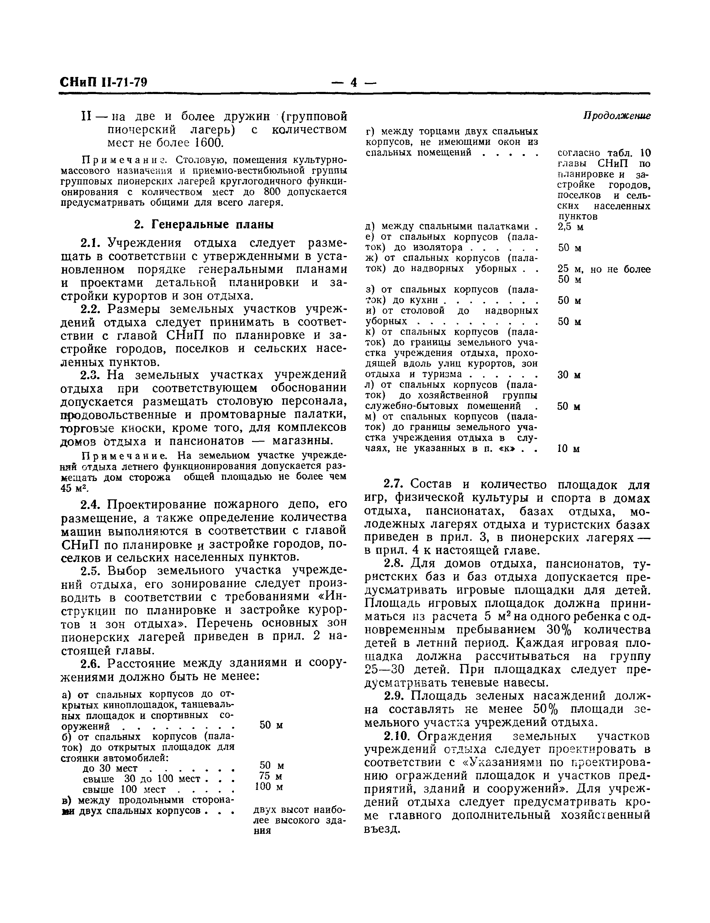 | Оглавление: | 1 Общие положения 2 Генеральные планы 3 Объемно-планировочные и конструктивные решения 4 Водоснабжение и канализация 5 Отопление и вентиляция 6 Электроснабжение и электротехнические устройства Приложение 1. Перечень отапливаемых помещений летних пионерских лагерей Приложение 2. Основные зоны пионерских лагерей Приложение 3. Состав и количество площадок для игр, физической культуры и спорта в домах отдыха, пансионатах, базах отдыха, молодежных лагерях отдыха и туристских базах в зависимости от количества мест Приложение 4. Состав и количество площадок для игр, физической культуры и спорта в пионерских лагерях |