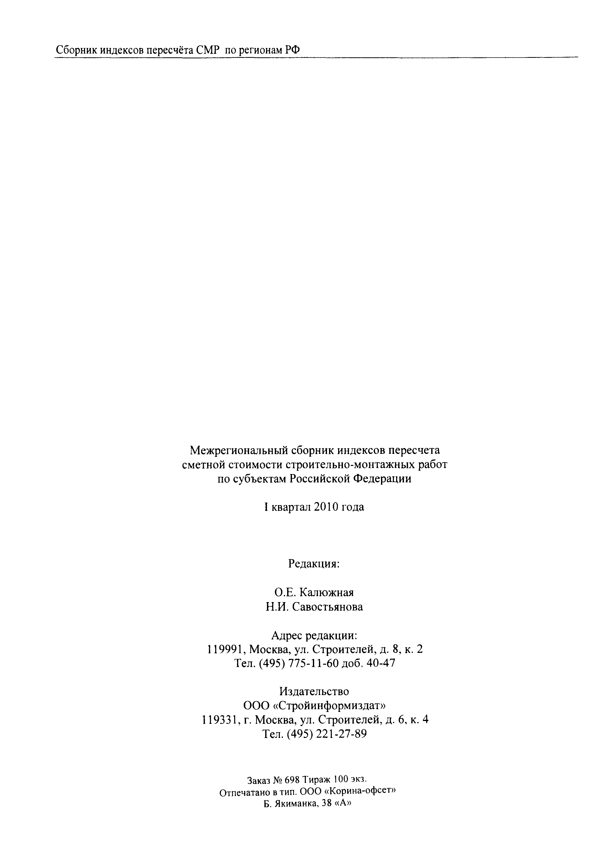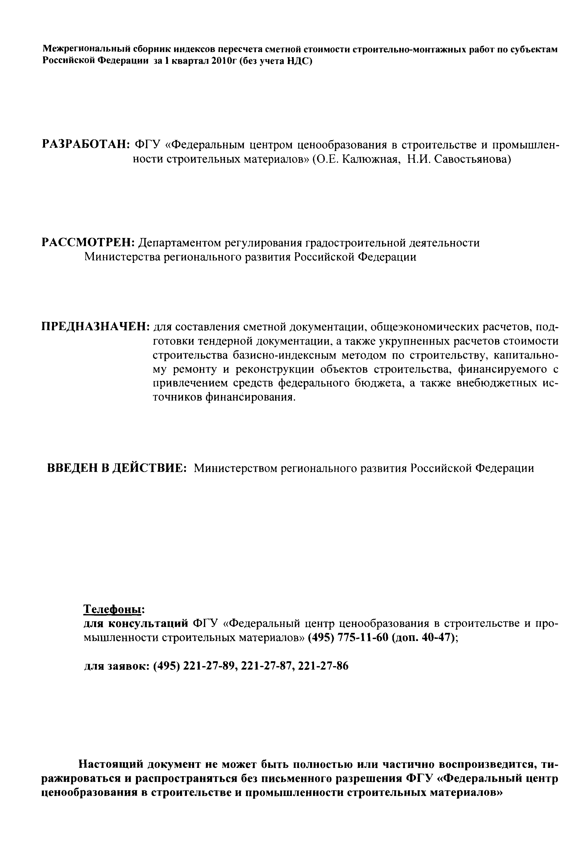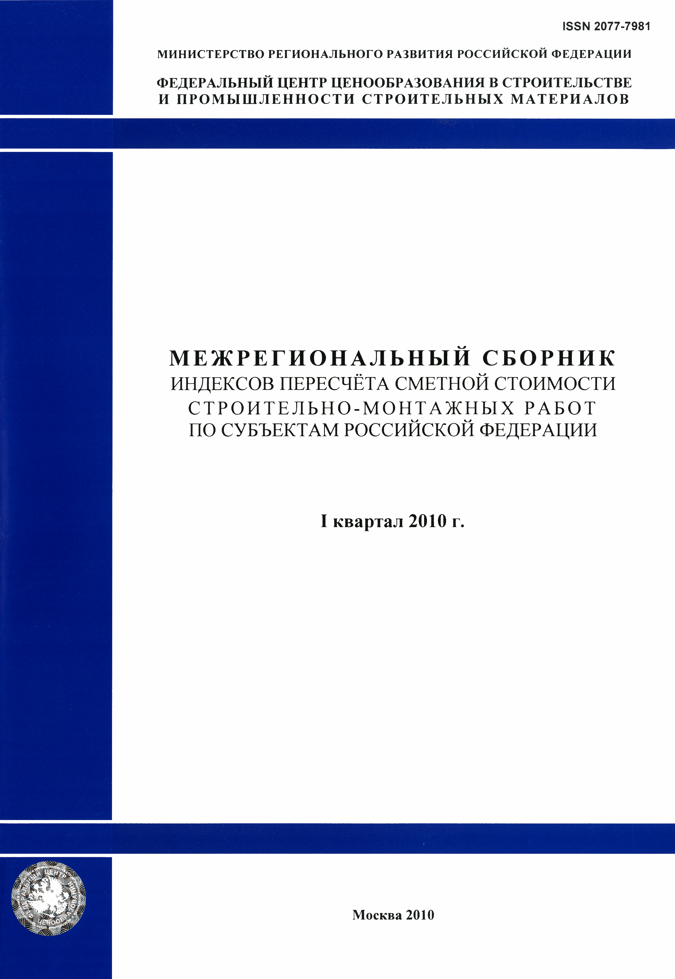 Скачать Межрегиональный сборник индексов пересчета сметной стоимости строительно-монтажных работ по субъектам Российской Федерации на I квартал 2010 г.Дата актуализации: 01.01.2021