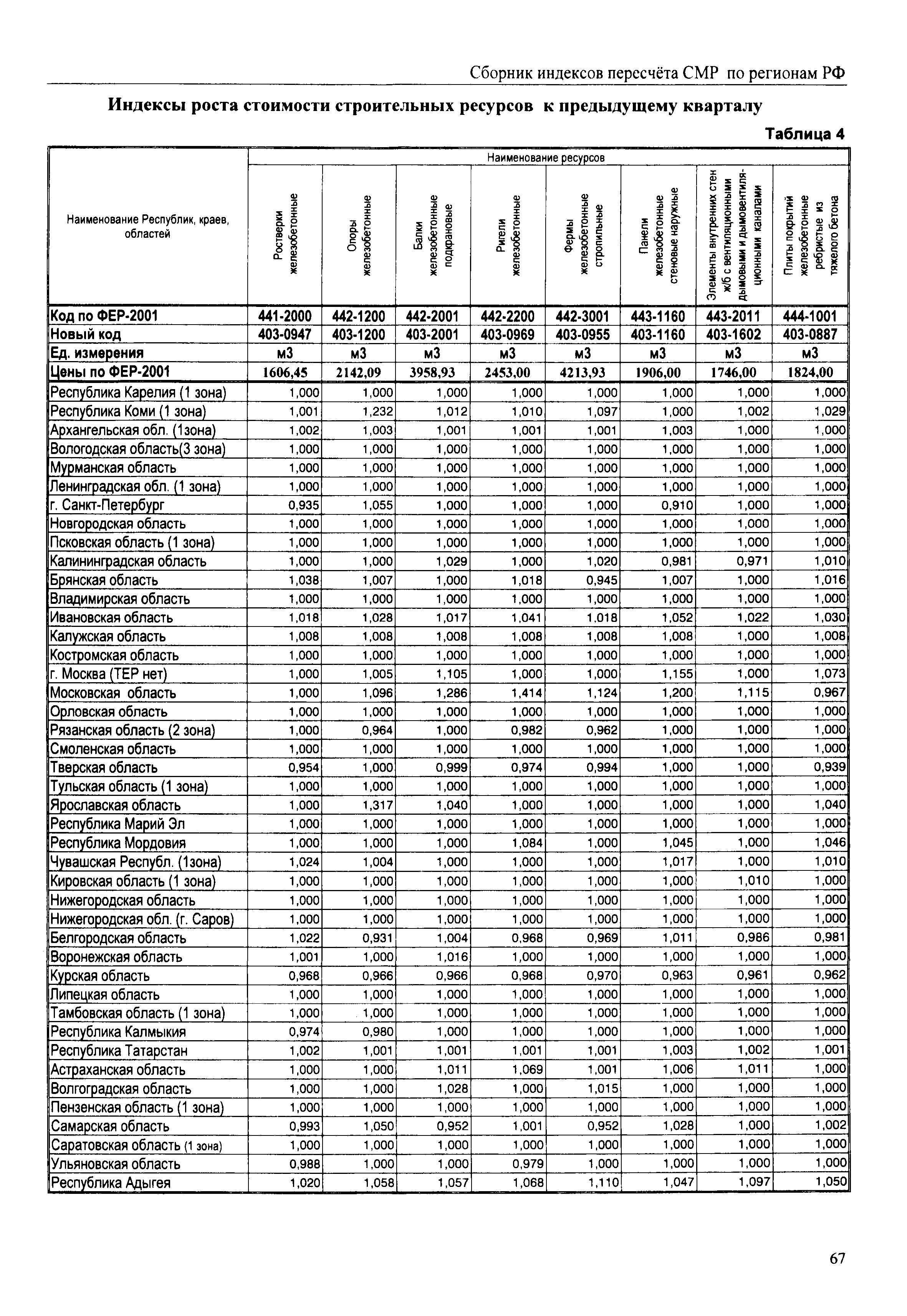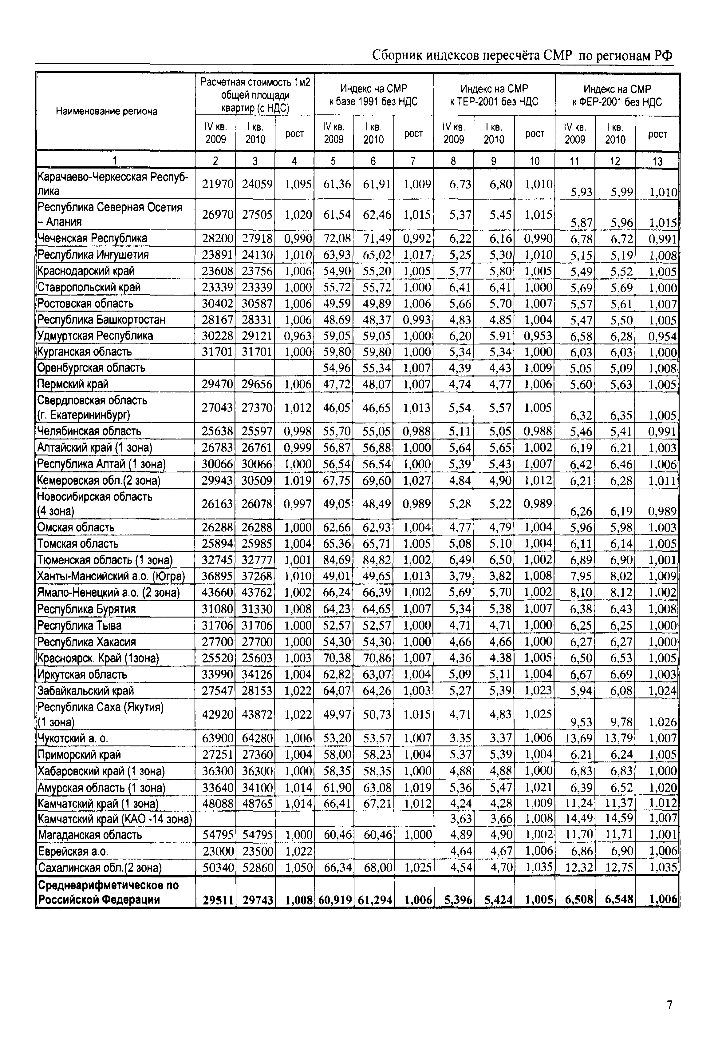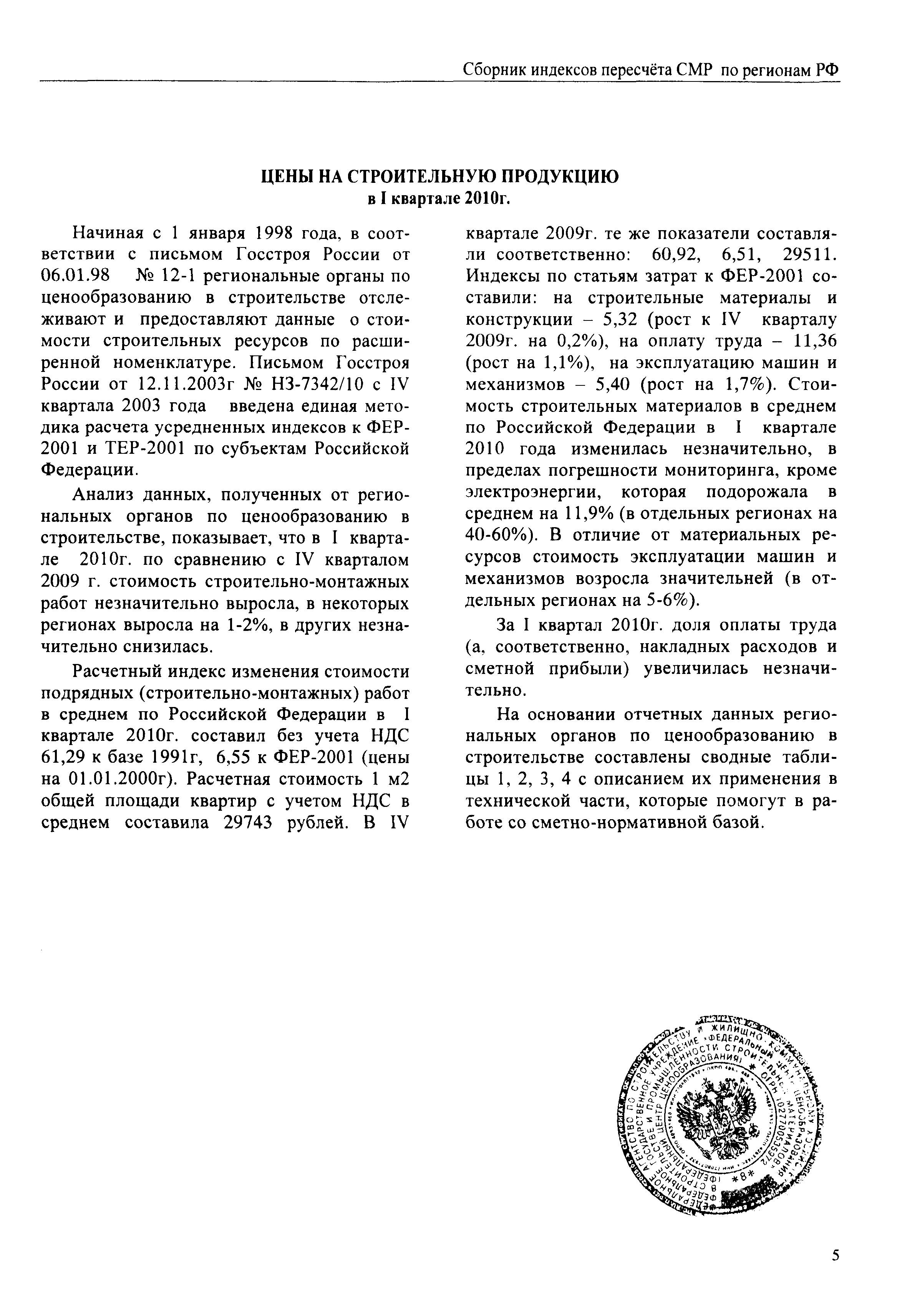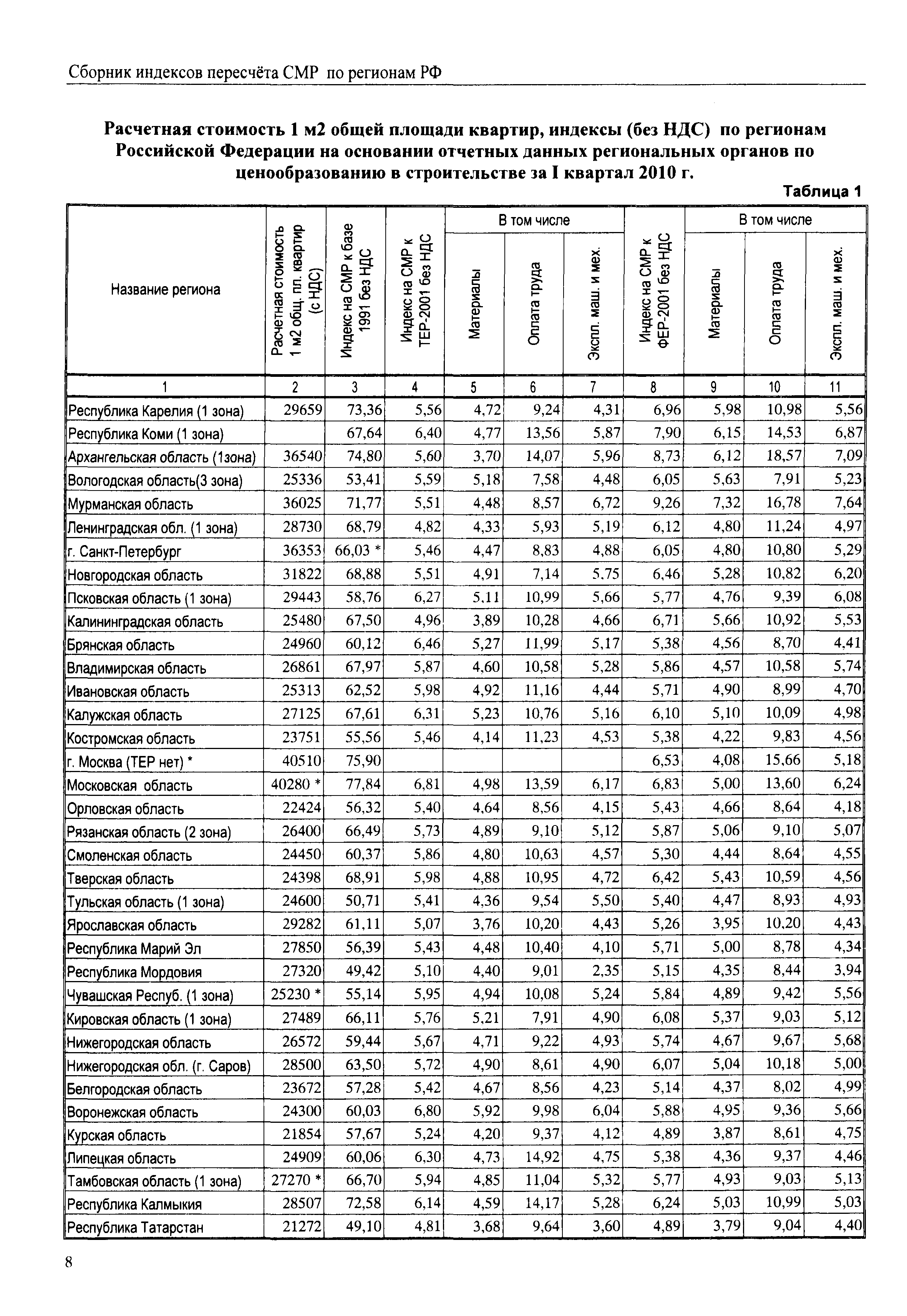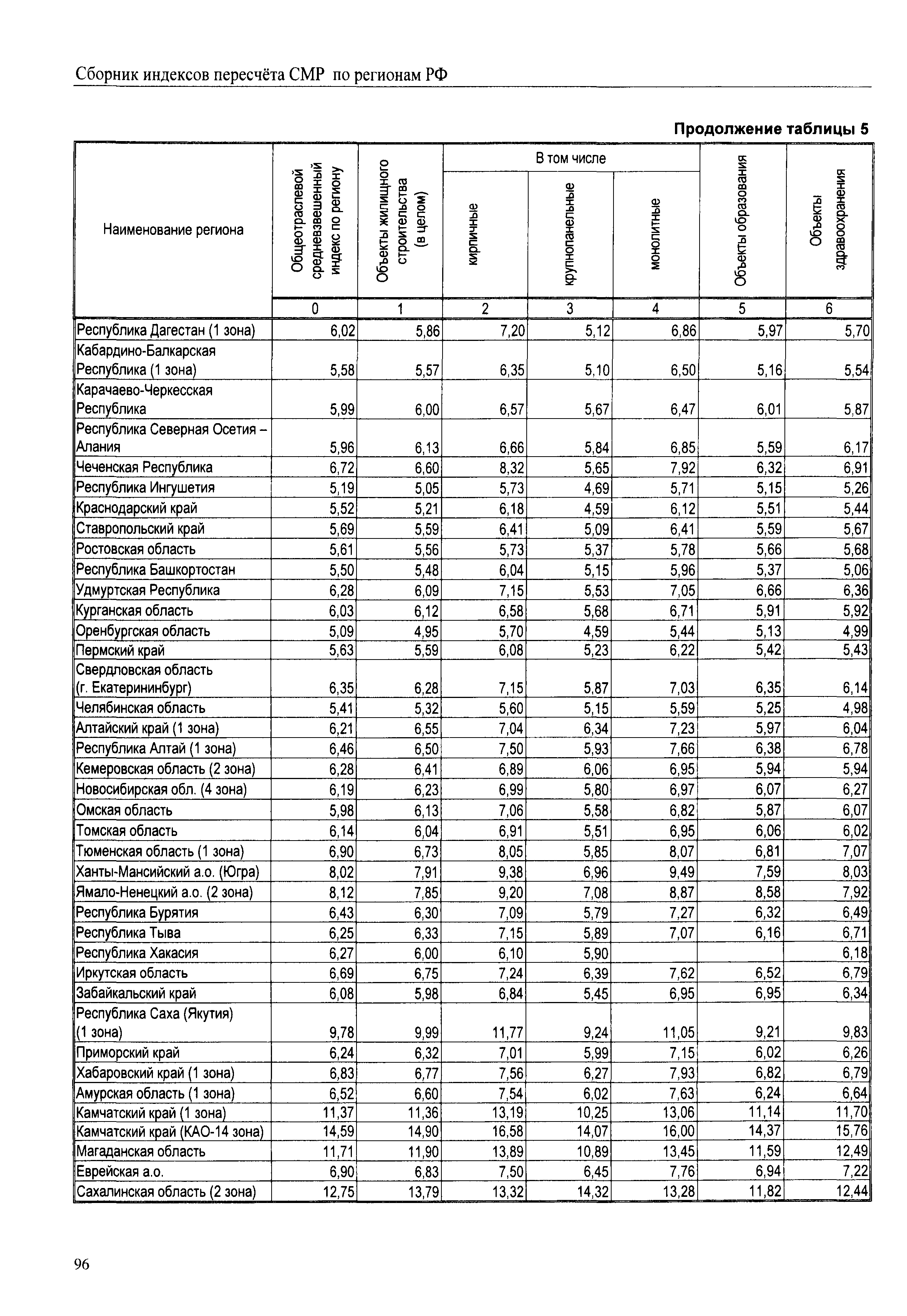 Межрегиональный сборник индексов пересчета сметной стоимости строительно-монтажных работ по субъектам Российской Федерации на I квартал 2010 г.| Статус: | не действует | | Название рус.: | Межрегиональный сборник индексов пересчета сметной стоимости строительно-монтажных работ по субъектам Российской Федерации на I квартал 2010 г. | | Дата добавления в базу: | 01.09.2013 | | Дата актуализации: | 01.09.2013 | | Область применения: | В сборнике приведены сводные таблицы текущих (I квартал 2010 г.) региональных цен на основные ресурсы, применяемые в строительстве, региональные индексы пересчета базисной стоимости строительно-монтажных работ, определяемой с использованием сборников новой сметно-нормативной базы (ФЕР-2001, ТЕР-2001), в территориальный текущий уровень. Индексы разработаны по единой методике, на основании отчетных данных региональных органов по ценообразованию в строительстве о стоимости строительных ресурсов, применяемых в регионе. | | Оглавление: | Общая часть Техническая часть (к таблицам 1, 2, 3, 4) Цены на строительную продукцию в I квартале 2010 г. Анализ роста индексов и стоимости 1 м2 по субъектам Российской Федерации в I квартале 2010 г. – таблица А Расчетная стоимость 1 м2 общей площади квартир и индексы изменения стоимости строительства по субъектам Российской Федерации за I квартал 2010 г. – Таблица 1 Сметная стоимость строительных ресурсов (без НДС) в руб. - Таблица 2 Индексы на отдельные виды ресурсов (к заложенным в ФЕР-2001) - Таблица 3 Индексы роста стоимости строительных ресурсов к предыдущему кварталу - Таблица 4 Региональные индексы к ФЕР-2001 по основным видам объектов строительства - Таблица 5 Индексы на оборудование за I квартал 2010 г. Индексы на прочие работы и затраты за I квартал 2010 г. |