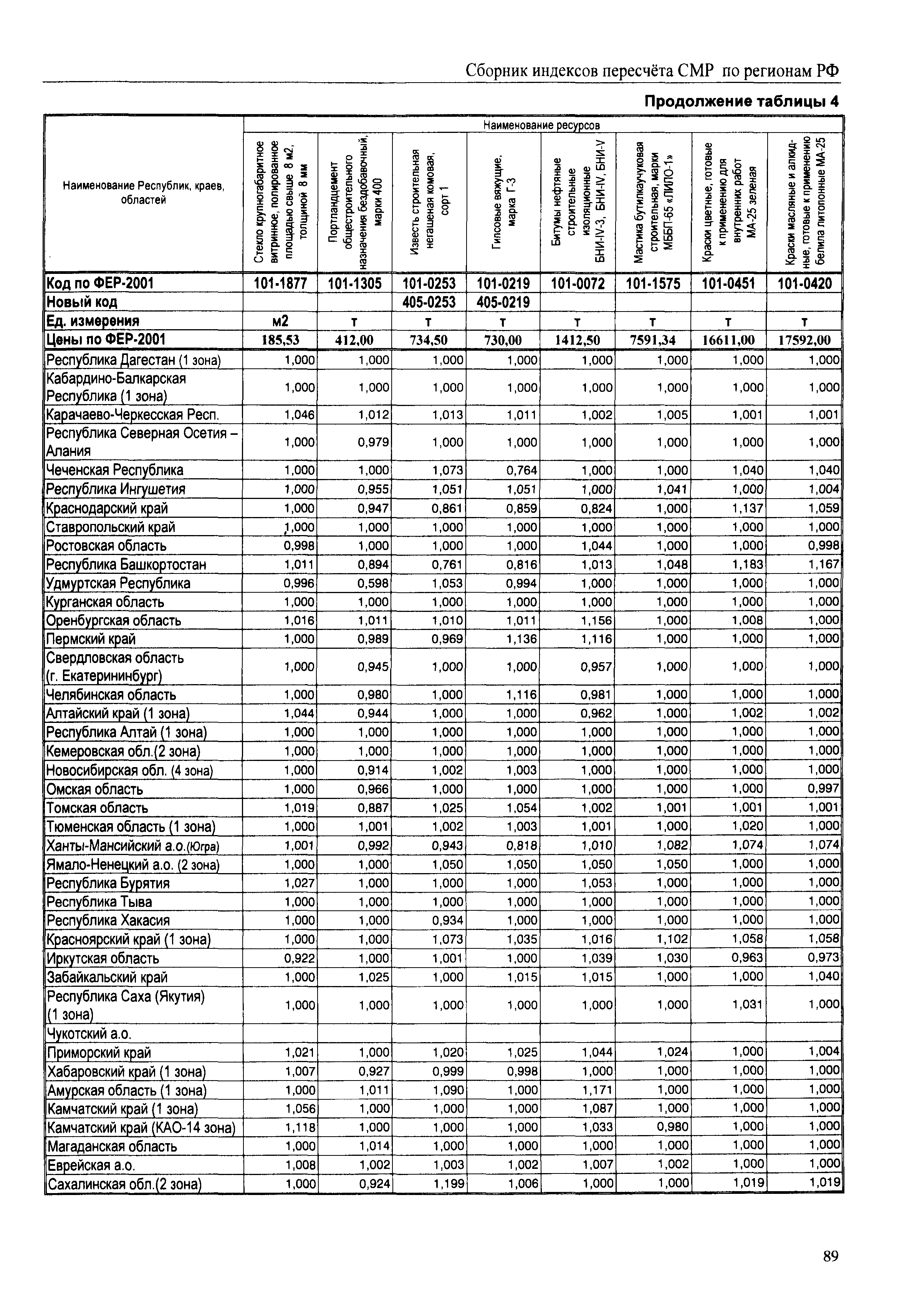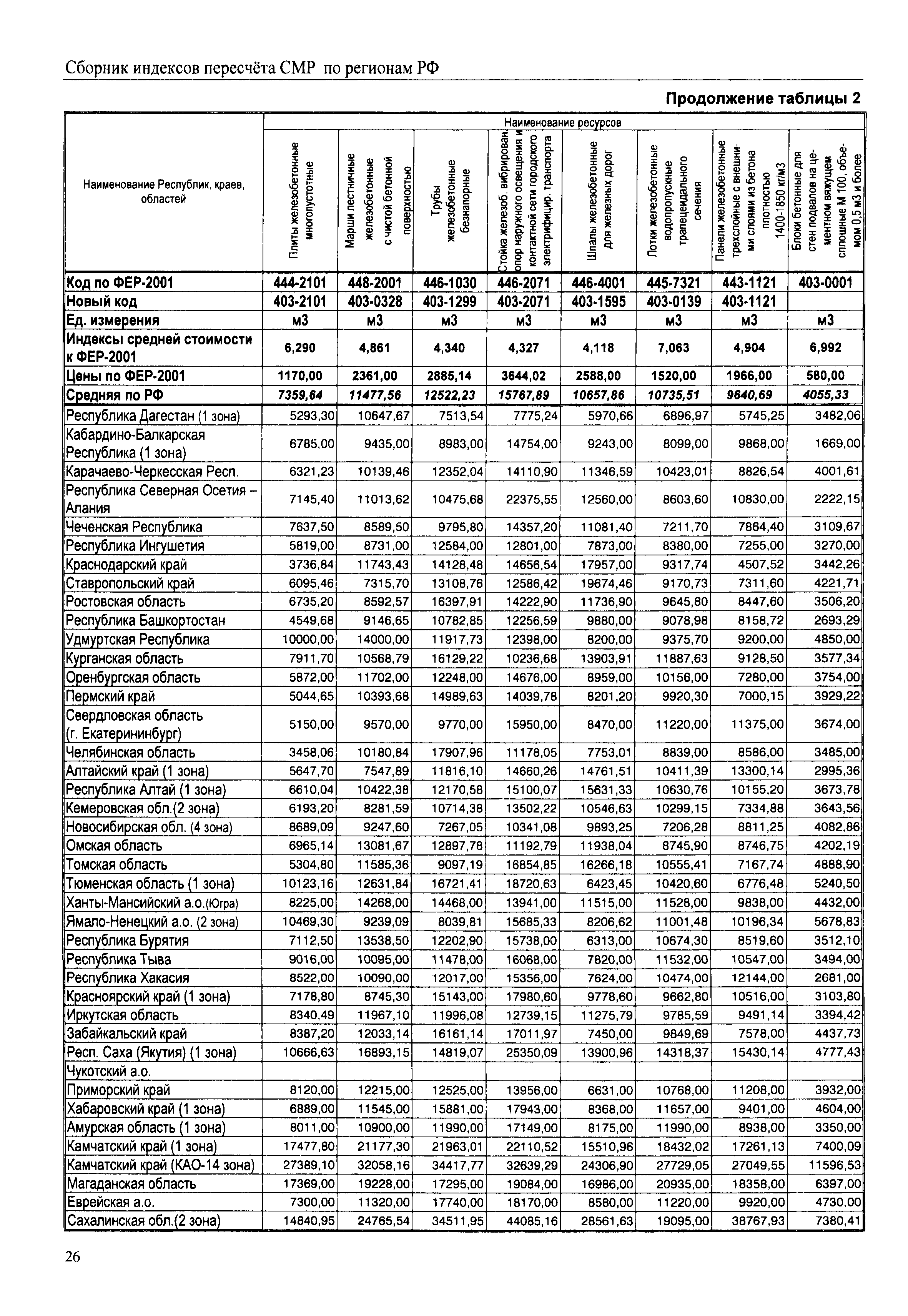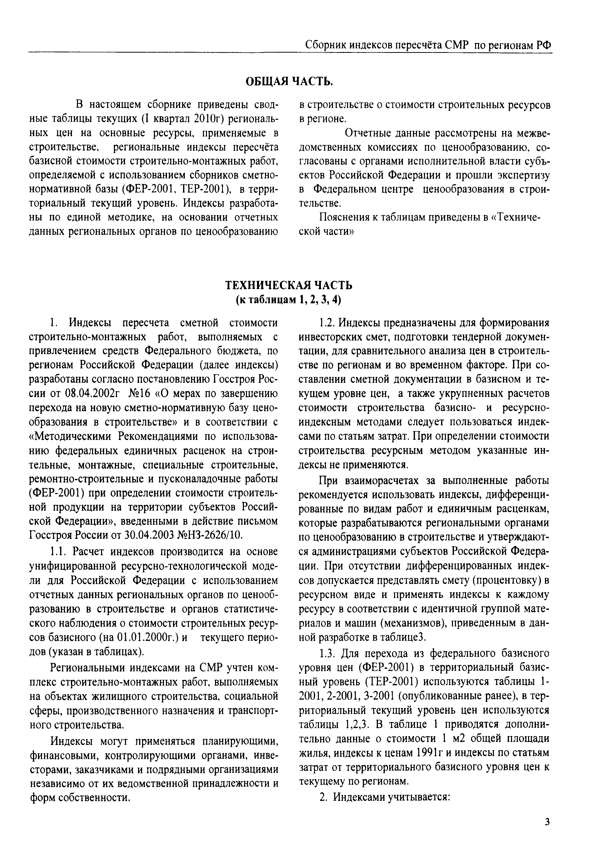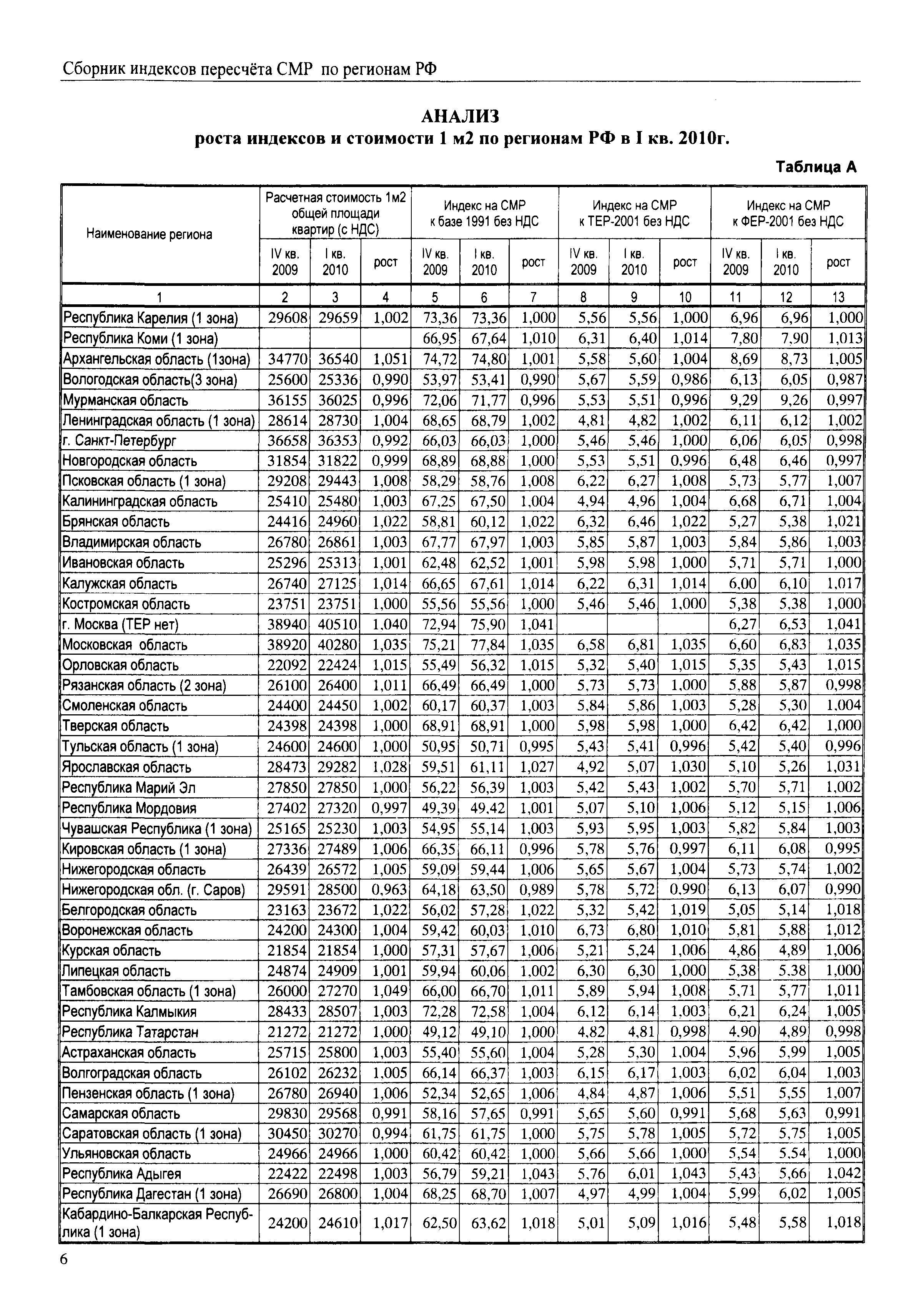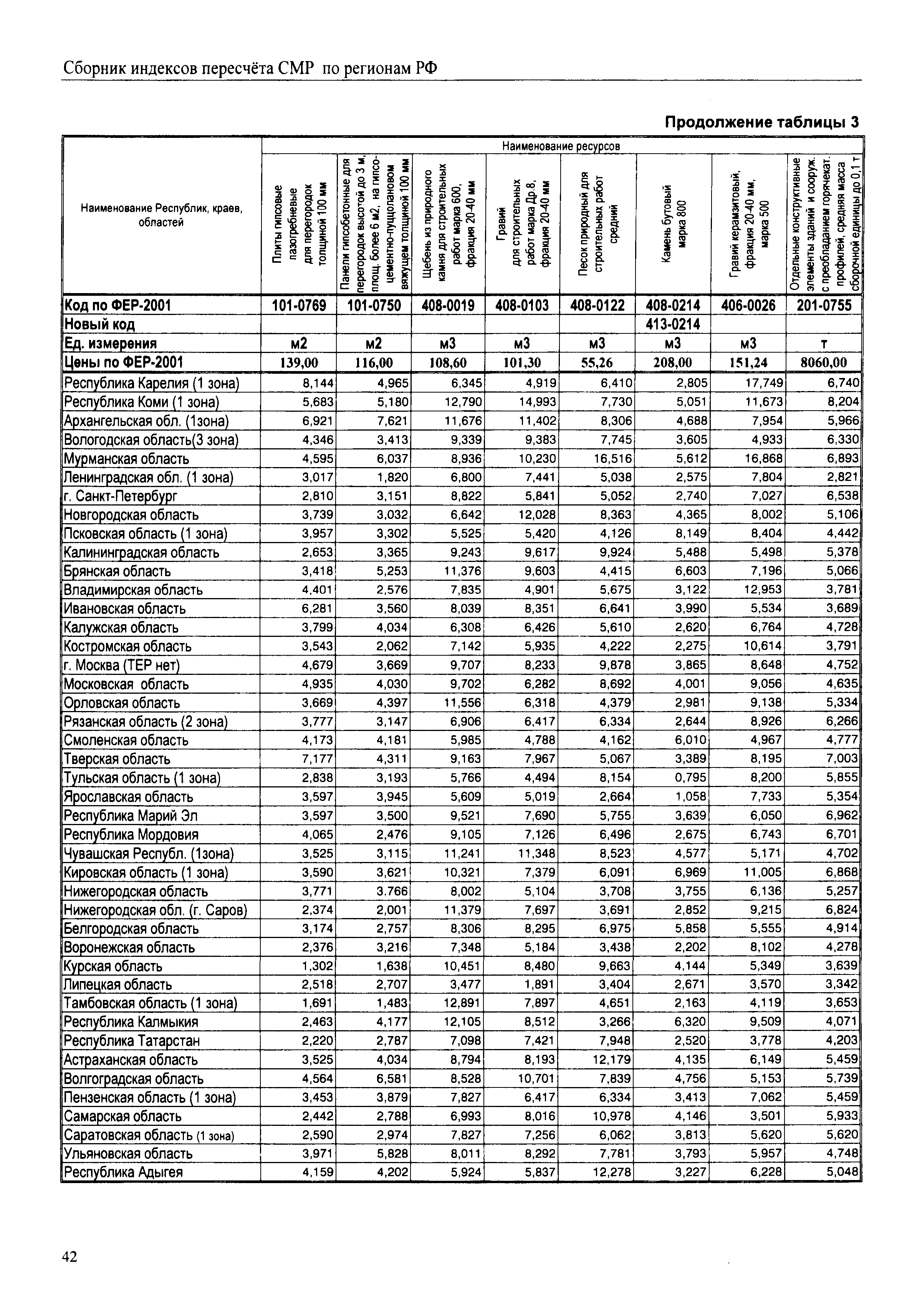 Межрегиональный сборник индексов пересчета сметной стоимости строительно-монтажных работ по субъектам Российской Федерации на I квартал 2010 г.| Статус: | не действует | | Название рус.: | Межрегиональный сборник индексов пересчета сметной стоимости строительно-монтажных работ по субъектам Российской Федерации на I квартал 2010 г. | | Дата добавления в базу: | 01.09.2013 | | Дата актуализации: | 01.09.2013 | | Область применения: | В сборнике приведены сводные таблицы текущих (I квартал 2010 г.) региональных цен на основные ресурсы, применяемые в строительстве, региональные индексы пересчета базисной стоимости строительно-монтажных работ, определяемой с использованием сборников новой сметно-нормативной базы (ФЕР-2001, ТЕР-2001), в территориальный текущий уровень. Индексы разработаны по единой методике, на основании отчетных данных региональных органов по ценообразованию в строительстве о стоимости строительных ресурсов, применяемых в регионе. | | Оглавление: | Общая часть Техническая часть (к таблицам 1, 2, 3, 4) Цены на строительную продукцию в I квартале 2010 г. Анализ роста индексов и стоимости 1 м2 по субъектам Российской Федерации в I квартале 2010 г. – таблица А Расчетная стоимость 1 м2 общей площади квартир и индексы изменения стоимости строительства по субъектам Российской Федерации за I квартал 2010 г. – Таблица 1 Сметная стоимость строительных ресурсов (без НДС) в руб. - Таблица 2 Индексы на отдельные виды ресурсов (к заложенным в ФЕР-2001) - Таблица 3 Индексы роста стоимости строительных ресурсов к предыдущему кварталу - Таблица 4 Региональные индексы к ФЕР-2001 по основным видам объектов строительства - Таблица 5 Индексы на оборудование за I квартал 2010 г. Индексы на прочие работы и затраты за I квартал 2010 г. |