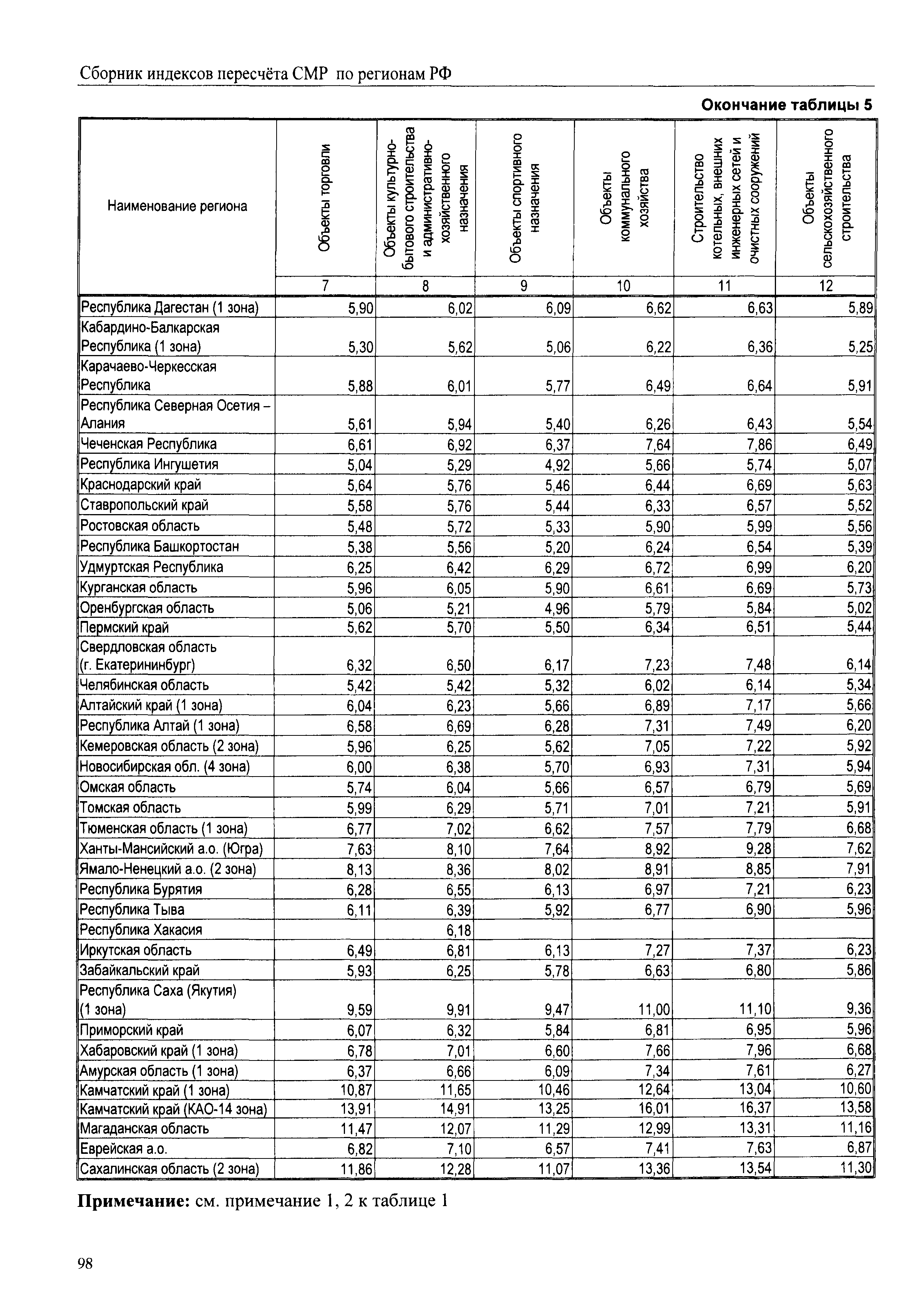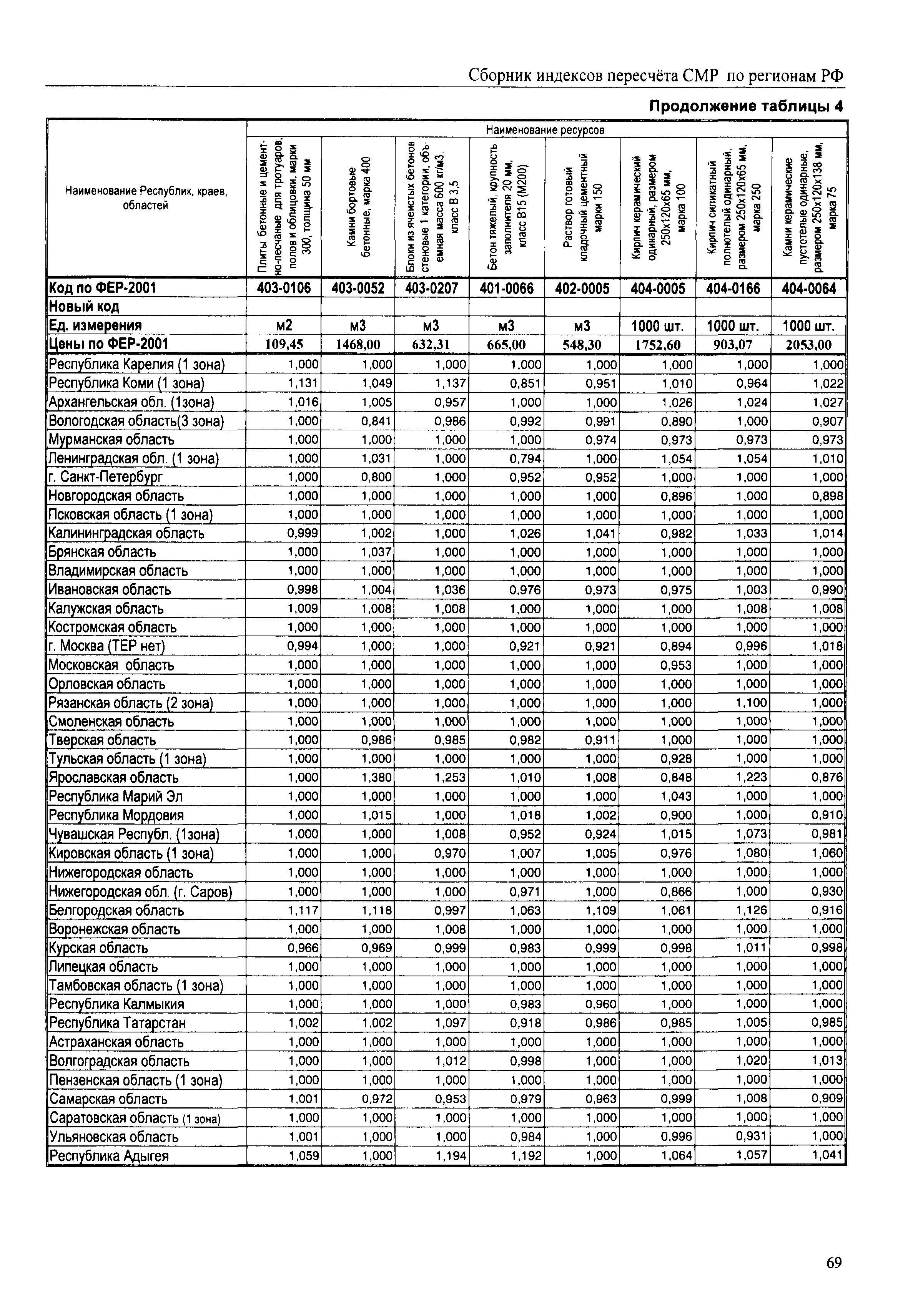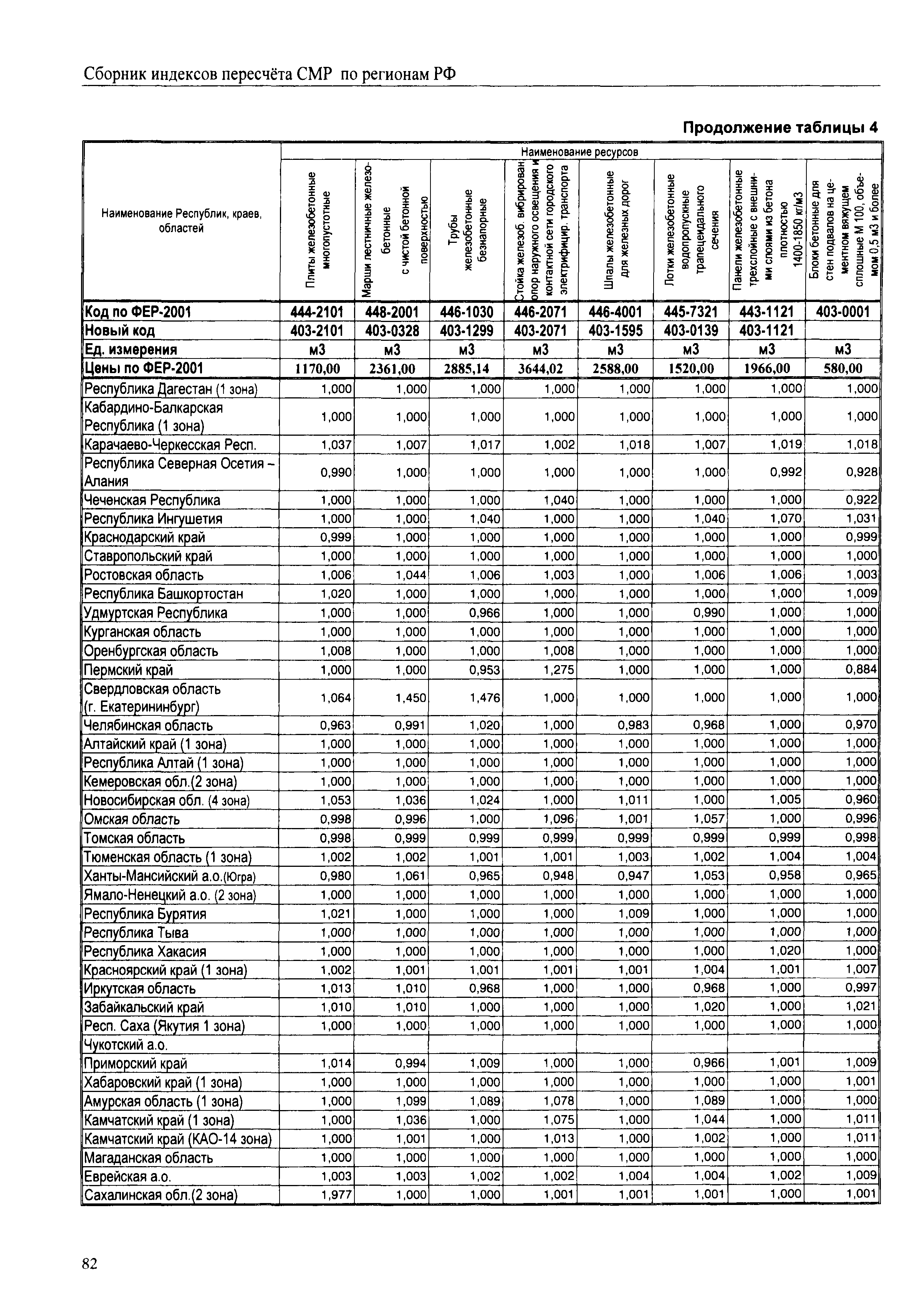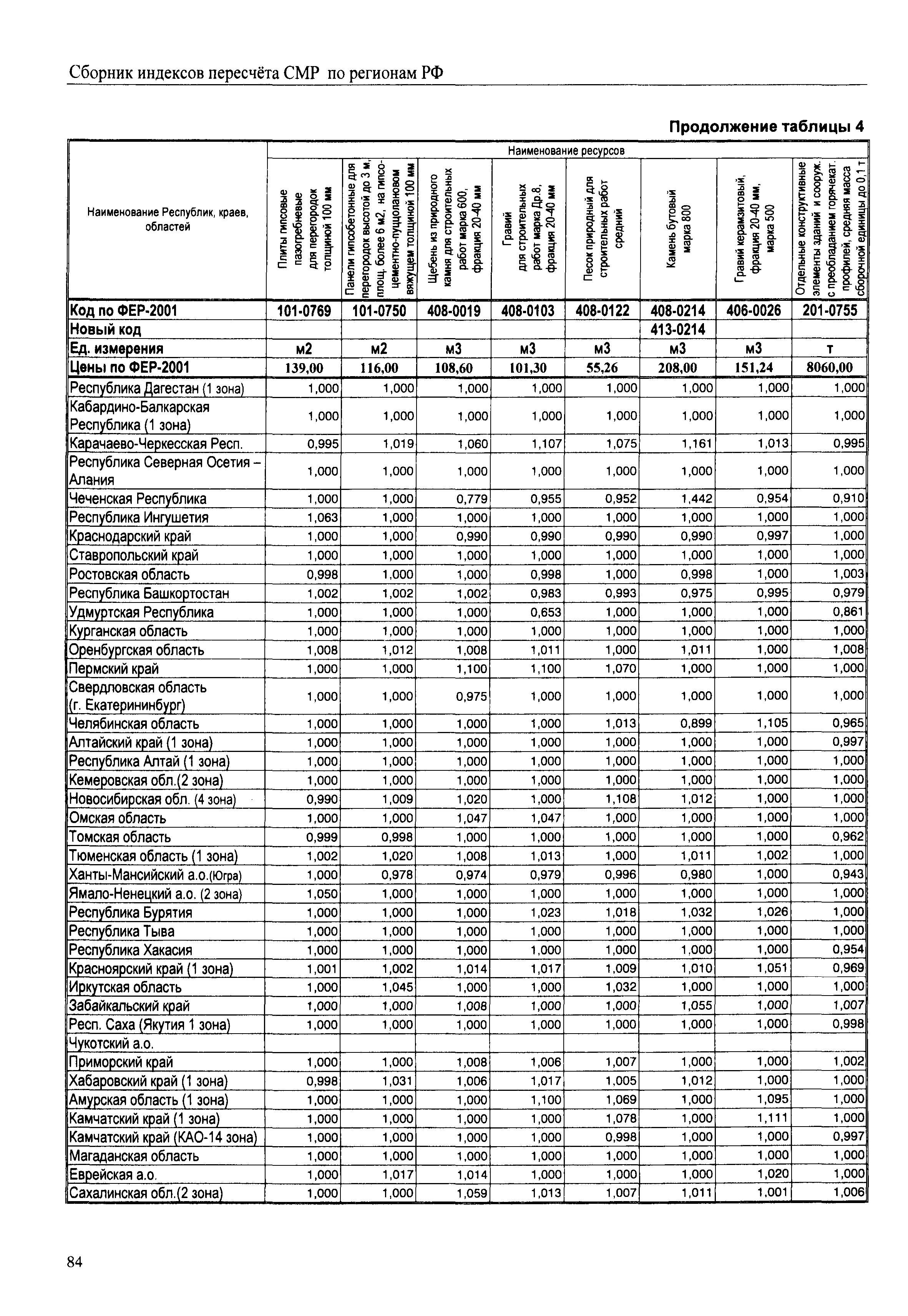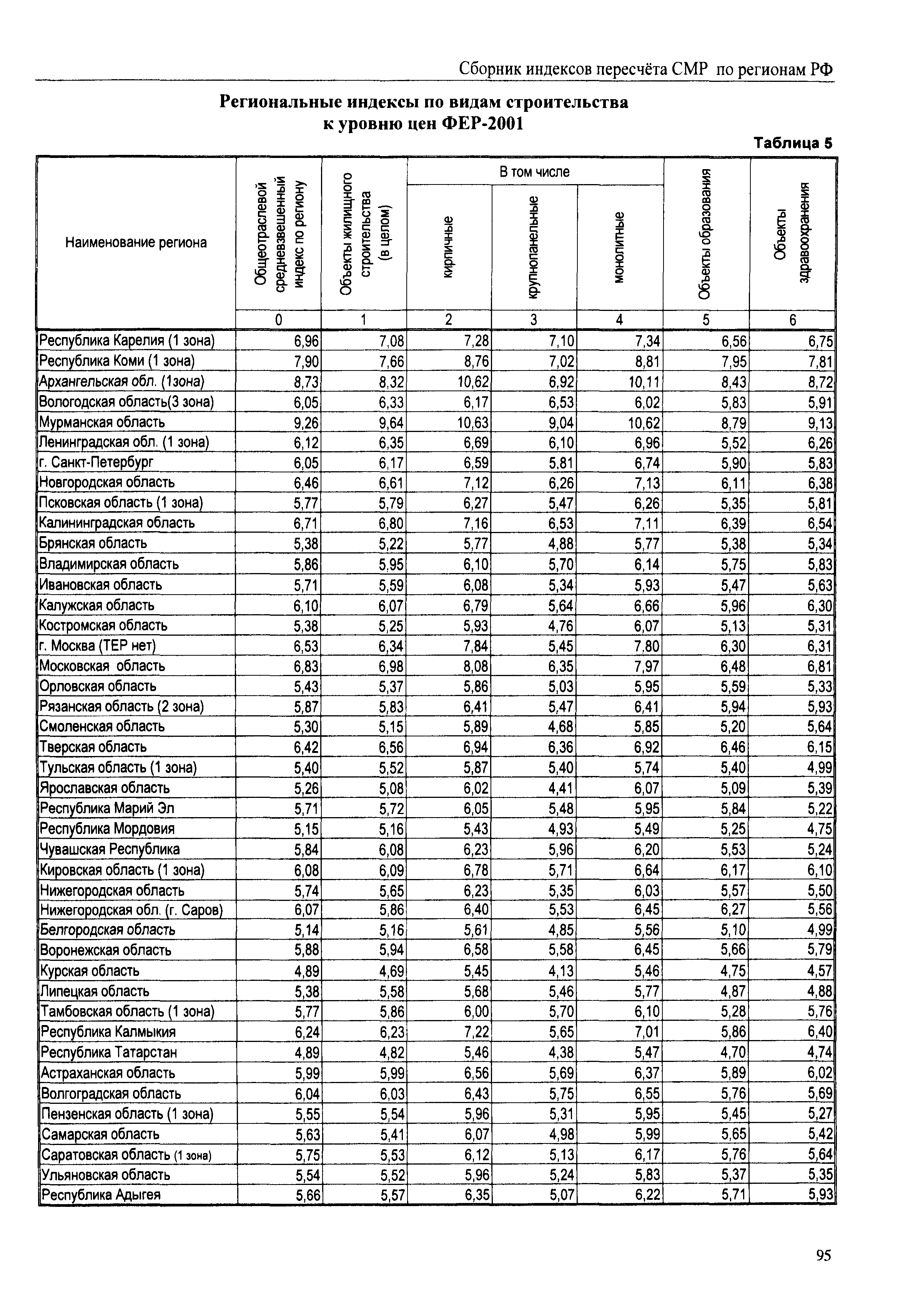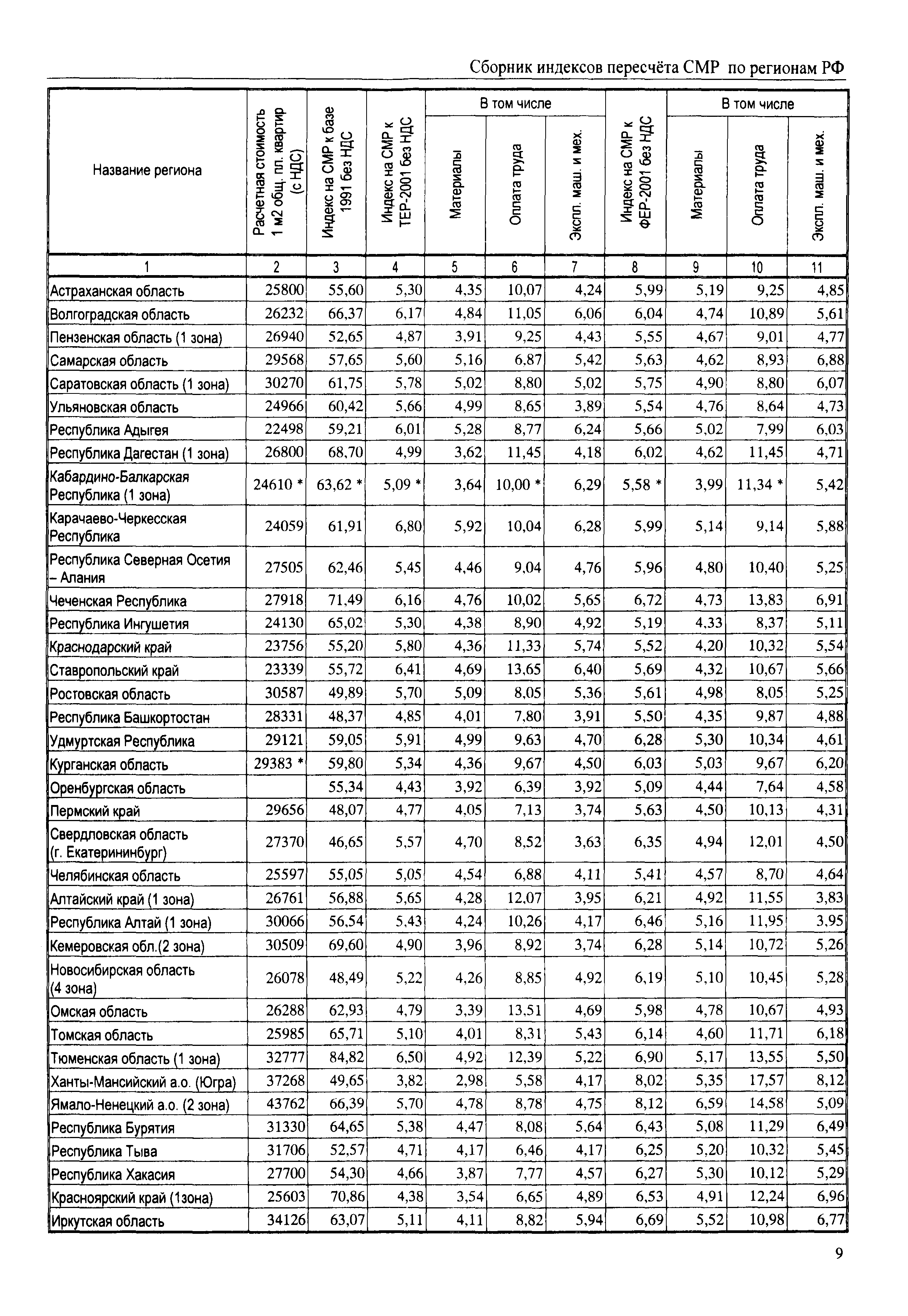 Межрегиональный сборник индексов пересчета сметной стоимости строительно-монтажных работ по субъектам Российской Федерации на I квартал 2010 г.| Статус: | не действует | | Название рус.: | Межрегиональный сборник индексов пересчета сметной стоимости строительно-монтажных работ по субъектам Российской Федерации на I квартал 2010 г. | | Дата добавления в базу: | 01.09.2013 | | Дата актуализации: | 01.09.2013 | | Область применения: | В сборнике приведены сводные таблицы текущих (I квартал 2010 г.) региональных цен на основные ресурсы, применяемые в строительстве, региональные индексы пересчета базисной стоимости строительно-монтажных работ, определяемой с использованием сборников новой сметно-нормативной базы (ФЕР-2001, ТЕР-2001), в территориальный текущий уровень. Индексы разработаны по единой методике, на основании отчетных данных региональных органов по ценообразованию в строительстве о стоимости строительных ресурсов, применяемых в регионе. | | Оглавление: | Общая часть Техническая часть (к таблицам 1, 2, 3, 4) Цены на строительную продукцию в I квартале 2010 г. Анализ роста индексов и стоимости 1 м2 по субъектам Российской Федерации в I квартале 2010 г. – таблица А Расчетная стоимость 1 м2 общей площади квартир и индексы изменения стоимости строительства по субъектам Российской Федерации за I квартал 2010 г. – Таблица 1 Сметная стоимость строительных ресурсов (без НДС) в руб. - Таблица 2 Индексы на отдельные виды ресурсов (к заложенным в ФЕР-2001) - Таблица 3 Индексы роста стоимости строительных ресурсов к предыдущему кварталу - Таблица 4 Региональные индексы к ФЕР-2001 по основным видам объектов строительства - Таблица 5 Индексы на оборудование за I квартал 2010 г. Индексы на прочие работы и затраты за I квартал 2010 г. |