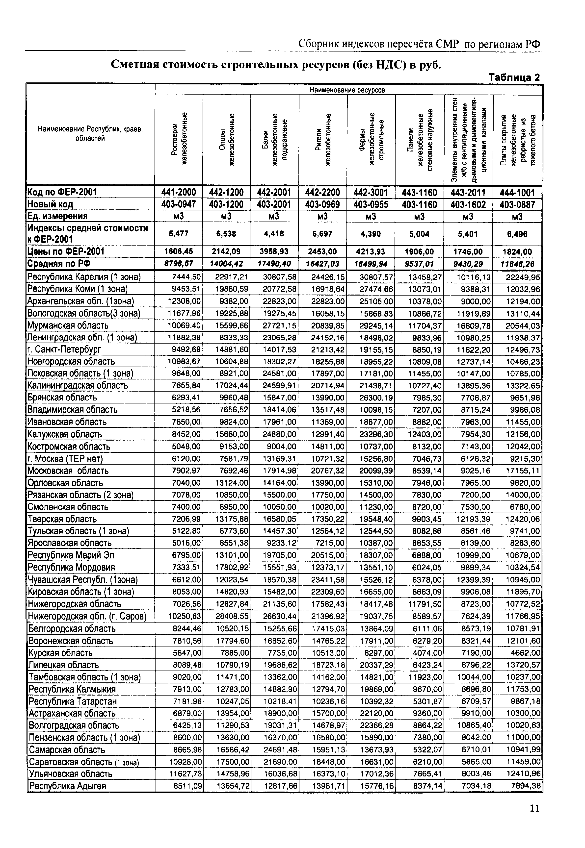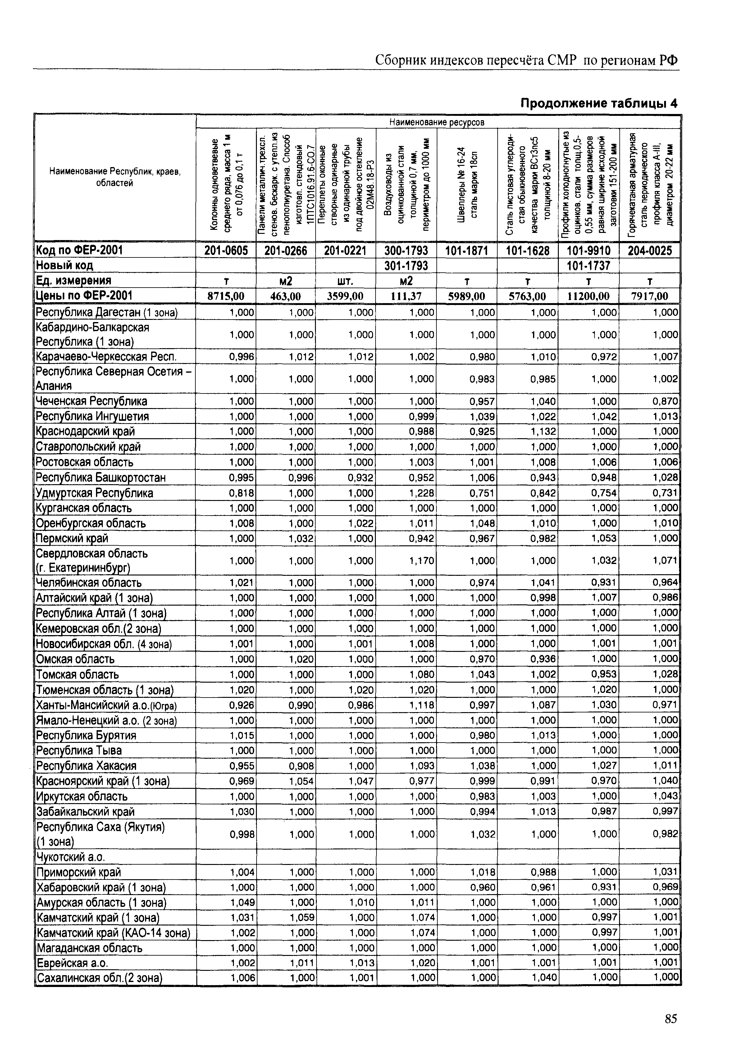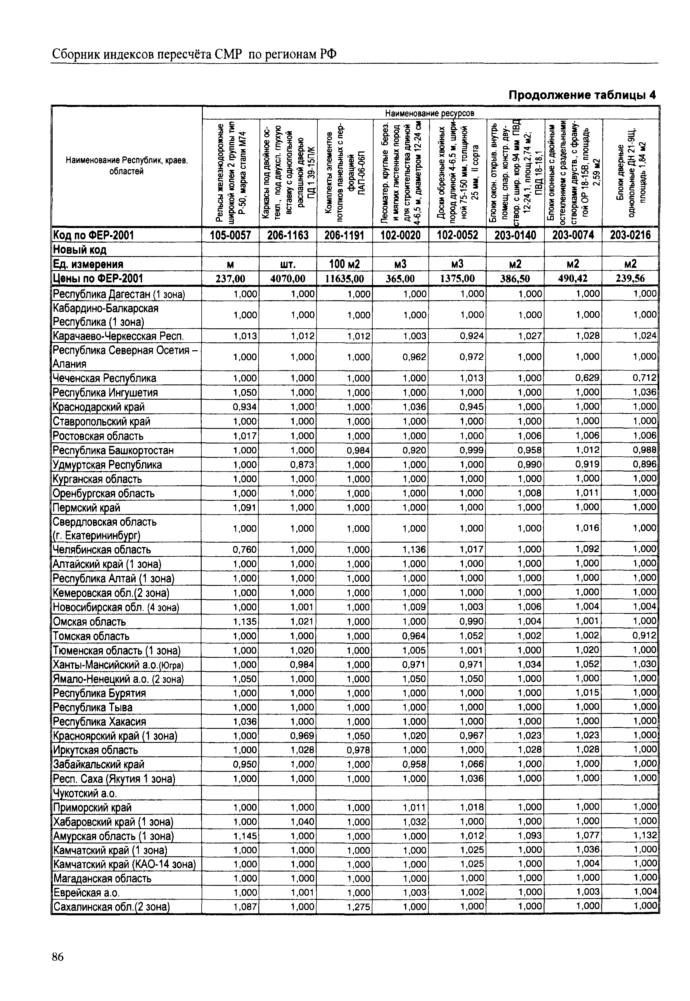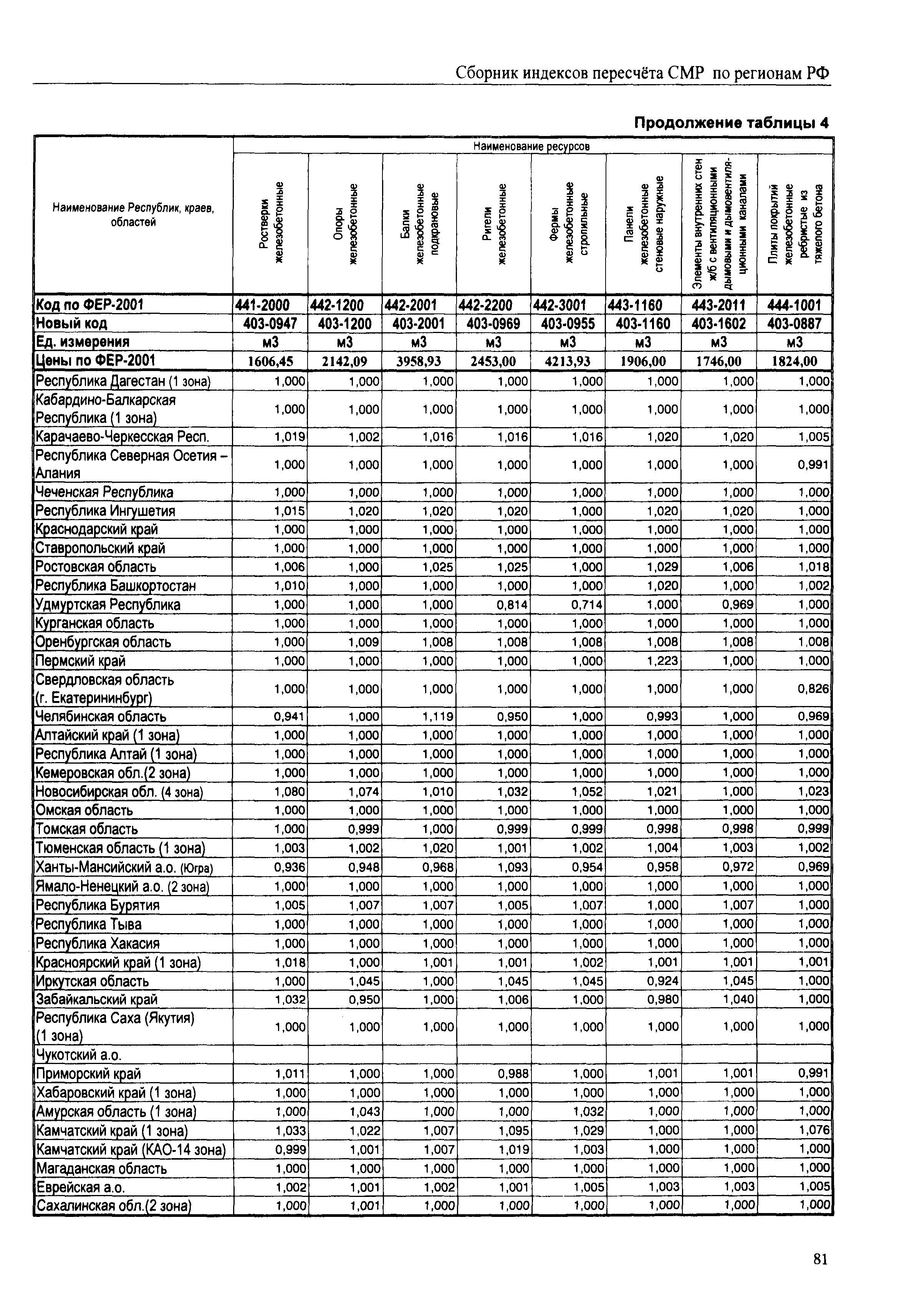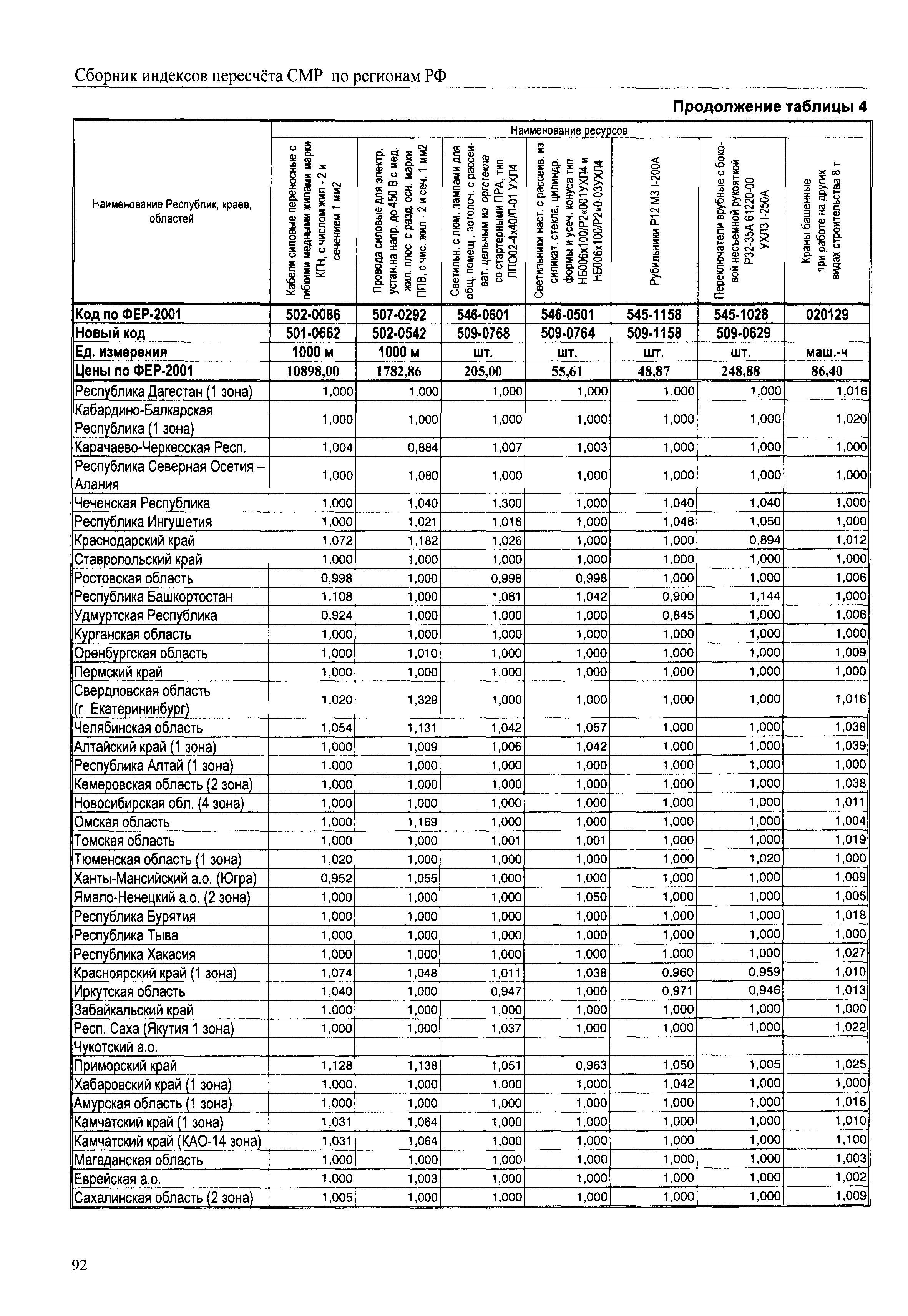 Межрегиональный сборник индексов пересчета сметной стоимости строительно-монтажных работ по субъектам Российской Федерации на I квартал 2010 г.| Статус: | не действует | | Название рус.: | Межрегиональный сборник индексов пересчета сметной стоимости строительно-монтажных работ по субъектам Российской Федерации на I квартал 2010 г. | | Дата добавления в базу: | 01.09.2013 | | Дата актуализации: | 01.09.2013 | | Область применения: | В сборнике приведены сводные таблицы текущих (I квартал 2010 г.) региональных цен на основные ресурсы, применяемые в строительстве, региональные индексы пересчета базисной стоимости строительно-монтажных работ, определяемой с использованием сборников новой сметно-нормативной базы (ФЕР-2001, ТЕР-2001), в территориальный текущий уровень. Индексы разработаны по единой методике, на основании отчетных данных региональных органов по ценообразованию в строительстве о стоимости строительных ресурсов, применяемых в регионе. | | Оглавление: | Общая часть Техническая часть (к таблицам 1, 2, 3, 4) Цены на строительную продукцию в I квартале 2010 г. Анализ роста индексов и стоимости 1 м2 по субъектам Российской Федерации в I квартале 2010 г. – таблица А Расчетная стоимость 1 м2 общей площади квартир и индексы изменения стоимости строительства по субъектам Российской Федерации за I квартал 2010 г. – Таблица 1 Сметная стоимость строительных ресурсов (без НДС) в руб. - Таблица 2 Индексы на отдельные виды ресурсов (к заложенным в ФЕР-2001) - Таблица 3 Индексы роста стоимости строительных ресурсов к предыдущему кварталу - Таблица 4 Региональные индексы к ФЕР-2001 по основным видам объектов строительства - Таблица 5 Индексы на оборудование за I квартал 2010 г. Индексы на прочие работы и затраты за I квартал 2010 г. |
