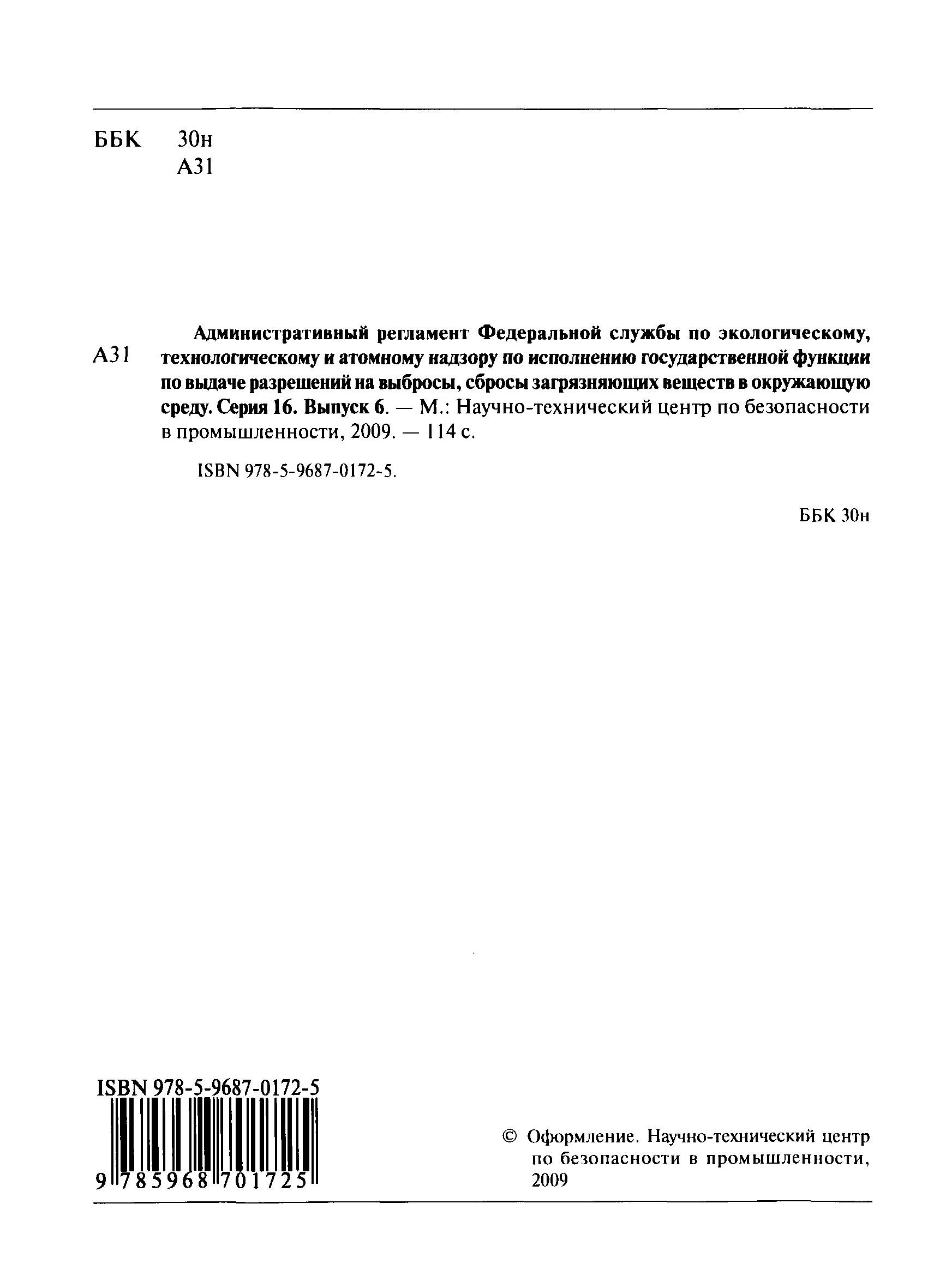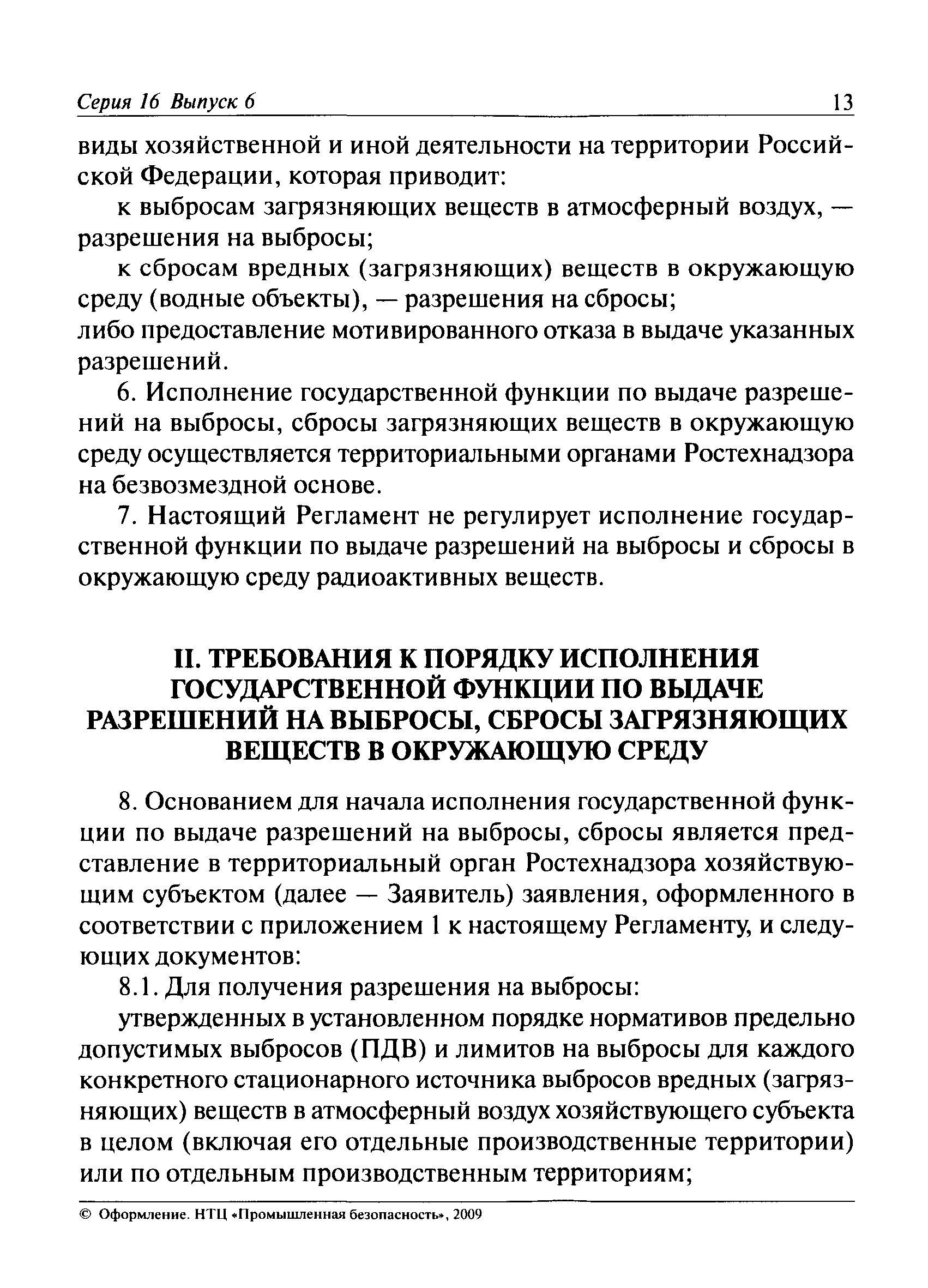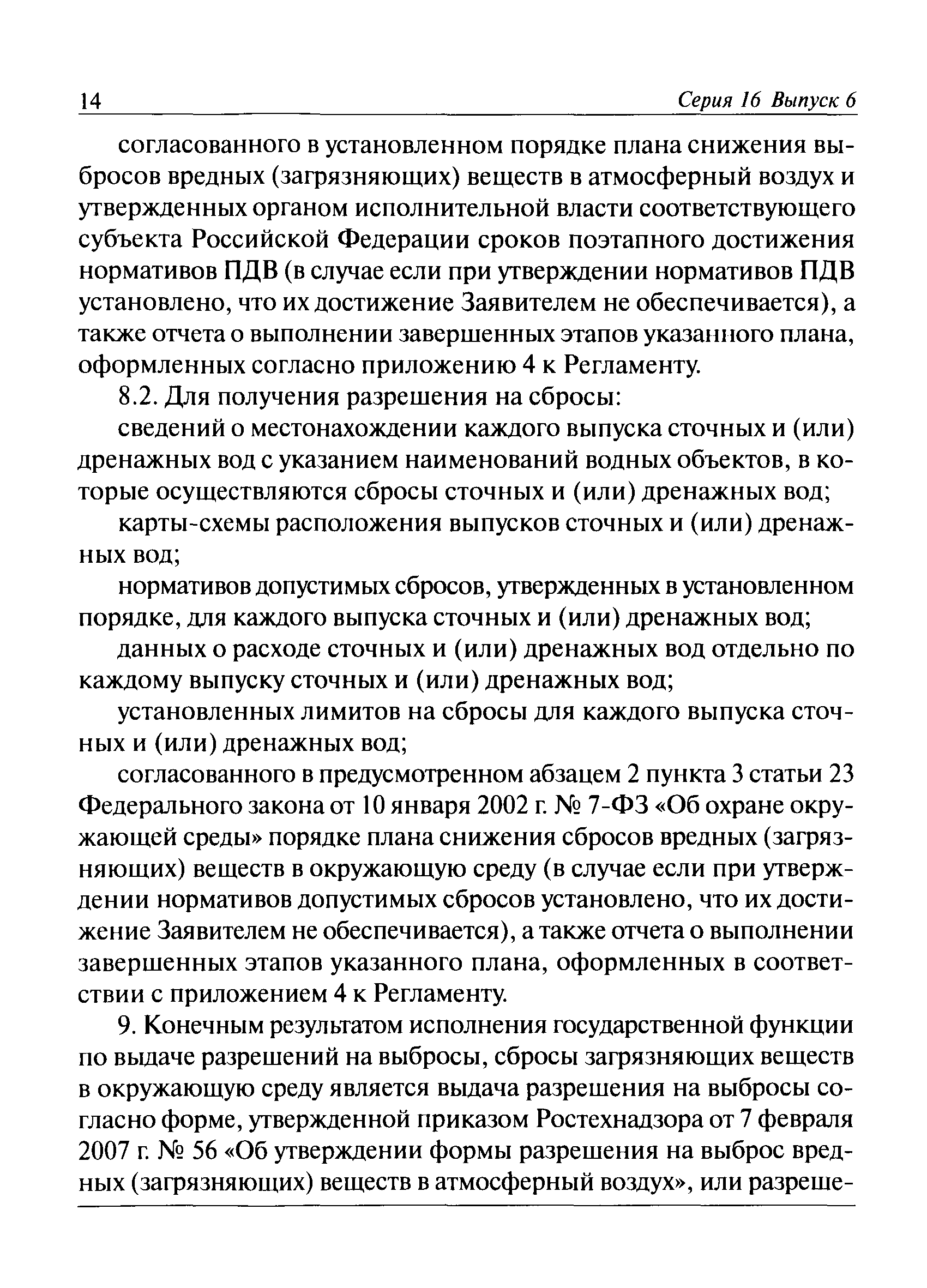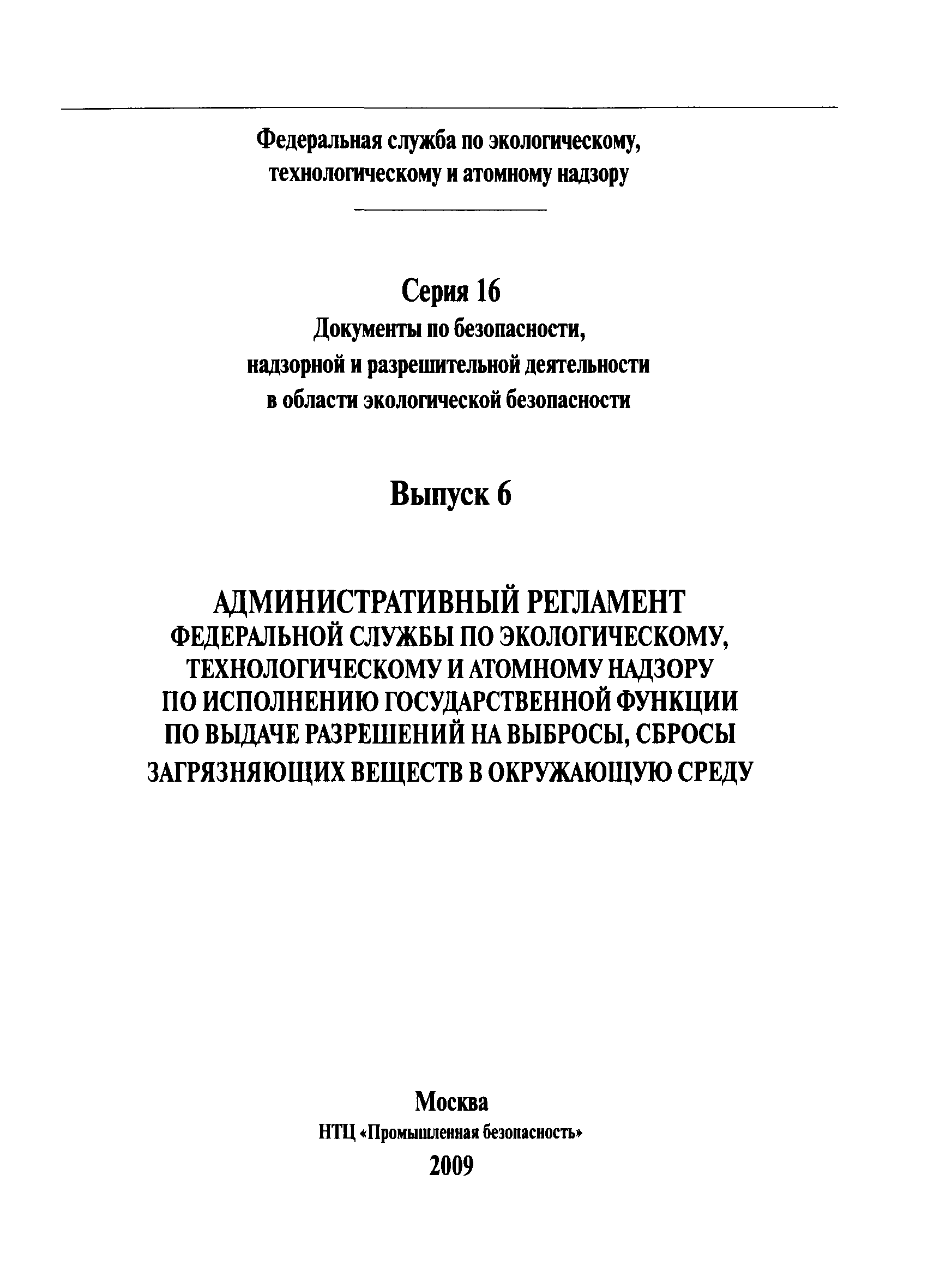 | Название рус.: | Административный регламент Федеральной службы по экологическому, технологическому и атомному надзору по исполнению государственной функции по выдаче разрешений на выбросы, сбросы загрязняющих веществ в окружающую среду |