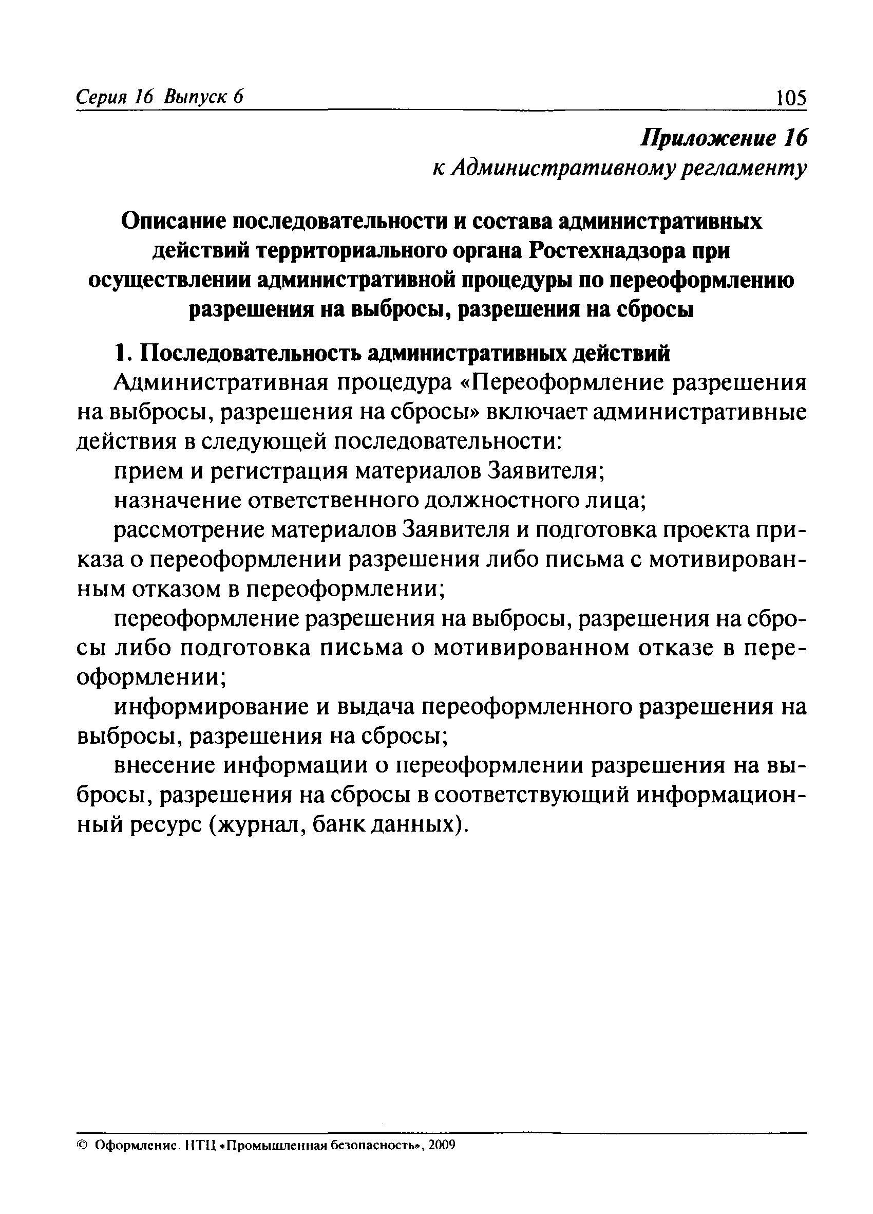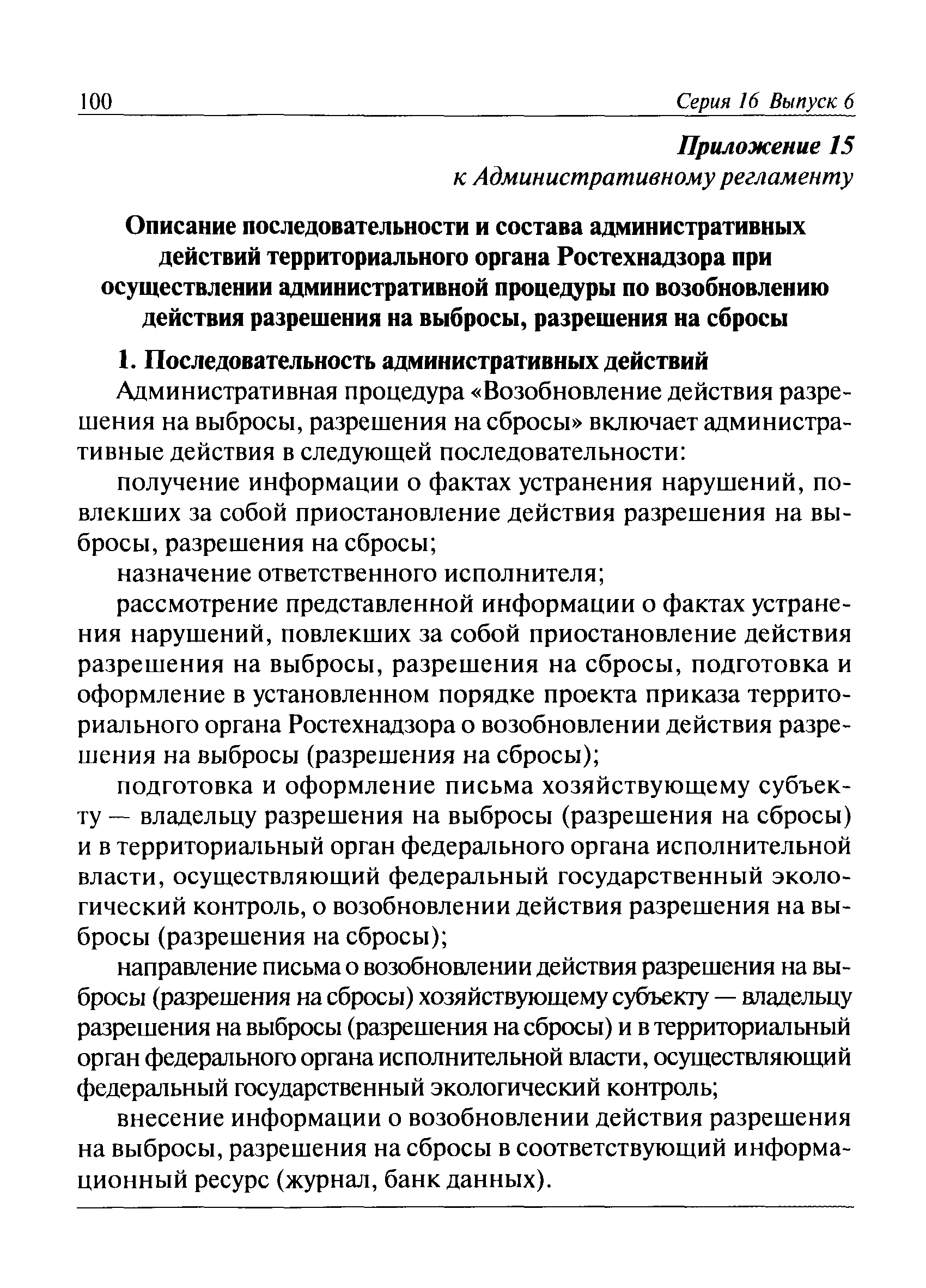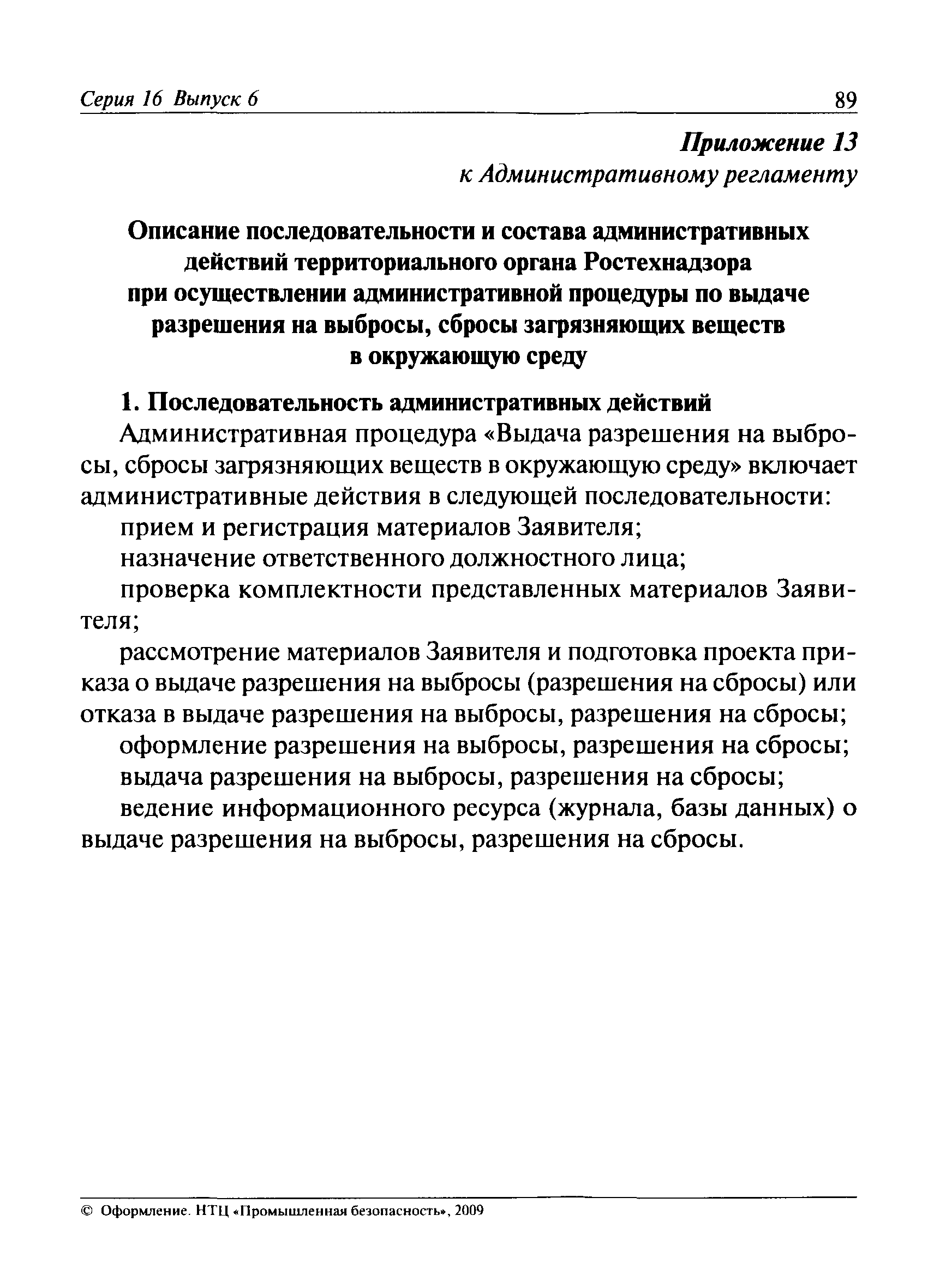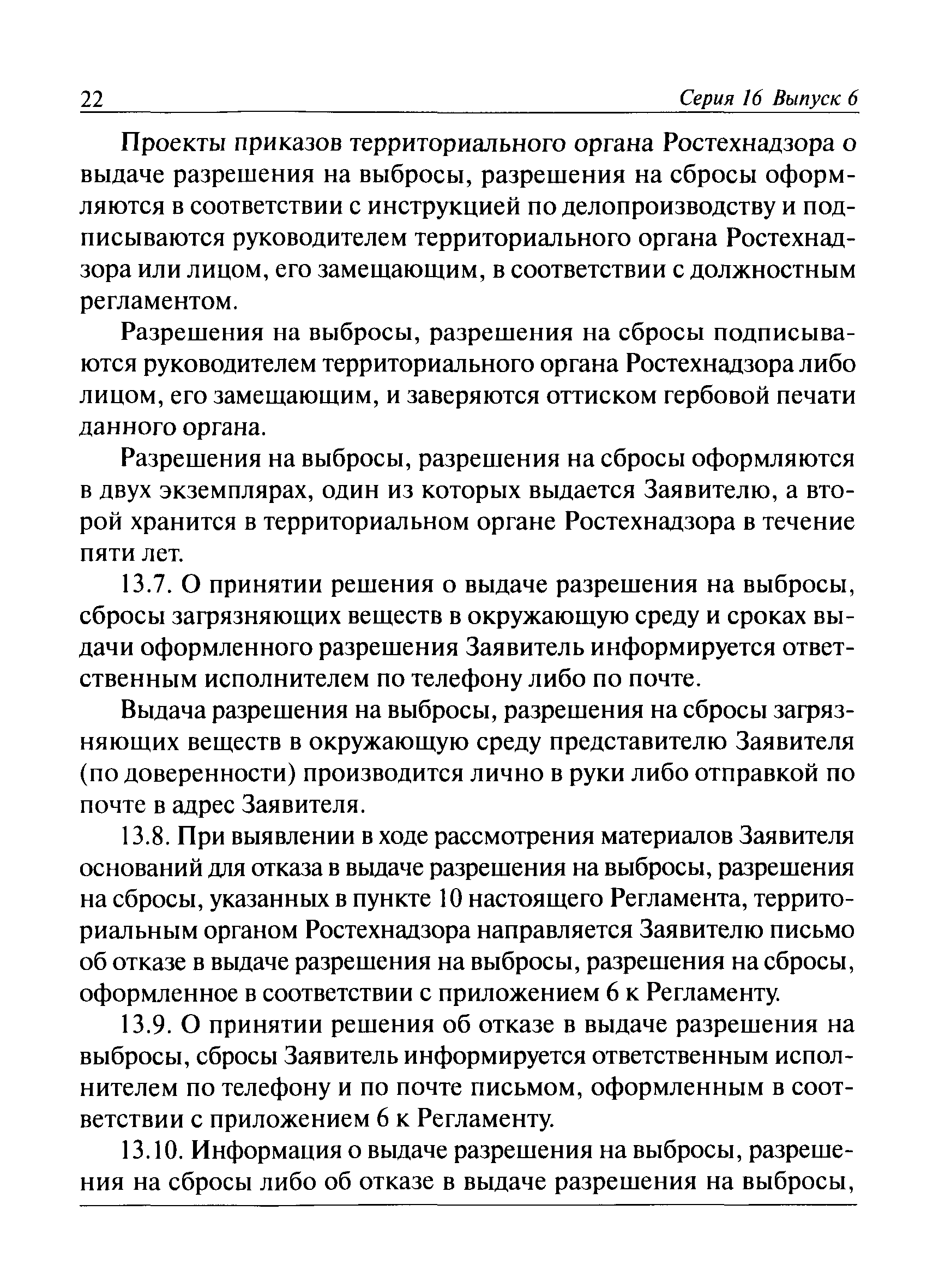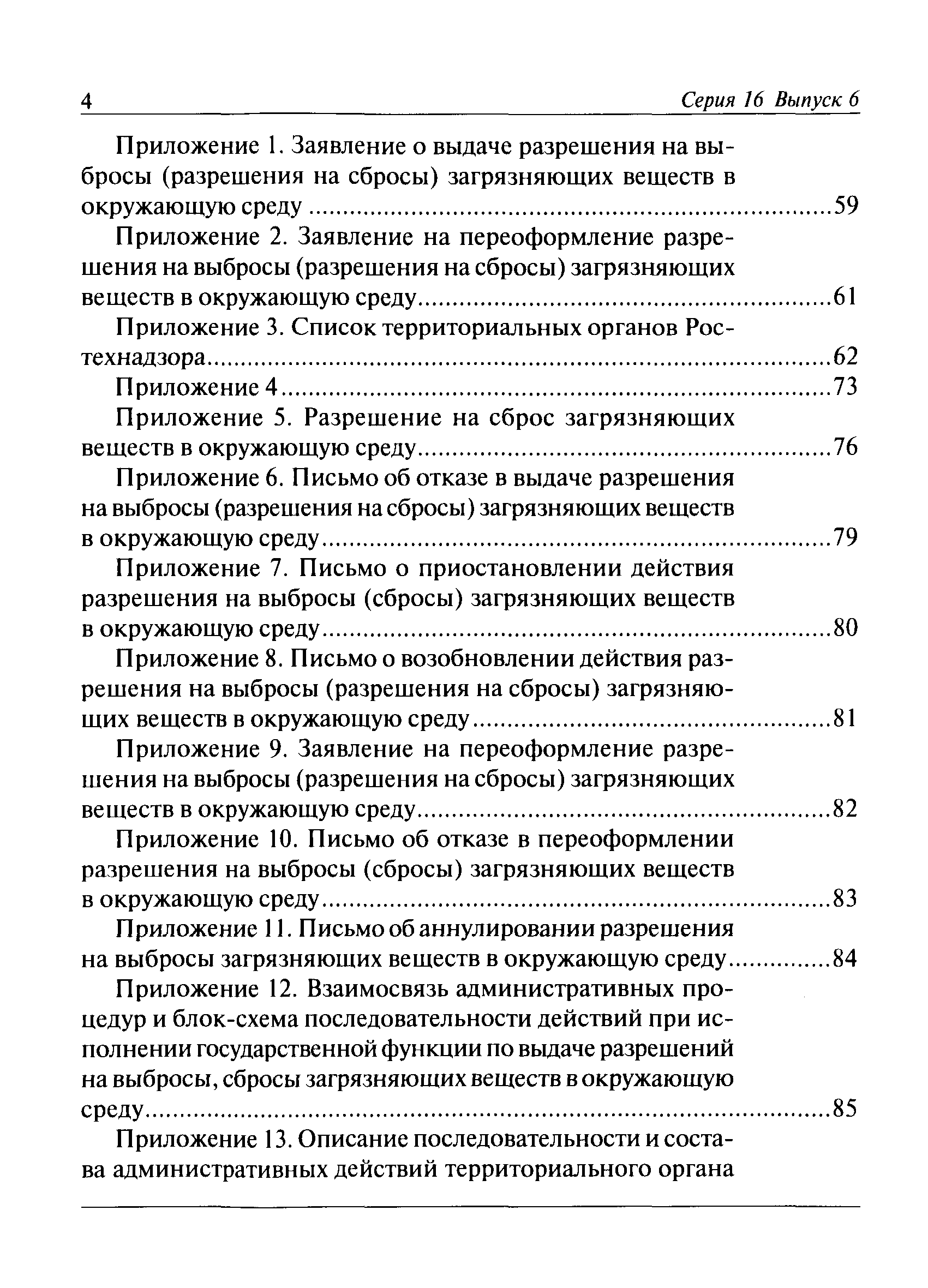 | Оглавление: | Приказ об утверждении 1. Общие положения 2. Требования к порядку исполнения государственной функции по выдаче разрешений на выбросы, сбросы загрязняющих веществ в окружающую среду 3. Административные процедуры 4. Порядок и формы контроля за исполнением государственной функции по выдаче разрешений на выбросы, сбросы загрязняющих веществ 5. Обжалование действий (бездействия) должностных лиц в ходе выполнения административных процедур при исполнении государственной функции по выдаче разрешений на выбросы, сбросы загрязняющих веществ Приложение 1. Заявление о выдаче разрешения на выбросы (разрешения на сбросы) загрязняющих веществ в окружающую среду Приложение 2. Заявление на переоформление разрешения на выбросы (разрешения на сбросы) загрязняющих веществ в окружающую среду Приложение 3. Список территориальных органов Ростехнадзора Приложение 4. План снижения выбросов загрязняющих веществ в атмосферный воздух Приложение 5. Разрешение на сброс загрязняющих веществ в окружающую среду Приложение 6. Письмо об отказе в выдаче разрешения на выбросы (разрешения на сбросы) загрязняющих веществ в окружающую среду Приложение 7. Письмо о приостановлении действия разрешения на выбросы (сбросы) загрязняющих веществ в окружающую среду Приложение 8. Письмо о возобновлении действия разрешения на выбросы (разрешения на сбросы) загрязняющих веществ в окружающую среду Приложение 9. Заявление на переоформление разрешения на выбросы (разрешения на сбросы) загрязняющих веществ в окружающую среду Приложение 10. Письмо об отказе в переоформлении разрешения на выбросы (сбросы) загрязняющих веществ в окружающую среду Приложение 11. Письмо об аннулировании разрешения на выбросы загрязняющих веществ в окружающую среду Приложение 12. Взаимосвязь административных процедур и блок-схема последовательности действий при исполнении государственной функции по выдаче разрешений на выбросы, сбросы загрязняющих веществ в окружающую среду Приложение 13. Описание последовательности и состава административных действий территориального органа Ростехнадзора при осуществлении административной процедуры по выдаче разрешения на выбросы, сбросы загрязняющих веществ в окружающую среду Приложение 14. Описание последовательности и состава административных действий территориального органа Ростехнадзора при осуществлении административной процедуры по приостановлению действия разрешения на выбросы, разрешения на сбросы Приложение 15. Описание последовательности и состава административных действий территориального органа Ростехнадзора при осуществлении административной процедуры по возобновлению действия разрешения на выбросы, разрешения на сбросы Приложение 16. Описание последовательности и состава административных действий территориального органа Ростехнадзора при осуществлении административной процедуры по переоформлению разрешения на выбросы, разрешения на сбросы Приложение 17. Описание последовательности и состава административных действий территориального органа Ростехнадзора при осуществлении административной процедуры по аннулированию разрешения на выбросы |