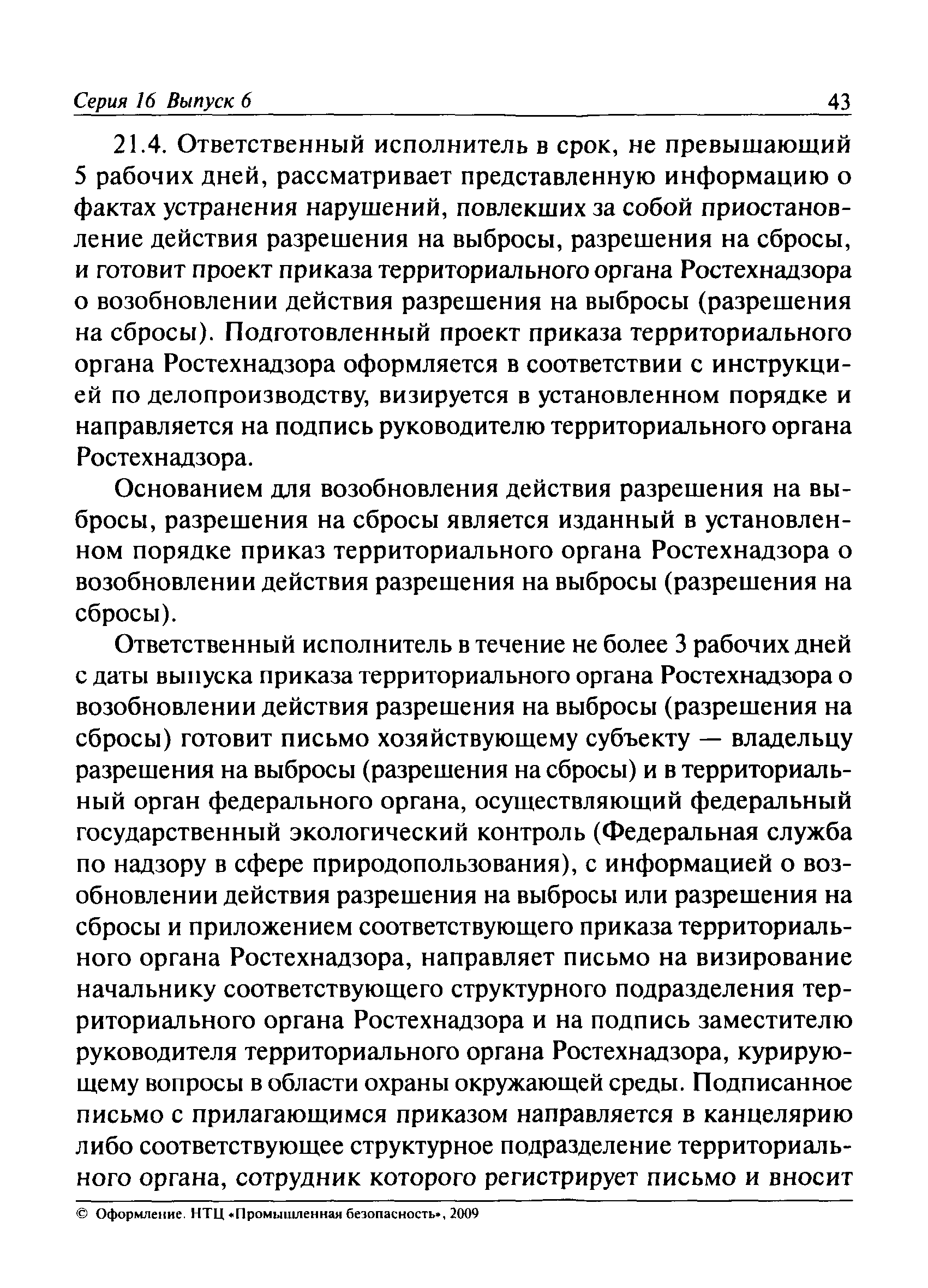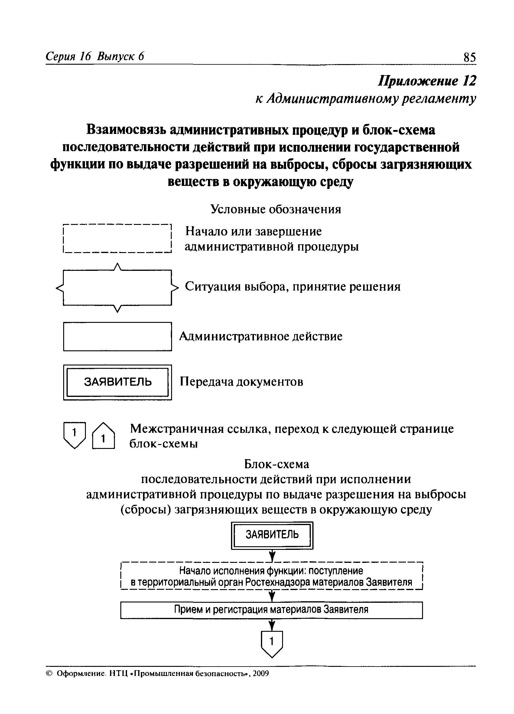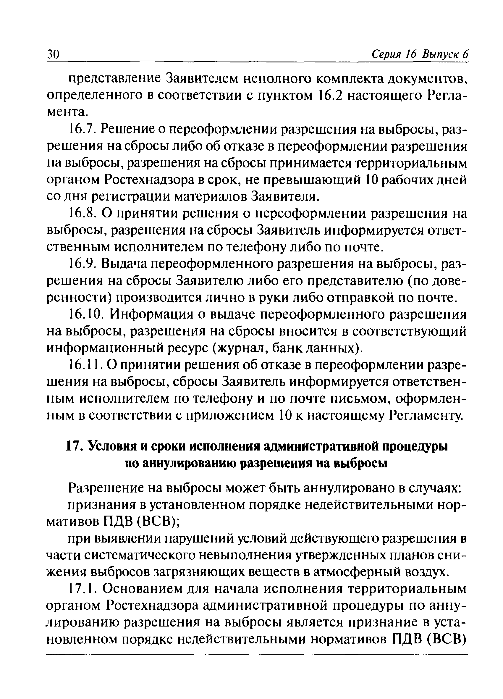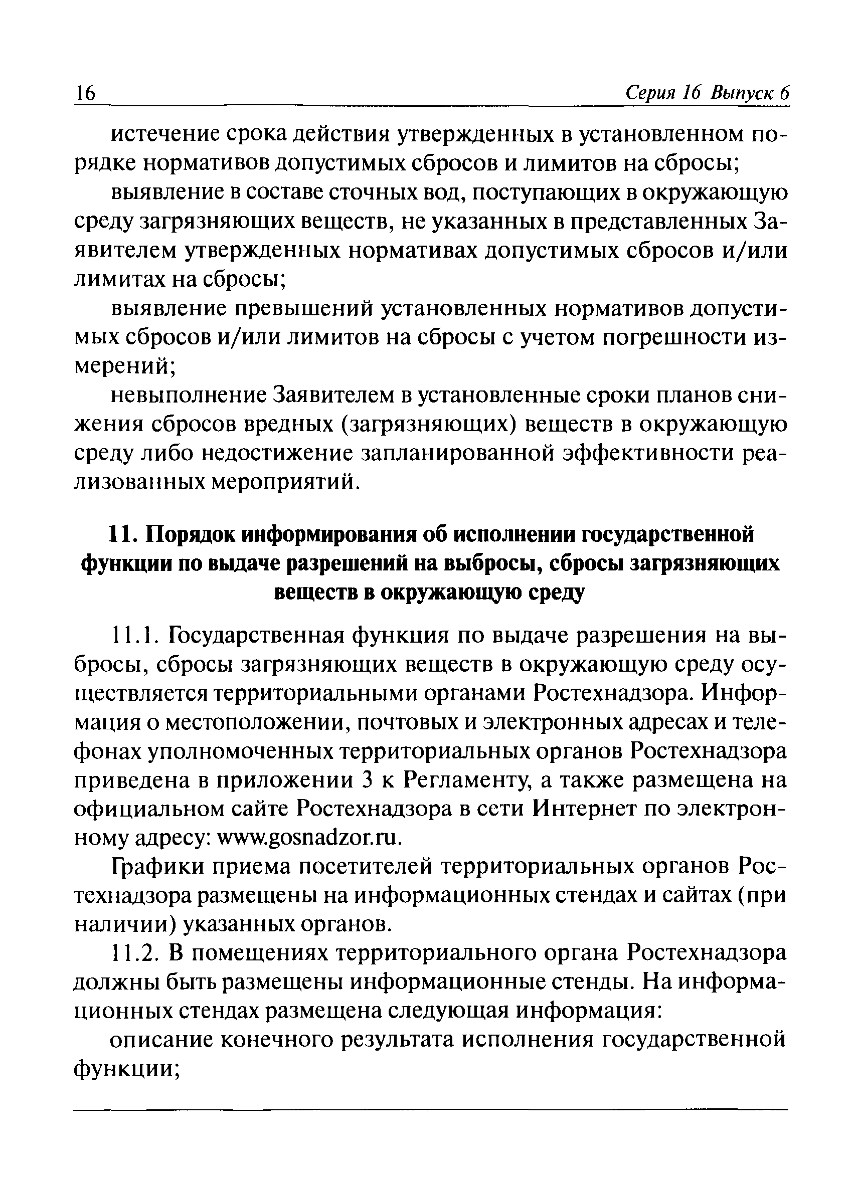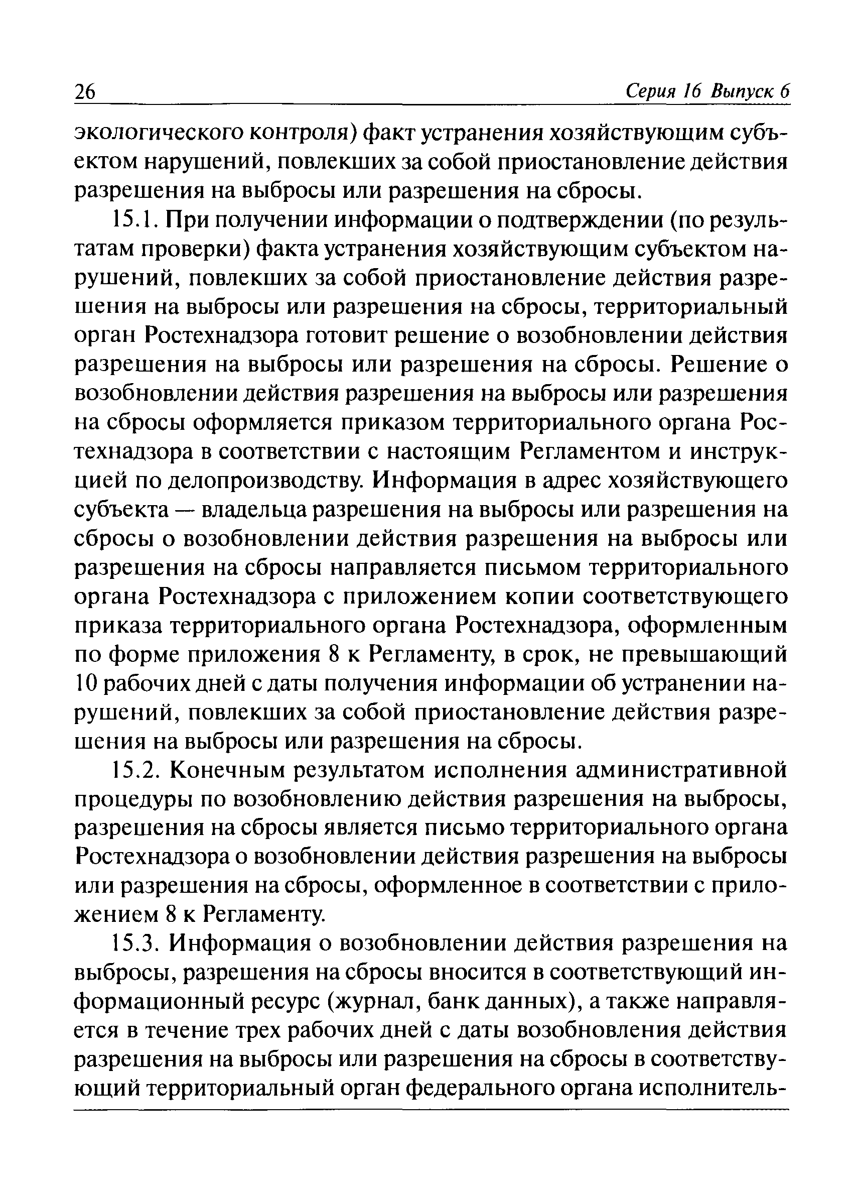 | Оглавление: | Приказ об утверждении 1. Общие положения 2. Требования к порядку исполнения государственной функции по выдаче разрешений на выбросы, сбросы загрязняющих веществ в окружающую среду 3. Административные процедуры 4. Порядок и формы контроля за исполнением государственной функции по выдаче разрешений на выбросы, сбросы загрязняющих веществ 5. Обжалование действий (бездействия) должностных лиц в ходе выполнения административных процедур при исполнении государственной функции по выдаче разрешений на выбросы, сбросы загрязняющих веществ Приложение 1. Заявление о выдаче разрешения на выбросы (разрешения на сбросы) загрязняющих веществ в окружающую среду Приложение 2. Заявление на переоформление разрешения на выбросы (разрешения на сбросы) загрязняющих веществ в окружающую среду Приложение 3. Список территориальных органов Ростехнадзора Приложение 4. План снижения выбросов загрязняющих веществ в атмосферный воздух Приложение 5. Разрешение на сброс загрязняющих веществ в окружающую среду Приложение 6. Письмо об отказе в выдаче разрешения на выбросы (разрешения на сбросы) загрязняющих веществ в окружающую среду Приложение 7. Письмо о приостановлении действия разрешения на выбросы (сбросы) загрязняющих веществ в окружающую среду Приложение 8. Письмо о возобновлении действия разрешения на выбросы (разрешения на сбросы) загрязняющих веществ в окружающую среду Приложение 9. Заявление на переоформление разрешения на выбросы (разрешения на сбросы) загрязняющих веществ в окружающую среду Приложение 10. Письмо об отказе в переоформлении разрешения на выбросы (сбросы) загрязняющих веществ в окружающую среду Приложение 11. Письмо об аннулировании разрешения на выбросы загрязняющих веществ в окружающую среду Приложение 12. Взаимосвязь административных процедур и блок-схема последовательности действий при исполнении государственной функции по выдаче разрешений на выбросы, сбросы загрязняющих веществ в окружающую среду Приложение 13. Описание последовательности и состава административных действий территориального органа Ростехнадзора при осуществлении административной процедуры по выдаче разрешения на выбросы, сбросы загрязняющих веществ в окружающую среду Приложение 14. Описание последовательности и состава административных действий территориального органа Ростехнадзора при осуществлении административной процедуры по приостановлению действия разрешения на выбросы, разрешения на сбросы Приложение 15. Описание последовательности и состава административных действий территориального органа Ростехнадзора при осуществлении административной процедуры по возобновлению действия разрешения на выбросы, разрешения на сбросы Приложение 16. Описание последовательности и состава административных действий территориального органа Ростехнадзора при осуществлении административной процедуры по переоформлению разрешения на выбросы, разрешения на сбросы Приложение 17. Описание последовательности и состава административных действий территориального органа Ростехнадзора при осуществлении административной процедуры по аннулированию разрешения на выбросы |