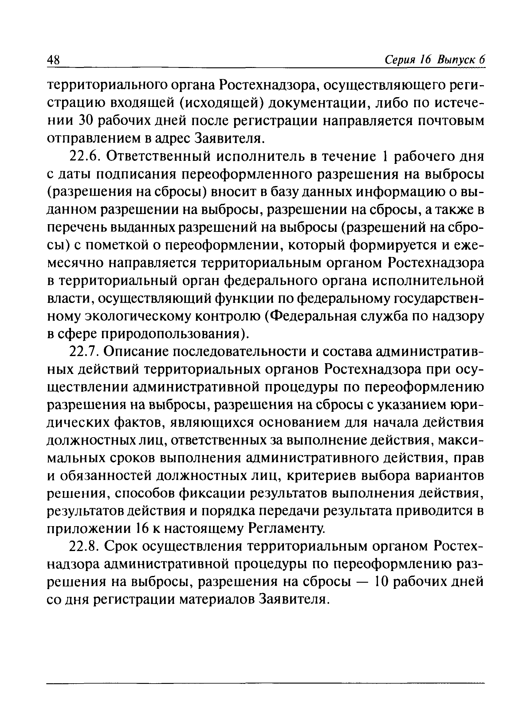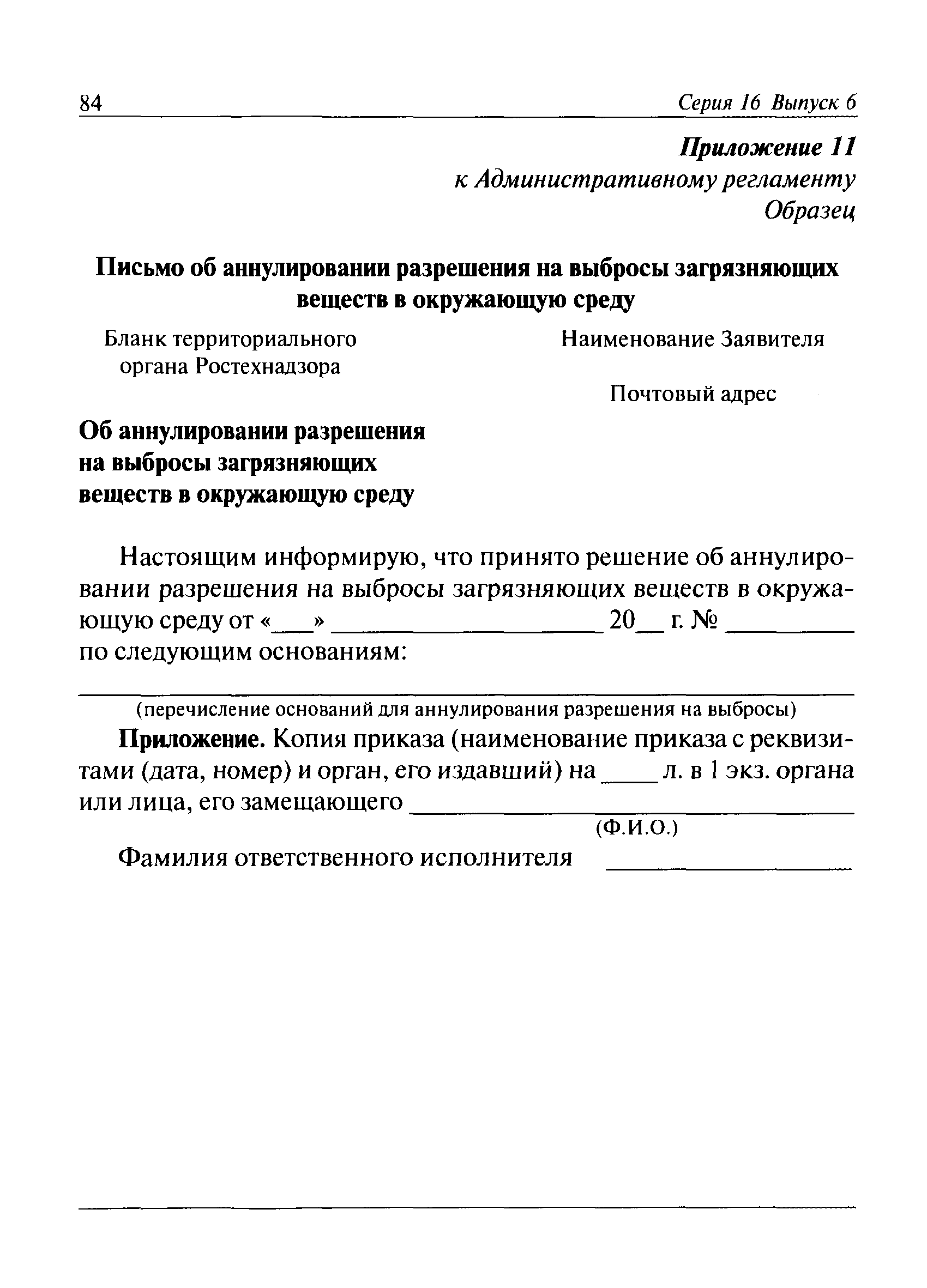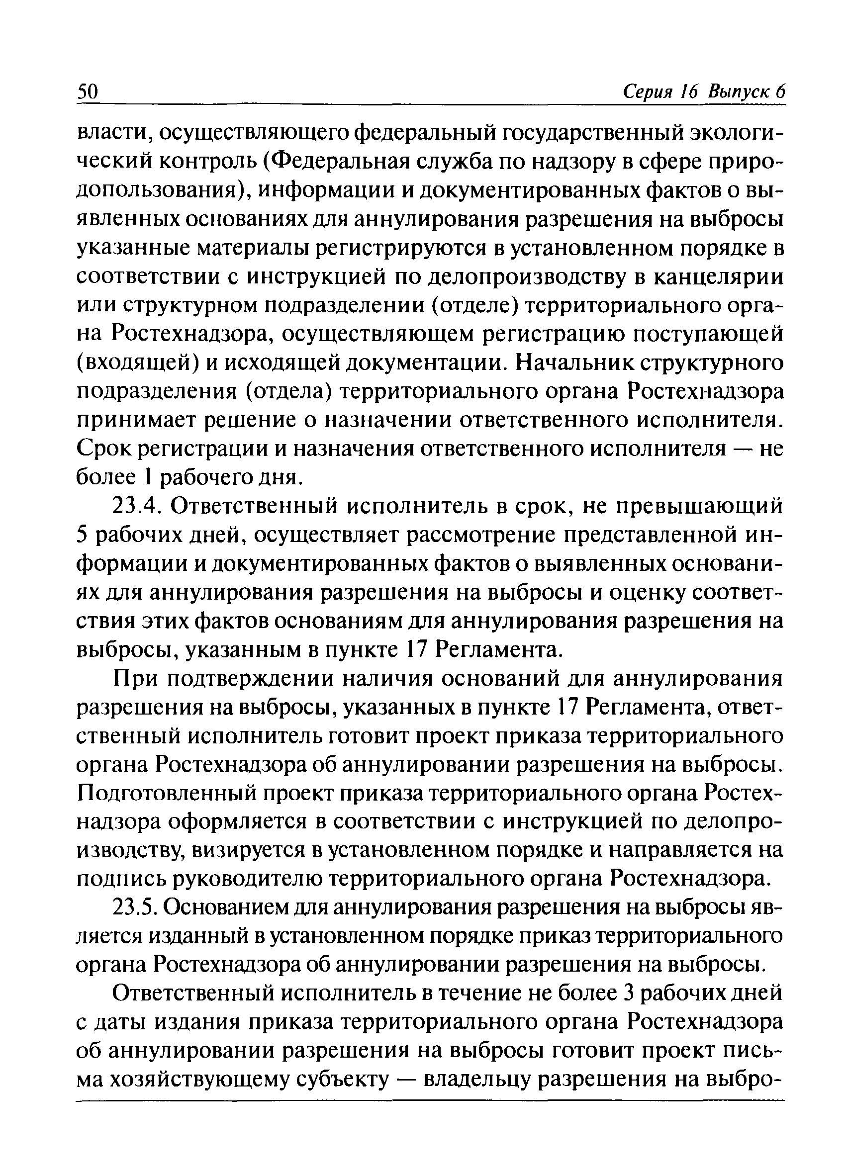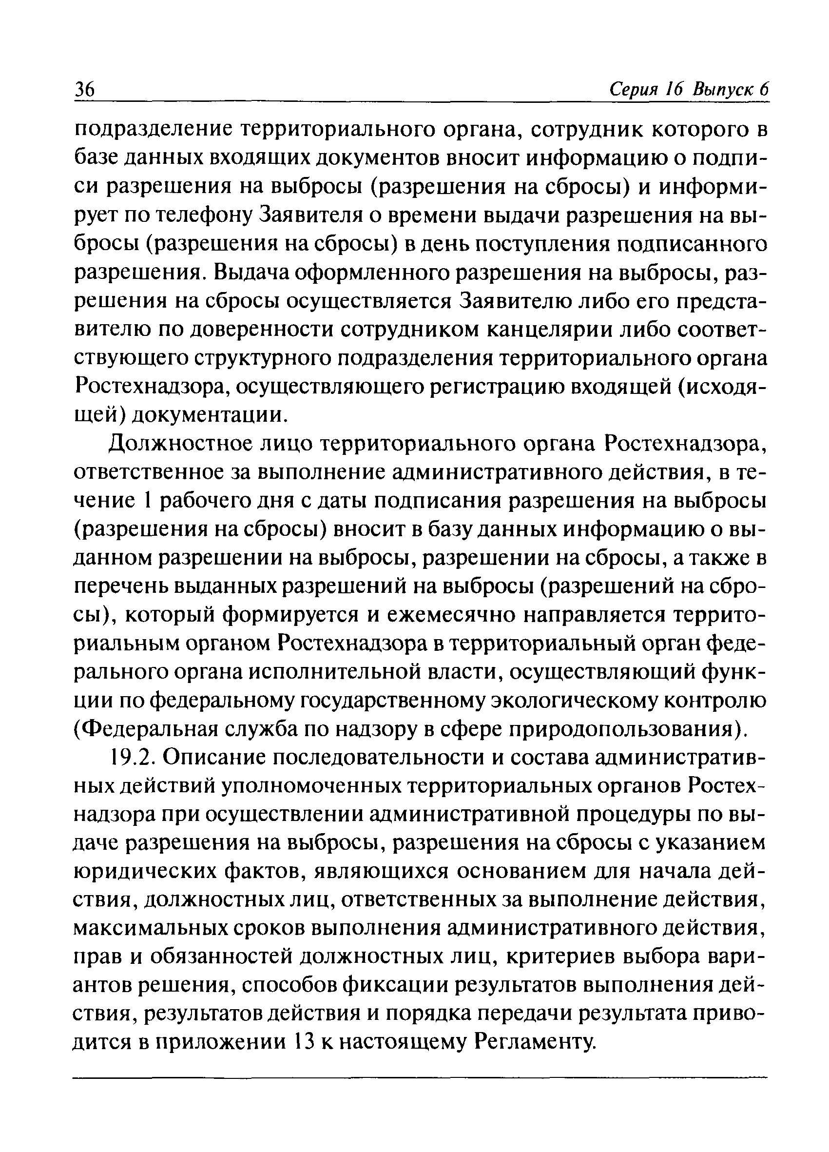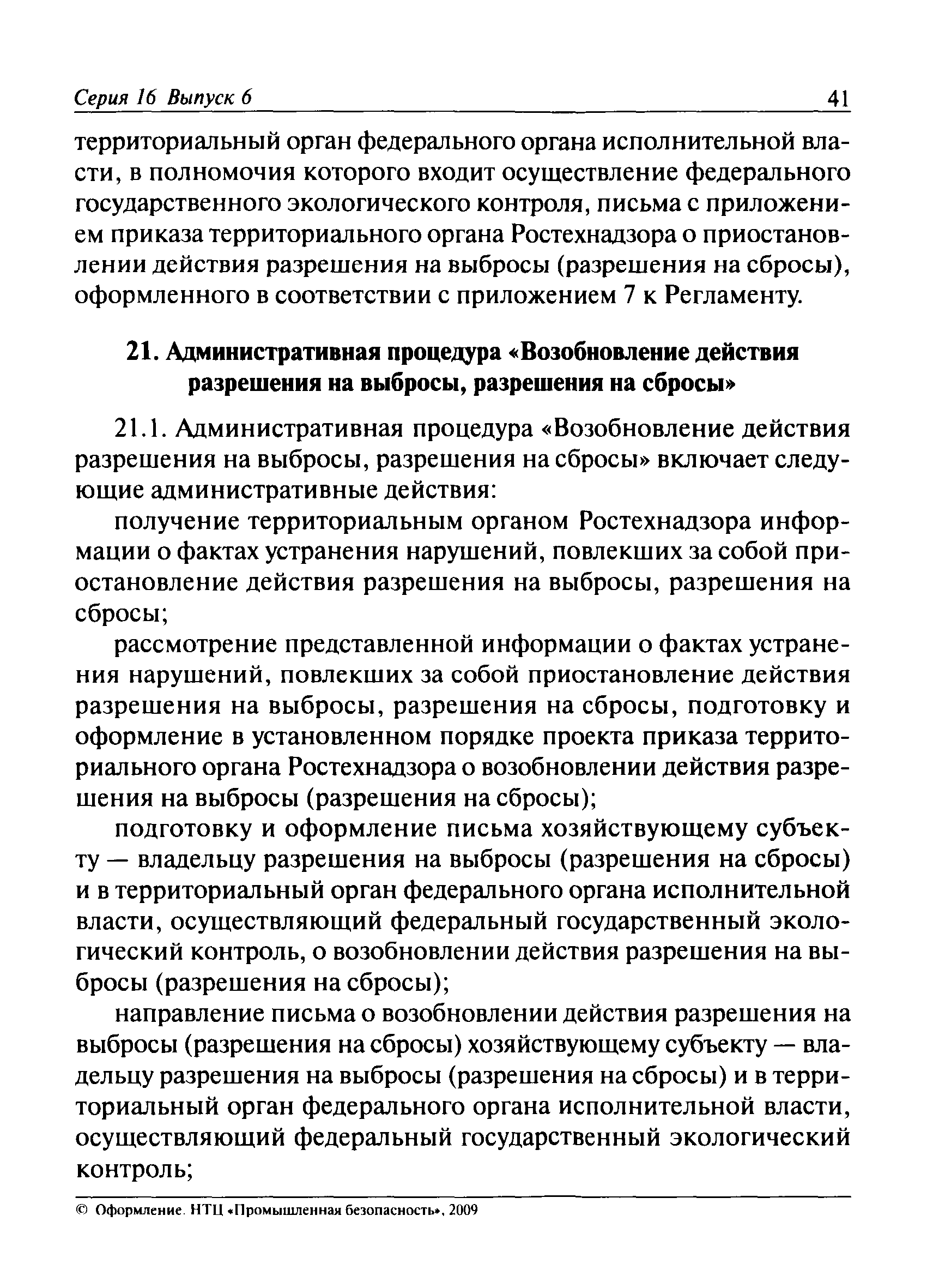 | Оглавление: | Приказ об утверждении 1. Общие положения 2. Требования к порядку исполнения государственной функции по выдаче разрешений на выбросы, сбросы загрязняющих веществ в окружающую среду 3. Административные процедуры 4. Порядок и формы контроля за исполнением государственной функции по выдаче разрешений на выбросы, сбросы загрязняющих веществ 5. Обжалование действий (бездействия) должностных лиц в ходе выполнения административных процедур при исполнении государственной функции по выдаче разрешений на выбросы, сбросы загрязняющих веществ Приложение 1. Заявление о выдаче разрешения на выбросы (разрешения на сбросы) загрязняющих веществ в окружающую среду Приложение 2. Заявление на переоформление разрешения на выбросы (разрешения на сбросы) загрязняющих веществ в окружающую среду Приложение 3. Список территориальных органов Ростехнадзора Приложение 4. План снижения выбросов загрязняющих веществ в атмосферный воздух Приложение 5. Разрешение на сброс загрязняющих веществ в окружающую среду Приложение 6. Письмо об отказе в выдаче разрешения на выбросы (разрешения на сбросы) загрязняющих веществ в окружающую среду Приложение 7. Письмо о приостановлении действия разрешения на выбросы (сбросы) загрязняющих веществ в окружающую среду Приложение 8. Письмо о возобновлении действия разрешения на выбросы (разрешения на сбросы) загрязняющих веществ в окружающую среду Приложение 9. Заявление на переоформление разрешения на выбросы (разрешения на сбросы) загрязняющих веществ в окружающую среду Приложение 10. Письмо об отказе в переоформлении разрешения на выбросы (сбросы) загрязняющих веществ в окружающую среду Приложение 11. Письмо об аннулировании разрешения на выбросы загрязняющих веществ в окружающую среду Приложение 12. Взаимосвязь административных процедур и блок-схема последовательности действий при исполнении государственной функции по выдаче разрешений на выбросы, сбросы загрязняющих веществ в окружающую среду Приложение 13. Описание последовательности и состава административных действий территориального органа Ростехнадзора при осуществлении административной процедуры по выдаче разрешения на выбросы, сбросы загрязняющих веществ в окружающую среду Приложение 14. Описание последовательности и состава административных действий территориального органа Ростехнадзора при осуществлении административной процедуры по приостановлению действия разрешения на выбросы, разрешения на сбросы Приложение 15. Описание последовательности и состава административных действий территориального органа Ростехнадзора при осуществлении административной процедуры по возобновлению действия разрешения на выбросы, разрешения на сбросы Приложение 16. Описание последовательности и состава административных действий территориального органа Ростехнадзора при осуществлении административной процедуры по переоформлению разрешения на выбросы, разрешения на сбросы Приложение 17. Описание последовательности и состава административных действий территориального органа Ростехнадзора при осуществлении административной процедуры по аннулированию разрешения на выбросы |