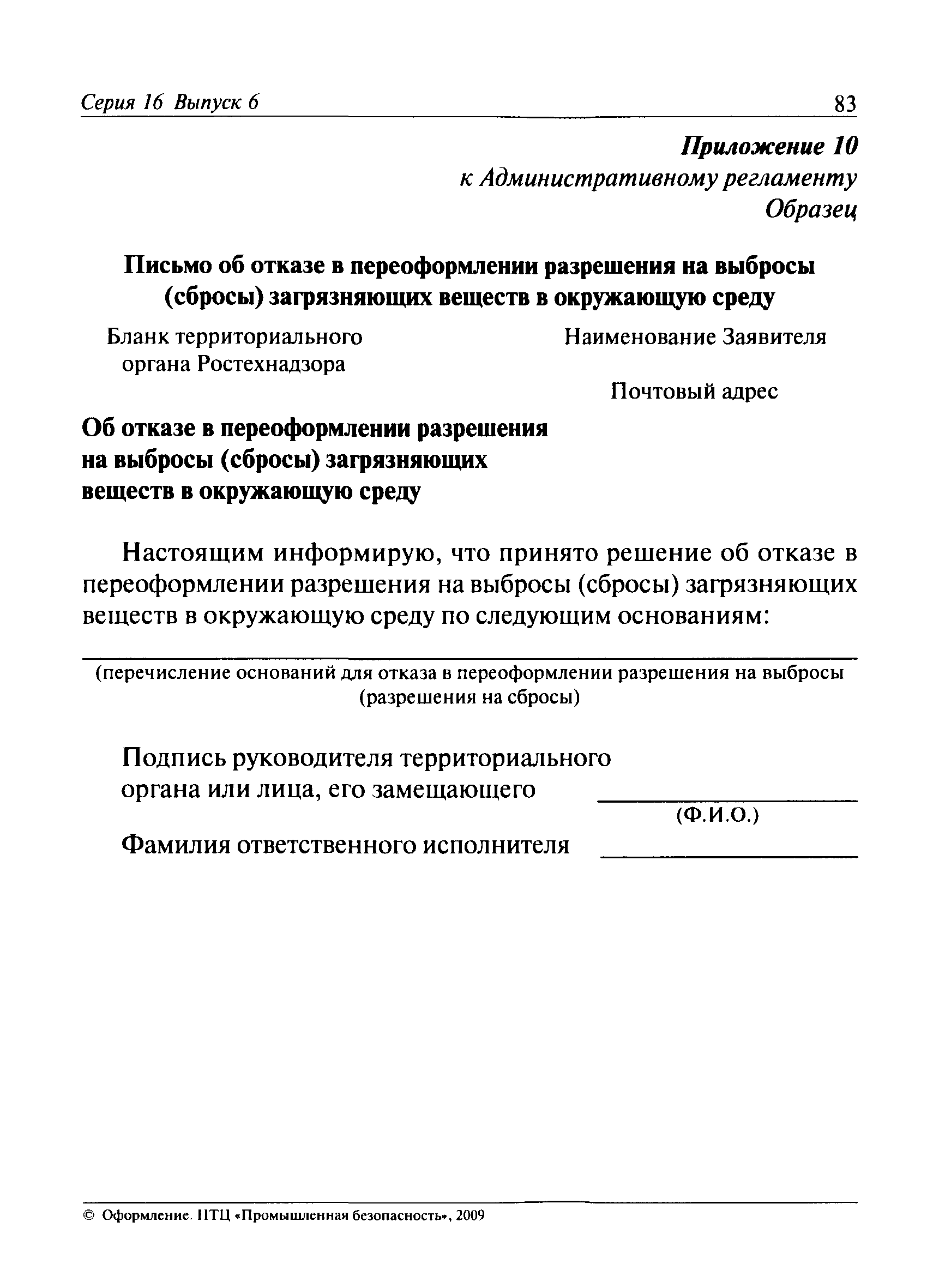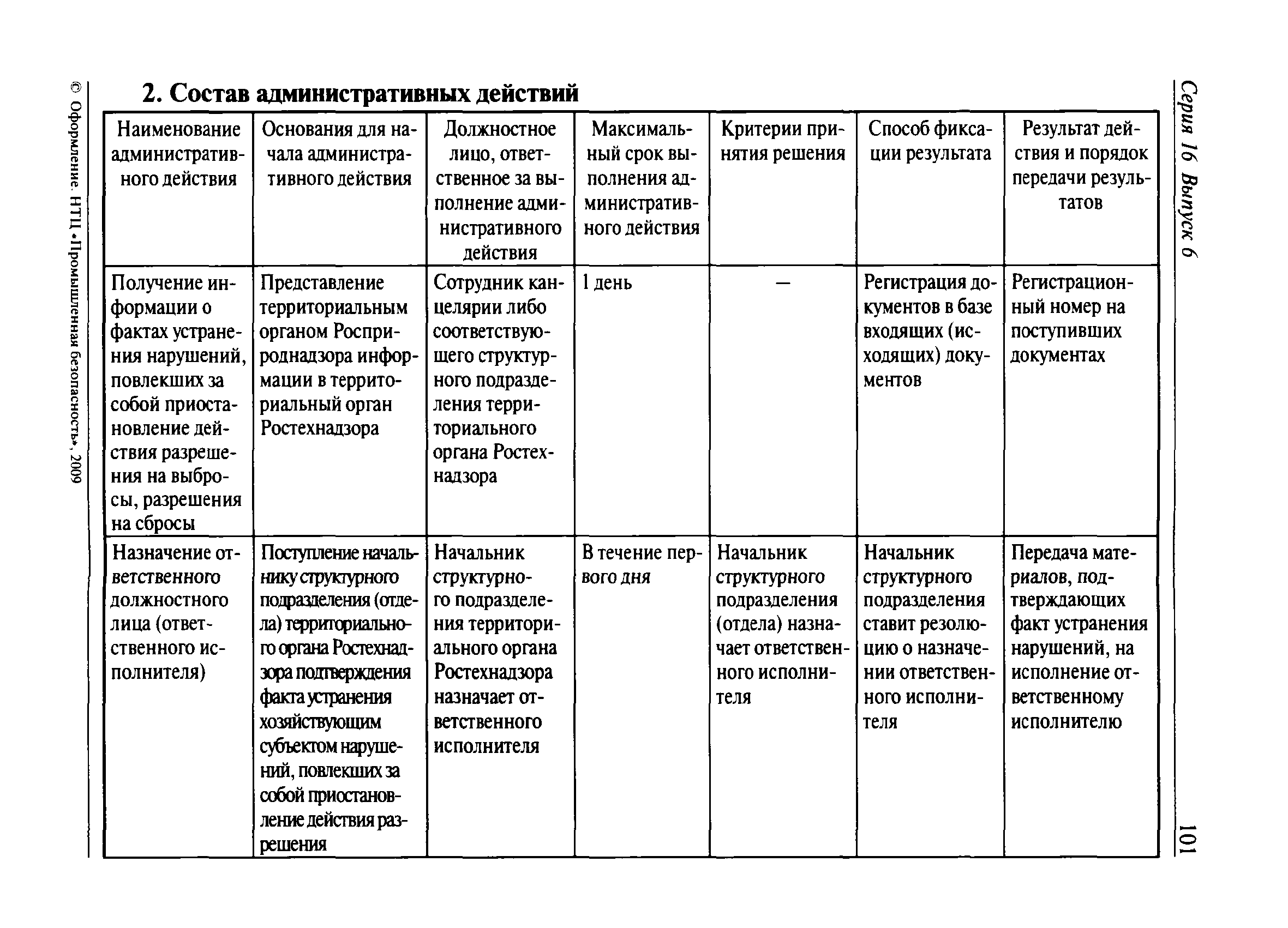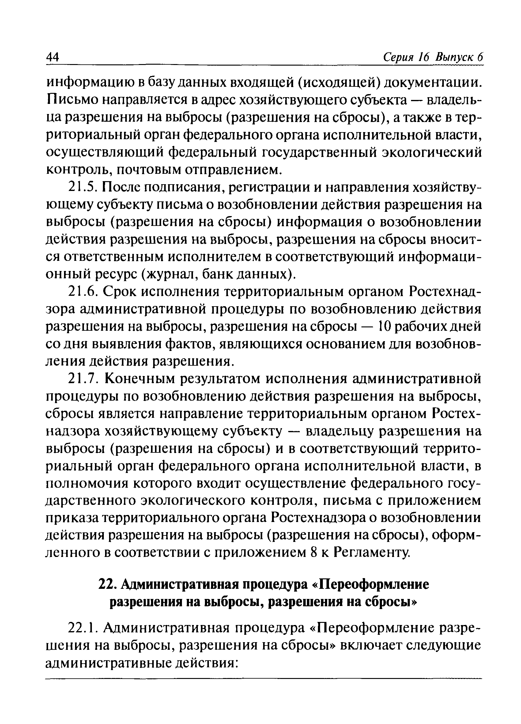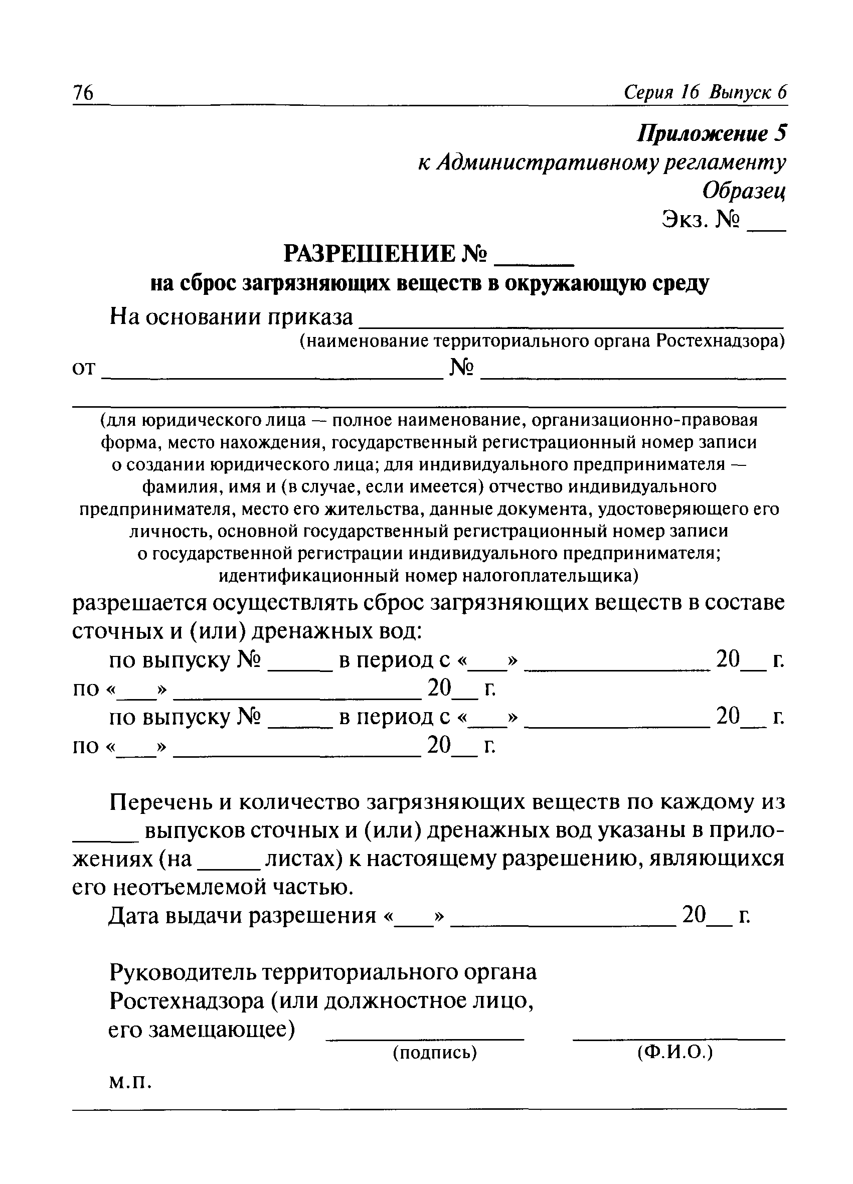 | Оглавление: | Приказ об утверждении 1. Общие положения 2. Требования к порядку исполнения государственной функции по выдаче разрешений на выбросы, сбросы загрязняющих веществ в окружающую среду 3. Административные процедуры 4. Порядок и формы контроля за исполнением государственной функции по выдаче разрешений на выбросы, сбросы загрязняющих веществ 5. Обжалование действий (бездействия) должностных лиц в ходе выполнения административных процедур при исполнении государственной функции по выдаче разрешений на выбросы, сбросы загрязняющих веществ Приложение 1. Заявление о выдаче разрешения на выбросы (разрешения на сбросы) загрязняющих веществ в окружающую среду Приложение 2. Заявление на переоформление разрешения на выбросы (разрешения на сбросы) загрязняющих веществ в окружающую среду Приложение 3. Список территориальных органов Ростехнадзора Приложение 4. План снижения выбросов загрязняющих веществ в атмосферный воздух Приложение 5. Разрешение на сброс загрязняющих веществ в окружающую среду Приложение 6. Письмо об отказе в выдаче разрешения на выбросы (разрешения на сбросы) загрязняющих веществ в окружающую среду Приложение 7. Письмо о приостановлении действия разрешения на выбросы (сбросы) загрязняющих веществ в окружающую среду Приложение 8. Письмо о возобновлении действия разрешения на выбросы (разрешения на сбросы) загрязняющих веществ в окружающую среду Приложение 9. Заявление на переоформление разрешения на выбросы (разрешения на сбросы) загрязняющих веществ в окружающую среду Приложение 10. Письмо об отказе в переоформлении разрешения на выбросы (сбросы) загрязняющих веществ в окружающую среду Приложение 11. Письмо об аннулировании разрешения на выбросы загрязняющих веществ в окружающую среду Приложение 12. Взаимосвязь административных процедур и блок-схема последовательности действий при исполнении государственной функции по выдаче разрешений на выбросы, сбросы загрязняющих веществ в окружающую среду Приложение 13. Описание последовательности и состава административных действий территориального органа Ростехнадзора при осуществлении административной процедуры по выдаче разрешения на выбросы, сбросы загрязняющих веществ в окружающую среду Приложение 14. Описание последовательности и состава административных действий территориального органа Ростехнадзора при осуществлении административной процедуры по приостановлению действия разрешения на выбросы, разрешения на сбросы Приложение 15. Описание последовательности и состава административных действий территориального органа Ростехнадзора при осуществлении административной процедуры по возобновлению действия разрешения на выбросы, разрешения на сбросы Приложение 16. Описание последовательности и состава административных действий территориального органа Ростехнадзора при осуществлении административной процедуры по переоформлению разрешения на выбросы, разрешения на сбросы Приложение 17. Описание последовательности и состава административных действий территориального органа Ростехнадзора при осуществлении административной процедуры по аннулированию разрешения на выбросы |