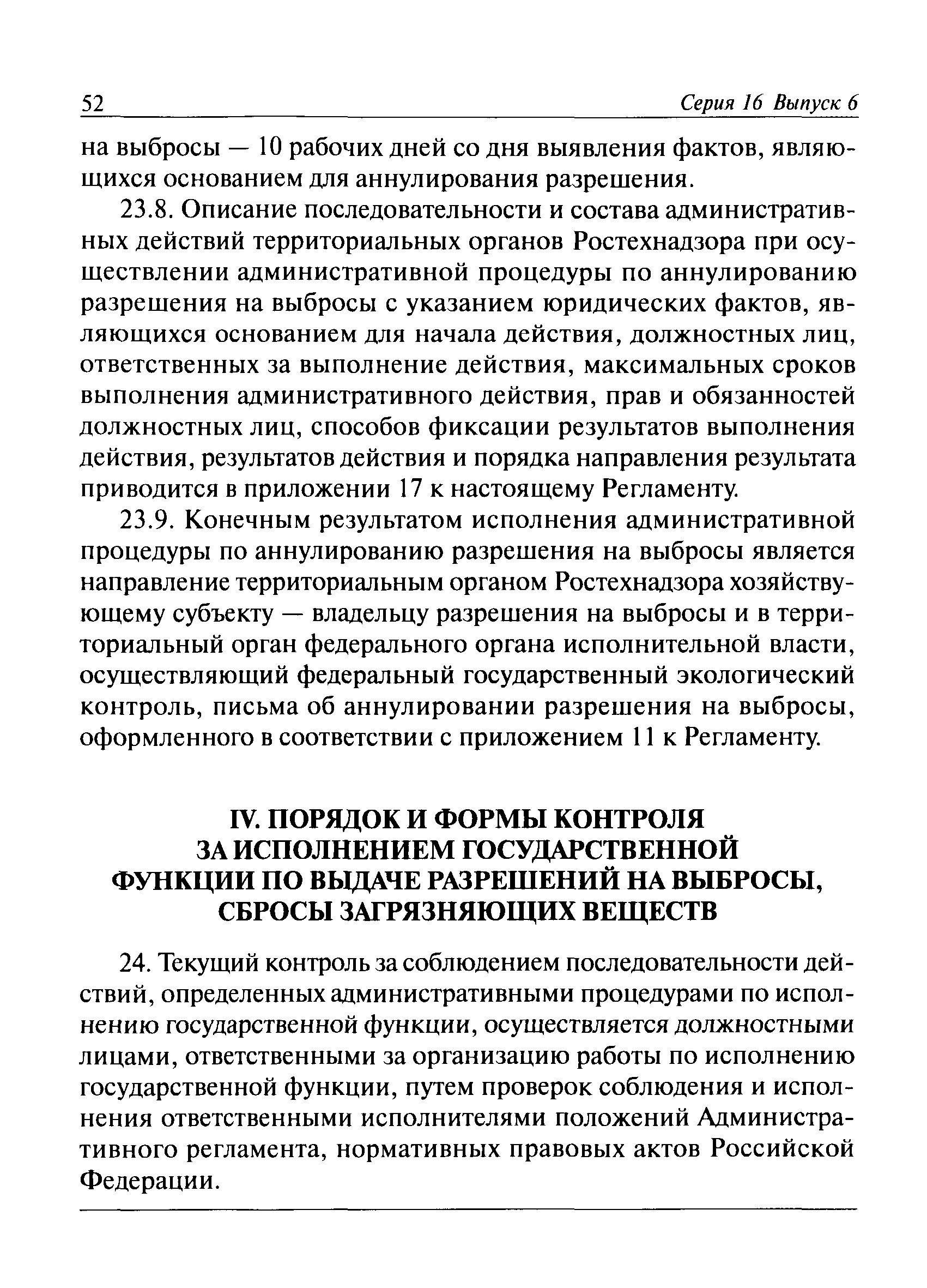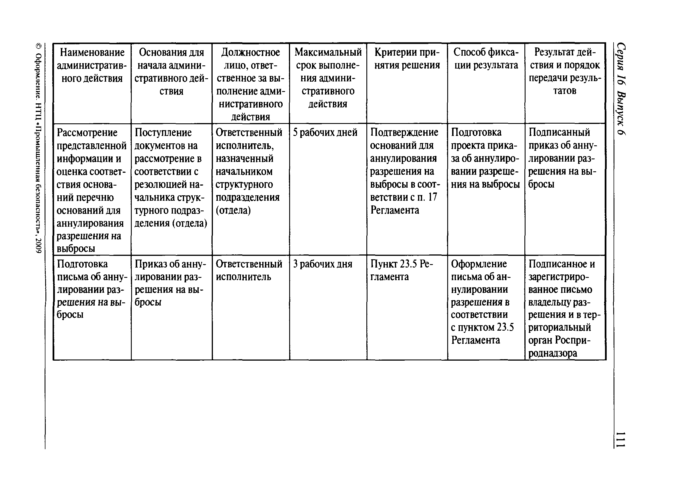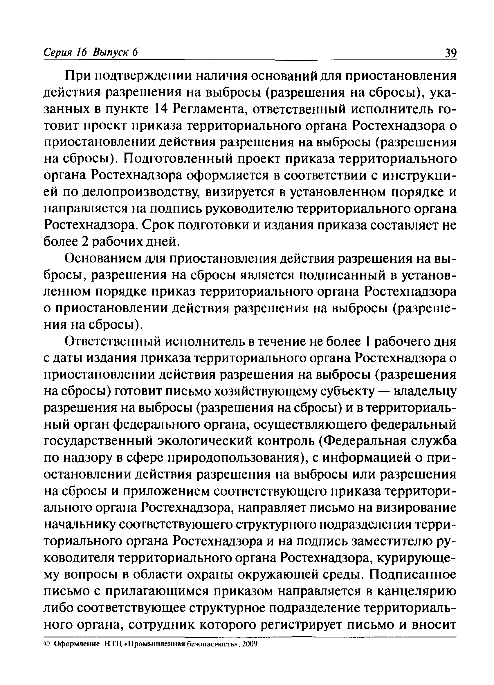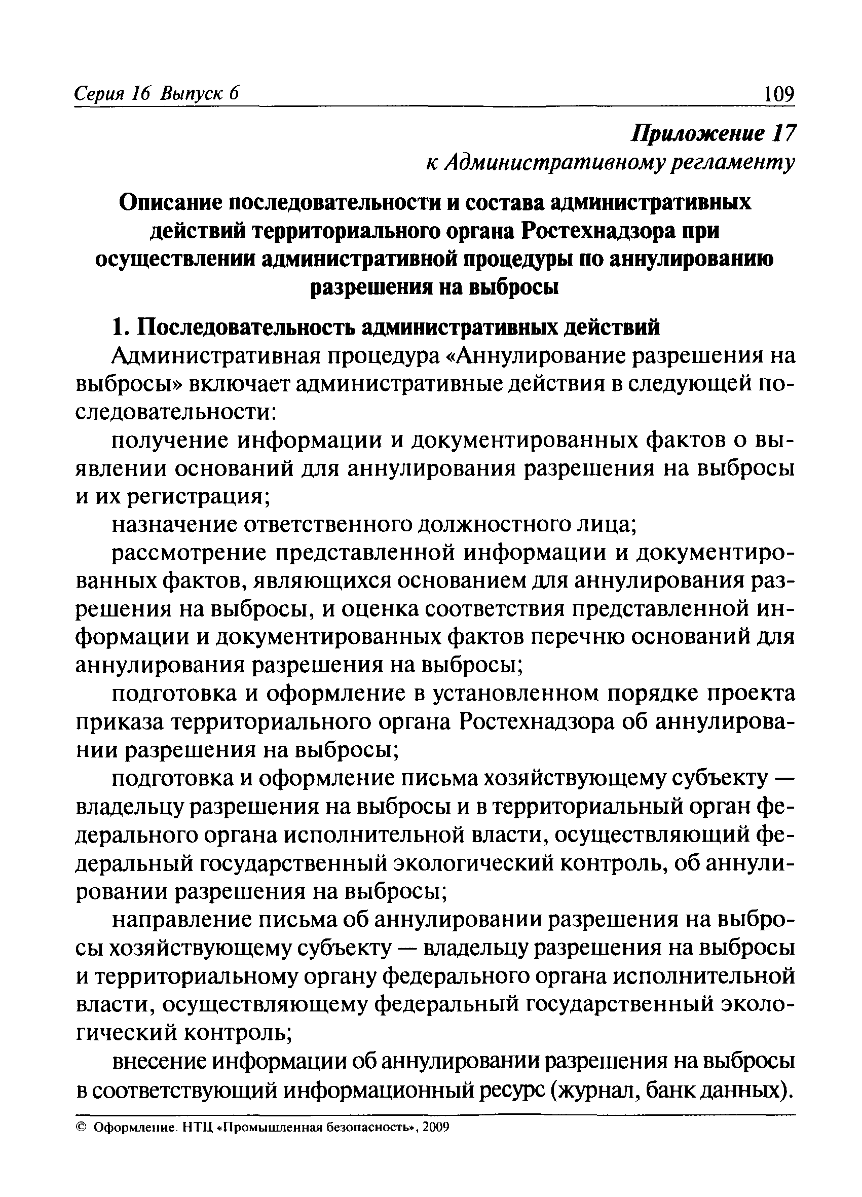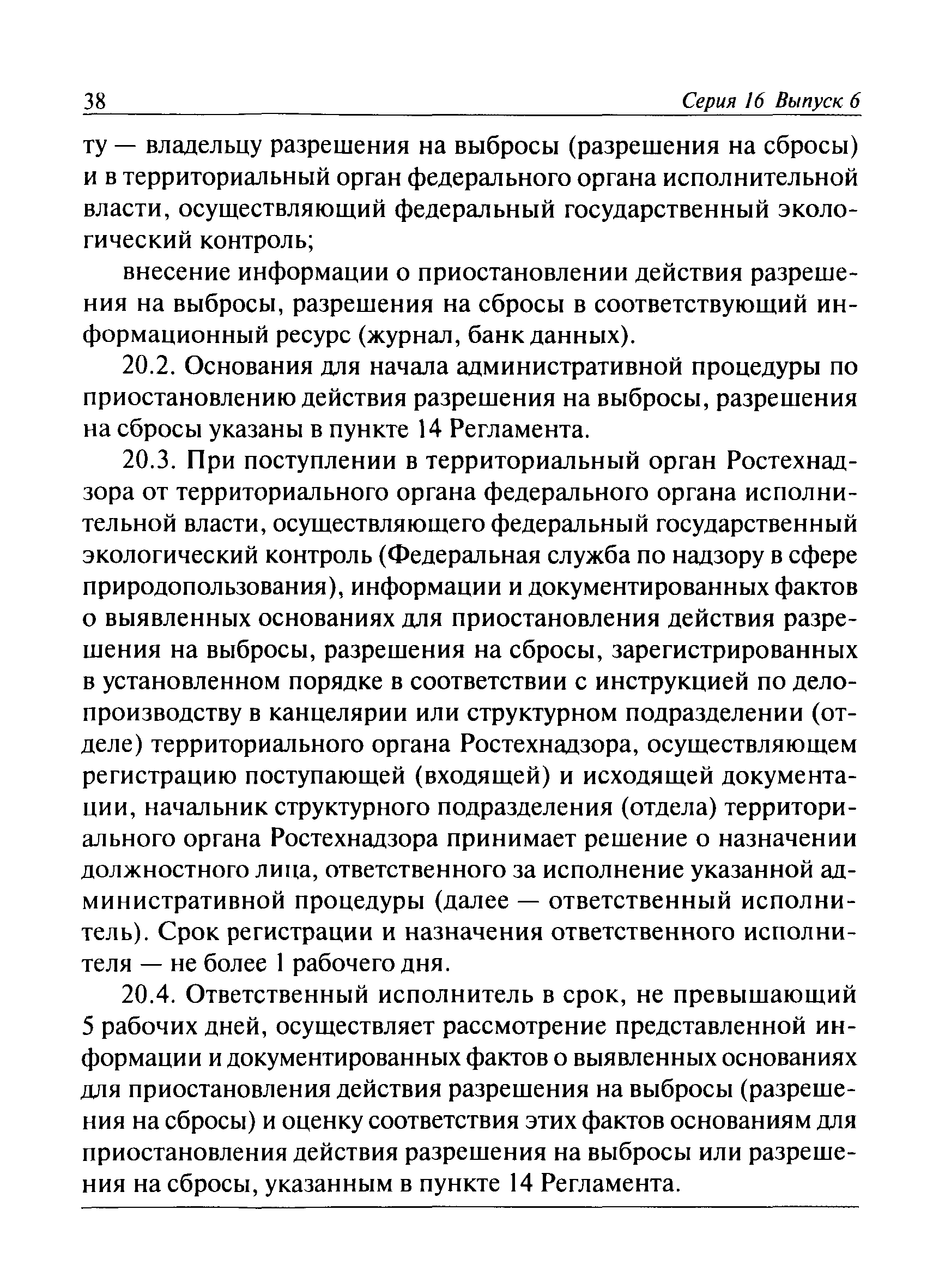 | Оглавление: | Приказ об утверждении 1. Общие положения 2. Требования к порядку исполнения государственной функции по выдаче разрешений на выбросы, сбросы загрязняющих веществ в окружающую среду 3. Административные процедуры 4. Порядок и формы контроля за исполнением государственной функции по выдаче разрешений на выбросы, сбросы загрязняющих веществ 5. Обжалование действий (бездействия) должностных лиц в ходе выполнения административных процедур при исполнении государственной функции по выдаче разрешений на выбросы, сбросы загрязняющих веществ Приложение 1. Заявление о выдаче разрешения на выбросы (разрешения на сбросы) загрязняющих веществ в окружающую среду Приложение 2. Заявление на переоформление разрешения на выбросы (разрешения на сбросы) загрязняющих веществ в окружающую среду Приложение 3. Список территориальных органов Ростехнадзора Приложение 4. План снижения выбросов загрязняющих веществ в атмосферный воздух Приложение 5. Разрешение на сброс загрязняющих веществ в окружающую среду Приложение 6. Письмо об отказе в выдаче разрешения на выбросы (разрешения на сбросы) загрязняющих веществ в окружающую среду Приложение 7. Письмо о приостановлении действия разрешения на выбросы (сбросы) загрязняющих веществ в окружающую среду Приложение 8. Письмо о возобновлении действия разрешения на выбросы (разрешения на сбросы) загрязняющих веществ в окружающую среду Приложение 9. Заявление на переоформление разрешения на выбросы (разрешения на сбросы) загрязняющих веществ в окружающую среду Приложение 10. Письмо об отказе в переоформлении разрешения на выбросы (сбросы) загрязняющих веществ в окружающую среду Приложение 11. Письмо об аннулировании разрешения на выбросы загрязняющих веществ в окружающую среду Приложение 12. Взаимосвязь административных процедур и блок-схема последовательности действий при исполнении государственной функции по выдаче разрешений на выбросы, сбросы загрязняющих веществ в окружающую среду Приложение 13. Описание последовательности и состава административных действий территориального органа Ростехнадзора при осуществлении административной процедуры по выдаче разрешения на выбросы, сбросы загрязняющих веществ в окружающую среду Приложение 14. Описание последовательности и состава административных действий территориального органа Ростехнадзора при осуществлении административной процедуры по приостановлению действия разрешения на выбросы, разрешения на сбросы Приложение 15. Описание последовательности и состава административных действий территориального органа Ростехнадзора при осуществлении административной процедуры по возобновлению действия разрешения на выбросы, разрешения на сбросы Приложение 16. Описание последовательности и состава административных действий территориального органа Ростехнадзора при осуществлении административной процедуры по переоформлению разрешения на выбросы, разрешения на сбросы Приложение 17. Описание последовательности и состава административных действий территориального органа Ростехнадзора при осуществлении административной процедуры по аннулированию разрешения на выбросы |