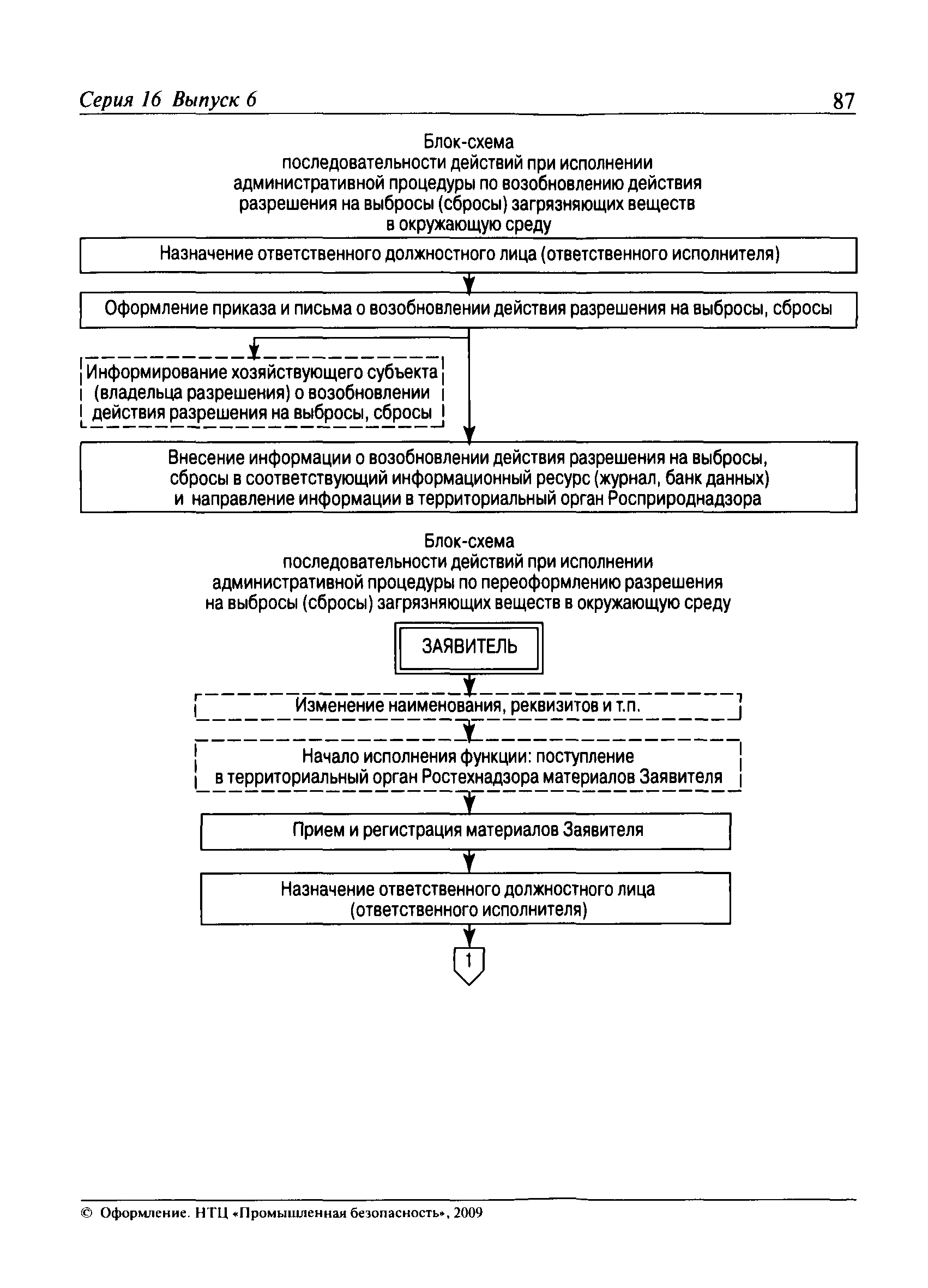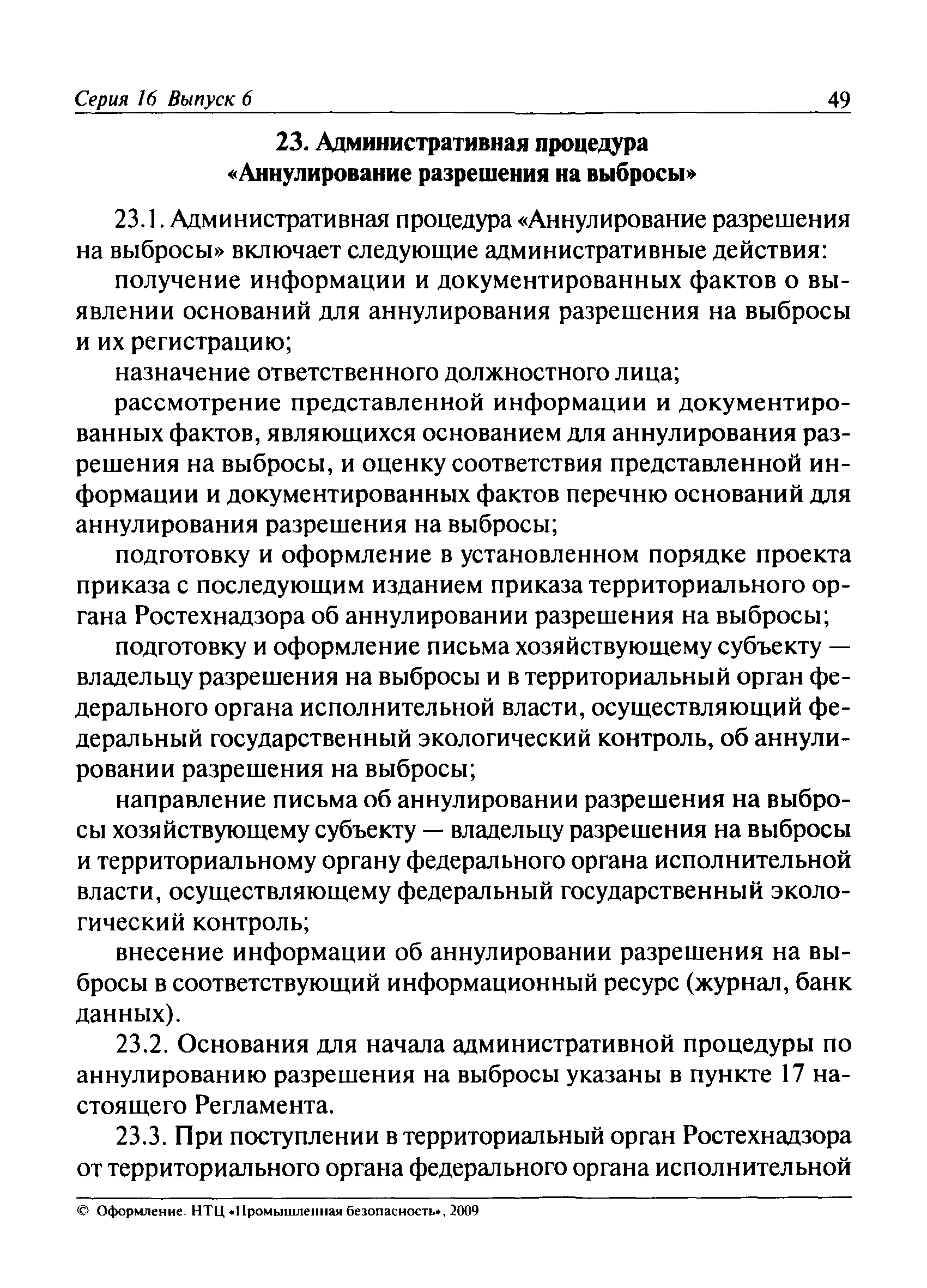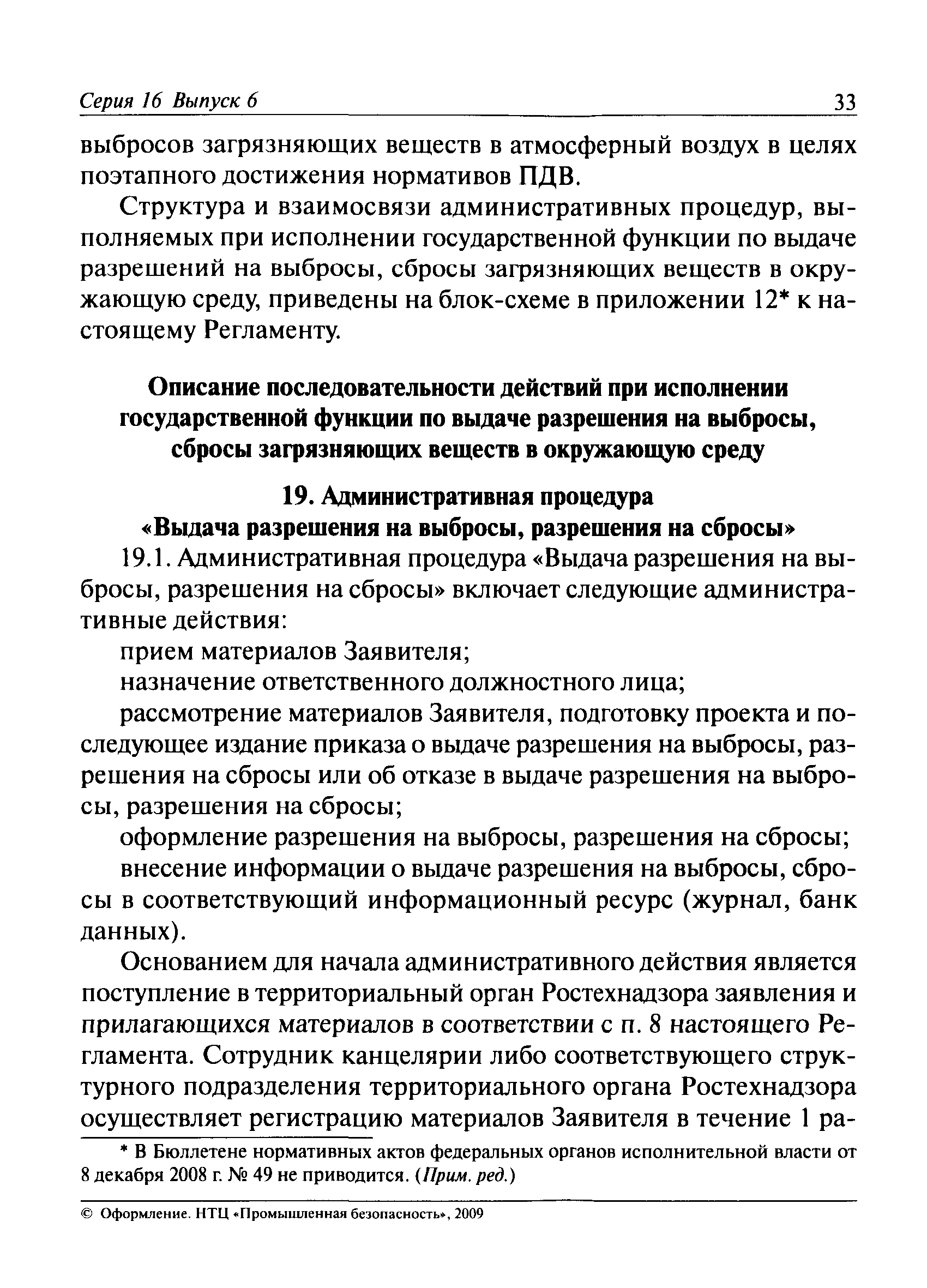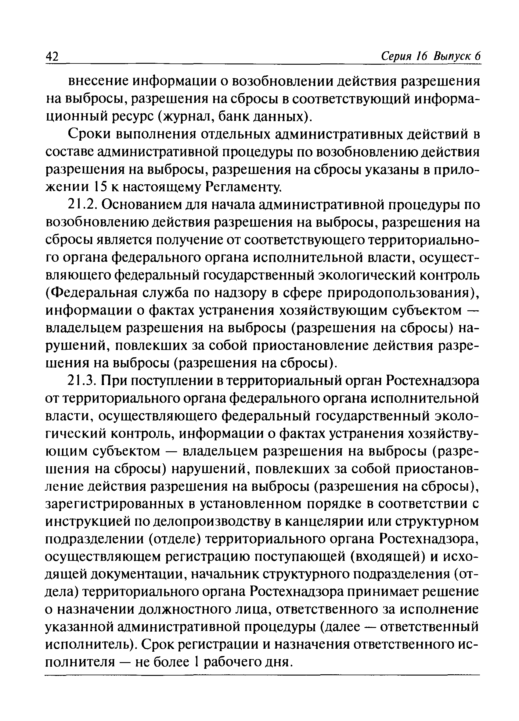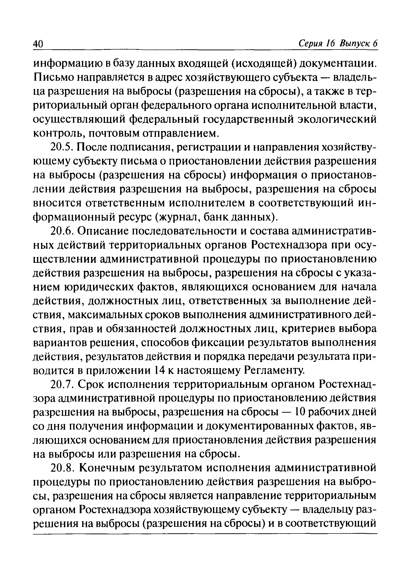 | Оглавление: | Приказ об утверждении 1. Общие положения 2. Требования к порядку исполнения государственной функции по выдаче разрешений на выбросы, сбросы загрязняющих веществ в окружающую среду 3. Административные процедуры 4. Порядок и формы контроля за исполнением государственной функции по выдаче разрешений на выбросы, сбросы загрязняющих веществ 5. Обжалование действий (бездействия) должностных лиц в ходе выполнения административных процедур при исполнении государственной функции по выдаче разрешений на выбросы, сбросы загрязняющих веществ Приложение 1. Заявление о выдаче разрешения на выбросы (разрешения на сбросы) загрязняющих веществ в окружающую среду Приложение 2. Заявление на переоформление разрешения на выбросы (разрешения на сбросы) загрязняющих веществ в окружающую среду Приложение 3. Список территориальных органов Ростехнадзора Приложение 4. План снижения выбросов загрязняющих веществ в атмосферный воздух Приложение 5. Разрешение на сброс загрязняющих веществ в окружающую среду Приложение 6. Письмо об отказе в выдаче разрешения на выбросы (разрешения на сбросы) загрязняющих веществ в окружающую среду Приложение 7. Письмо о приостановлении действия разрешения на выбросы (сбросы) загрязняющих веществ в окружающую среду Приложение 8. Письмо о возобновлении действия разрешения на выбросы (разрешения на сбросы) загрязняющих веществ в окружающую среду Приложение 9. Заявление на переоформление разрешения на выбросы (разрешения на сбросы) загрязняющих веществ в окружающую среду Приложение 10. Письмо об отказе в переоформлении разрешения на выбросы (сбросы) загрязняющих веществ в окружающую среду Приложение 11. Письмо об аннулировании разрешения на выбросы загрязняющих веществ в окружающую среду Приложение 12. Взаимосвязь административных процедур и блок-схема последовательности действий при исполнении государственной функции по выдаче разрешений на выбросы, сбросы загрязняющих веществ в окружающую среду Приложение 13. Описание последовательности и состава административных действий территориального органа Ростехнадзора при осуществлении административной процедуры по выдаче разрешения на выбросы, сбросы загрязняющих веществ в окружающую среду Приложение 14. Описание последовательности и состава административных действий территориального органа Ростехнадзора при осуществлении административной процедуры по приостановлению действия разрешения на выбросы, разрешения на сбросы Приложение 15. Описание последовательности и состава административных действий территориального органа Ростехнадзора при осуществлении административной процедуры по возобновлению действия разрешения на выбросы, разрешения на сбросы Приложение 16. Описание последовательности и состава административных действий территориального органа Ростехнадзора при осуществлении административной процедуры по переоформлению разрешения на выбросы, разрешения на сбросы Приложение 17. Описание последовательности и состава административных действий территориального органа Ростехнадзора при осуществлении административной процедуры по аннулированию разрешения на выбросы |