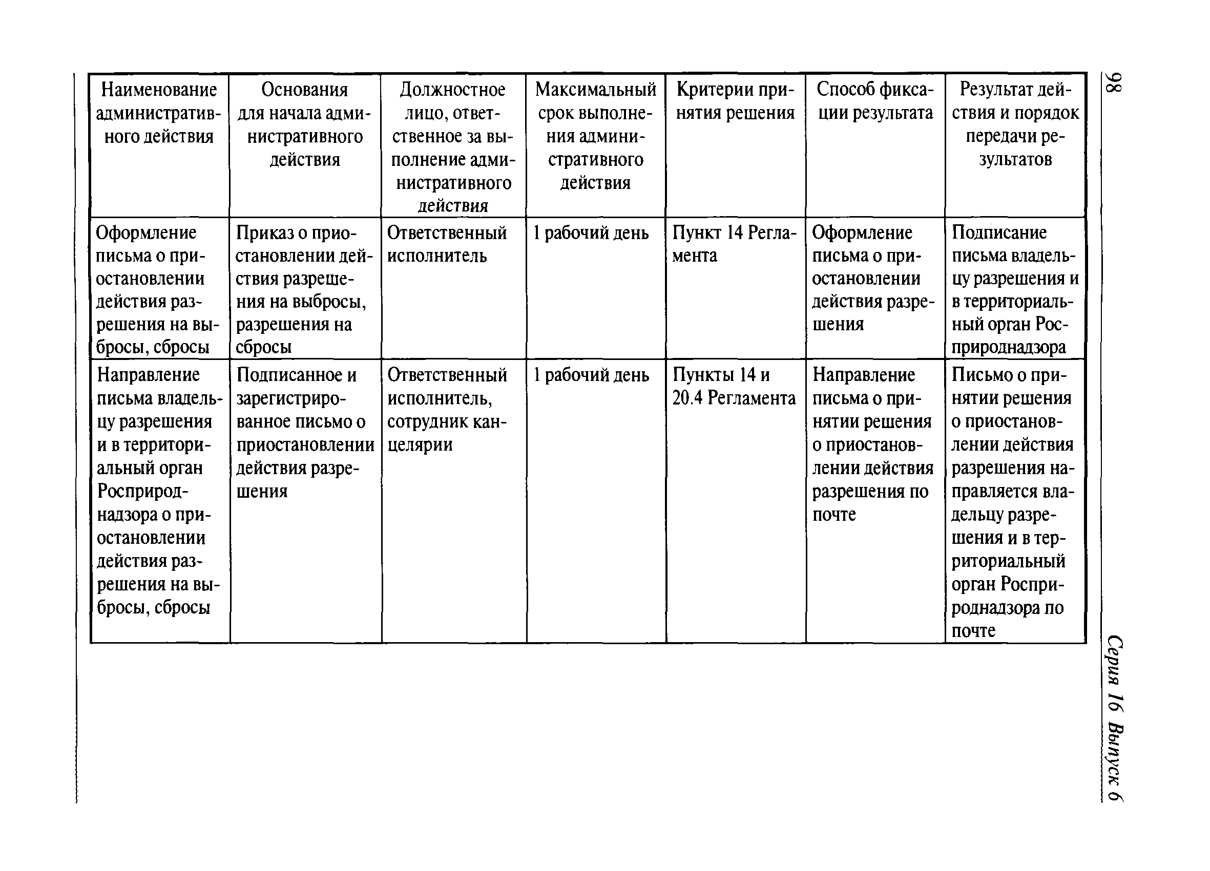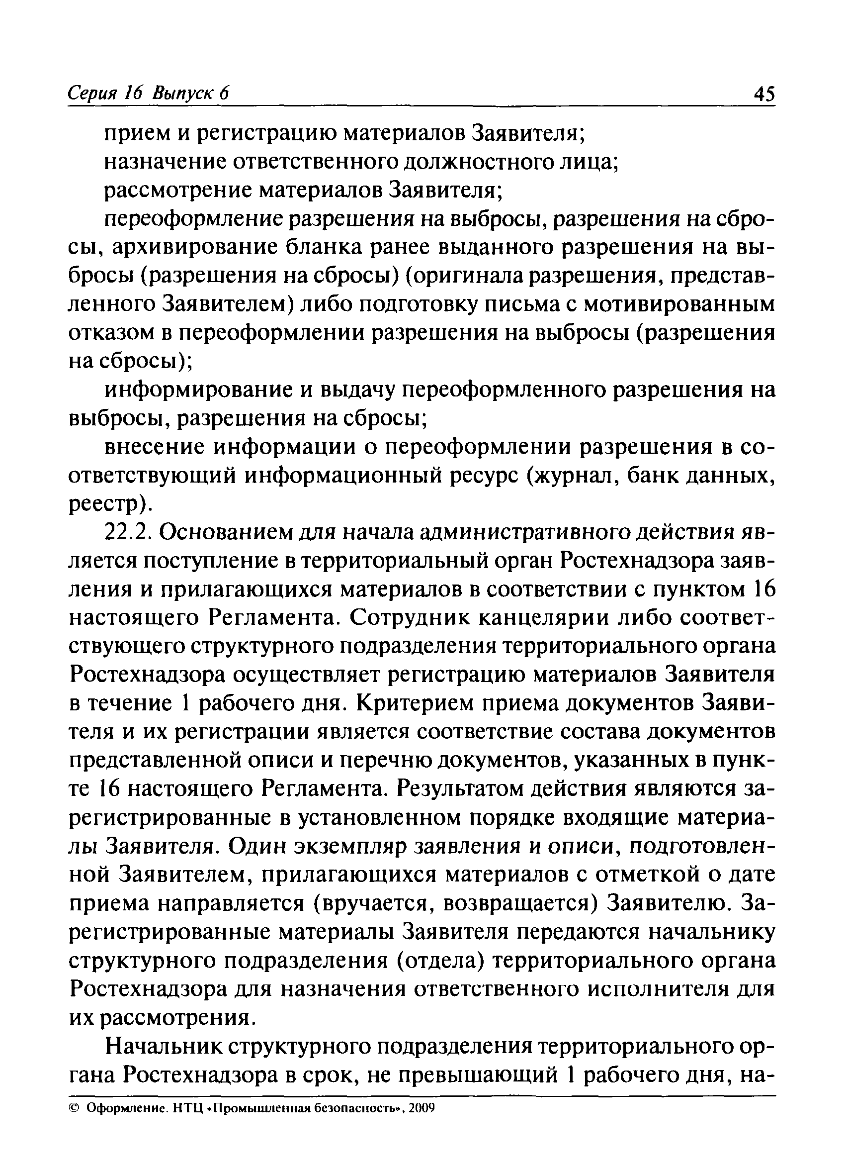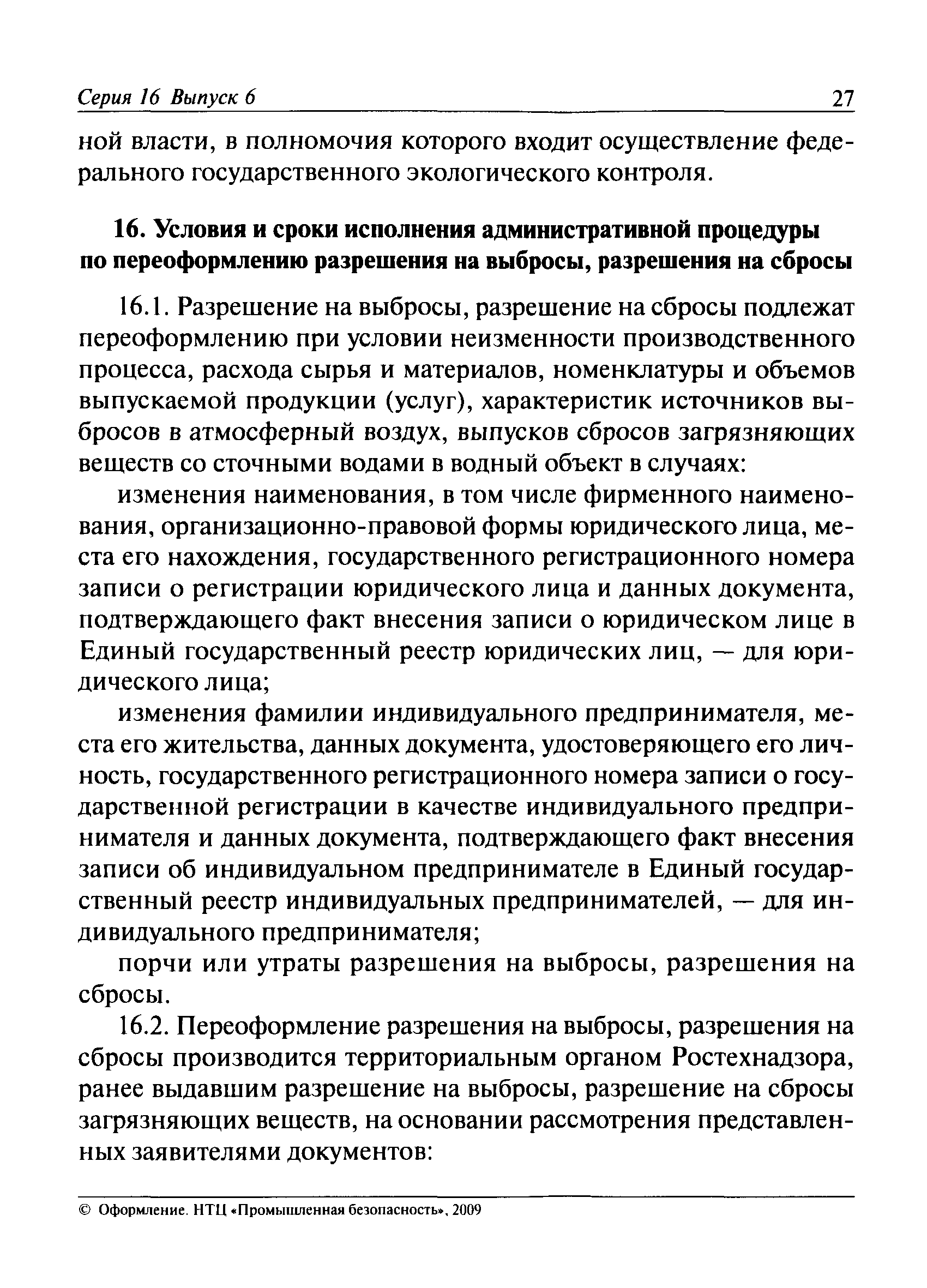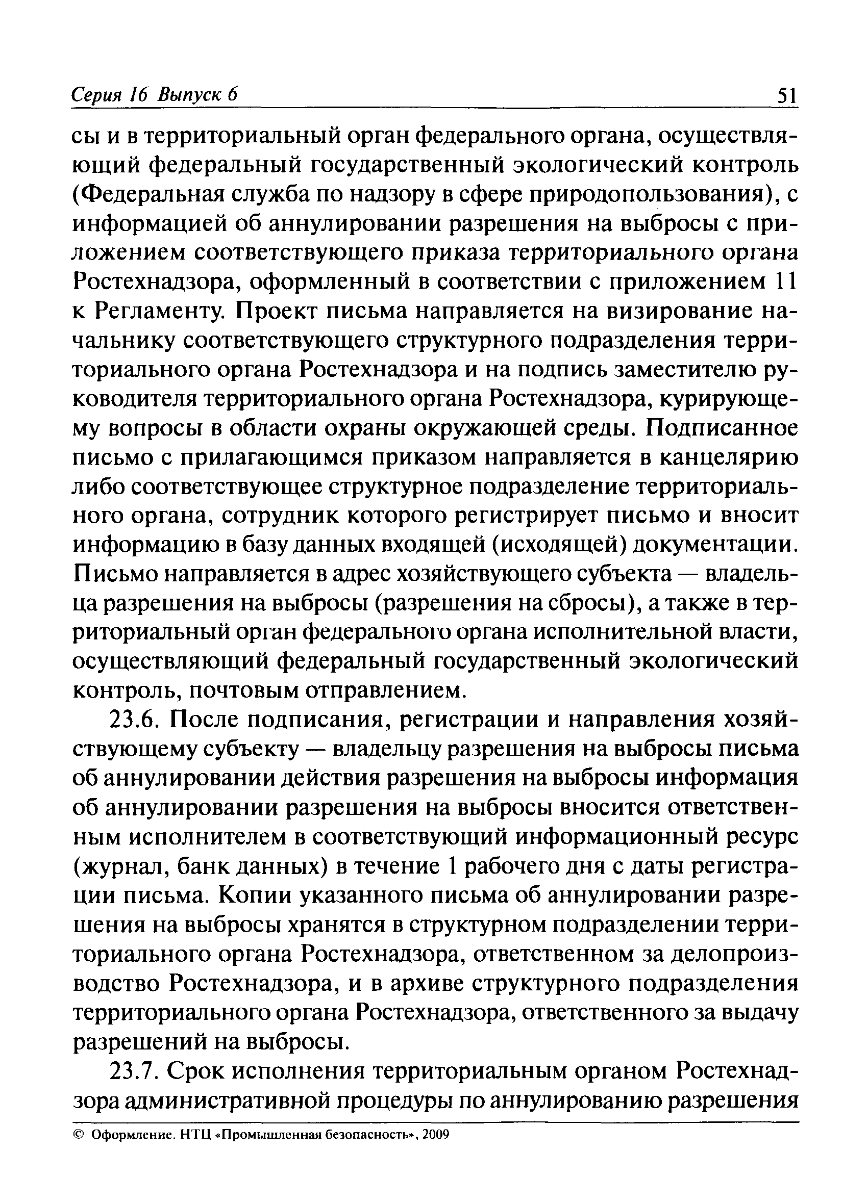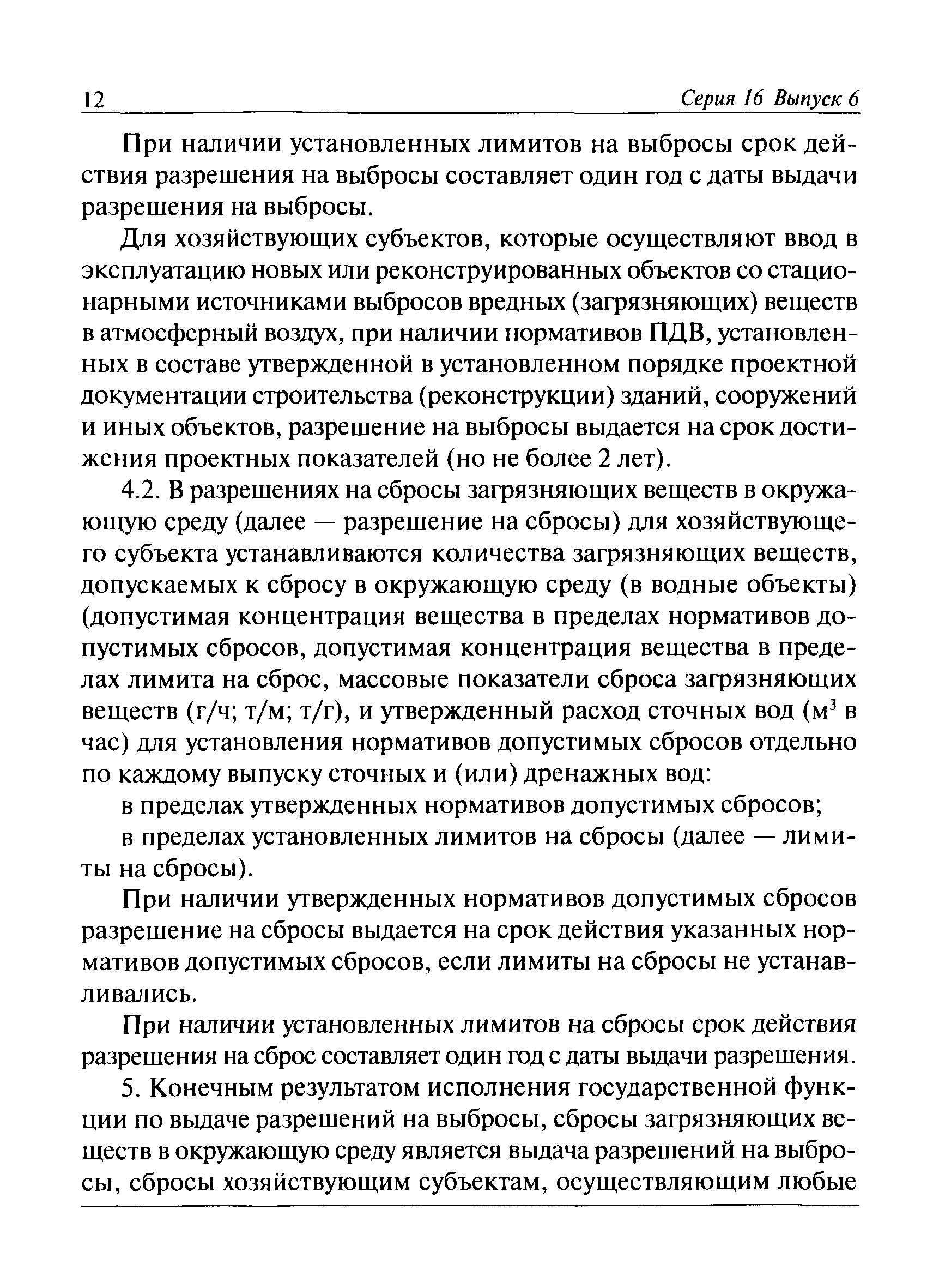 | Оглавление: | Приказ об утверждении 1. Общие положения 2. Требования к порядку исполнения государственной функции по выдаче разрешений на выбросы, сбросы загрязняющих веществ в окружающую среду 3. Административные процедуры 4. Порядок и формы контроля за исполнением государственной функции по выдаче разрешений на выбросы, сбросы загрязняющих веществ 5. Обжалование действий (бездействия) должностных лиц в ходе выполнения административных процедур при исполнении государственной функции по выдаче разрешений на выбросы, сбросы загрязняющих веществ Приложение 1. Заявление о выдаче разрешения на выбросы (разрешения на сбросы) загрязняющих веществ в окружающую среду Приложение 2. Заявление на переоформление разрешения на выбросы (разрешения на сбросы) загрязняющих веществ в окружающую среду Приложение 3. Список территориальных органов Ростехнадзора Приложение 4. План снижения выбросов загрязняющих веществ в атмосферный воздух Приложение 5. Разрешение на сброс загрязняющих веществ в окружающую среду Приложение 6. Письмо об отказе в выдаче разрешения на выбросы (разрешения на сбросы) загрязняющих веществ в окружающую среду Приложение 7. Письмо о приостановлении действия разрешения на выбросы (сбросы) загрязняющих веществ в окружающую среду Приложение 8. Письмо о возобновлении действия разрешения на выбросы (разрешения на сбросы) загрязняющих веществ в окружающую среду Приложение 9. Заявление на переоформление разрешения на выбросы (разрешения на сбросы) загрязняющих веществ в окружающую среду Приложение 10. Письмо об отказе в переоформлении разрешения на выбросы (сбросы) загрязняющих веществ в окружающую среду Приложение 11. Письмо об аннулировании разрешения на выбросы загрязняющих веществ в окружающую среду Приложение 12. Взаимосвязь административных процедур и блок-схема последовательности действий при исполнении государственной функции по выдаче разрешений на выбросы, сбросы загрязняющих веществ в окружающую среду Приложение 13. Описание последовательности и состава административных действий территориального органа Ростехнадзора при осуществлении административной процедуры по выдаче разрешения на выбросы, сбросы загрязняющих веществ в окружающую среду Приложение 14. Описание последовательности и состава административных действий территориального органа Ростехнадзора при осуществлении административной процедуры по приостановлению действия разрешения на выбросы, разрешения на сбросы Приложение 15. Описание последовательности и состава административных действий территориального органа Ростехнадзора при осуществлении административной процедуры по возобновлению действия разрешения на выбросы, разрешения на сбросы Приложение 16. Описание последовательности и состава административных действий территориального органа Ростехнадзора при осуществлении административной процедуры по переоформлению разрешения на выбросы, разрешения на сбросы Приложение 17. Описание последовательности и состава административных действий территориального органа Ростехнадзора при осуществлении административной процедуры по аннулированию разрешения на выбросы |