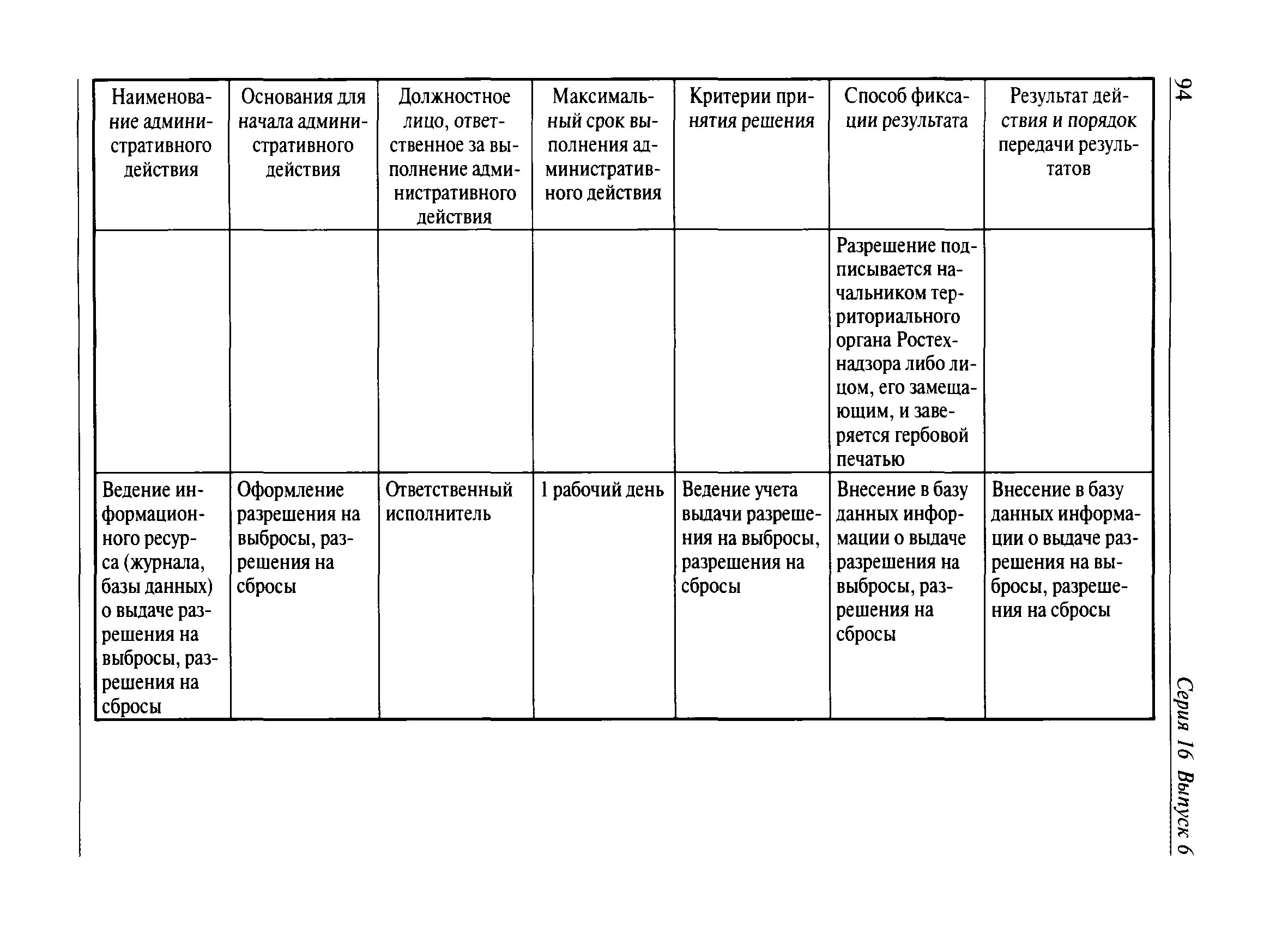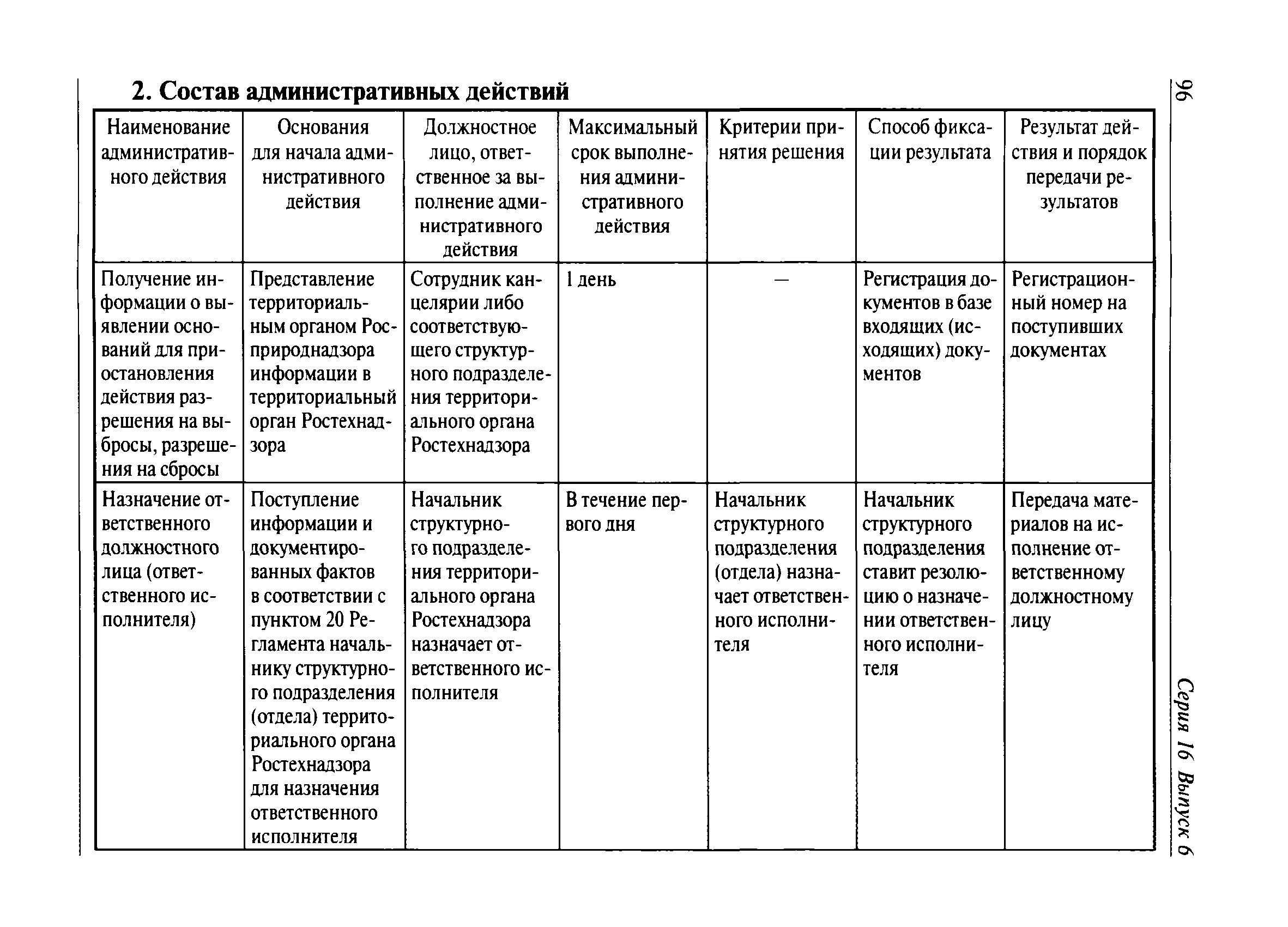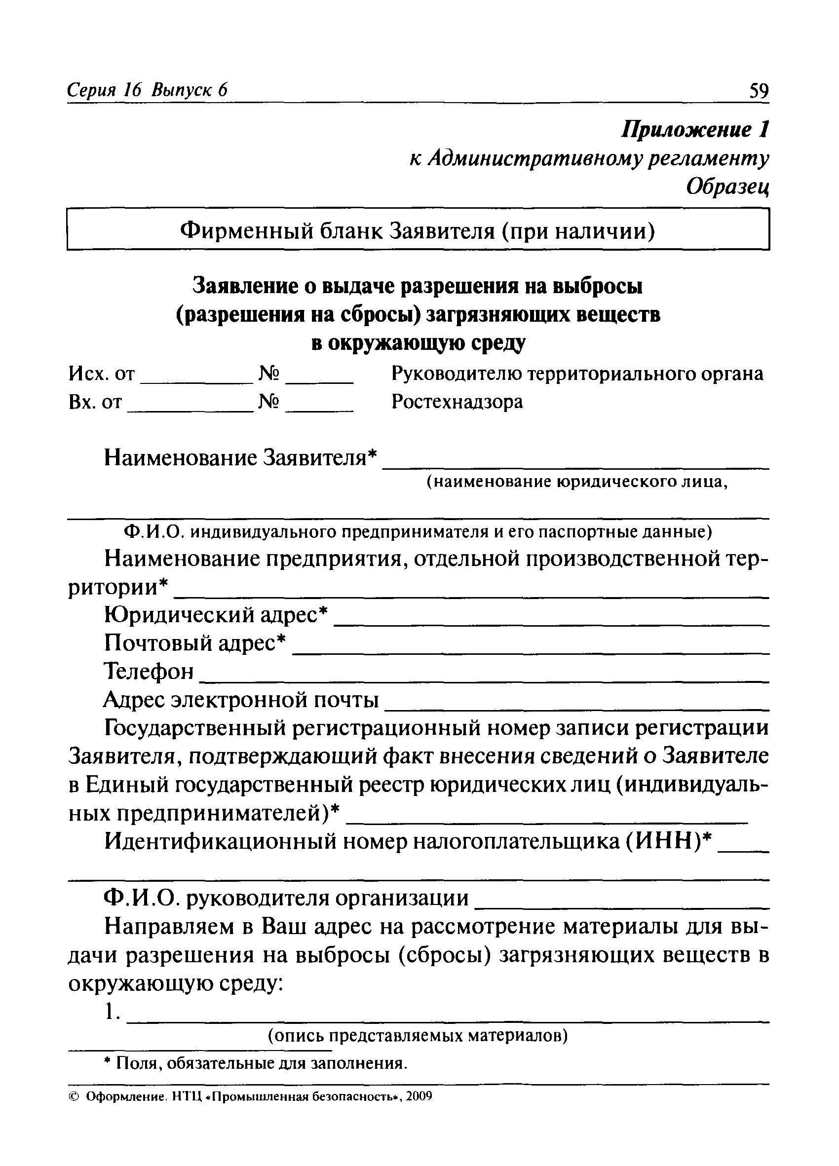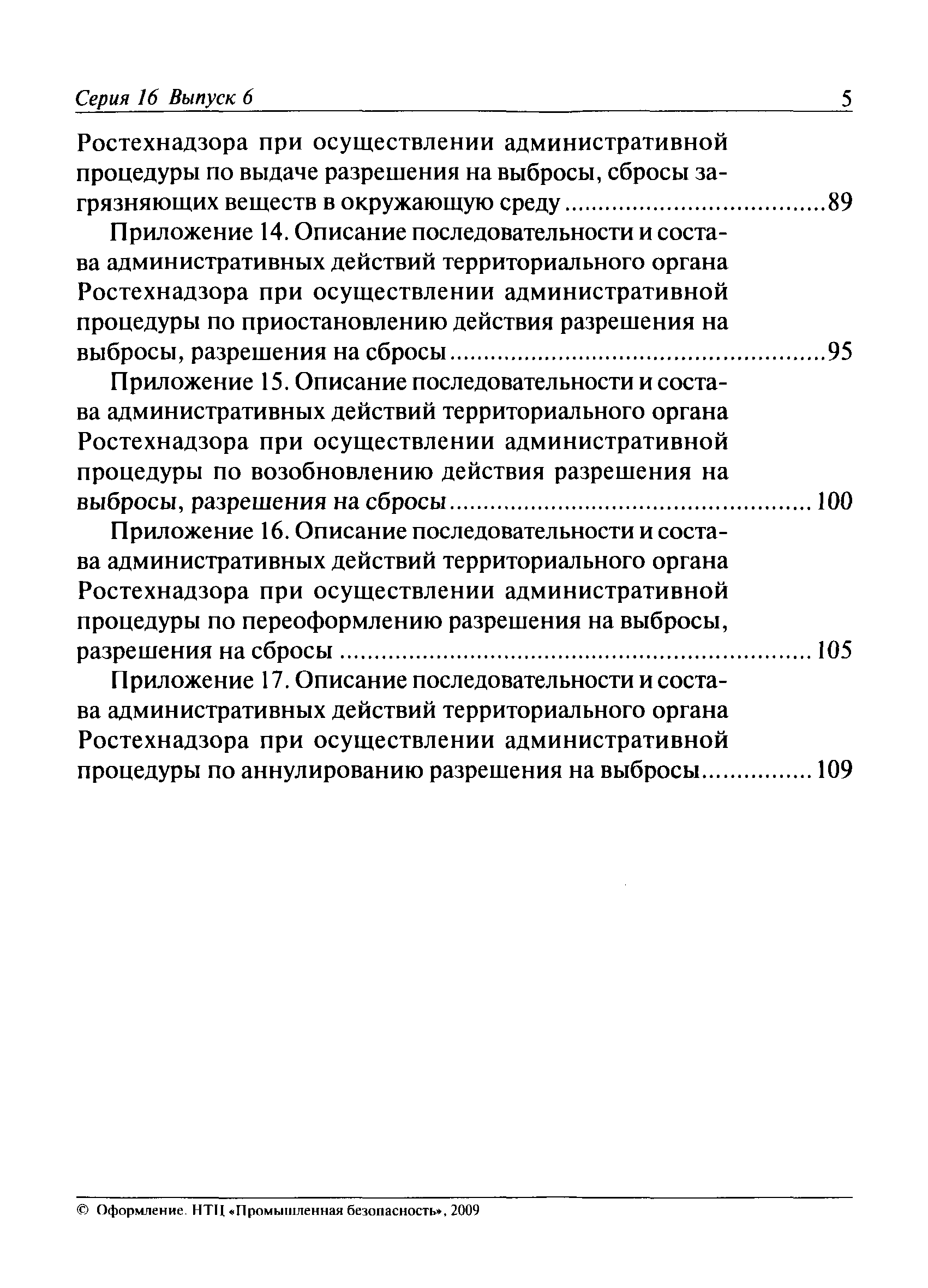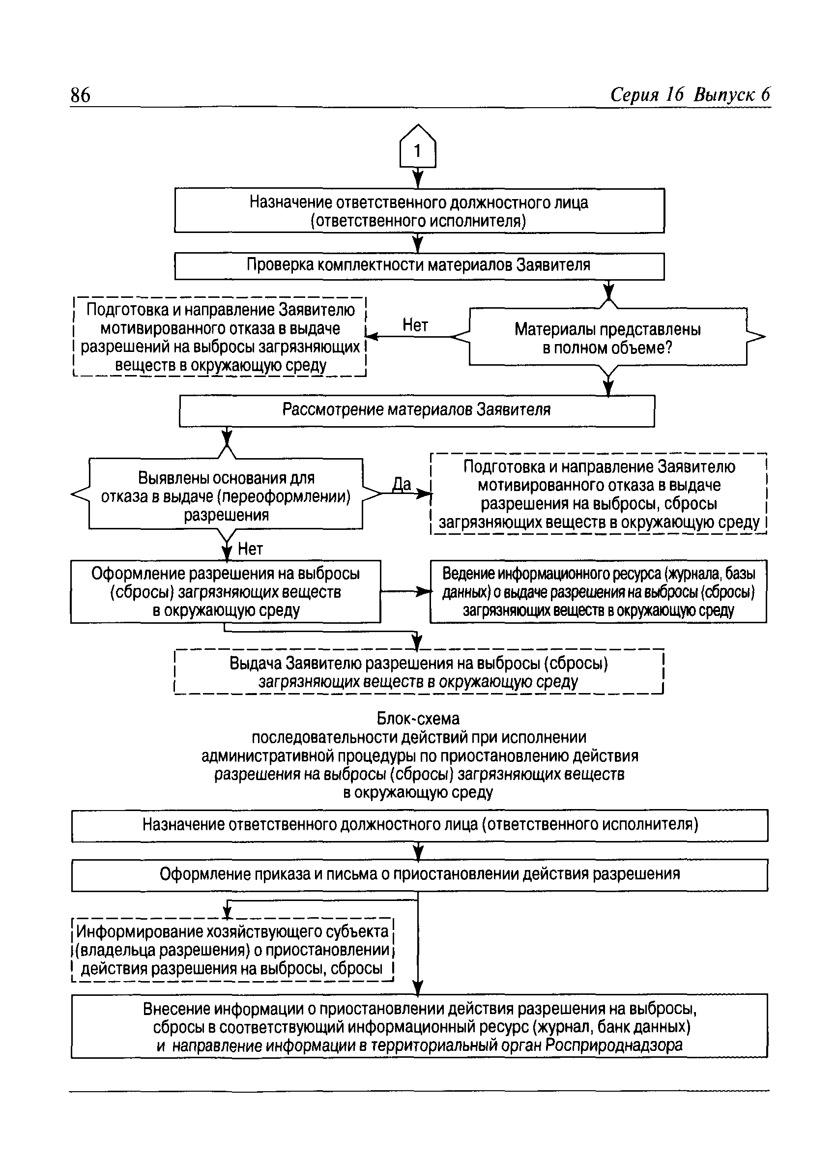 | Оглавление: | Приказ об утверждении 1. Общие положения 2. Требования к порядку исполнения государственной функции по выдаче разрешений на выбросы, сбросы загрязняющих веществ в окружающую среду 3. Административные процедуры 4. Порядок и формы контроля за исполнением государственной функции по выдаче разрешений на выбросы, сбросы загрязняющих веществ 5. Обжалование действий (бездействия) должностных лиц в ходе выполнения административных процедур при исполнении государственной функции по выдаче разрешений на выбросы, сбросы загрязняющих веществ Приложение 1. Заявление о выдаче разрешения на выбросы (разрешения на сбросы) загрязняющих веществ в окружающую среду Приложение 2. Заявление на переоформление разрешения на выбросы (разрешения на сбросы) загрязняющих веществ в окружающую среду Приложение 3. Список территориальных органов Ростехнадзора Приложение 4. План снижения выбросов загрязняющих веществ в атмосферный воздух Приложение 5. Разрешение на сброс загрязняющих веществ в окружающую среду Приложение 6. Письмо об отказе в выдаче разрешения на выбросы (разрешения на сбросы) загрязняющих веществ в окружающую среду Приложение 7. Письмо о приостановлении действия разрешения на выбросы (сбросы) загрязняющих веществ в окружающую среду Приложение 8. Письмо о возобновлении действия разрешения на выбросы (разрешения на сбросы) загрязняющих веществ в окружающую среду Приложение 9. Заявление на переоформление разрешения на выбросы (разрешения на сбросы) загрязняющих веществ в окружающую среду Приложение 10. Письмо об отказе в переоформлении разрешения на выбросы (сбросы) загрязняющих веществ в окружающую среду Приложение 11. Письмо об аннулировании разрешения на выбросы загрязняющих веществ в окружающую среду Приложение 12. Взаимосвязь административных процедур и блок-схема последовательности действий при исполнении государственной функции по выдаче разрешений на выбросы, сбросы загрязняющих веществ в окружающую среду Приложение 13. Описание последовательности и состава административных действий территориального органа Ростехнадзора при осуществлении административной процедуры по выдаче разрешения на выбросы, сбросы загрязняющих веществ в окружающую среду Приложение 14. Описание последовательности и состава административных действий территориального органа Ростехнадзора при осуществлении административной процедуры по приостановлению действия разрешения на выбросы, разрешения на сбросы Приложение 15. Описание последовательности и состава административных действий территориального органа Ростехнадзора при осуществлении административной процедуры по возобновлению действия разрешения на выбросы, разрешения на сбросы Приложение 16. Описание последовательности и состава административных действий территориального органа Ростехнадзора при осуществлении административной процедуры по переоформлению разрешения на выбросы, разрешения на сбросы Приложение 17. Описание последовательности и состава административных действий территориального органа Ростехнадзора при осуществлении административной процедуры по аннулированию разрешения на выбросы |