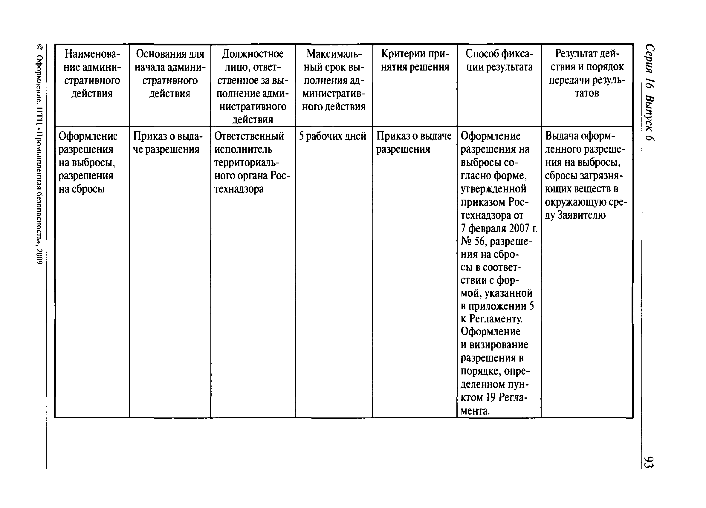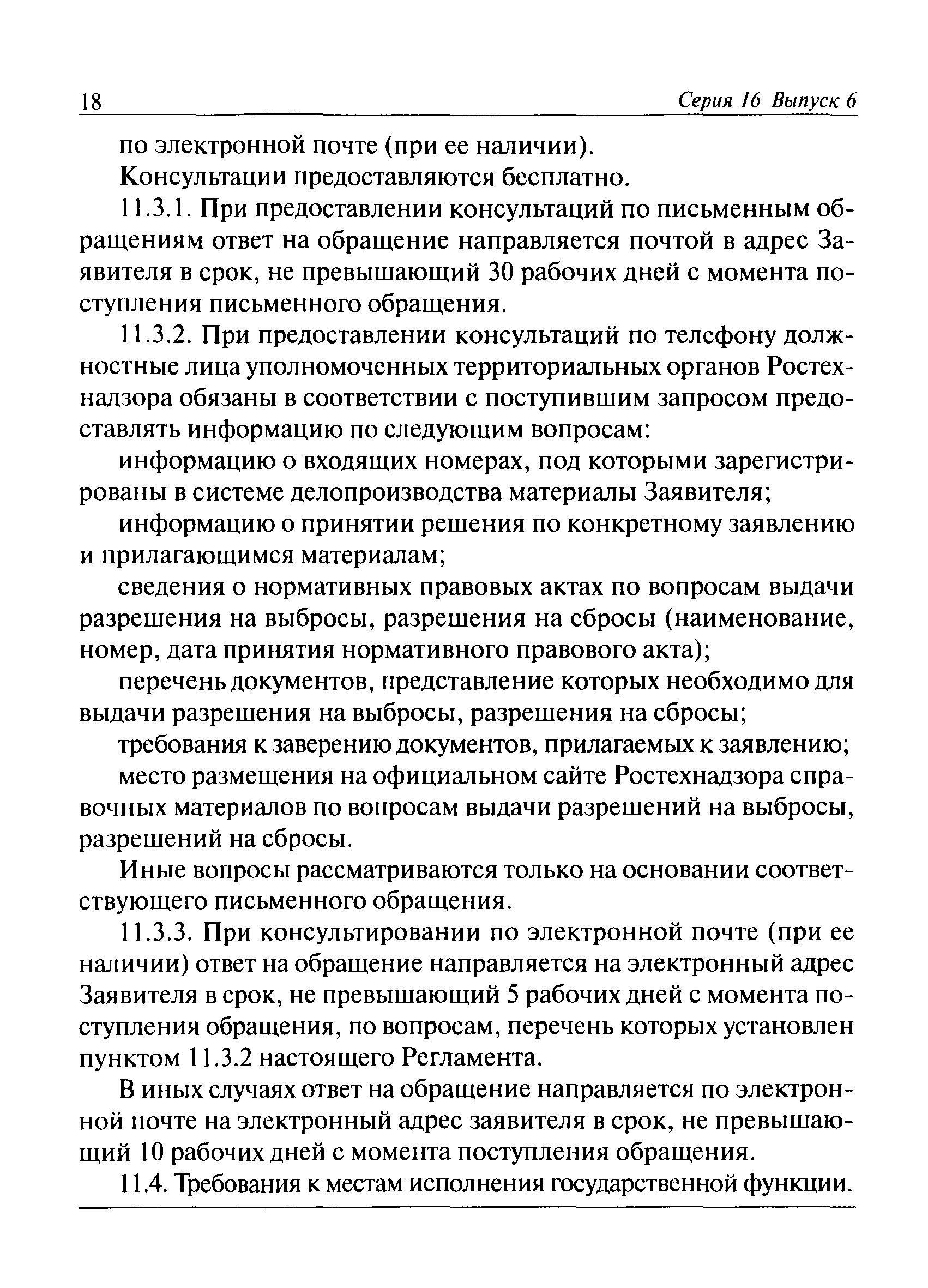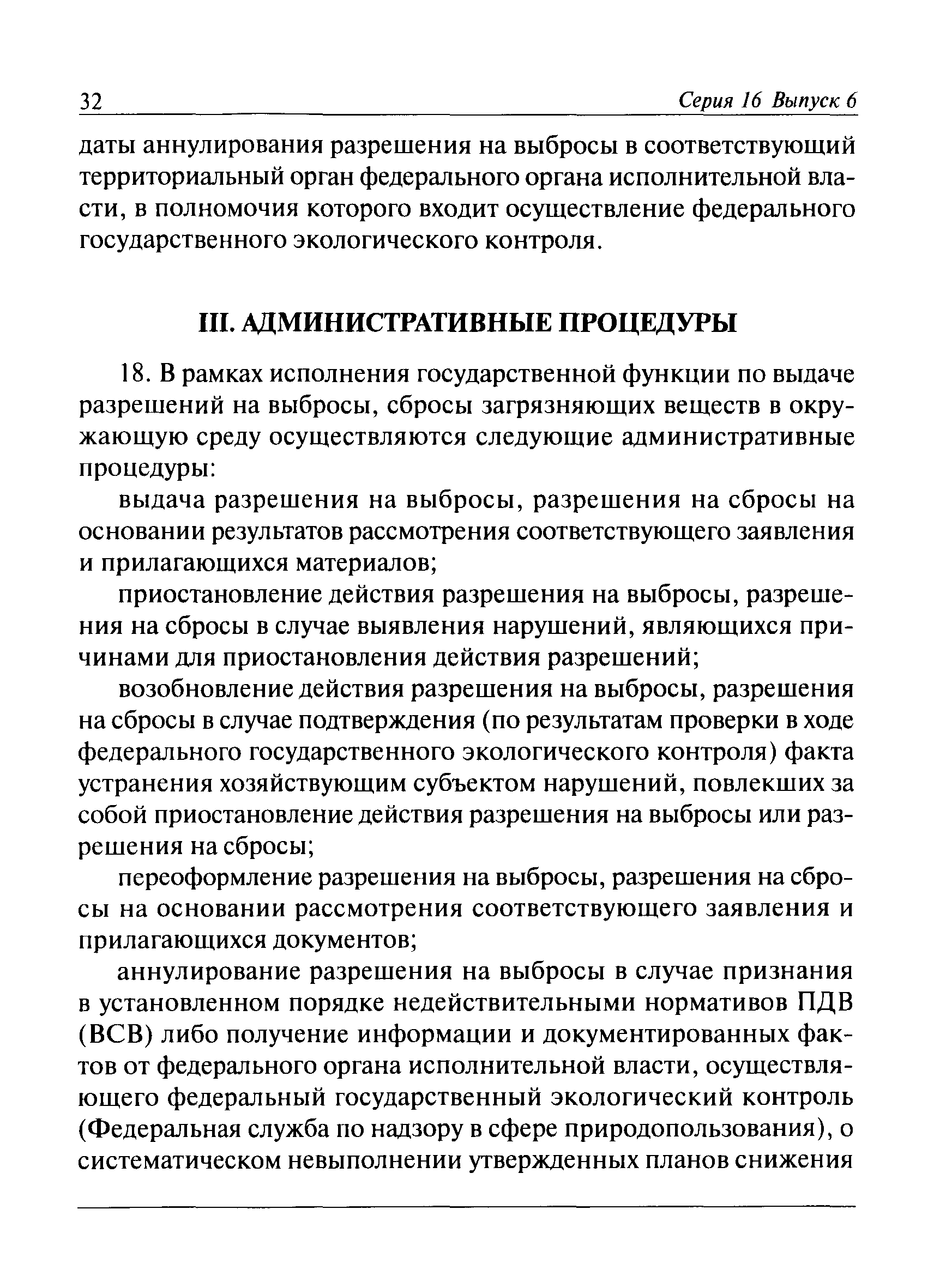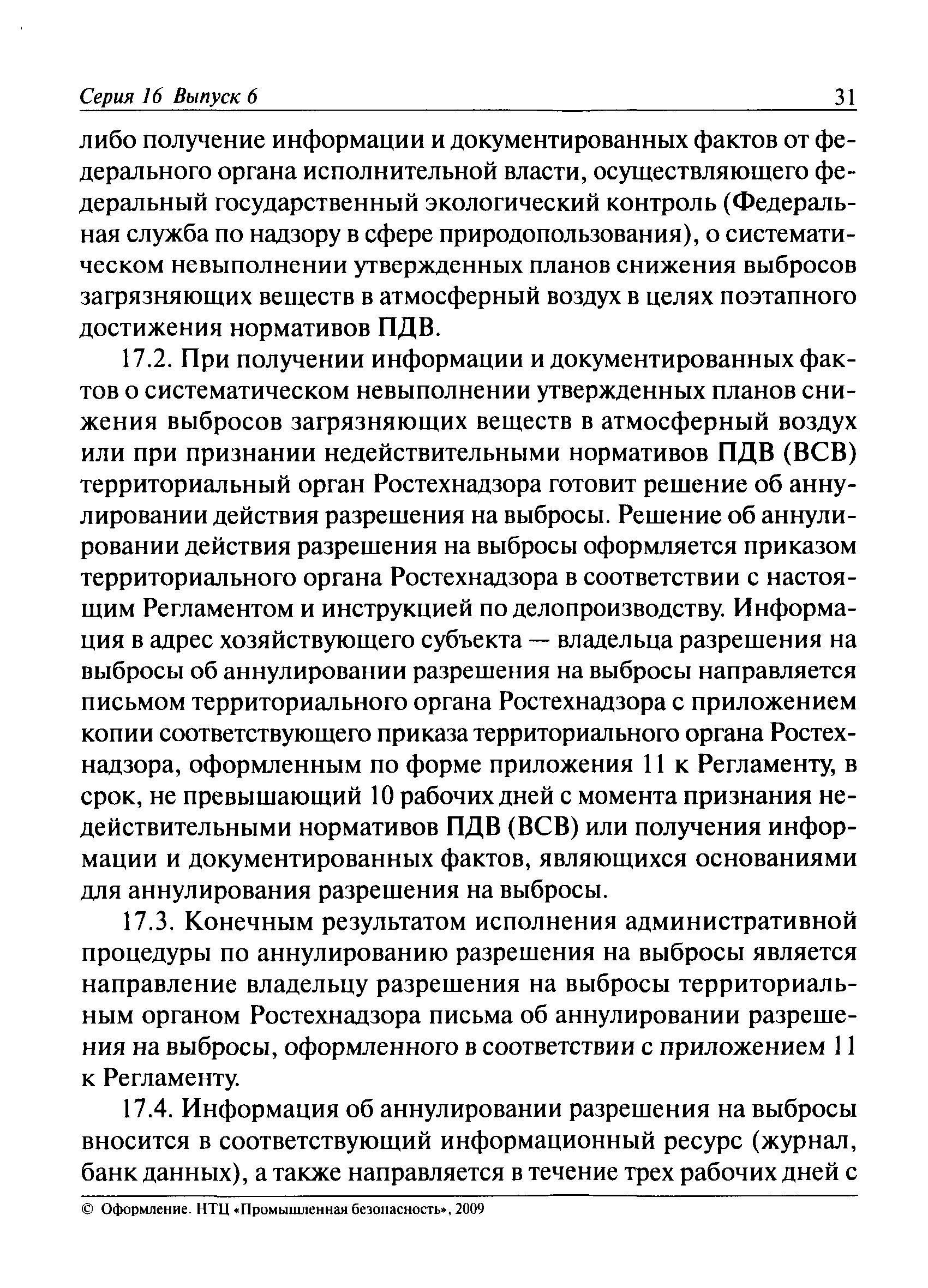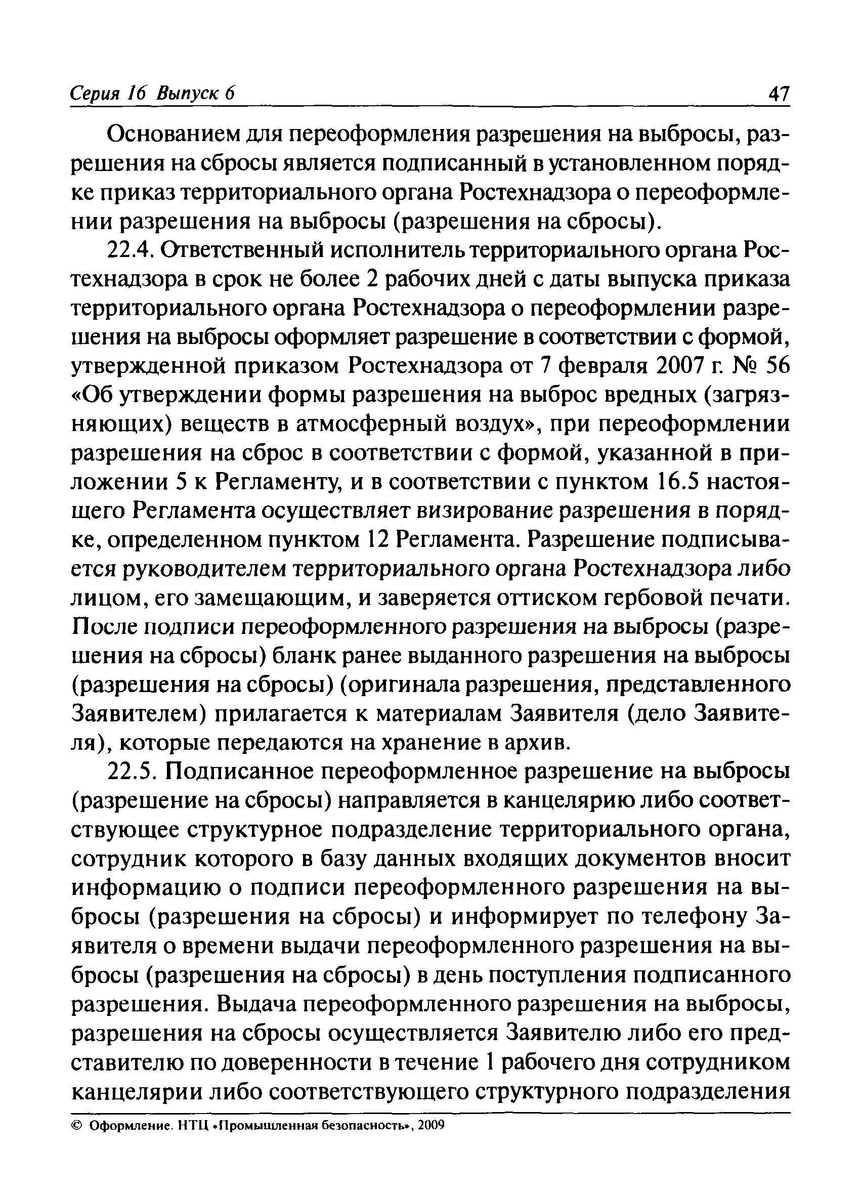 | Оглавление: | Приказ об утверждении 1. Общие положения 2. Требования к порядку исполнения государственной функции по выдаче разрешений на выбросы, сбросы загрязняющих веществ в окружающую среду 3. Административные процедуры 4. Порядок и формы контроля за исполнением государственной функции по выдаче разрешений на выбросы, сбросы загрязняющих веществ 5. Обжалование действий (бездействия) должностных лиц в ходе выполнения административных процедур при исполнении государственной функции по выдаче разрешений на выбросы, сбросы загрязняющих веществ Приложение 1. Заявление о выдаче разрешения на выбросы (разрешения на сбросы) загрязняющих веществ в окружающую среду Приложение 2. Заявление на переоформление разрешения на выбросы (разрешения на сбросы) загрязняющих веществ в окружающую среду Приложение 3. Список территориальных органов Ростехнадзора Приложение 4. План снижения выбросов загрязняющих веществ в атмосферный воздух Приложение 5. Разрешение на сброс загрязняющих веществ в окружающую среду Приложение 6. Письмо об отказе в выдаче разрешения на выбросы (разрешения на сбросы) загрязняющих веществ в окружающую среду Приложение 7. Письмо о приостановлении действия разрешения на выбросы (сбросы) загрязняющих веществ в окружающую среду Приложение 8. Письмо о возобновлении действия разрешения на выбросы (разрешения на сбросы) загрязняющих веществ в окружающую среду Приложение 9. Заявление на переоформление разрешения на выбросы (разрешения на сбросы) загрязняющих веществ в окружающую среду Приложение 10. Письмо об отказе в переоформлении разрешения на выбросы (сбросы) загрязняющих веществ в окружающую среду Приложение 11. Письмо об аннулировании разрешения на выбросы загрязняющих веществ в окружающую среду Приложение 12. Взаимосвязь административных процедур и блок-схема последовательности действий при исполнении государственной функции по выдаче разрешений на выбросы, сбросы загрязняющих веществ в окружающую среду Приложение 13. Описание последовательности и состава административных действий территориального органа Ростехнадзора при осуществлении административной процедуры по выдаче разрешения на выбросы, сбросы загрязняющих веществ в окружающую среду Приложение 14. Описание последовательности и состава административных действий территориального органа Ростехнадзора при осуществлении административной процедуры по приостановлению действия разрешения на выбросы, разрешения на сбросы Приложение 15. Описание последовательности и состава административных действий территориального органа Ростехнадзора при осуществлении административной процедуры по возобновлению действия разрешения на выбросы, разрешения на сбросы Приложение 16. Описание последовательности и состава административных действий территориального органа Ростехнадзора при осуществлении административной процедуры по переоформлению разрешения на выбросы, разрешения на сбросы Приложение 17. Описание последовательности и состава административных действий территориального органа Ростехнадзора при осуществлении административной процедуры по аннулированию разрешения на выбросы |