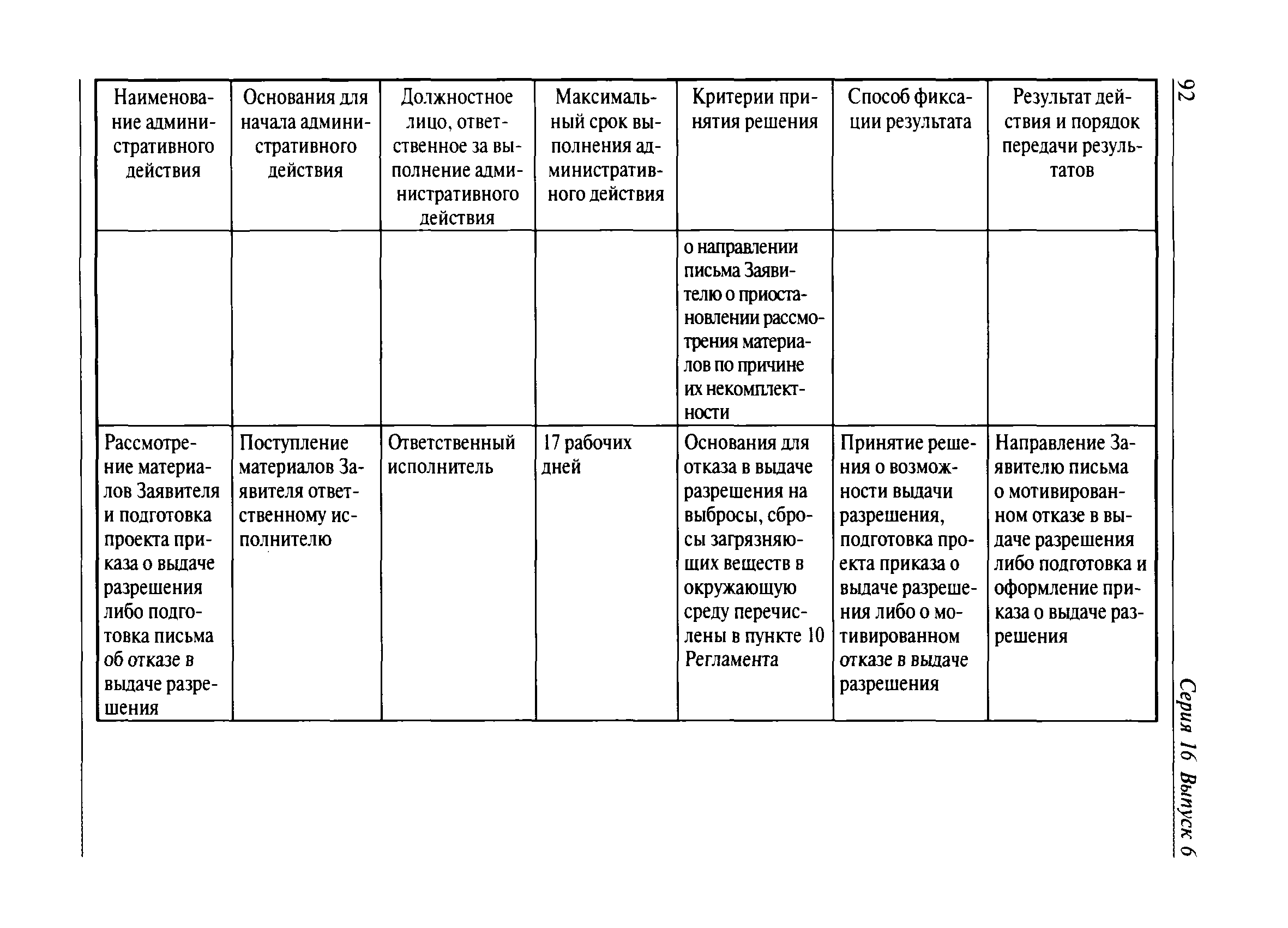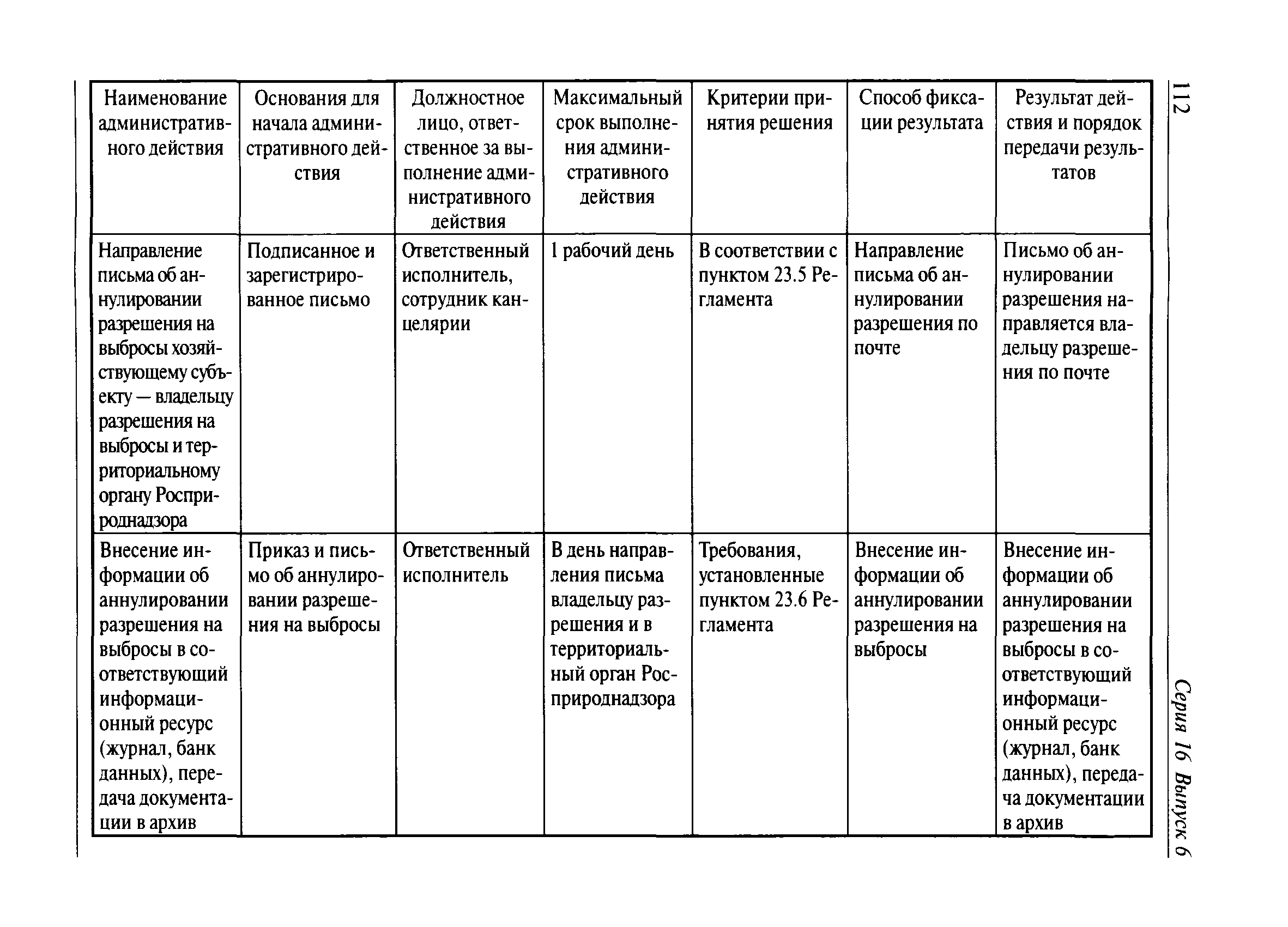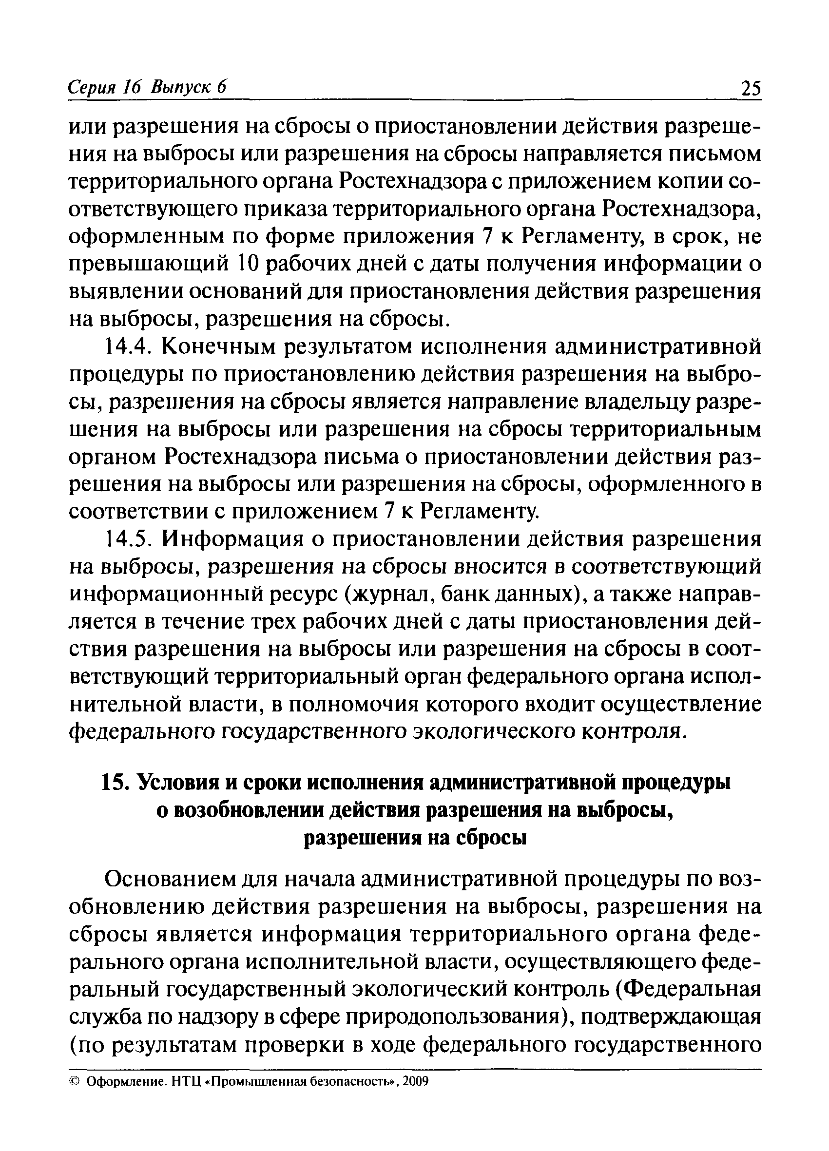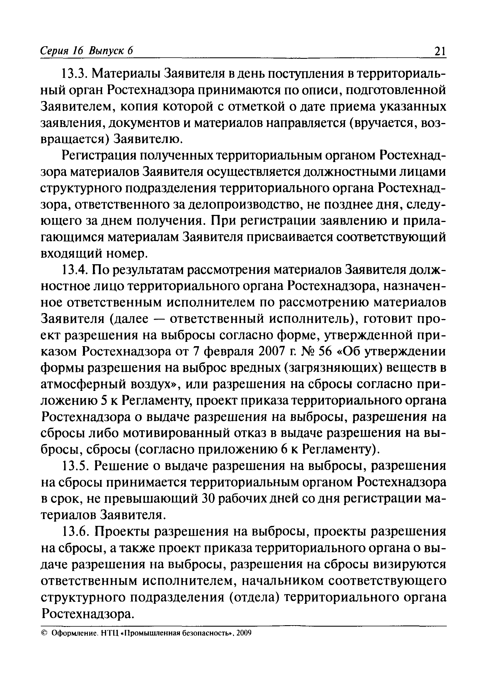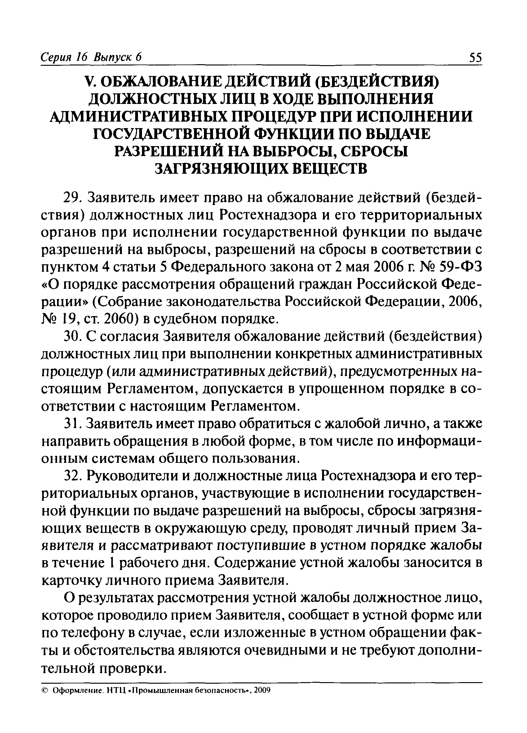 | Оглавление: | Приказ об утверждении 1. Общие положения 2. Требования к порядку исполнения государственной функции по выдаче разрешений на выбросы, сбросы загрязняющих веществ в окружающую среду 3. Административные процедуры 4. Порядок и формы контроля за исполнением государственной функции по выдаче разрешений на выбросы, сбросы загрязняющих веществ 5. Обжалование действий (бездействия) должностных лиц в ходе выполнения административных процедур при исполнении государственной функции по выдаче разрешений на выбросы, сбросы загрязняющих веществ Приложение 1. Заявление о выдаче разрешения на выбросы (разрешения на сбросы) загрязняющих веществ в окружающую среду Приложение 2. Заявление на переоформление разрешения на выбросы (разрешения на сбросы) загрязняющих веществ в окружающую среду Приложение 3. Список территориальных органов Ростехнадзора Приложение 4. План снижения выбросов загрязняющих веществ в атмосферный воздух Приложение 5. Разрешение на сброс загрязняющих веществ в окружающую среду Приложение 6. Письмо об отказе в выдаче разрешения на выбросы (разрешения на сбросы) загрязняющих веществ в окружающую среду Приложение 7. Письмо о приостановлении действия разрешения на выбросы (сбросы) загрязняющих веществ в окружающую среду Приложение 8. Письмо о возобновлении действия разрешения на выбросы (разрешения на сбросы) загрязняющих веществ в окружающую среду Приложение 9. Заявление на переоформление разрешения на выбросы (разрешения на сбросы) загрязняющих веществ в окружающую среду Приложение 10. Письмо об отказе в переоформлении разрешения на выбросы (сбросы) загрязняющих веществ в окружающую среду Приложение 11. Письмо об аннулировании разрешения на выбросы загрязняющих веществ в окружающую среду Приложение 12. Взаимосвязь административных процедур и блок-схема последовательности действий при исполнении государственной функции по выдаче разрешений на выбросы, сбросы загрязняющих веществ в окружающую среду Приложение 13. Описание последовательности и состава административных действий территориального органа Ростехнадзора при осуществлении административной процедуры по выдаче разрешения на выбросы, сбросы загрязняющих веществ в окружающую среду Приложение 14. Описание последовательности и состава административных действий территориального органа Ростехнадзора при осуществлении административной процедуры по приостановлению действия разрешения на выбросы, разрешения на сбросы Приложение 15. Описание последовательности и состава административных действий территориального органа Ростехнадзора при осуществлении административной процедуры по возобновлению действия разрешения на выбросы, разрешения на сбросы Приложение 16. Описание последовательности и состава административных действий территориального органа Ростехнадзора при осуществлении административной процедуры по переоформлению разрешения на выбросы, разрешения на сбросы Приложение 17. Описание последовательности и состава административных действий территориального органа Ростехнадзора при осуществлении административной процедуры по аннулированию разрешения на выбросы |
