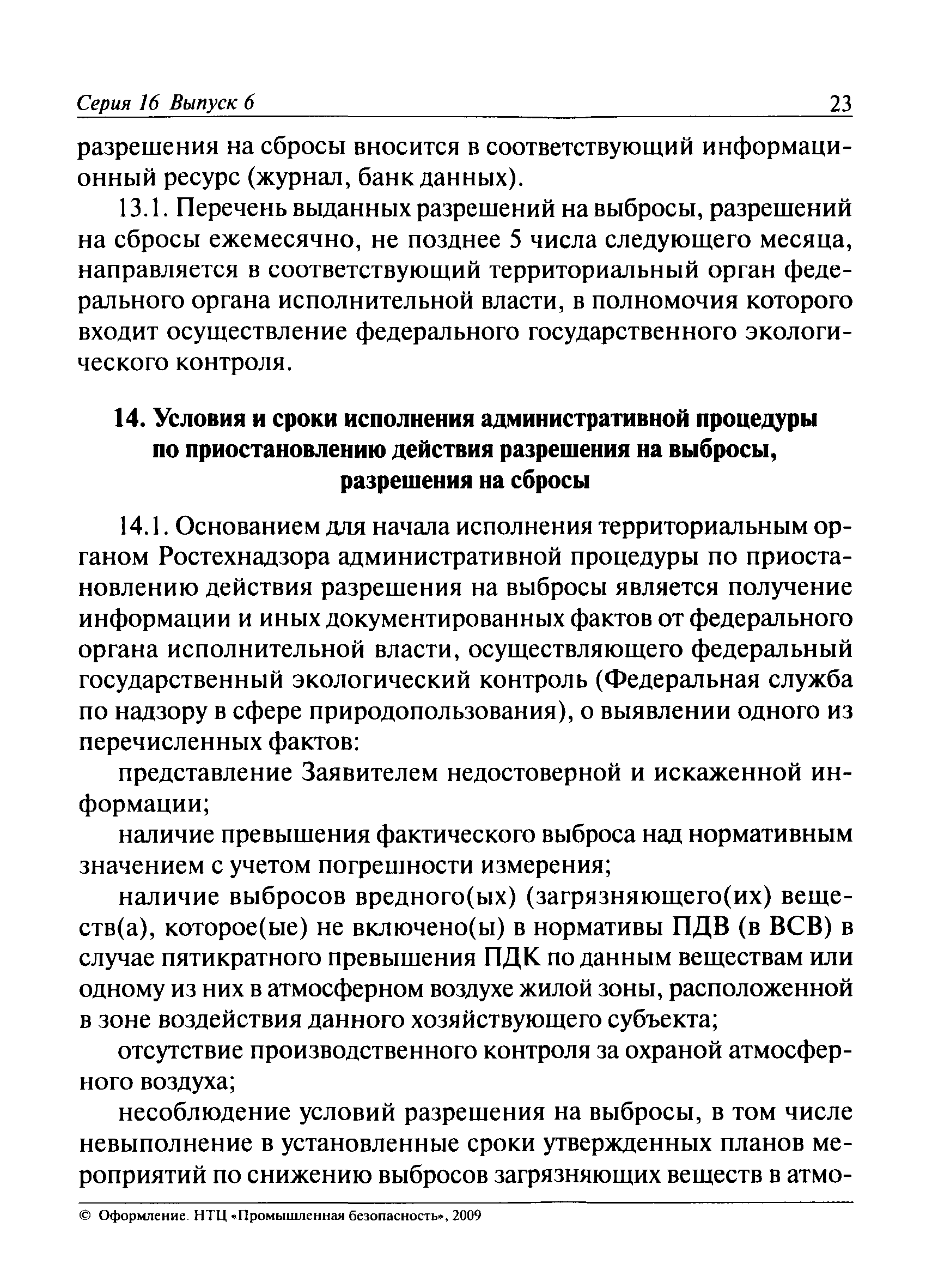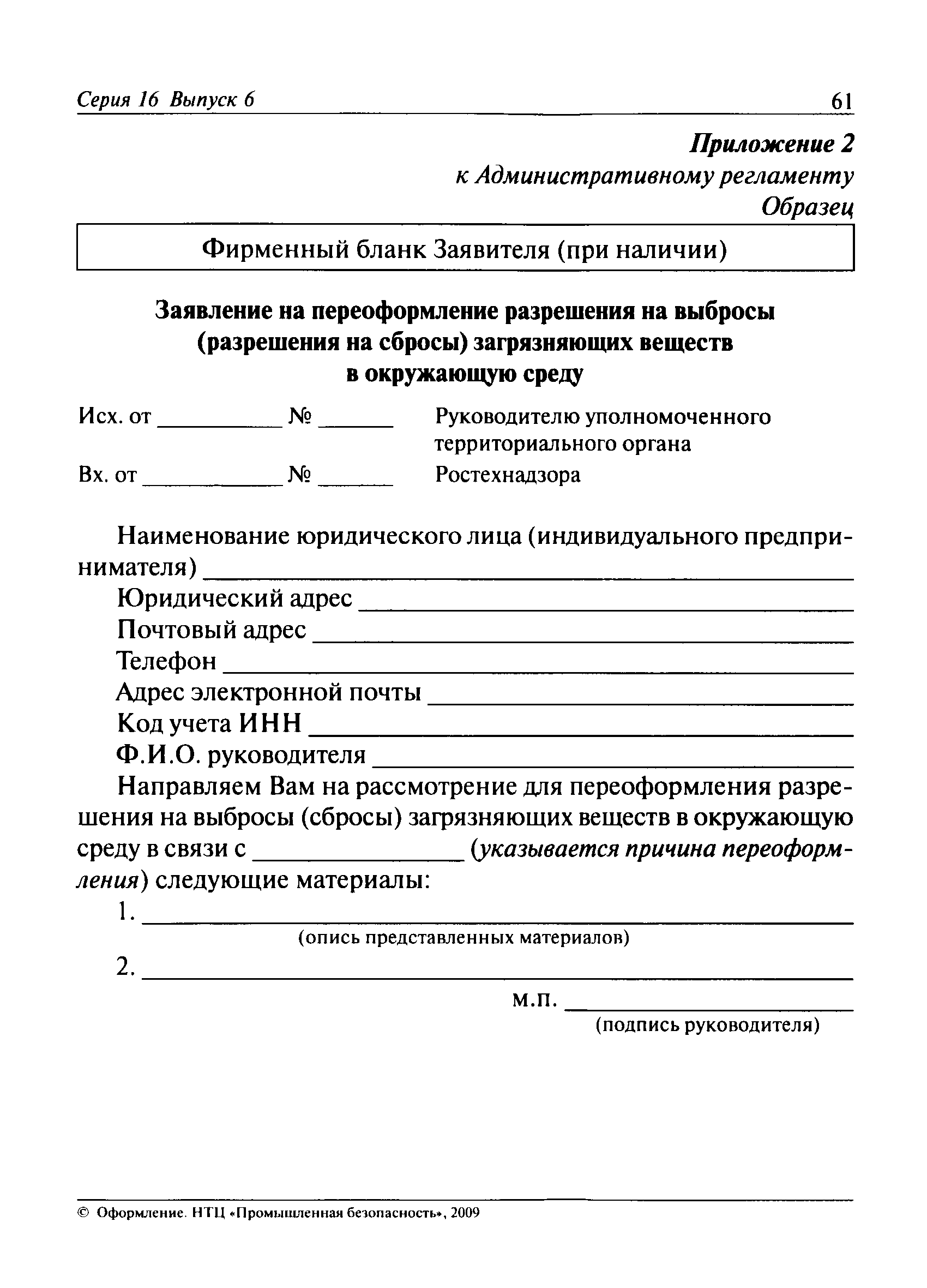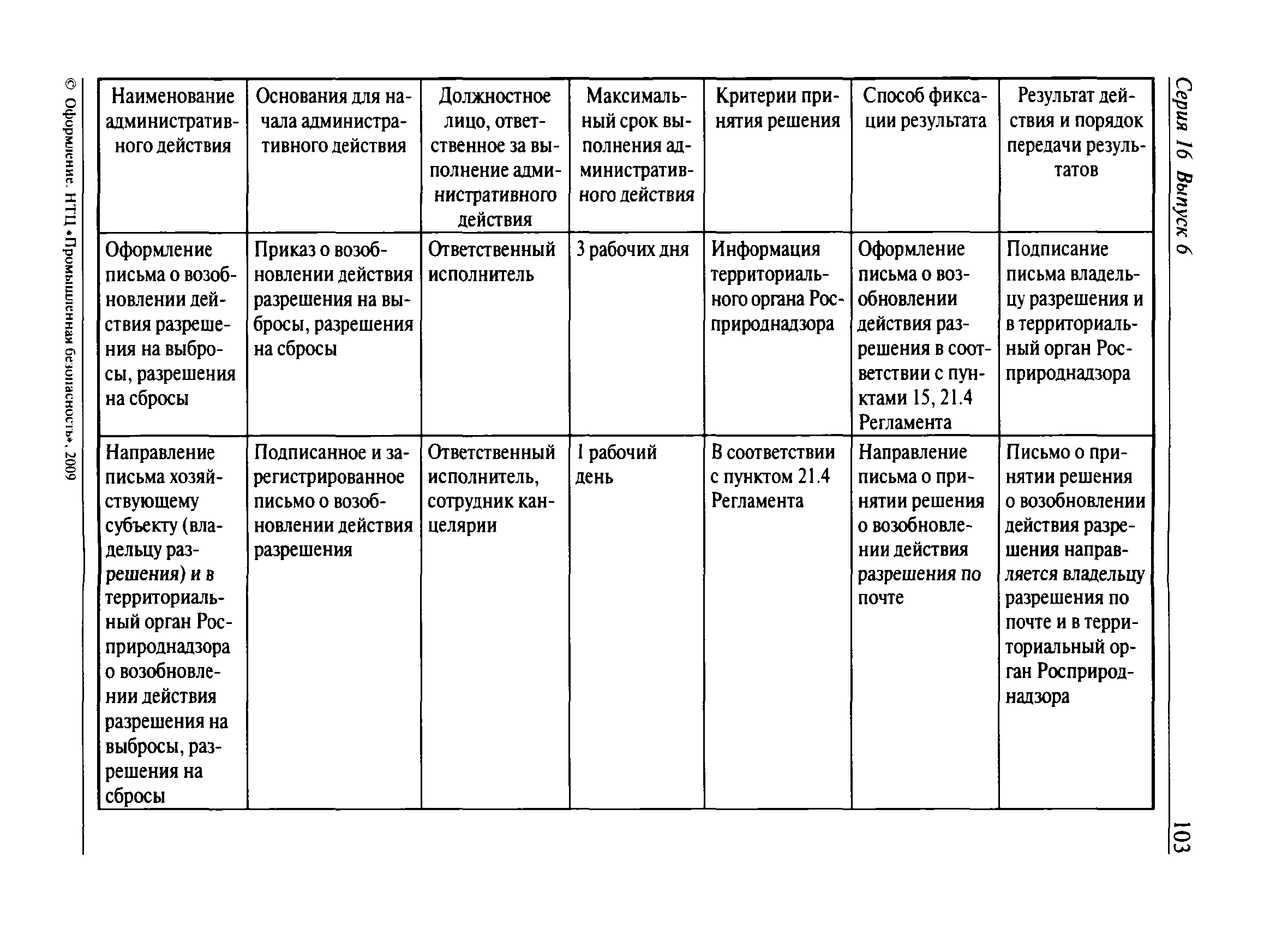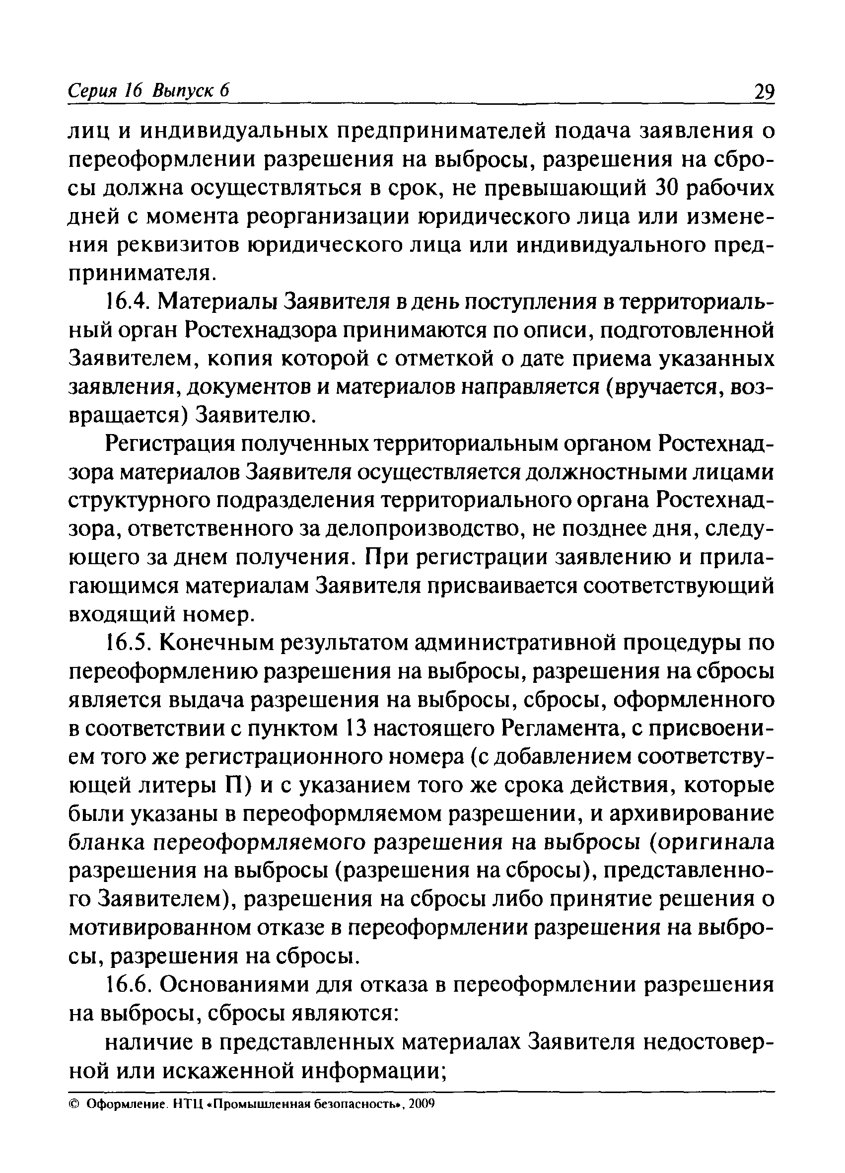 | Оглавление: | Приказ об утверждении 1. Общие положения 2. Требования к порядку исполнения государственной функции по выдаче разрешений на выбросы, сбросы загрязняющих веществ в окружающую среду 3. Административные процедуры 4. Порядок и формы контроля за исполнением государственной функции по выдаче разрешений на выбросы, сбросы загрязняющих веществ 5. Обжалование действий (бездействия) должностных лиц в ходе выполнения административных процедур при исполнении государственной функции по выдаче разрешений на выбросы, сбросы загрязняющих веществ Приложение 1. Заявление о выдаче разрешения на выбросы (разрешения на сбросы) загрязняющих веществ в окружающую среду Приложение 2. Заявление на переоформление разрешения на выбросы (разрешения на сбросы) загрязняющих веществ в окружающую среду Приложение 3. Список территориальных органов Ростехнадзора Приложение 4. План снижения выбросов загрязняющих веществ в атмосферный воздух Приложение 5. Разрешение на сброс загрязняющих веществ в окружающую среду Приложение 6. Письмо об отказе в выдаче разрешения на выбросы (разрешения на сбросы) загрязняющих веществ в окружающую среду Приложение 7. Письмо о приостановлении действия разрешения на выбросы (сбросы) загрязняющих веществ в окружающую среду Приложение 8. Письмо о возобновлении действия разрешения на выбросы (разрешения на сбросы) загрязняющих веществ в окружающую среду Приложение 9. Заявление на переоформление разрешения на выбросы (разрешения на сбросы) загрязняющих веществ в окружающую среду Приложение 10. Письмо об отказе в переоформлении разрешения на выбросы (сбросы) загрязняющих веществ в окружающую среду Приложение 11. Письмо об аннулировании разрешения на выбросы загрязняющих веществ в окружающую среду Приложение 12. Взаимосвязь административных процедур и блок-схема последовательности действий при исполнении государственной функции по выдаче разрешений на выбросы, сбросы загрязняющих веществ в окружающую среду Приложение 13. Описание последовательности и состава административных действий территориального органа Ростехнадзора при осуществлении административной процедуры по выдаче разрешения на выбросы, сбросы загрязняющих веществ в окружающую среду Приложение 14. Описание последовательности и состава административных действий территориального органа Ростехнадзора при осуществлении административной процедуры по приостановлению действия разрешения на выбросы, разрешения на сбросы Приложение 15. Описание последовательности и состава административных действий территориального органа Ростехнадзора при осуществлении административной процедуры по возобновлению действия разрешения на выбросы, разрешения на сбросы Приложение 16. Описание последовательности и состава административных действий территориального органа Ростехнадзора при осуществлении административной процедуры по переоформлению разрешения на выбросы, разрешения на сбросы Приложение 17. Описание последовательности и состава административных действий территориального органа Ростехнадзора при осуществлении административной процедуры по аннулированию разрешения на выбросы |