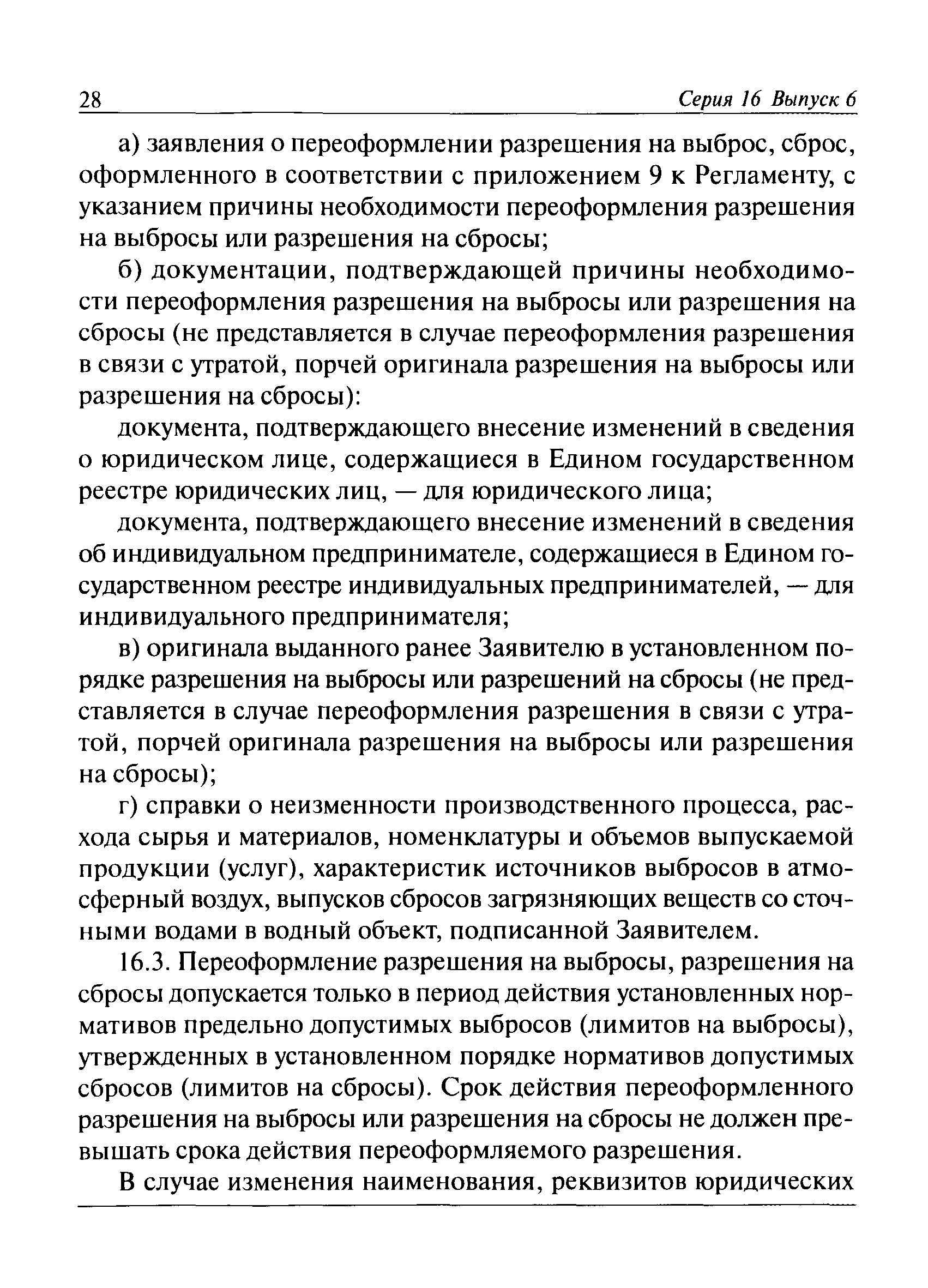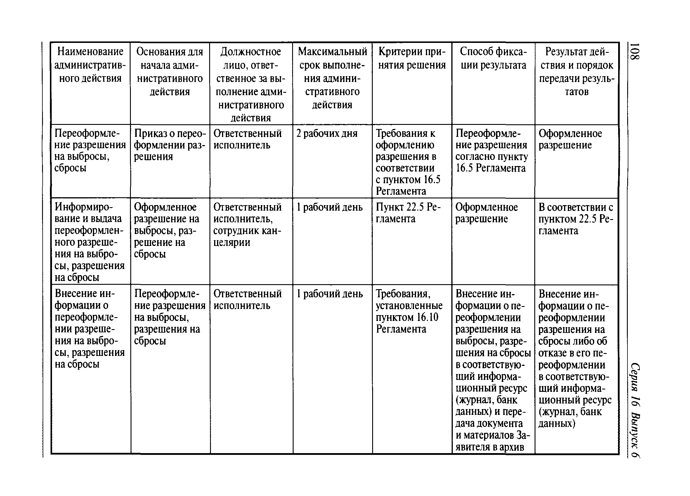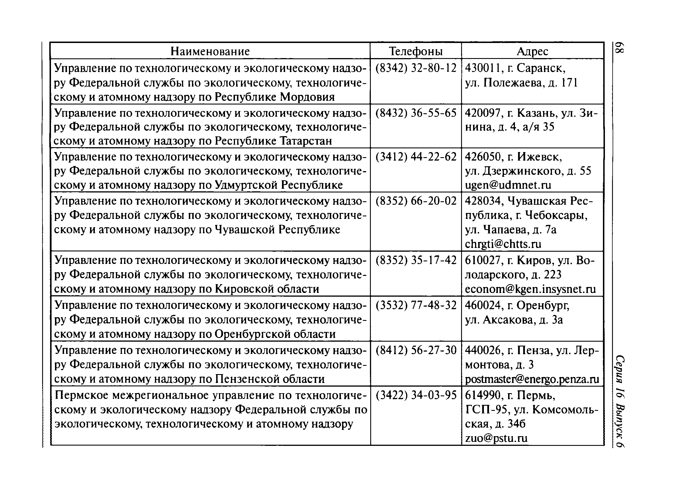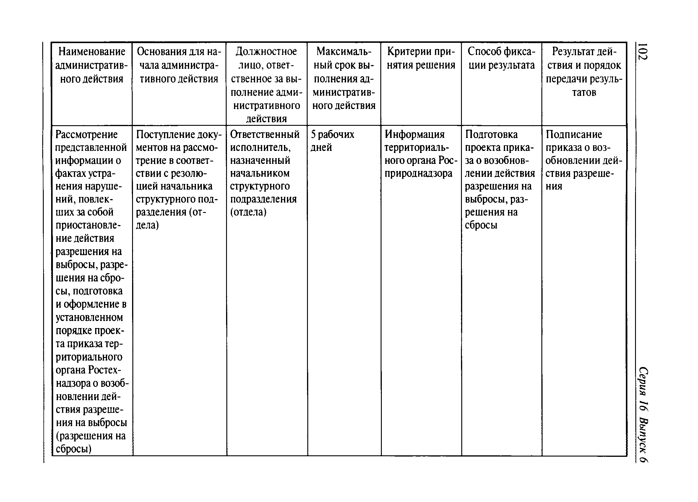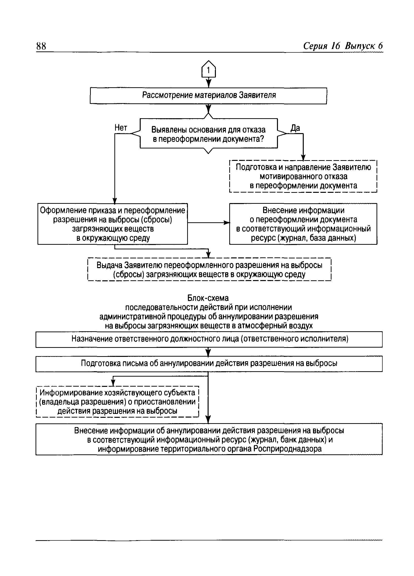 | Оглавление: | Приказ об утверждении 1. Общие положения 2. Требования к порядку исполнения государственной функции по выдаче разрешений на выбросы, сбросы загрязняющих веществ в окружающую среду 3. Административные процедуры 4. Порядок и формы контроля за исполнением государственной функции по выдаче разрешений на выбросы, сбросы загрязняющих веществ 5. Обжалование действий (бездействия) должностных лиц в ходе выполнения административных процедур при исполнении государственной функции по выдаче разрешений на выбросы, сбросы загрязняющих веществ Приложение 1. Заявление о выдаче разрешения на выбросы (разрешения на сбросы) загрязняющих веществ в окружающую среду Приложение 2. Заявление на переоформление разрешения на выбросы (разрешения на сбросы) загрязняющих веществ в окружающую среду Приложение 3. Список территориальных органов Ростехнадзора Приложение 4. План снижения выбросов загрязняющих веществ в атмосферный воздух Приложение 5. Разрешение на сброс загрязняющих веществ в окружающую среду Приложение 6. Письмо об отказе в выдаче разрешения на выбросы (разрешения на сбросы) загрязняющих веществ в окружающую среду Приложение 7. Письмо о приостановлении действия разрешения на выбросы (сбросы) загрязняющих веществ в окружающую среду Приложение 8. Письмо о возобновлении действия разрешения на выбросы (разрешения на сбросы) загрязняющих веществ в окружающую среду Приложение 9. Заявление на переоформление разрешения на выбросы (разрешения на сбросы) загрязняющих веществ в окружающую среду Приложение 10. Письмо об отказе в переоформлении разрешения на выбросы (сбросы) загрязняющих веществ в окружающую среду Приложение 11. Письмо об аннулировании разрешения на выбросы загрязняющих веществ в окружающую среду Приложение 12. Взаимосвязь административных процедур и блок-схема последовательности действий при исполнении государственной функции по выдаче разрешений на выбросы, сбросы загрязняющих веществ в окружающую среду Приложение 13. Описание последовательности и состава административных действий территориального органа Ростехнадзора при осуществлении административной процедуры по выдаче разрешения на выбросы, сбросы загрязняющих веществ в окружающую среду Приложение 14. Описание последовательности и состава административных действий территориального органа Ростехнадзора при осуществлении административной процедуры по приостановлению действия разрешения на выбросы, разрешения на сбросы Приложение 15. Описание последовательности и состава административных действий территориального органа Ростехнадзора при осуществлении административной процедуры по возобновлению действия разрешения на выбросы, разрешения на сбросы Приложение 16. Описание последовательности и состава административных действий территориального органа Ростехнадзора при осуществлении административной процедуры по переоформлению разрешения на выбросы, разрешения на сбросы Приложение 17. Описание последовательности и состава административных действий территориального органа Ростехнадзора при осуществлении административной процедуры по аннулированию разрешения на выбросы |