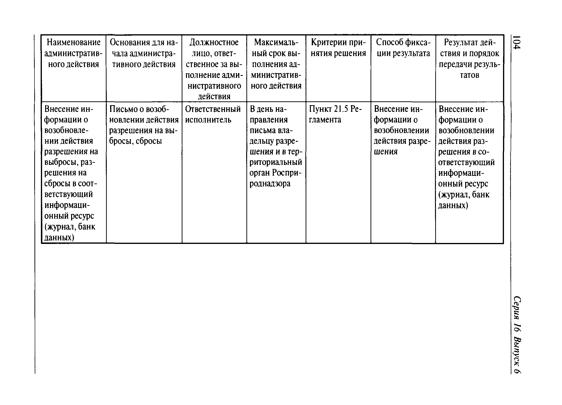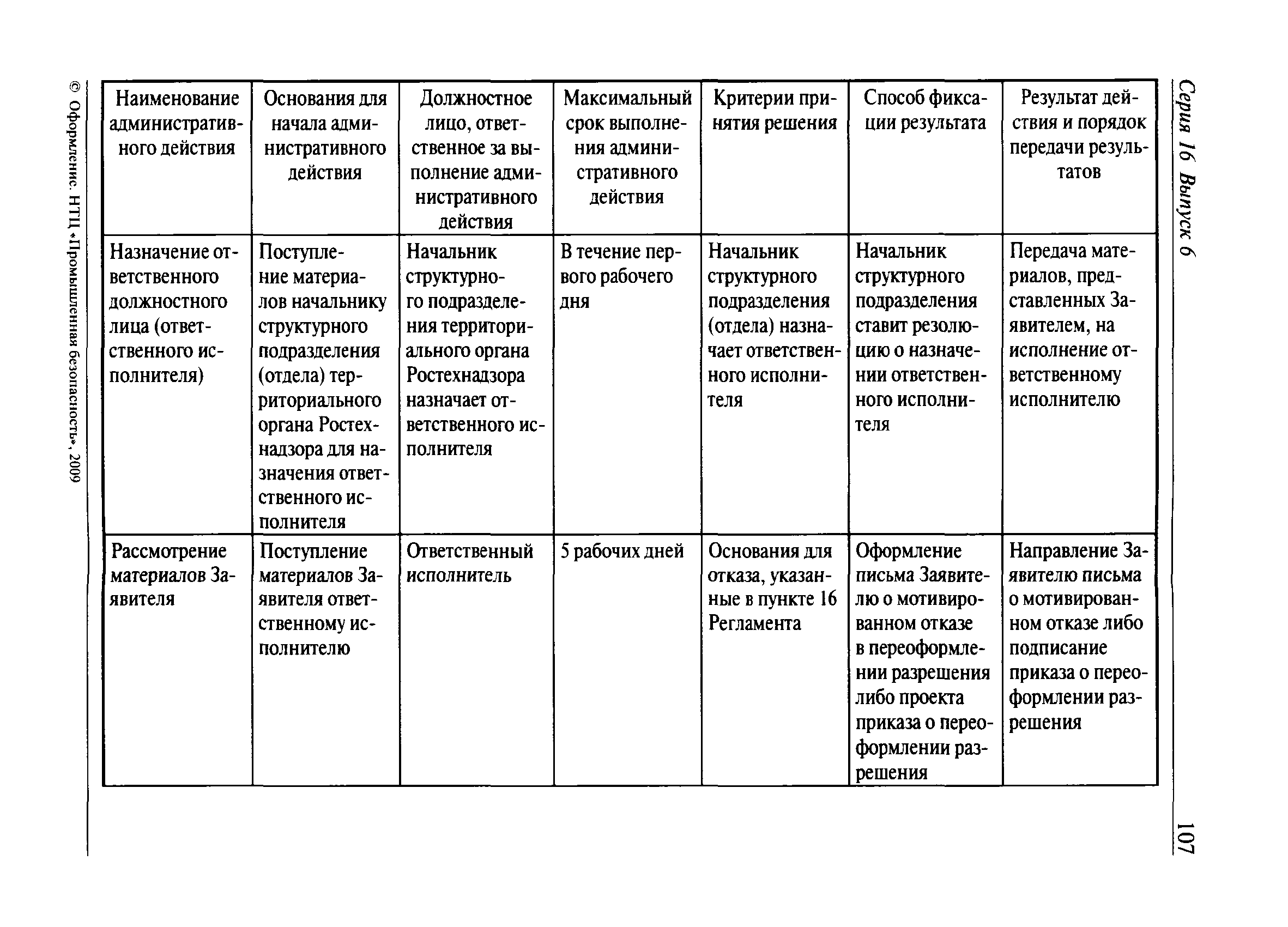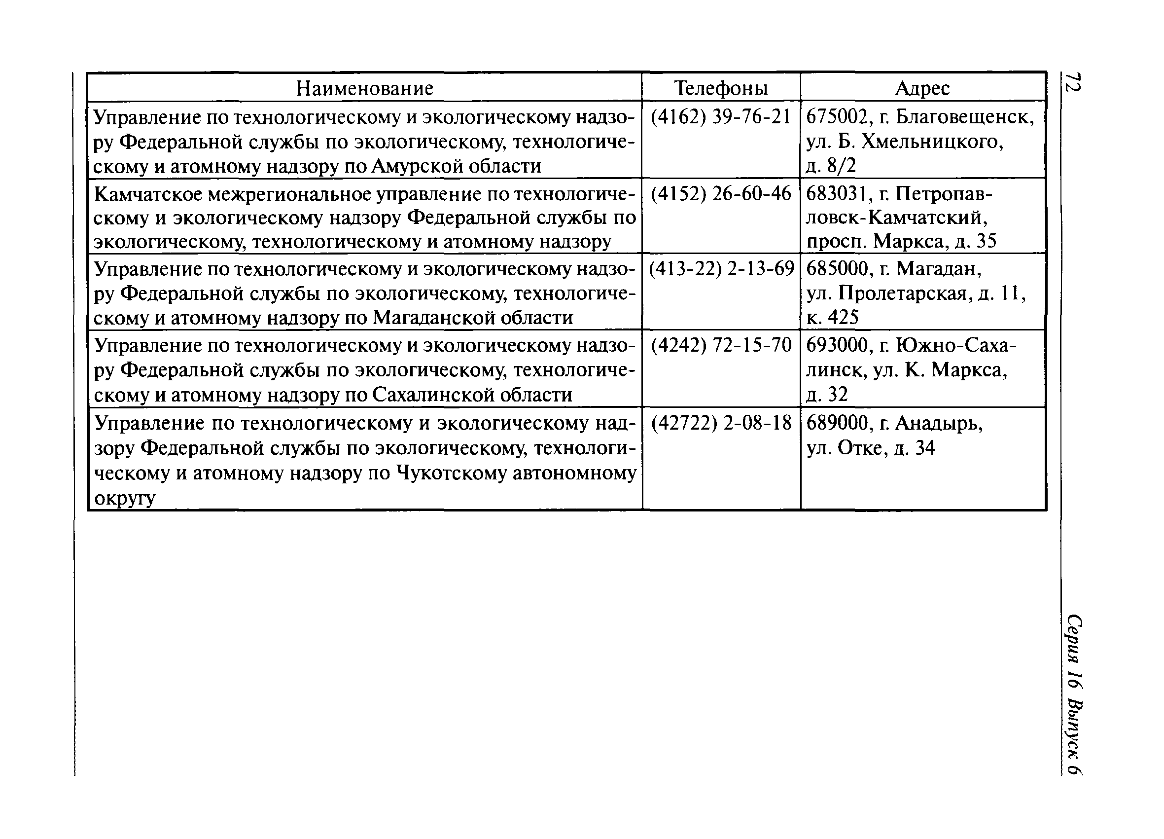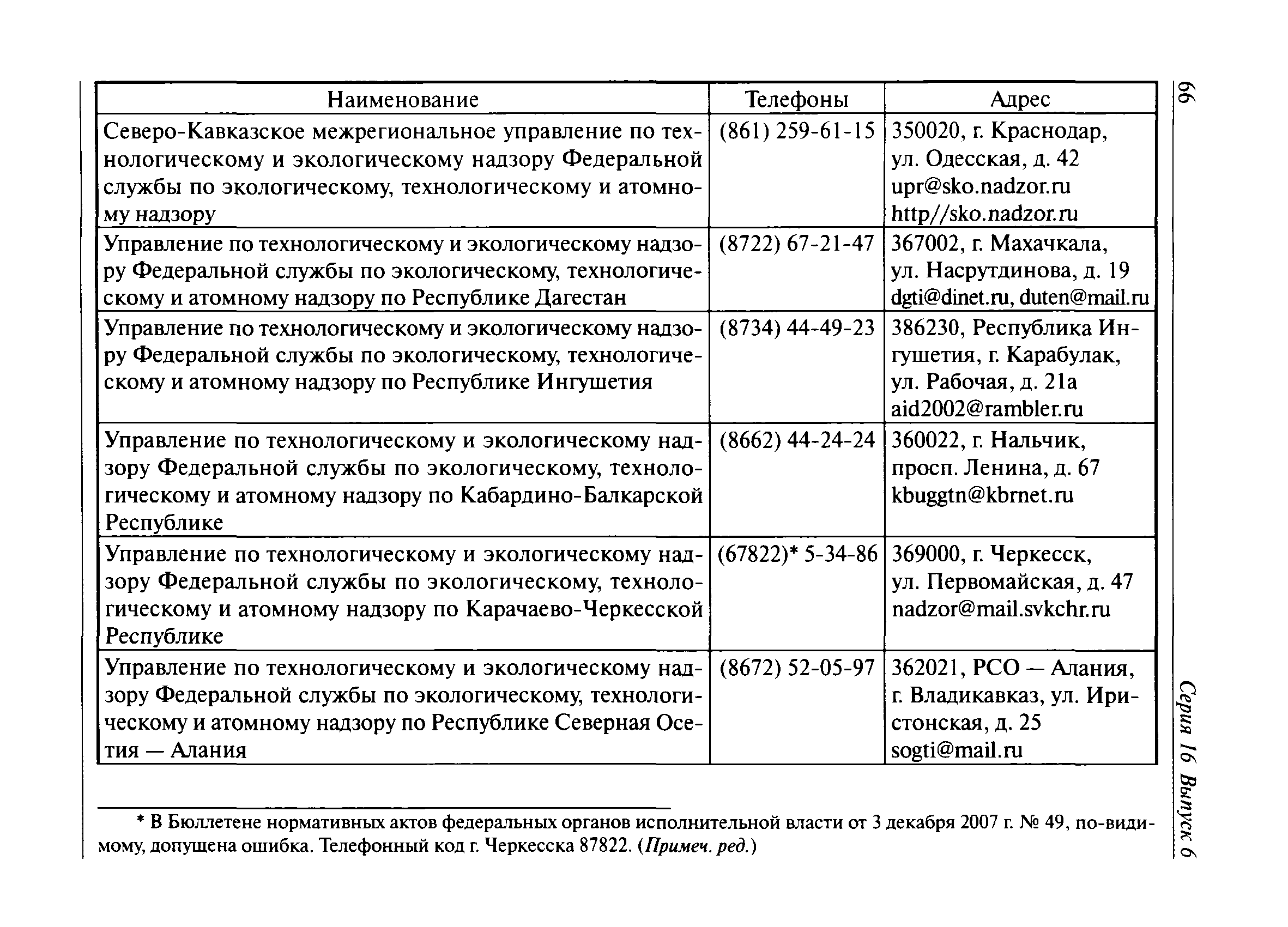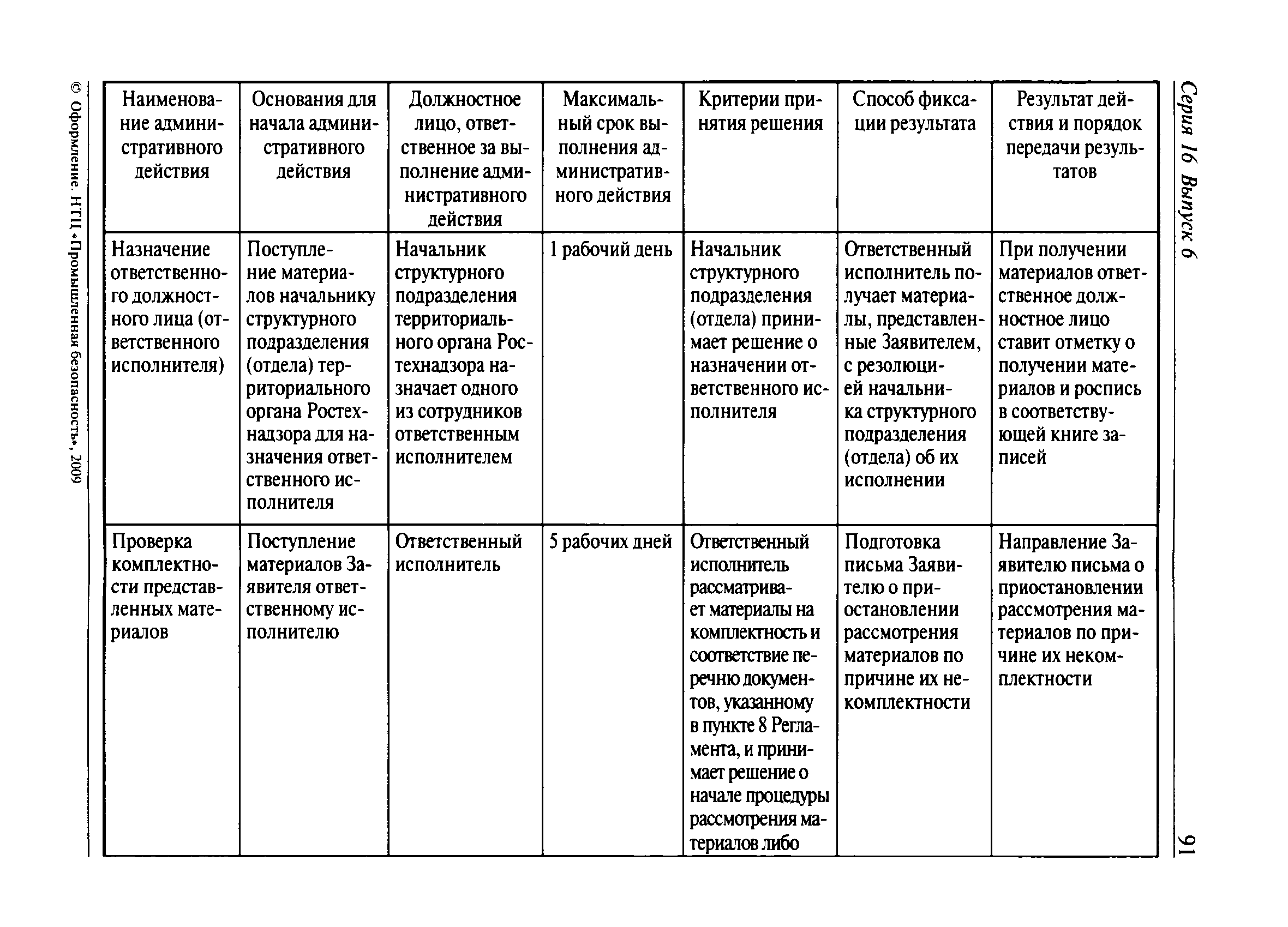 | Оглавление: | Приказ об утверждении 1. Общие положения 2. Требования к порядку исполнения государственной функции по выдаче разрешений на выбросы, сбросы загрязняющих веществ в окружающую среду 3. Административные процедуры 4. Порядок и формы контроля за исполнением государственной функции по выдаче разрешений на выбросы, сбросы загрязняющих веществ 5. Обжалование действий (бездействия) должностных лиц в ходе выполнения административных процедур при исполнении государственной функции по выдаче разрешений на выбросы, сбросы загрязняющих веществ Приложение 1. Заявление о выдаче разрешения на выбросы (разрешения на сбросы) загрязняющих веществ в окружающую среду Приложение 2. Заявление на переоформление разрешения на выбросы (разрешения на сбросы) загрязняющих веществ в окружающую среду Приложение 3. Список территориальных органов Ростехнадзора Приложение 4. План снижения выбросов загрязняющих веществ в атмосферный воздух Приложение 5. Разрешение на сброс загрязняющих веществ в окружающую среду Приложение 6. Письмо об отказе в выдаче разрешения на выбросы (разрешения на сбросы) загрязняющих веществ в окружающую среду Приложение 7. Письмо о приостановлении действия разрешения на выбросы (сбросы) загрязняющих веществ в окружающую среду Приложение 8. Письмо о возобновлении действия разрешения на выбросы (разрешения на сбросы) загрязняющих веществ в окружающую среду Приложение 9. Заявление на переоформление разрешения на выбросы (разрешения на сбросы) загрязняющих веществ в окружающую среду Приложение 10. Письмо об отказе в переоформлении разрешения на выбросы (сбросы) загрязняющих веществ в окружающую среду Приложение 11. Письмо об аннулировании разрешения на выбросы загрязняющих веществ в окружающую среду Приложение 12. Взаимосвязь административных процедур и блок-схема последовательности действий при исполнении государственной функции по выдаче разрешений на выбросы, сбросы загрязняющих веществ в окружающую среду Приложение 13. Описание последовательности и состава административных действий территориального органа Ростехнадзора при осуществлении административной процедуры по выдаче разрешения на выбросы, сбросы загрязняющих веществ в окружающую среду Приложение 14. Описание последовательности и состава административных действий территориального органа Ростехнадзора при осуществлении административной процедуры по приостановлению действия разрешения на выбросы, разрешения на сбросы Приложение 15. Описание последовательности и состава административных действий территориального органа Ростехнадзора при осуществлении административной процедуры по возобновлению действия разрешения на выбросы, разрешения на сбросы Приложение 16. Описание последовательности и состава административных действий территориального органа Ростехнадзора при осуществлении административной процедуры по переоформлению разрешения на выбросы, разрешения на сбросы Приложение 17. Описание последовательности и состава административных действий территориального органа Ростехнадзора при осуществлении административной процедуры по аннулированию разрешения на выбросы |