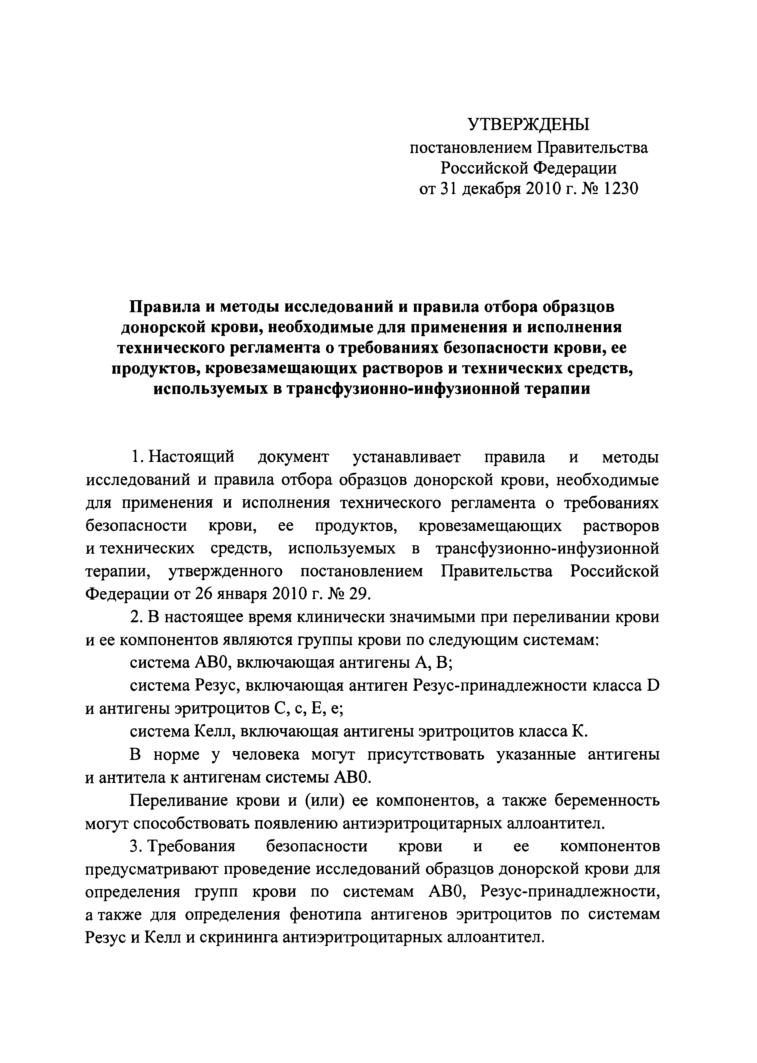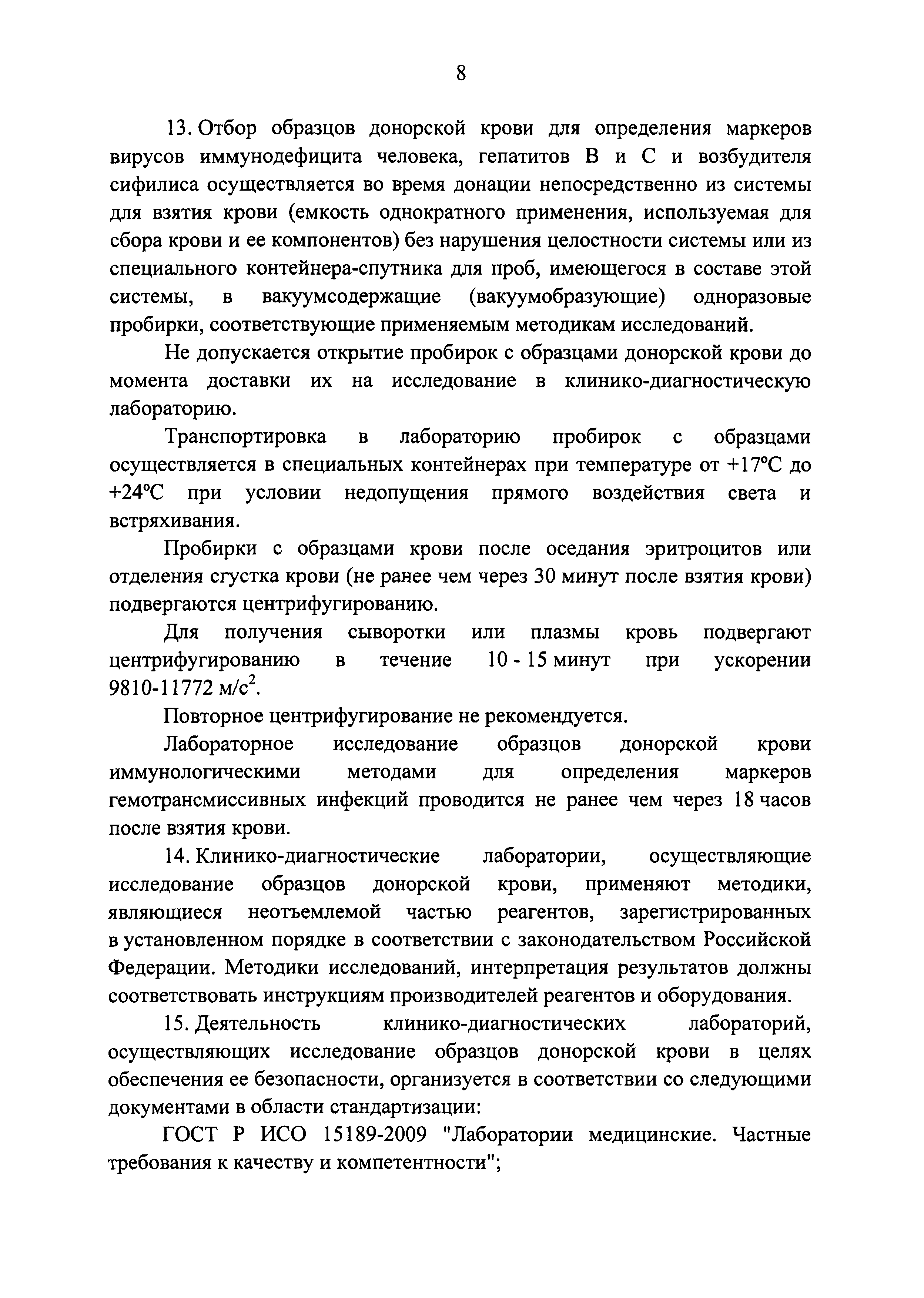 Правила и методы исследований и правила отбора образцов донорской крови, необходимые для применения и исполнения технического регламента о требованиях безопасности крови, ее продуктов, кровезамещающих растворов и технических средств, используемых в трансфузионно-инфузионной терапии| Статус: | утратил силу | | Название рус.: | Правила и методы исследований и правила отбора образцов донорской крови, необходимые для применения и исполнения технического регламента о требованиях безопасности крови, ее продуктов, кровезамещающих растворов и технических средств, используемых в трансфузионно-инфузионной терапии | | Дата добавления в базу: | 01.09.2013 | | Дата актуализации: | 01.01.2021 | | Дата введения: | 25.01.2011 | | Дата окончания срока действия: | 10.07.2019 | | Область применения: | Документ устанавливает правила и методы исследований и правила отбора образцов донорской крови, необходимые для применения и исполнения технического регламента о требованиях безопасности крови, ее продуктов, кровезамещающих растворов и технических средств, используемых в трансфузионно-инфузионной терапии | | Утверждён: | 31.12.2010 Правительство Российской Федерации (1230)
