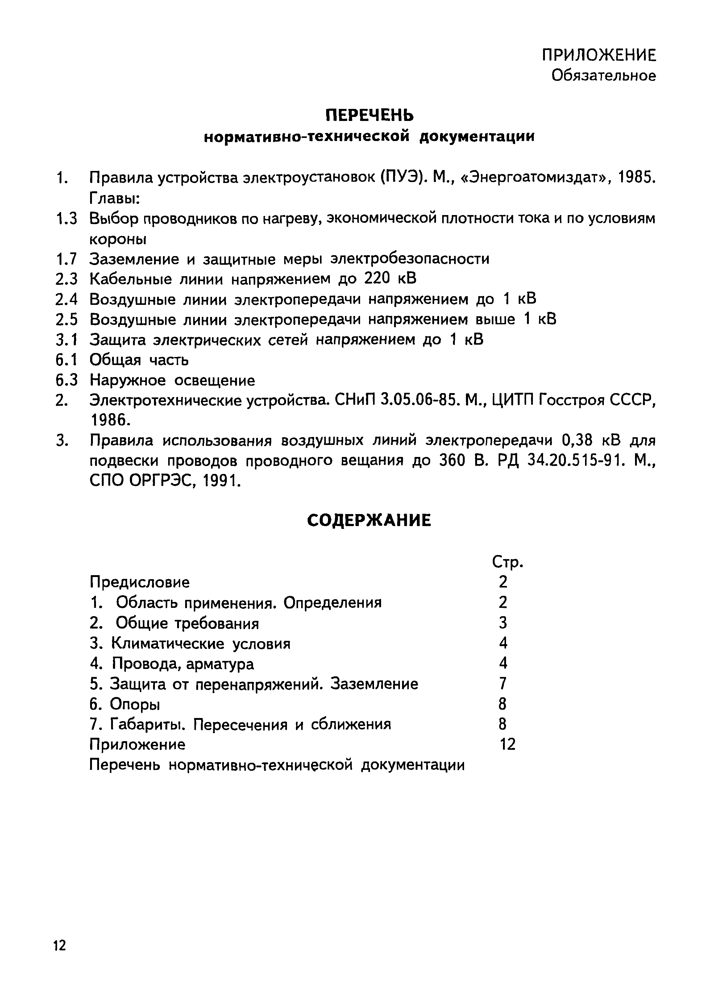 | Оглавление: | Предисловие 1 Область применения. Определения 2 Общие требования 3 Климатические условия 4 Провода, арматура 5 Защита от перенапряжений. Заземление 6 Опоры 7 Габариты. Пересечения и сближения Приложение. Перечень нормативно-технической документации |