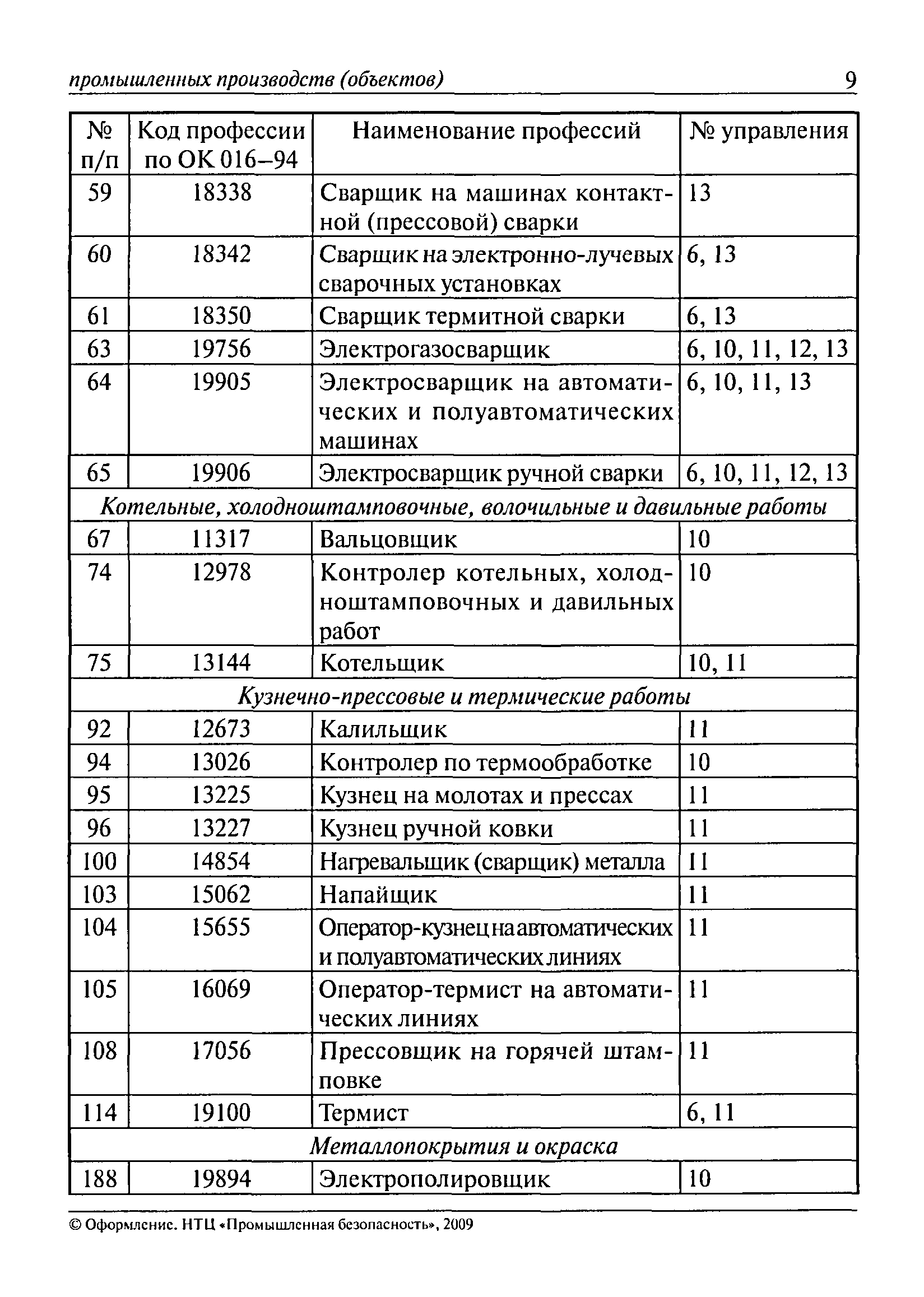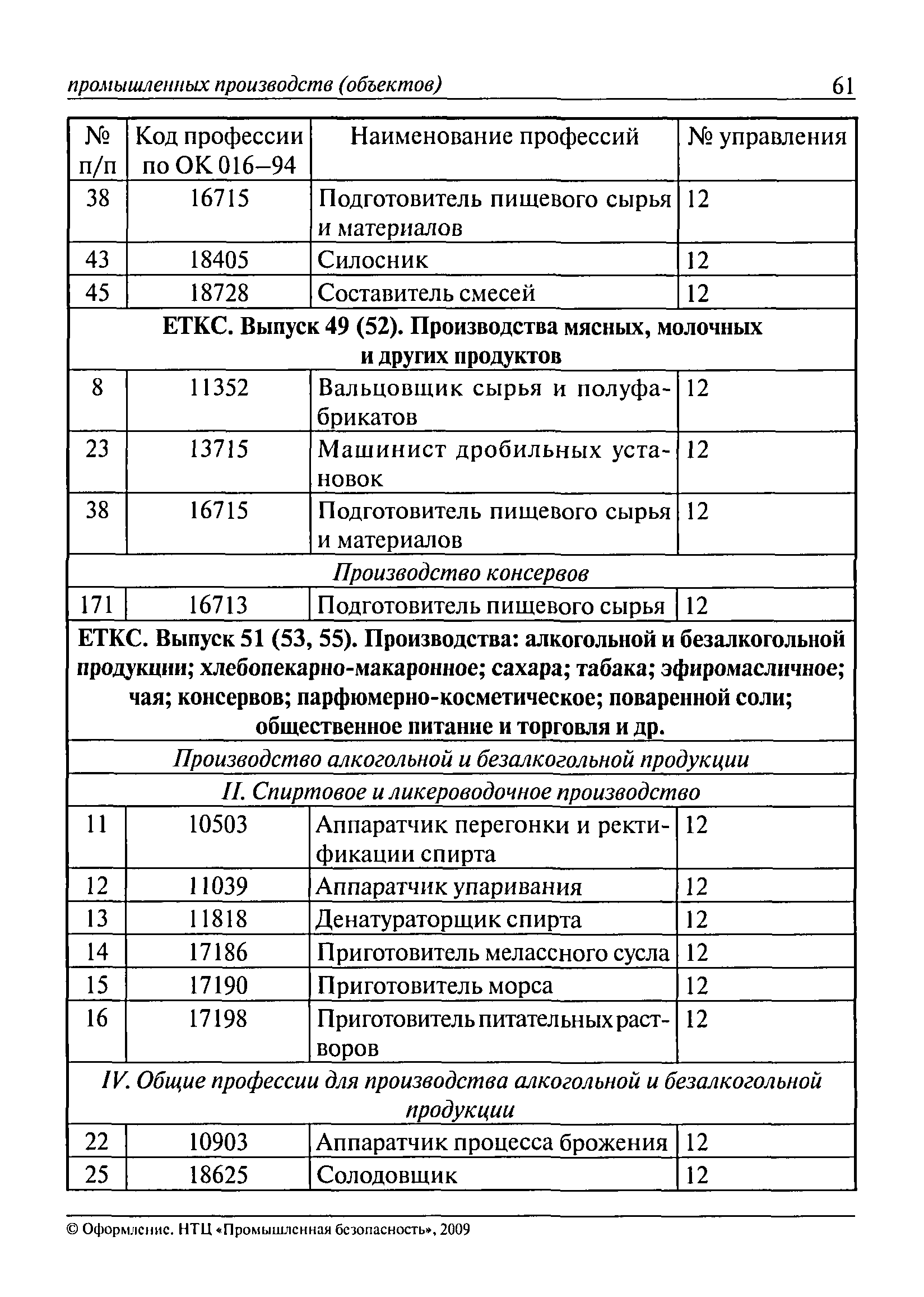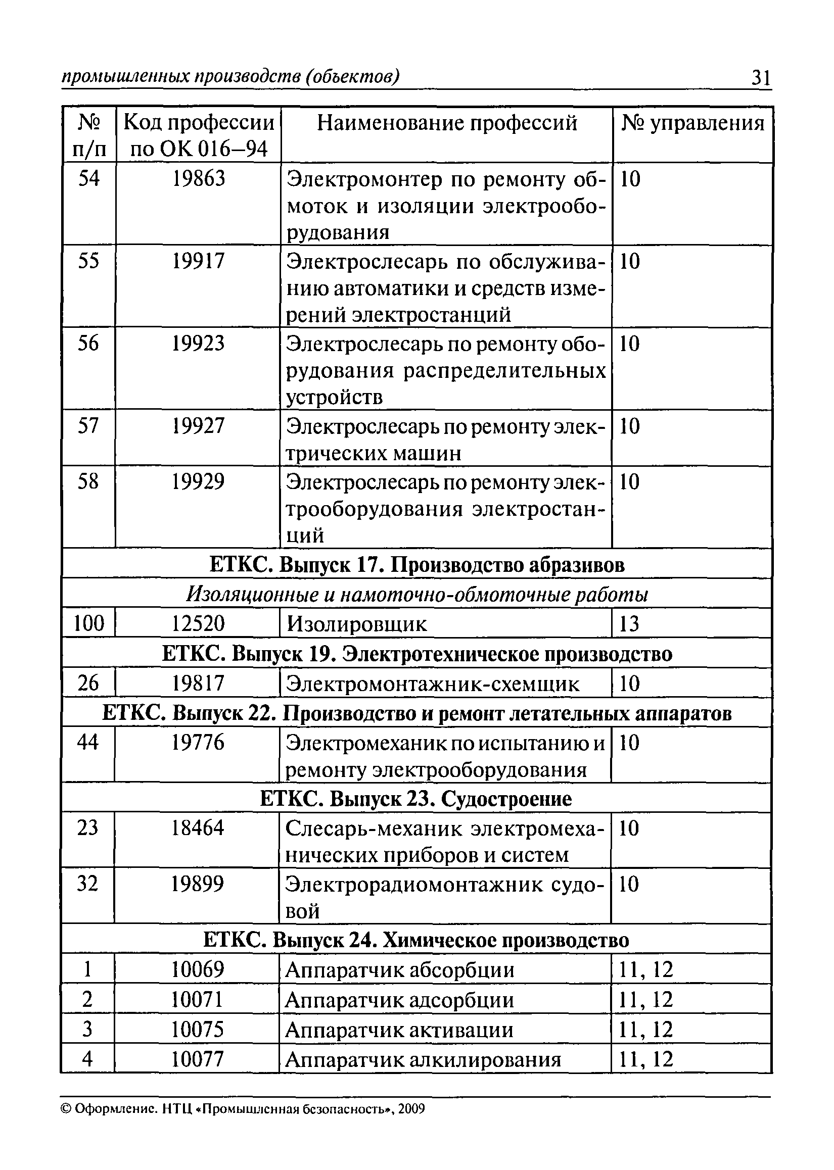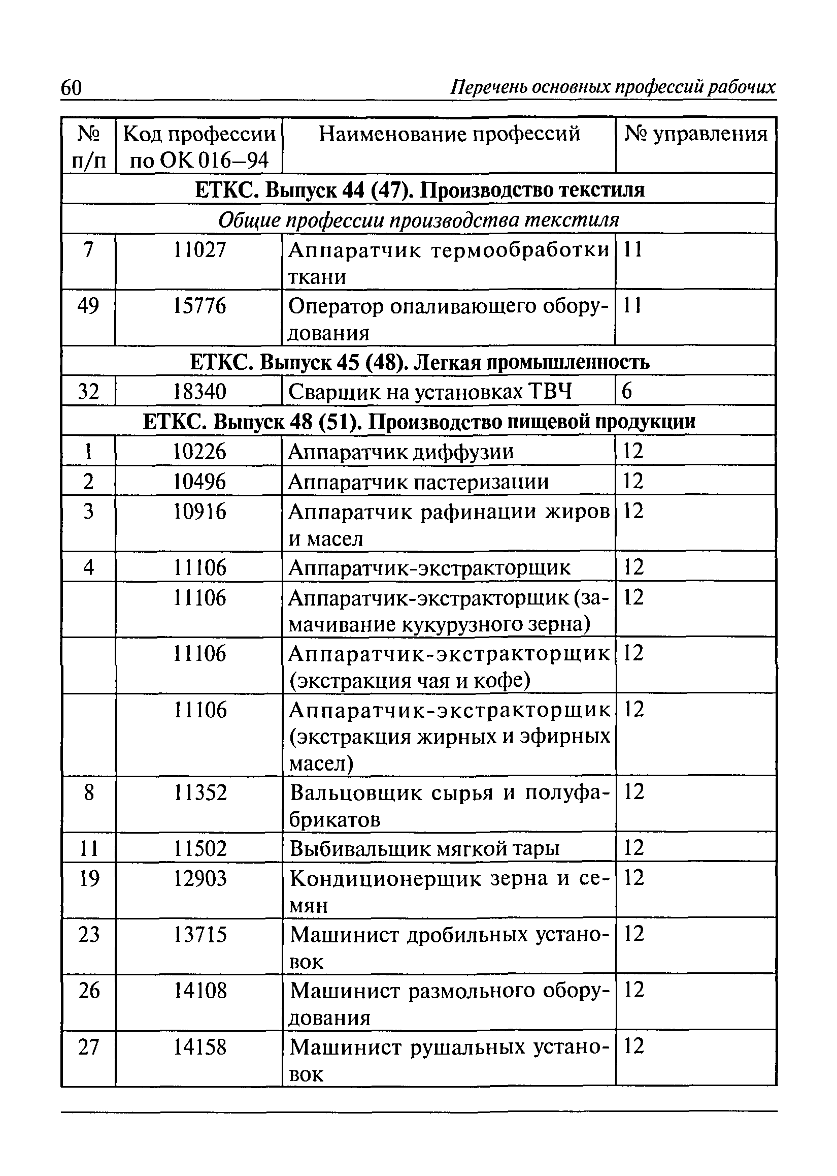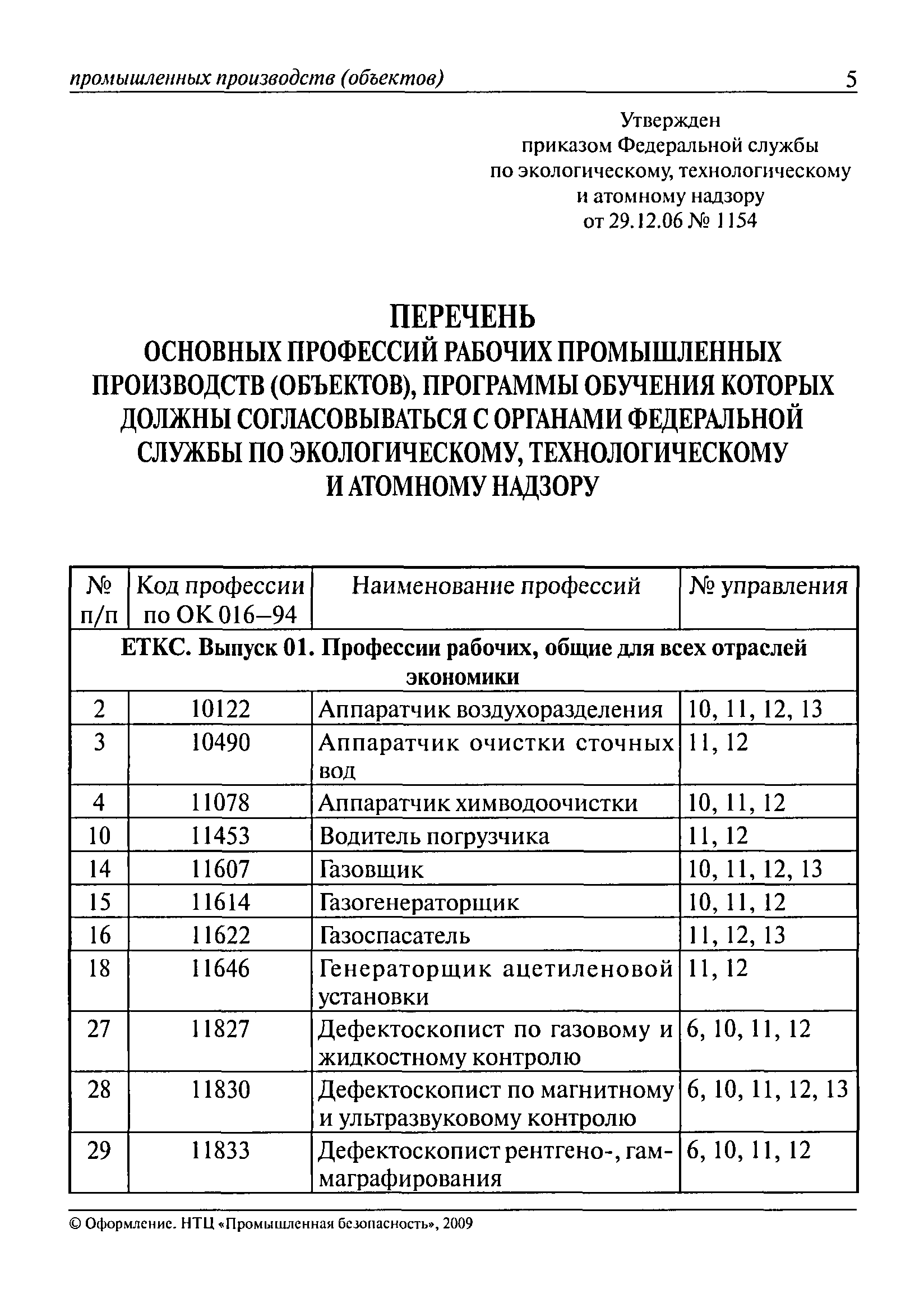 Перечень основных профессий рабочих промышленных производств (объектов), программы обучения которых должны согласовываться с органами федеральной службы по экологическому, технологическому и атомному надзору| Статус: | утратил силу | | Название рус.: | Перечень основных профессий рабочих промышленных производств (объектов), программы обучения которых должны согласовываться с органами федеральной службы по экологическому, технологическому и атомному надзору | | Дата добавления в базу: | 01.09.2013 | | Дата актуализации: | 01.01.2021 | | Дата введения: | 29.12.2006 | | Дата окончания срока действия: | 19.08.2015 | | Область применения: | Перечень разработан в целях систематизации деятельности в области профессионального обучения. Перечень приведен в соответствии с действующими нормативными правовыми актами, определяющими сферу деятельности Федеральной службы по экологическому, технологическому и атомному надзору. | | Оглавление: | ЕТКС. Выпуск 01. Профессии рабочих, общие для всех отраслей экономики ЕТКС. Выпуск 02. ЕТКС. Выпуск 03. Строительные, монтажные и ремонтно-строительные работы ЕТКС. Выпуск 04. Горные работы ЕТКС. Выпуск 06. Добыча нефти и газа ЕТКС. Выпуск 07. Черная металлургия ЕТКС. Выпуск 08. Цветная металлургия ЕТКС. Выпуск 09. Эксплуатация оборудования электростанций и сетей и др. ЕТКС. Выпуск 17. Производство абразивов ЕТКС. Выпуск 19. Электротехническое производство ЕТКС. Выпуск 22. Производство и ремонт летательных аппаратов ЕТКС. Выпуск 23. Судостроение ЕТКС. Выпуск 24. Химическое производство ЕТКС. Выпуск 25. Азотное производство ЕТКС. Выпуск 26. Анилинокрасочное производство ЕТКС. Выпуск 27. Производство синтетических смол и др. ЕТКС. Выпуск 28 (28, 29). Производство стекловолокон и др. ЕТКС. Выпуск 29. (30, 31). Гидролизное производство ЕТКС. Выпуск 30. (32). Производство синтетических каучуков и др. ЕТКС. Выпуск 31. (33). Производство резиновых изделий ЕТКС. Выпуск 32 (34). Химико-фотографическое производство ЕТКС. Выпуск 33 (35). Производство искусственной кожи ЕТКС. Выпуск 34 (36). Переработка нефти ЕТКС. Выпуск 36 (38). Производство асбестовых технических изделий ЕТКС. Выпуск 37 (39). Лесозаготовительные работы ЕТКС. Выпуск 39 (41). Производство целлюлозы и др. ЕТКС. Выпуск 40 (42, 43). Производство строительных материалов ЕТКС. Выпуск 41 (44). Производство стекла стеклоизделий ЕТКС. Выпуск 42 (45). Производство керамических, фарфоровых и других изделий ЕТКС. Выпуск 44 (47). Производство текстиля ЕТКС. Выпуск 45 (48). Легкая промышленность ЕТКС. Выпуск 48 (51). Производство пищевой продукции ЕТКС. Выпуск 49 (52). Производства мясных, молочных и других продуктов ЕТКС. Выпуск 51 (53, 55). Производства: алкогольной и безалкогольной продукции; хлебопекарно-макаронное; сахара; табака; эфирномасляничное; чая; консервов; парфюмерно-косметическое; поваренной соли; общественное питание и торговля и др. ЕТКС. Выпуск 52 (56). Транспорт (железнодорожный, автомобильный, городской, морской, речной, метрополитен) ЕТКС. Выпуск 54 (58). Связь ЕТКС. Выпуск 63 (69). Газовое, водопроводно-канализационное и зеленое хозяйства Категория 73 Наименования управлений | | Утверждён: | 29.12.2006 Федеральная служба по экологическому, технологическому и атомному надзору (1154)