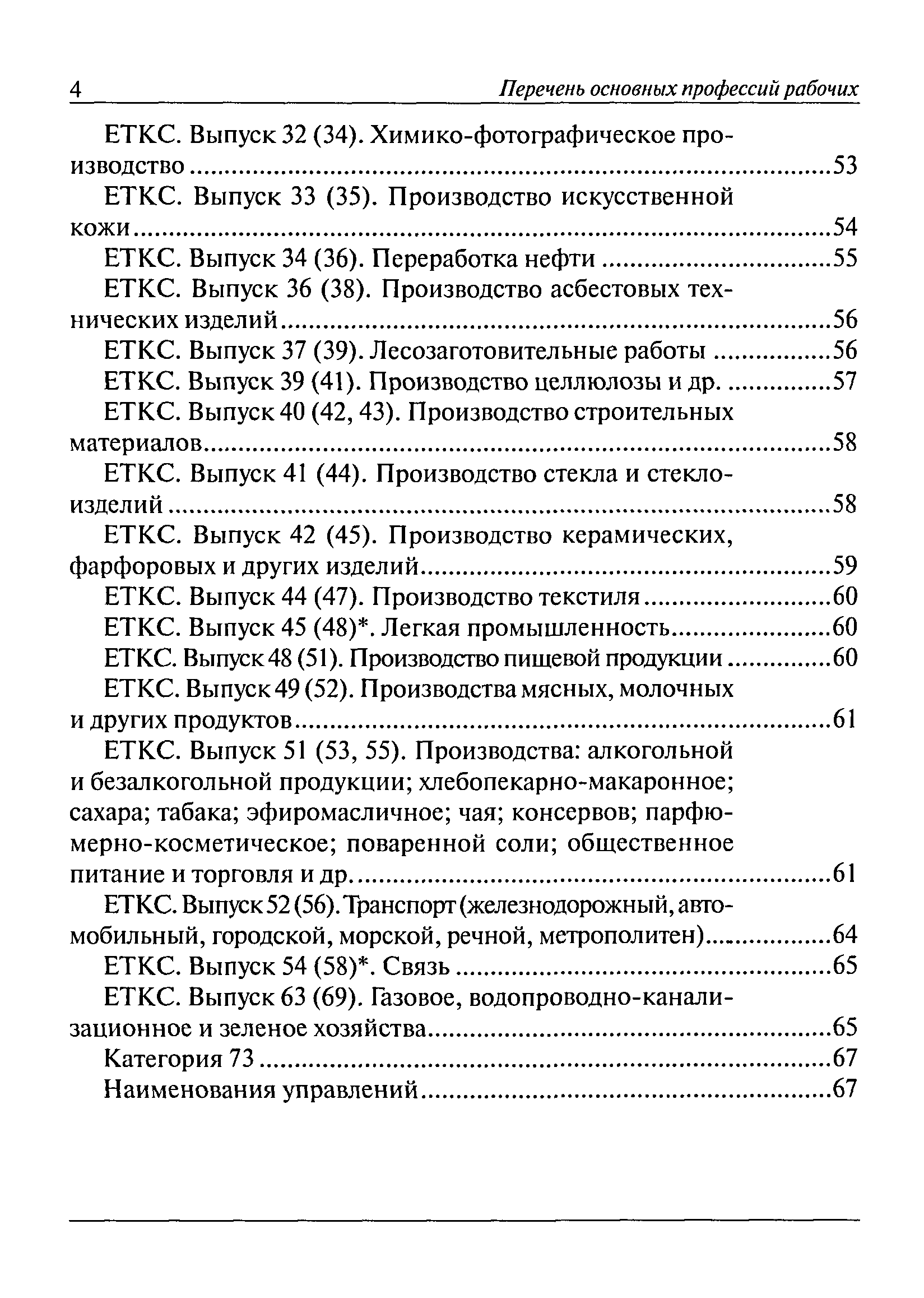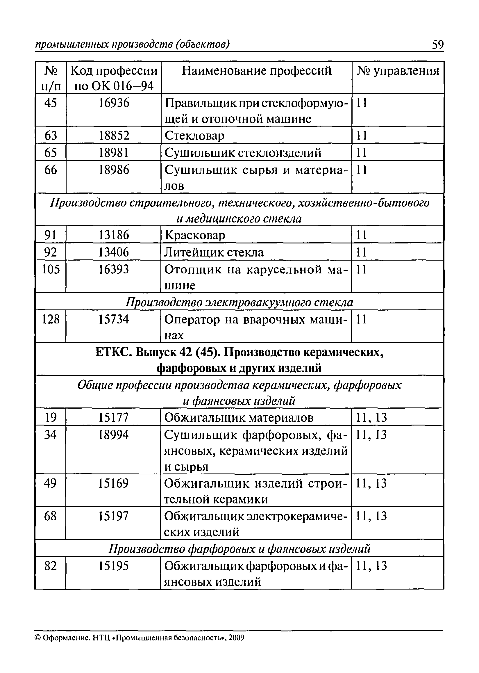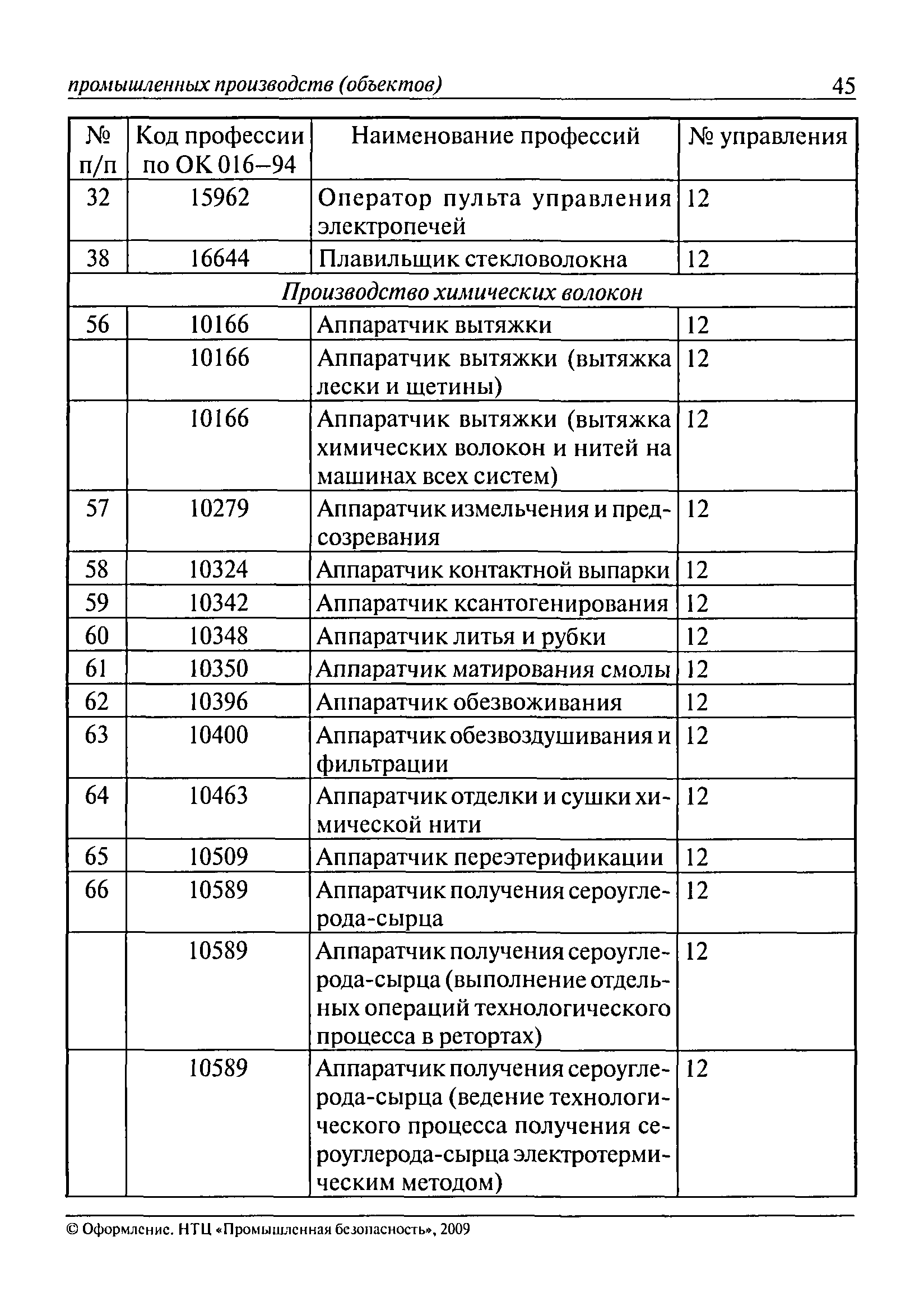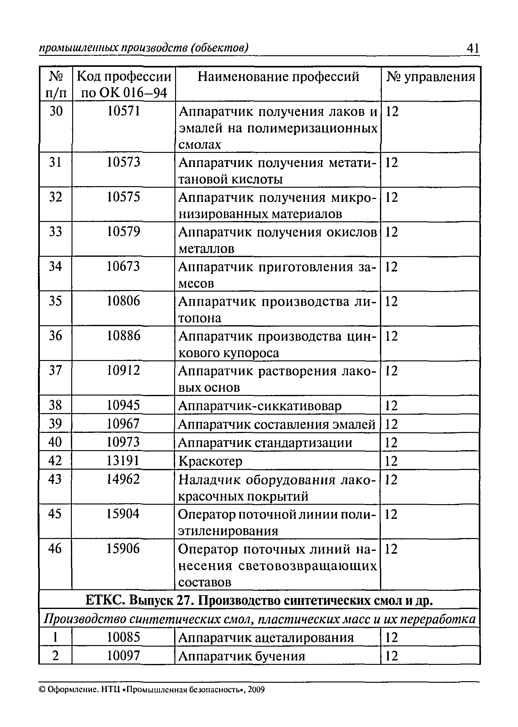 Перечень основных профессий рабочих промышленных производств (объектов), программы обучения которых должны согласовываться с органами федеральной службы по экологическому, технологическому и атомному надзору| Статус: | утратил силу | | Название рус.: | Перечень основных профессий рабочих промышленных производств (объектов), программы обучения которых должны согласовываться с органами федеральной службы по экологическому, технологическому и атомному надзору | | Дата добавления в базу: | 01.09.2013 | | Дата актуализации: | 01.01.2021 | | Дата введения: | 29.12.2006 | | Дата окончания срока действия: | 19.08.2015 | | Область применения: | Перечень разработан в целях систематизации деятельности в области профессионального обучения. Перечень приведен в соответствии с действующими нормативными правовыми актами, определяющими сферу деятельности Федеральной службы по экологическому, технологическому и атомному надзору. | | Оглавление: | ЕТКС. Выпуск 01. Профессии рабочих, общие для всех отраслей экономики ЕТКС. Выпуск 02. ЕТКС. Выпуск 03. Строительные, монтажные и ремонтно-строительные работы ЕТКС. Выпуск 04. Горные работы ЕТКС. Выпуск 06. Добыча нефти и газа ЕТКС. Выпуск 07. Черная металлургия ЕТКС. Выпуск 08. Цветная металлургия ЕТКС. Выпуск 09. Эксплуатация оборудования электростанций и сетей и др. ЕТКС. Выпуск 17. Производство абразивов ЕТКС. Выпуск 19. Электротехническое производство ЕТКС. Выпуск 22. Производство и ремонт летательных аппаратов ЕТКС. Выпуск 23. Судостроение ЕТКС. Выпуск 24. Химическое производство ЕТКС. Выпуск 25. Азотное производство ЕТКС. Выпуск 26. Анилинокрасочное производство ЕТКС. Выпуск 27. Производство синтетических смол и др. ЕТКС. Выпуск 28 (28, 29). Производство стекловолокон и др. ЕТКС. Выпуск 29. (30, 31). Гидролизное производство ЕТКС. Выпуск 30. (32). Производство синтетических каучуков и др. ЕТКС. Выпуск 31. (33). Производство резиновых изделий ЕТКС. Выпуск 32 (34). Химико-фотографическое производство ЕТКС. Выпуск 33 (35). Производство искусственной кожи ЕТКС. Выпуск 34 (36). Переработка нефти ЕТКС. Выпуск 36 (38). Производство асбестовых технических изделий ЕТКС. Выпуск 37 (39). Лесозаготовительные работы ЕТКС. Выпуск 39 (41). Производство целлюлозы и др. ЕТКС. Выпуск 40 (42, 43). Производство строительных материалов ЕТКС. Выпуск 41 (44). Производство стекла стеклоизделий ЕТКС. Выпуск 42 (45). Производство керамических, фарфоровых и других изделий ЕТКС. Выпуск 44 (47). Производство текстиля ЕТКС. Выпуск 45 (48). Легкая промышленность ЕТКС. Выпуск 48 (51). Производство пищевой продукции ЕТКС. Выпуск 49 (52). Производства мясных, молочных и других продуктов ЕТКС. Выпуск 51 (53, 55). Производства: алкогольной и безалкогольной продукции; хлебопекарно-макаронное; сахара; табака; эфирномасляничное; чая; консервов; парфюмерно-косметическое; поваренной соли; общественное питание и торговля и др. ЕТКС. Выпуск 52 (56). Транспорт (железнодорожный, автомобильный, городской, морской, речной, метрополитен) ЕТКС. Выпуск 54 (58). Связь ЕТКС. Выпуск 63 (69). Газовое, водопроводно-канализационное и зеленое хозяйства Категория 73 Наименования управлений | | Утверждён: | 29.12.2006 Федеральная служба по экологическому, технологическому и атомному надзору (1154)