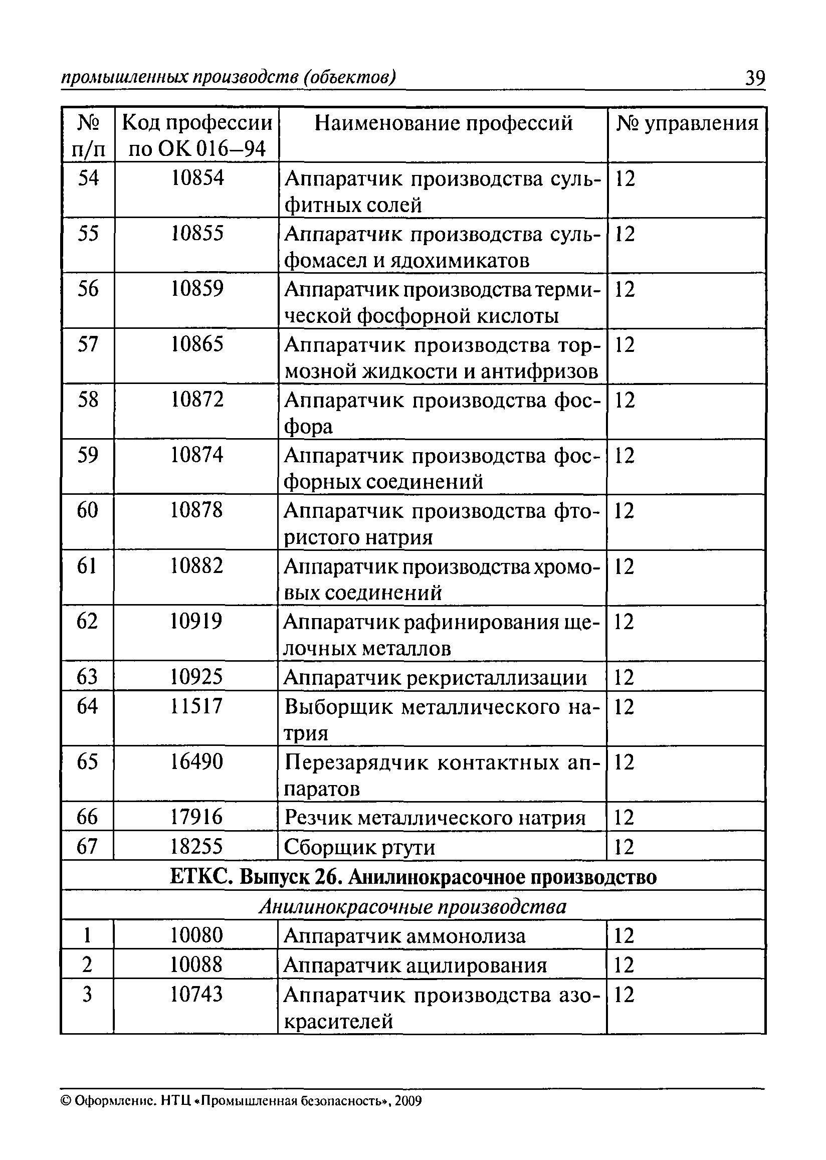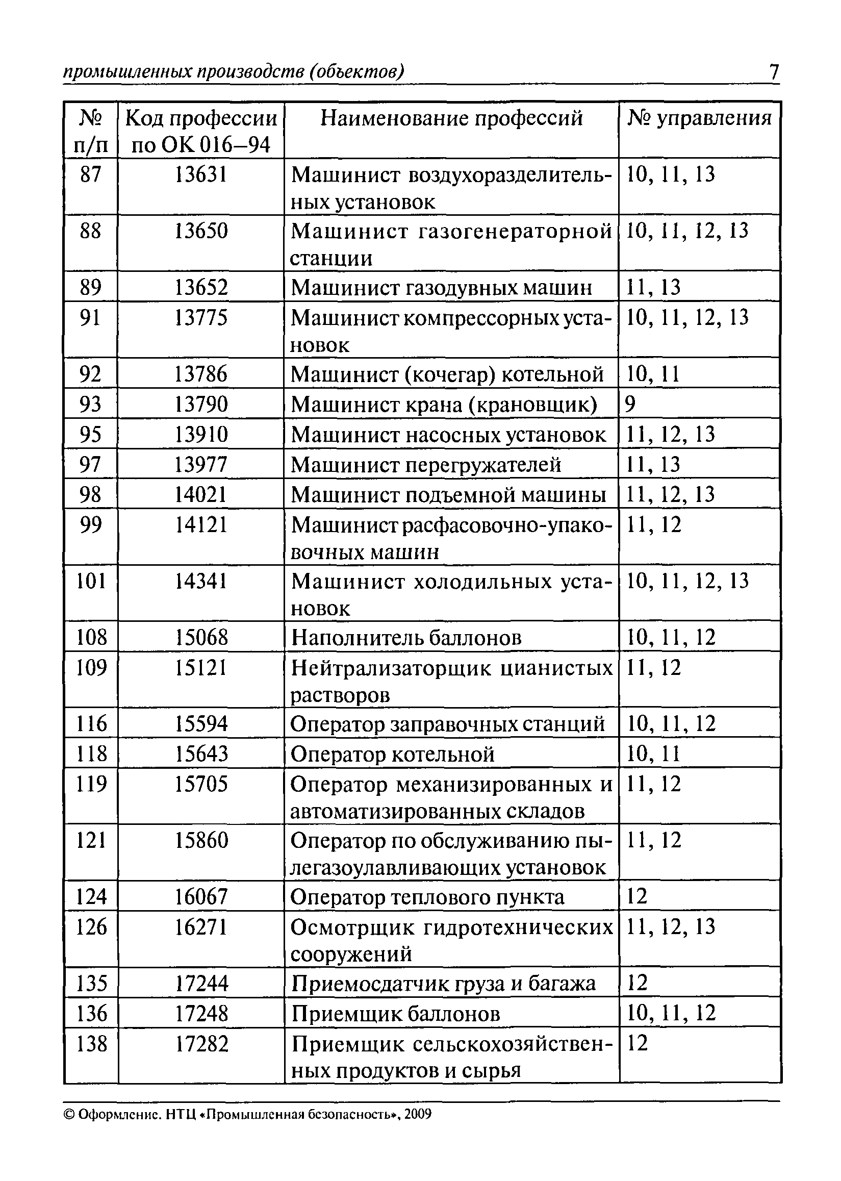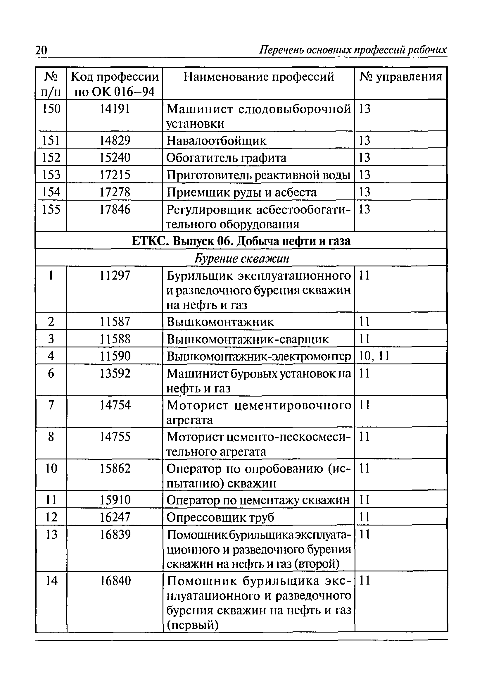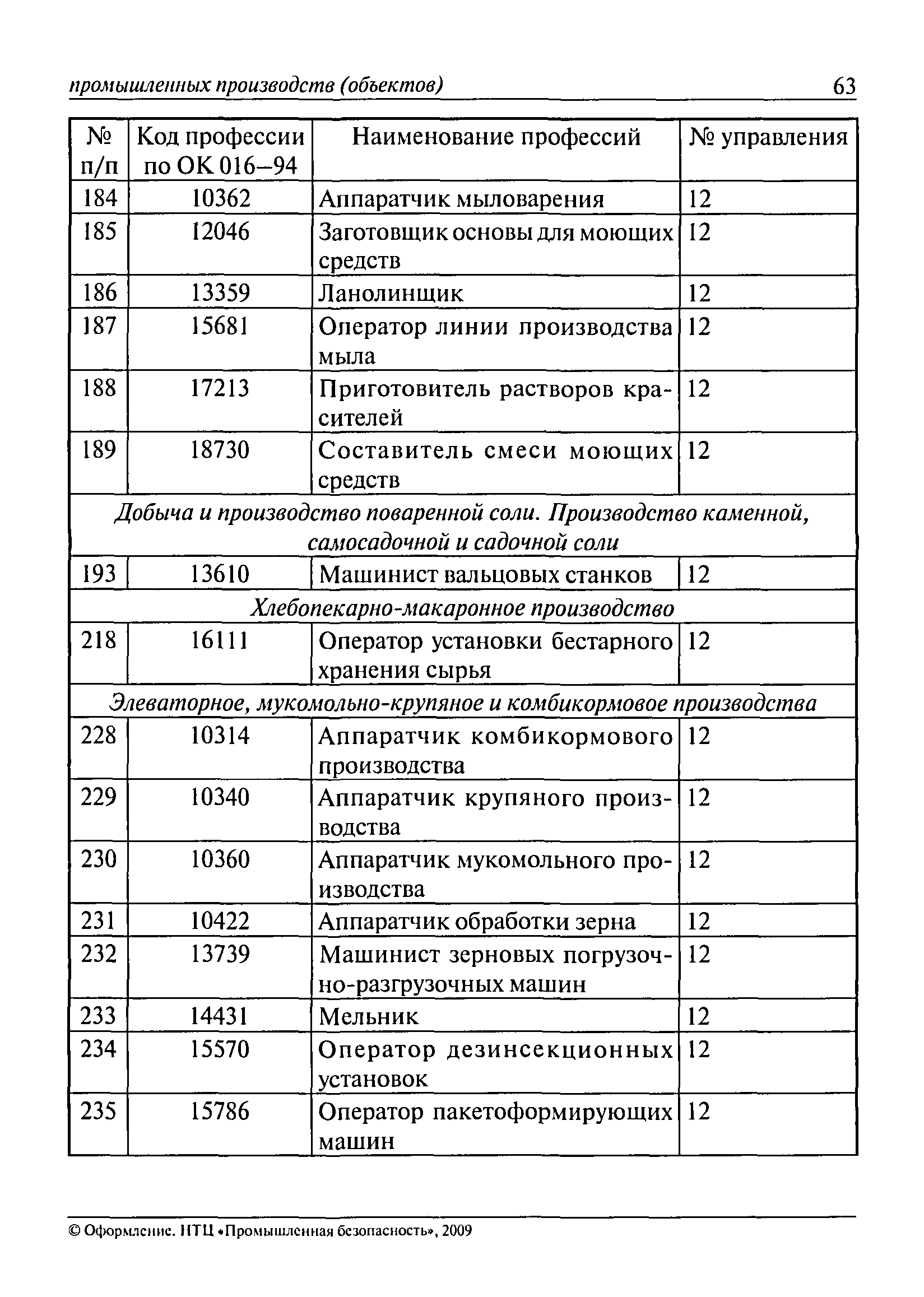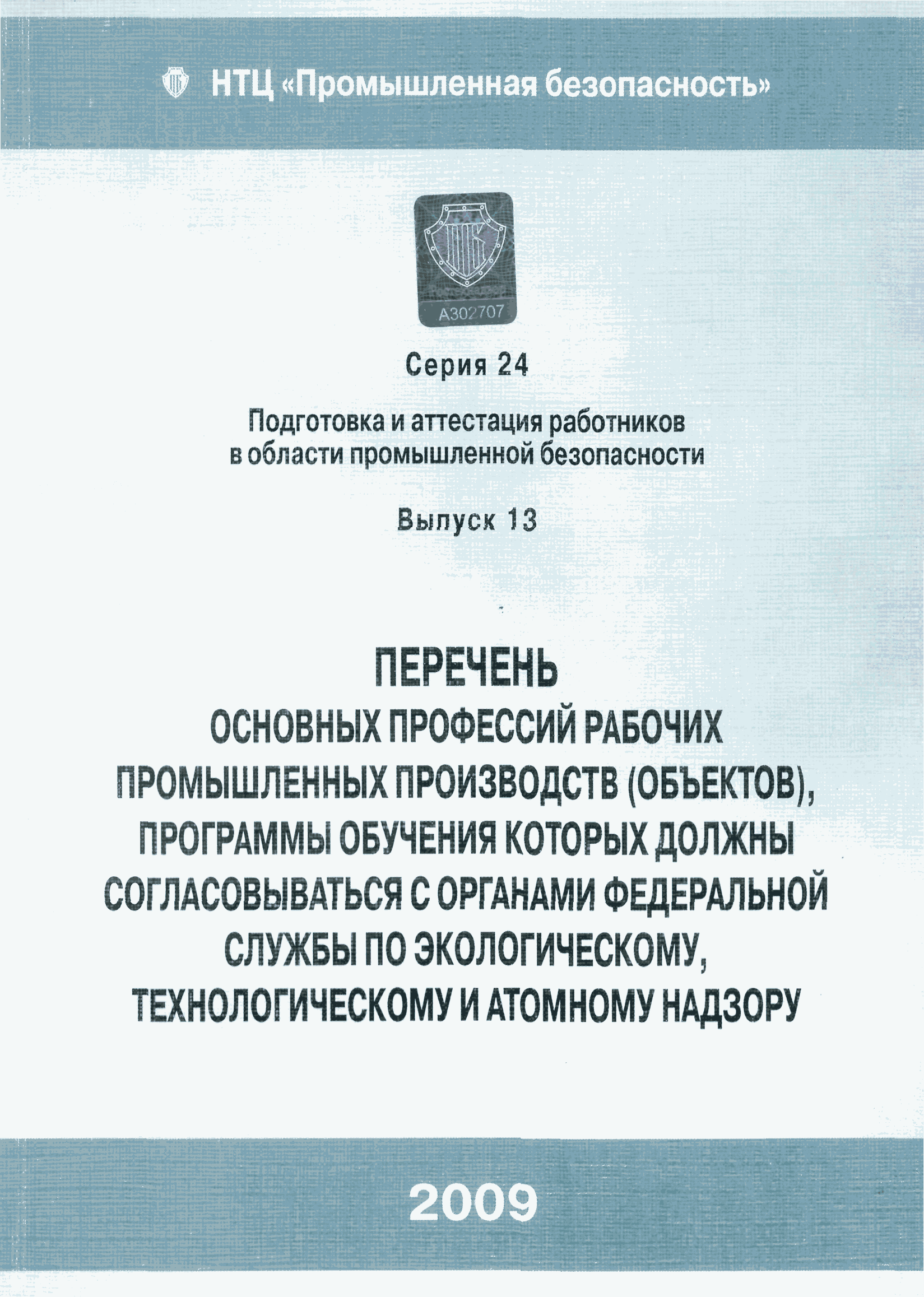 Перечень основных профессий рабочих промышленных производств (объектов), программы обучения которых должны согласовываться с органами федеральной службы по экологическому, технологическому и атомному надзору| Статус: | утратил силу | | Название рус.: | Перечень основных профессий рабочих промышленных производств (объектов), программы обучения которых должны согласовываться с органами федеральной службы по экологическому, технологическому и атомному надзору | | Дата добавления в базу: | 01.09.2013 | | Дата актуализации: | 01.01.2021 | | Дата введения: | 29.12.2006 | | Дата окончания срока действия: | 19.08.2015 | | Область применения: | Перечень разработан в целях систематизации деятельности в области профессионального обучения. Перечень приведен в соответствии с действующими нормативными правовыми актами, определяющими сферу деятельности Федеральной службы по экологическому, технологическому и атомному надзору. | | Оглавление: | ЕТКС. Выпуск 01. Профессии рабочих, общие для всех отраслей экономики ЕТКС. Выпуск 02. ЕТКС. Выпуск 03. Строительные, монтажные и ремонтно-строительные работы ЕТКС. Выпуск 04. Горные работы ЕТКС. Выпуск 06. Добыча нефти и газа ЕТКС. Выпуск 07. Черная металлургия ЕТКС. Выпуск 08. Цветная металлургия ЕТКС. Выпуск 09. Эксплуатация оборудования электростанций и сетей и др. ЕТКС. Выпуск 17. Производство абразивов ЕТКС. Выпуск 19. Электротехническое производство ЕТКС. Выпуск 22. Производство и ремонт летательных аппаратов ЕТКС. Выпуск 23. Судостроение ЕТКС. Выпуск 24. Химическое производство ЕТКС. Выпуск 25. Азотное производство ЕТКС. Выпуск 26. Анилинокрасочное производство ЕТКС. Выпуск 27. Производство синтетических смол и др. ЕТКС. Выпуск 28 (28, 29). Производство стекловолокон и др. ЕТКС. Выпуск 29. (30, 31). Гидролизное производство ЕТКС. Выпуск 30. (32). Производство синтетических каучуков и др. ЕТКС. Выпуск 31. (33). Производство резиновых изделий ЕТКС. Выпуск 32 (34). Химико-фотографическое производство ЕТКС. Выпуск 33 (35). Производство искусственной кожи ЕТКС. Выпуск 34 (36). Переработка нефти ЕТКС. Выпуск 36 (38). Производство асбестовых технических изделий ЕТКС. Выпуск 37 (39). Лесозаготовительные работы ЕТКС. Выпуск 39 (41). Производство целлюлозы и др. ЕТКС. Выпуск 40 (42, 43). Производство строительных материалов ЕТКС. Выпуск 41 (44). Производство стекла стеклоизделий ЕТКС. Выпуск 42 (45). Производство керамических, фарфоровых и других изделий ЕТКС. Выпуск 44 (47). Производство текстиля ЕТКС. Выпуск 45 (48). Легкая промышленность ЕТКС. Выпуск 48 (51). Производство пищевой продукции ЕТКС. Выпуск 49 (52). Производства мясных, молочных и других продуктов ЕТКС. Выпуск 51 (53, 55). Производства: алкогольной и безалкогольной продукции; хлебопекарно-макаронное; сахара; табака; эфирномасляничное; чая; консервов; парфюмерно-косметическое; поваренной соли; общественное питание и торговля и др. ЕТКС. Выпуск 52 (56). Транспорт (железнодорожный, автомобильный, городской, морской, речной, метрополитен) ЕТКС. Выпуск 54 (58). Связь ЕТКС. Выпуск 63 (69). Газовое, водопроводно-канализационное и зеленое хозяйства Категория 73 Наименования управлений | | Утверждён: | 29.12.2006 Федеральная служба по экологическому, технологическому и атомному надзору (1154)