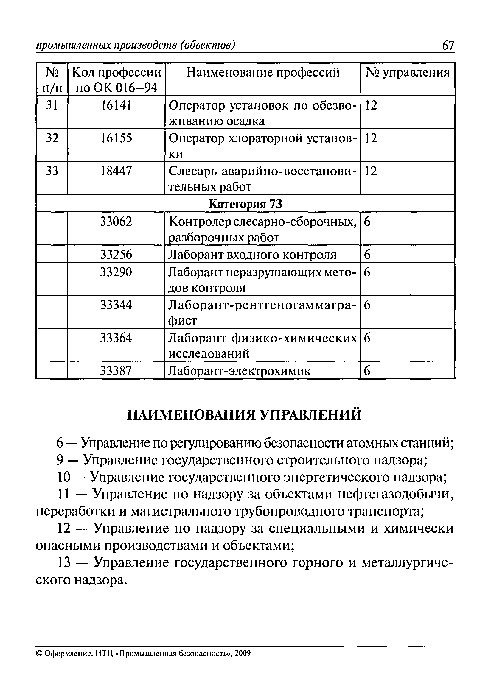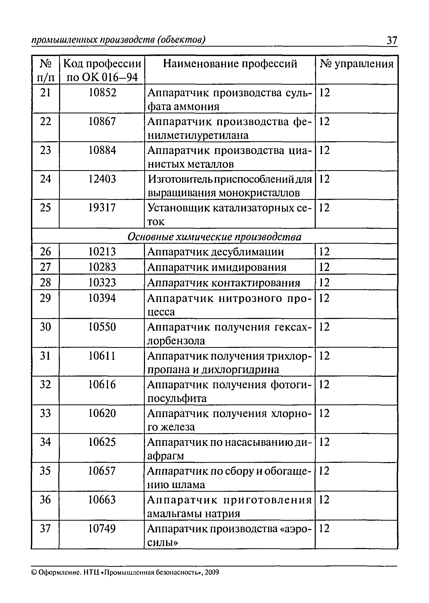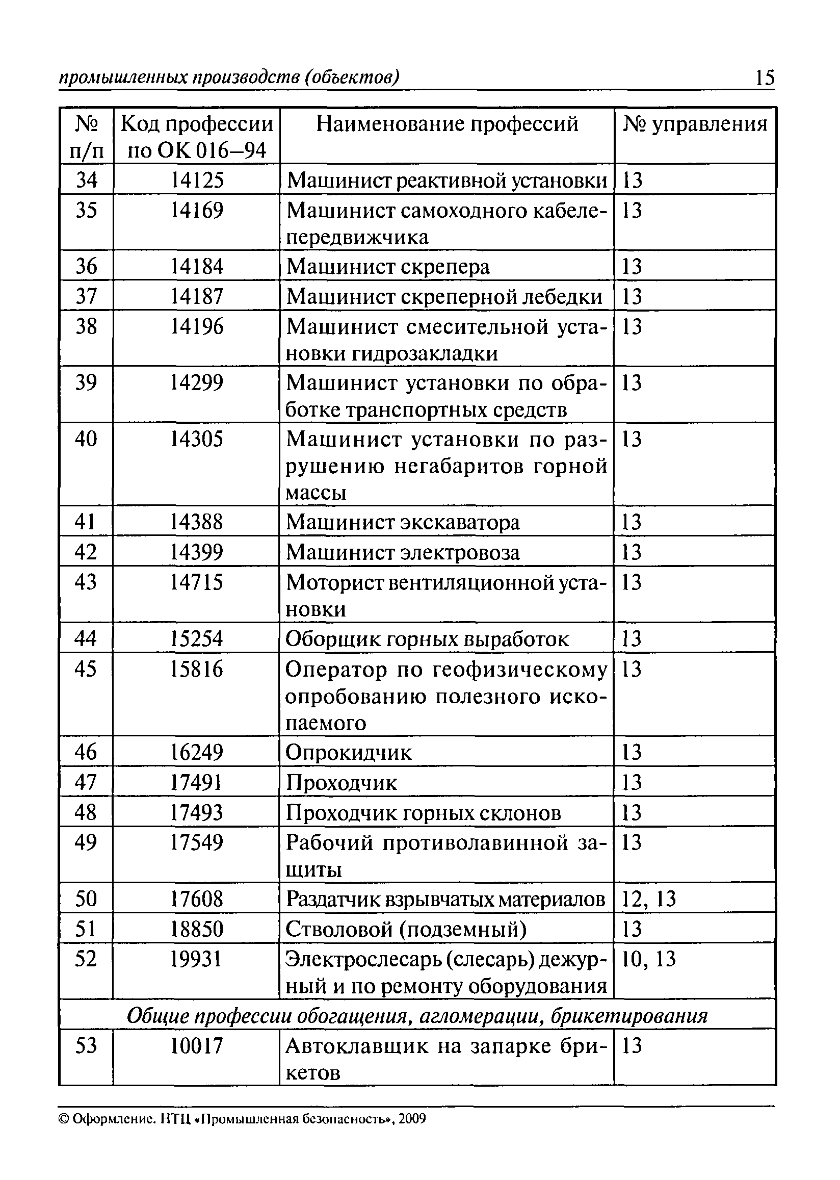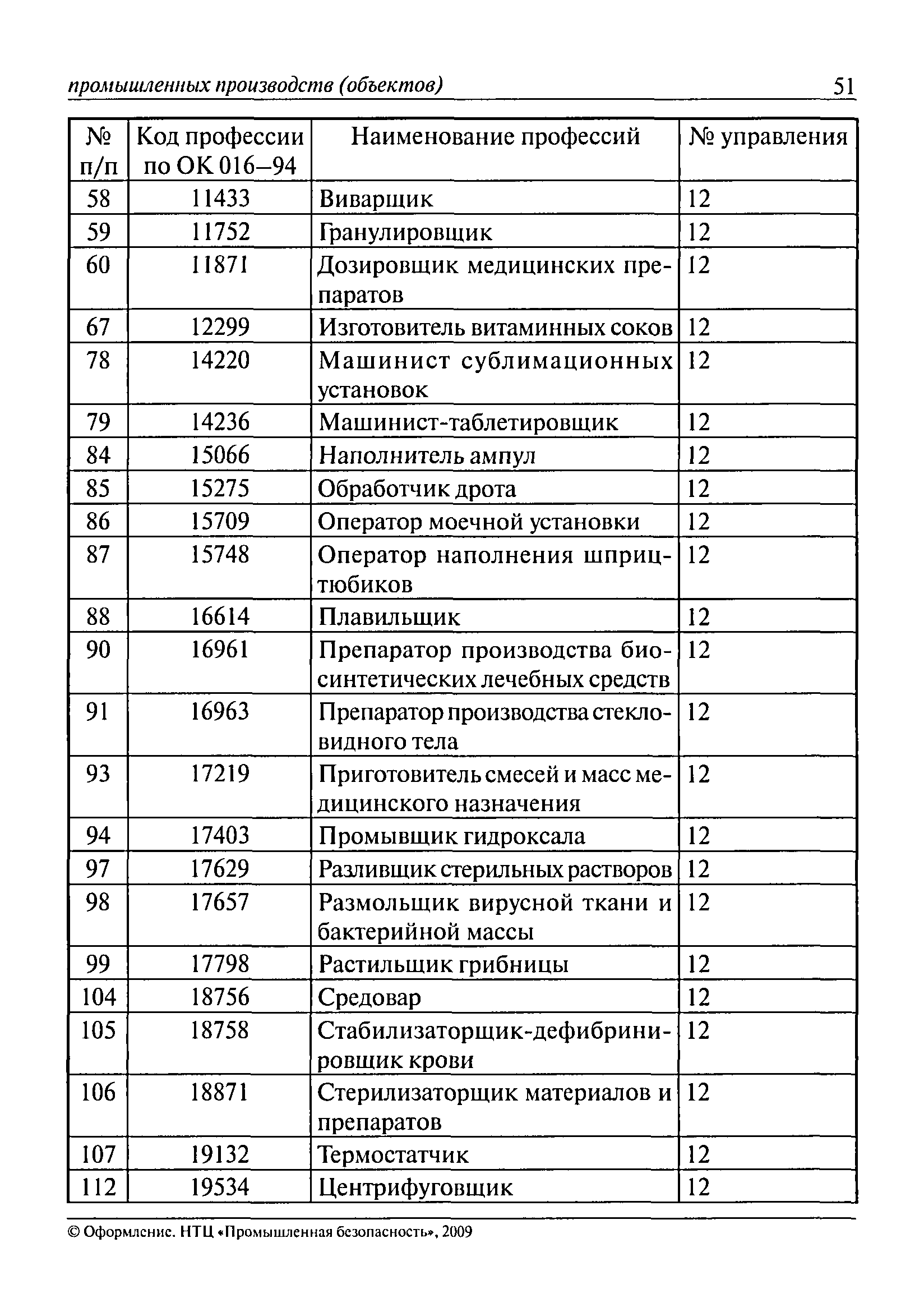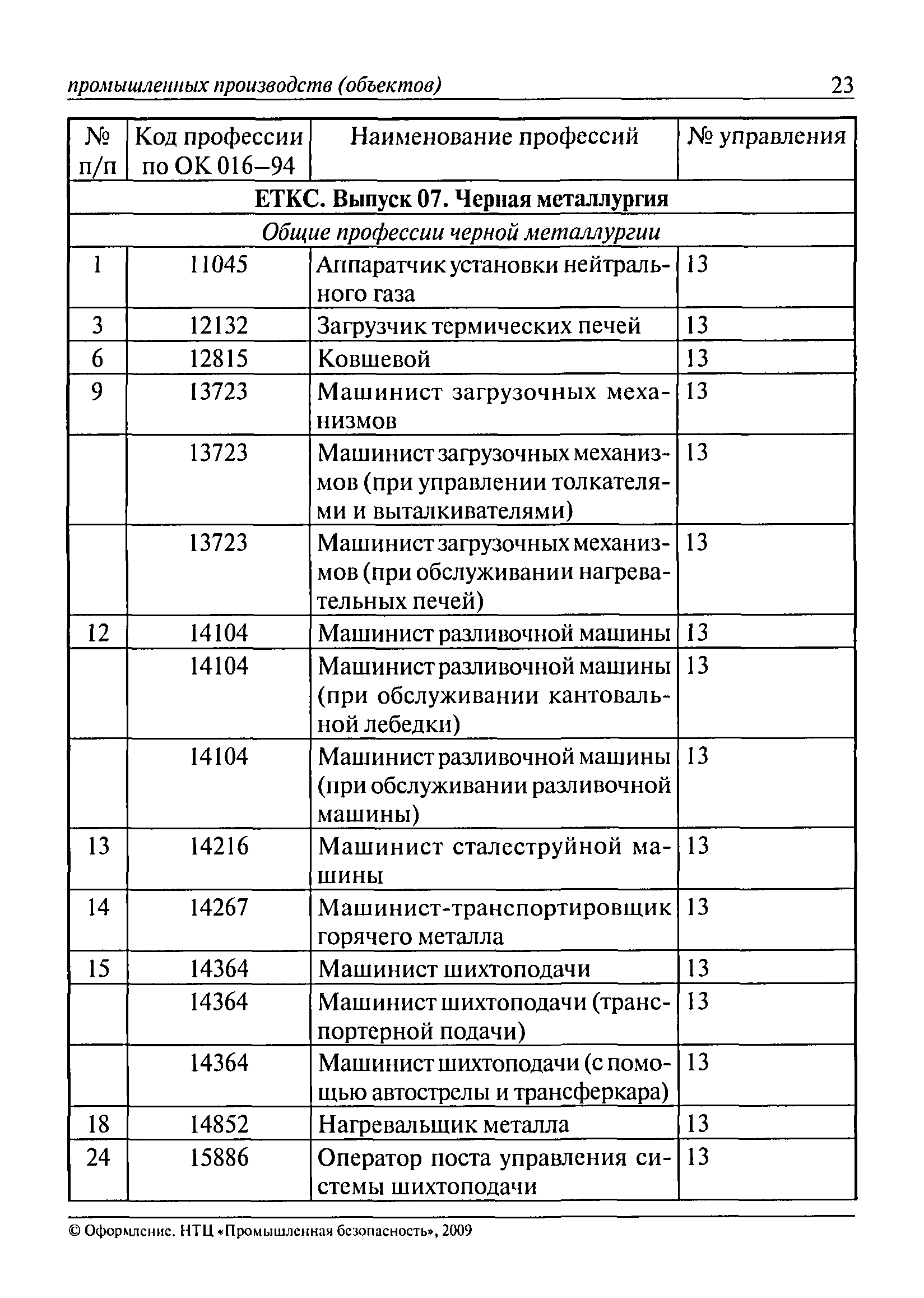 Перечень основных профессий рабочих промышленных производств (объектов), программы обучения которых должны согласовываться с органами федеральной службы по экологическому, технологическому и атомному надзору| Статус: | утратил силу | | Название рус.: | Перечень основных профессий рабочих промышленных производств (объектов), программы обучения которых должны согласовываться с органами федеральной службы по экологическому, технологическому и атомному надзору | | Дата добавления в базу: | 01.09.2013 | | Дата актуализации: | 01.01.2021 | | Дата введения: | 29.12.2006 | | Дата окончания срока действия: | 19.08.2015 | | Область применения: | Перечень разработан в целях систематизации деятельности в области профессионального обучения. Перечень приведен в соответствии с действующими нормативными правовыми актами, определяющими сферу деятельности Федеральной службы по экологическому, технологическому и атомному надзору. | | Оглавление: | ЕТКС. Выпуск 01. Профессии рабочих, общие для всех отраслей экономики ЕТКС. Выпуск 02. ЕТКС. Выпуск 03. Строительные, монтажные и ремонтно-строительные работы ЕТКС. Выпуск 04. Горные работы ЕТКС. Выпуск 06. Добыча нефти и газа ЕТКС. Выпуск 07. Черная металлургия ЕТКС. Выпуск 08. Цветная металлургия ЕТКС. Выпуск 09. Эксплуатация оборудования электростанций и сетей и др. ЕТКС. Выпуск 17. Производство абразивов ЕТКС. Выпуск 19. Электротехническое производство ЕТКС. Выпуск 22. Производство и ремонт летательных аппаратов ЕТКС. Выпуск 23. Судостроение ЕТКС. Выпуск 24. Химическое производство ЕТКС. Выпуск 25. Азотное производство ЕТКС. Выпуск 26. Анилинокрасочное производство ЕТКС. Выпуск 27. Производство синтетических смол и др. ЕТКС. Выпуск 28 (28, 29). Производство стекловолокон и др. ЕТКС. Выпуск 29. (30, 31). Гидролизное производство ЕТКС. Выпуск 30. (32). Производство синтетических каучуков и др. ЕТКС. Выпуск 31. (33). Производство резиновых изделий ЕТКС. Выпуск 32 (34). Химико-фотографическое производство ЕТКС. Выпуск 33 (35). Производство искусственной кожи ЕТКС. Выпуск 34 (36). Переработка нефти ЕТКС. Выпуск 36 (38). Производство асбестовых технических изделий ЕТКС. Выпуск 37 (39). Лесозаготовительные работы ЕТКС. Выпуск 39 (41). Производство целлюлозы и др. ЕТКС. Выпуск 40 (42, 43). Производство строительных материалов ЕТКС. Выпуск 41 (44). Производство стекла стеклоизделий ЕТКС. Выпуск 42 (45). Производство керамических, фарфоровых и других изделий ЕТКС. Выпуск 44 (47). Производство текстиля ЕТКС. Выпуск 45 (48). Легкая промышленность ЕТКС. Выпуск 48 (51). Производство пищевой продукции ЕТКС. Выпуск 49 (52). Производства мясных, молочных и других продуктов ЕТКС. Выпуск 51 (53, 55). Производства: алкогольной и безалкогольной продукции; хлебопекарно-макаронное; сахара; табака; эфирномасляничное; чая; консервов; парфюмерно-косметическое; поваренной соли; общественное питание и торговля и др. ЕТКС. Выпуск 52 (56). Транспорт (железнодорожный, автомобильный, городской, морской, речной, метрополитен) ЕТКС. Выпуск 54 (58). Связь ЕТКС. Выпуск 63 (69). Газовое, водопроводно-канализационное и зеленое хозяйства Категория 73 Наименования управлений | | Утверждён: | 29.12.2006 Федеральная служба по экологическому, технологическому и атомному надзору (1154)