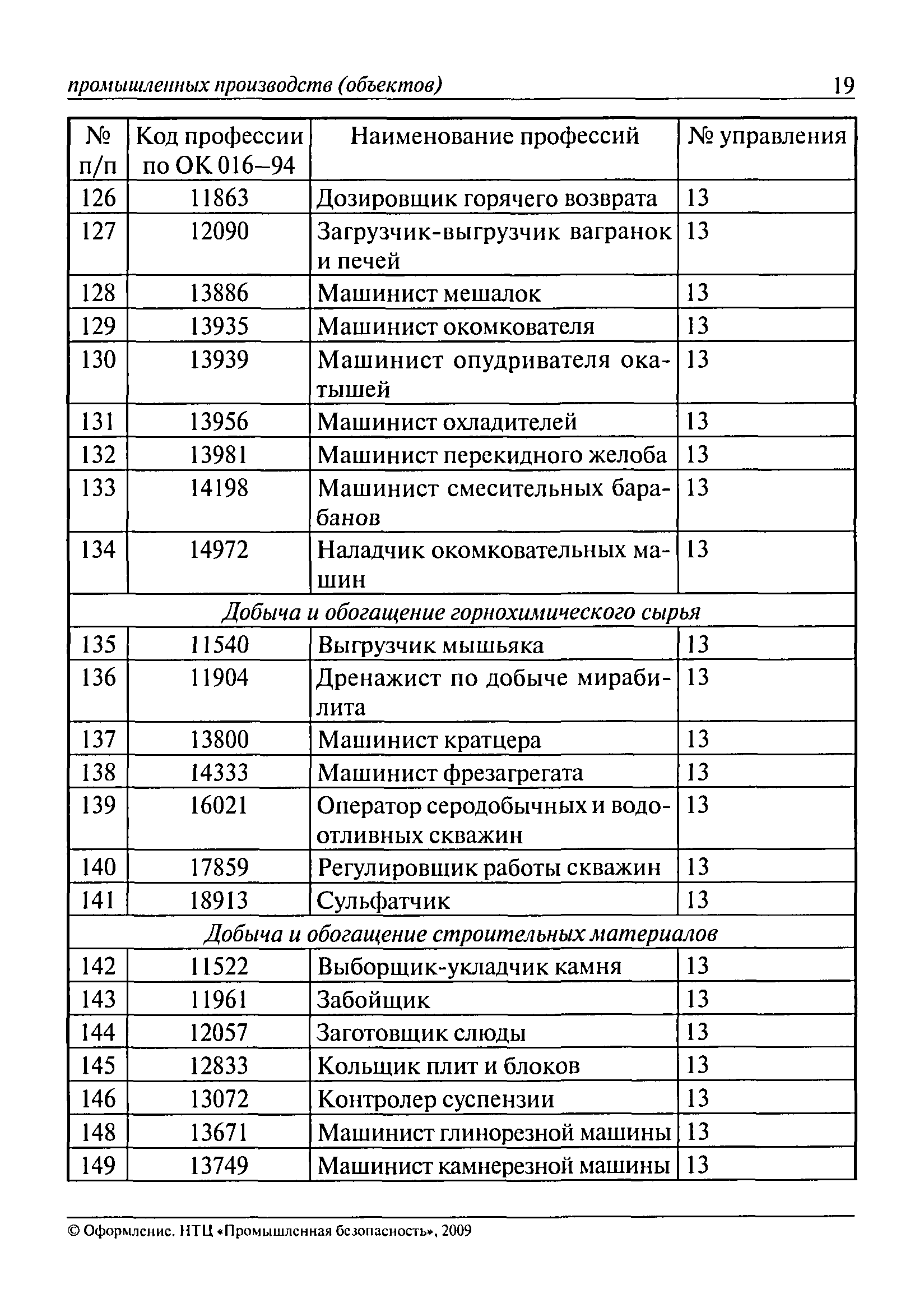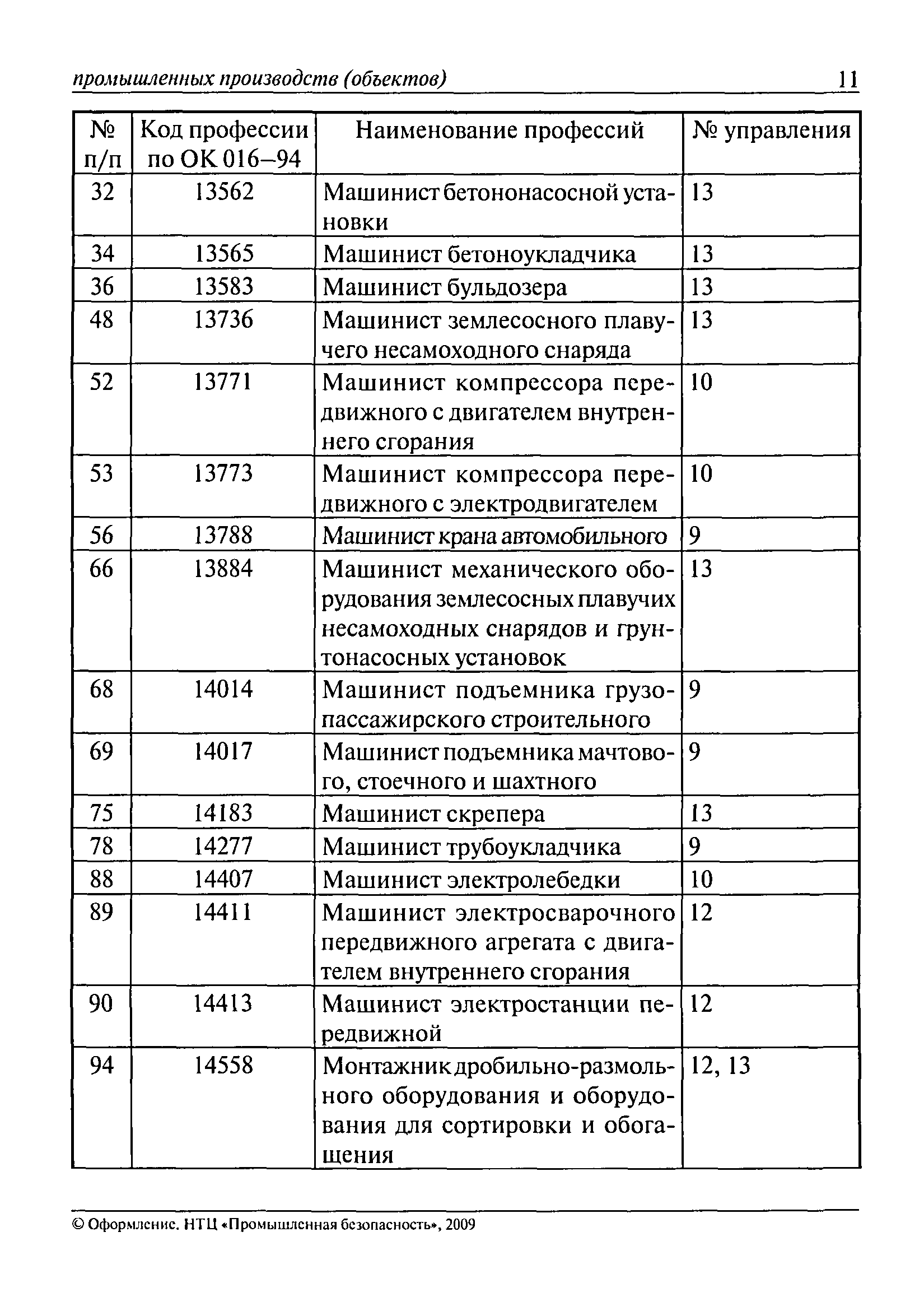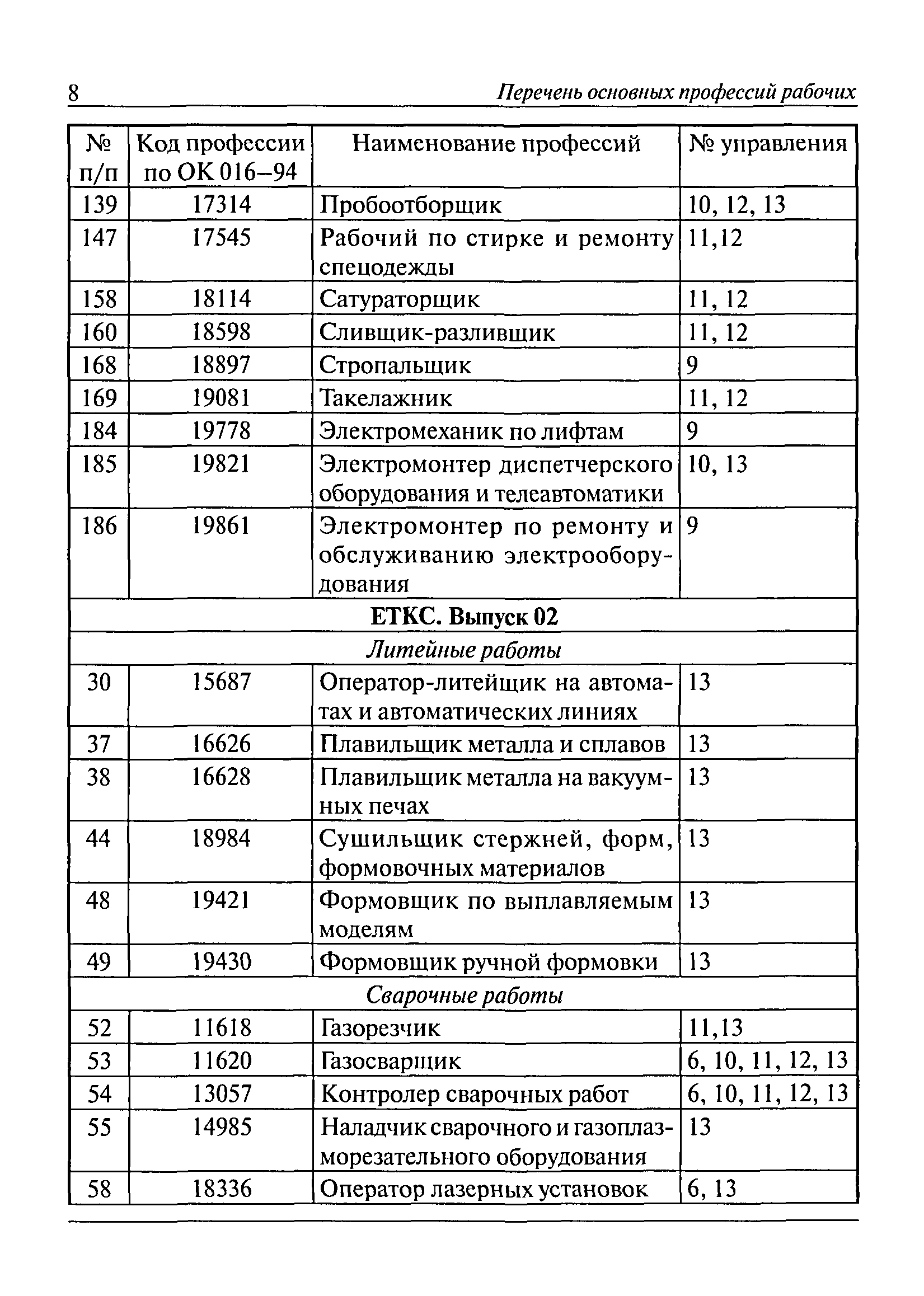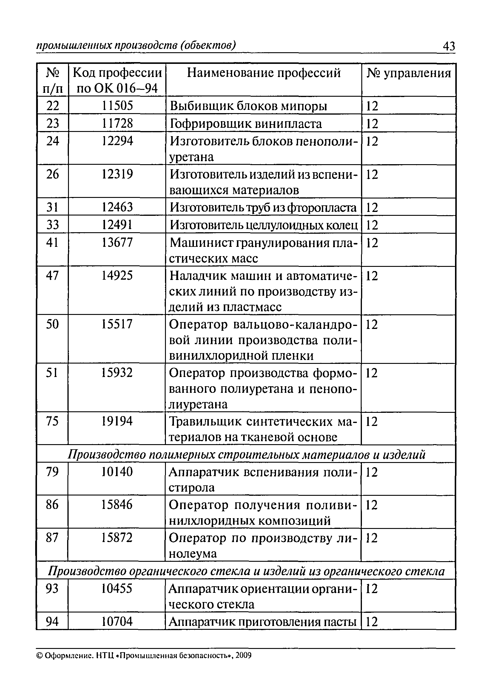 Перечень основных профессий рабочих промышленных производств (объектов), программы обучения которых должны согласовываться с органами федеральной службы по экологическому, технологическому и атомному надзору| Статус: | утратил силу | | Название рус.: | Перечень основных профессий рабочих промышленных производств (объектов), программы обучения которых должны согласовываться с органами федеральной службы по экологическому, технологическому и атомному надзору | | Дата добавления в базу: | 01.09.2013 | | Дата актуализации: | 01.01.2021 | | Дата введения: | 29.12.2006 | | Дата окончания срока действия: | 19.08.2015 | | Область применения: | Перечень разработан в целях систематизации деятельности в области профессионального обучения. Перечень приведен в соответствии с действующими нормативными правовыми актами, определяющими сферу деятельности Федеральной службы по экологическому, технологическому и атомному надзору. | | Оглавление: | ЕТКС. Выпуск 01. Профессии рабочих, общие для всех отраслей экономики ЕТКС. Выпуск 02. ЕТКС. Выпуск 03. Строительные, монтажные и ремонтно-строительные работы ЕТКС. Выпуск 04. Горные работы ЕТКС. Выпуск 06. Добыча нефти и газа ЕТКС. Выпуск 07. Черная металлургия ЕТКС. Выпуск 08. Цветная металлургия ЕТКС. Выпуск 09. Эксплуатация оборудования электростанций и сетей и др. ЕТКС. Выпуск 17. Производство абразивов ЕТКС. Выпуск 19. Электротехническое производство ЕТКС. Выпуск 22. Производство и ремонт летательных аппаратов ЕТКС. Выпуск 23. Судостроение ЕТКС. Выпуск 24. Химическое производство ЕТКС. Выпуск 25. Азотное производство ЕТКС. Выпуск 26. Анилинокрасочное производство ЕТКС. Выпуск 27. Производство синтетических смол и др. ЕТКС. Выпуск 28 (28, 29). Производство стекловолокон и др. ЕТКС. Выпуск 29. (30, 31). Гидролизное производство ЕТКС. Выпуск 30. (32). Производство синтетических каучуков и др. ЕТКС. Выпуск 31. (33). Производство резиновых изделий ЕТКС. Выпуск 32 (34). Химико-фотографическое производство ЕТКС. Выпуск 33 (35). Производство искусственной кожи ЕТКС. Выпуск 34 (36). Переработка нефти ЕТКС. Выпуск 36 (38). Производство асбестовых технических изделий ЕТКС. Выпуск 37 (39). Лесозаготовительные работы ЕТКС. Выпуск 39 (41). Производство целлюлозы и др. ЕТКС. Выпуск 40 (42, 43). Производство строительных материалов ЕТКС. Выпуск 41 (44). Производство стекла стеклоизделий ЕТКС. Выпуск 42 (45). Производство керамических, фарфоровых и других изделий ЕТКС. Выпуск 44 (47). Производство текстиля ЕТКС. Выпуск 45 (48). Легкая промышленность ЕТКС. Выпуск 48 (51). Производство пищевой продукции ЕТКС. Выпуск 49 (52). Производства мясных, молочных и других продуктов ЕТКС. Выпуск 51 (53, 55). Производства: алкогольной и безалкогольной продукции; хлебопекарно-макаронное; сахара; табака; эфирномасляничное; чая; консервов; парфюмерно-косметическое; поваренной соли; общественное питание и торговля и др. ЕТКС. Выпуск 52 (56). Транспорт (железнодорожный, автомобильный, городской, морской, речной, метрополитен) ЕТКС. Выпуск 54 (58). Связь ЕТКС. Выпуск 63 (69). Газовое, водопроводно-канализационное и зеленое хозяйства Категория 73 Наименования управлений | | Утверждён: | 29.12.2006 Федеральная служба по экологическому, технологическому и атомному надзору (1154)