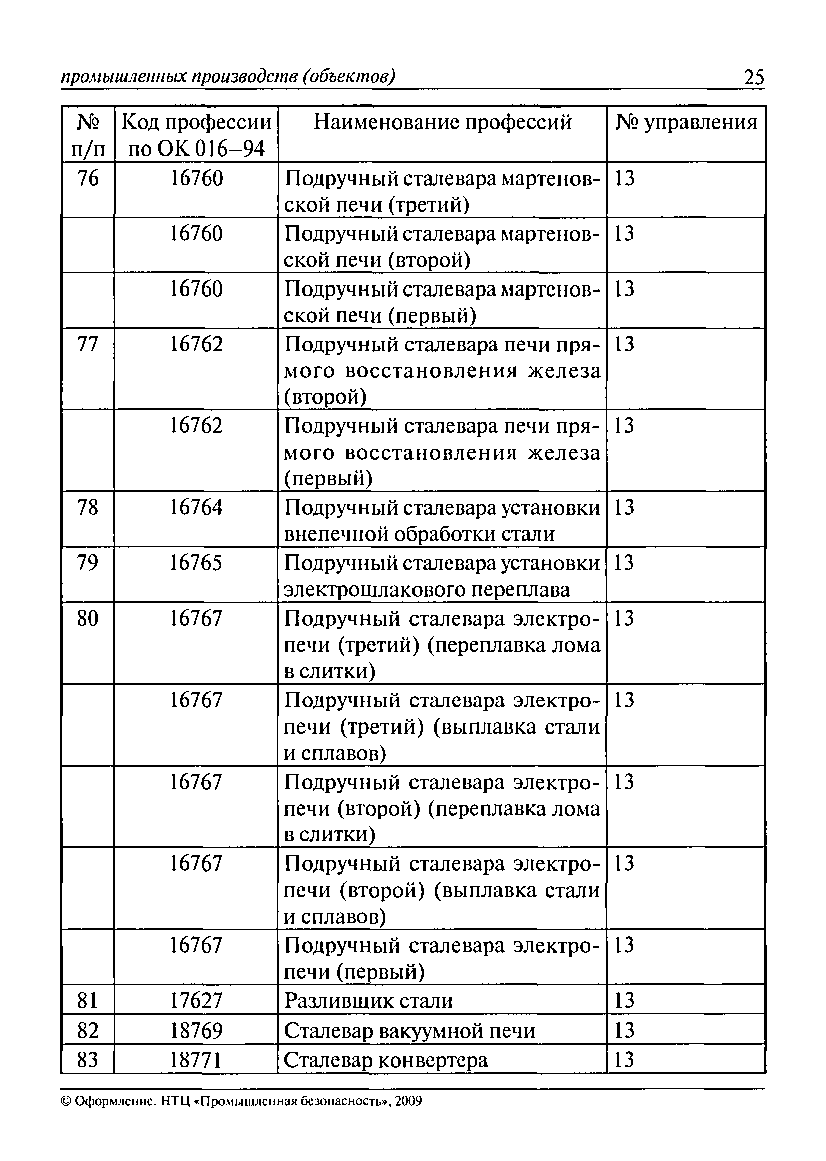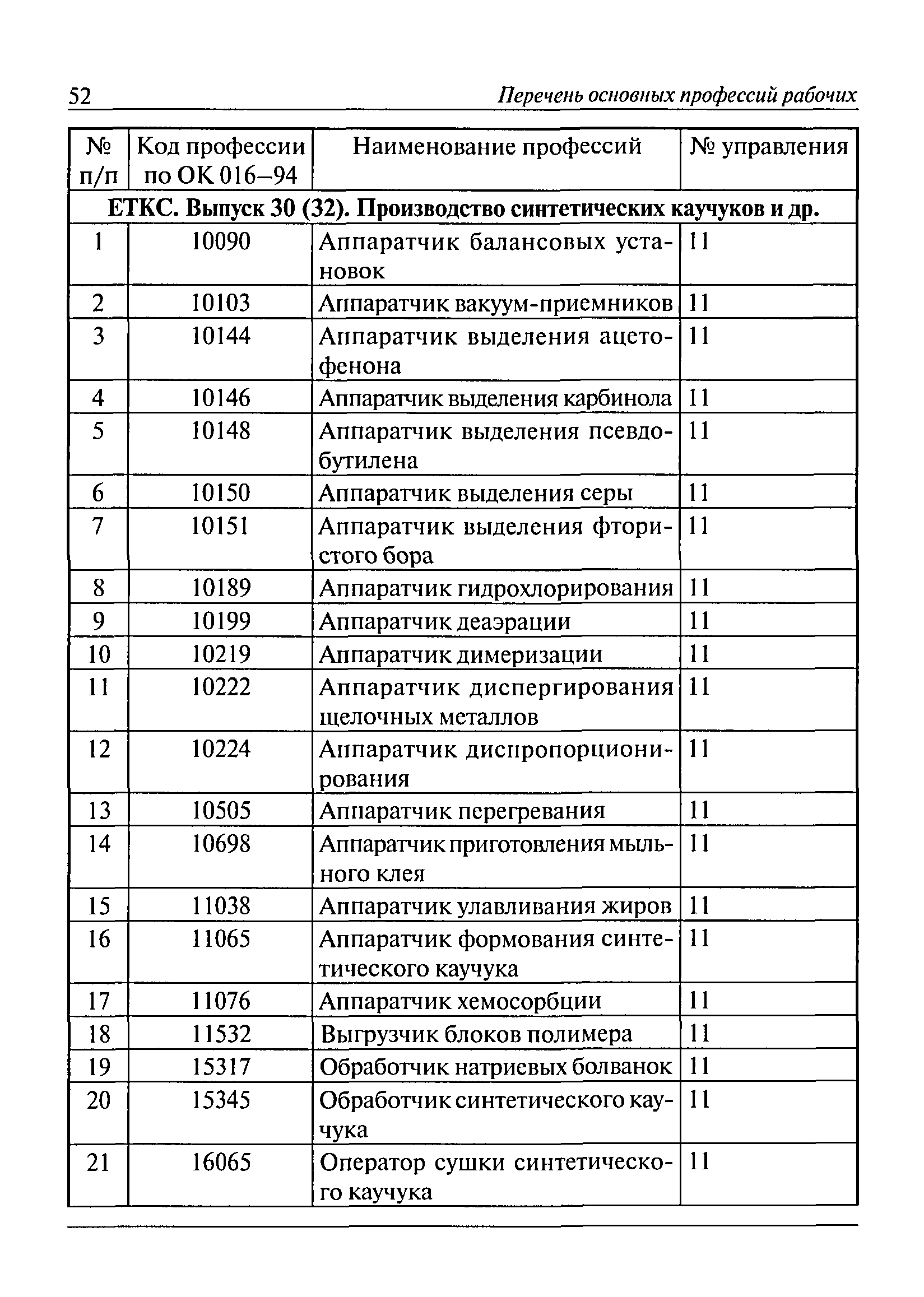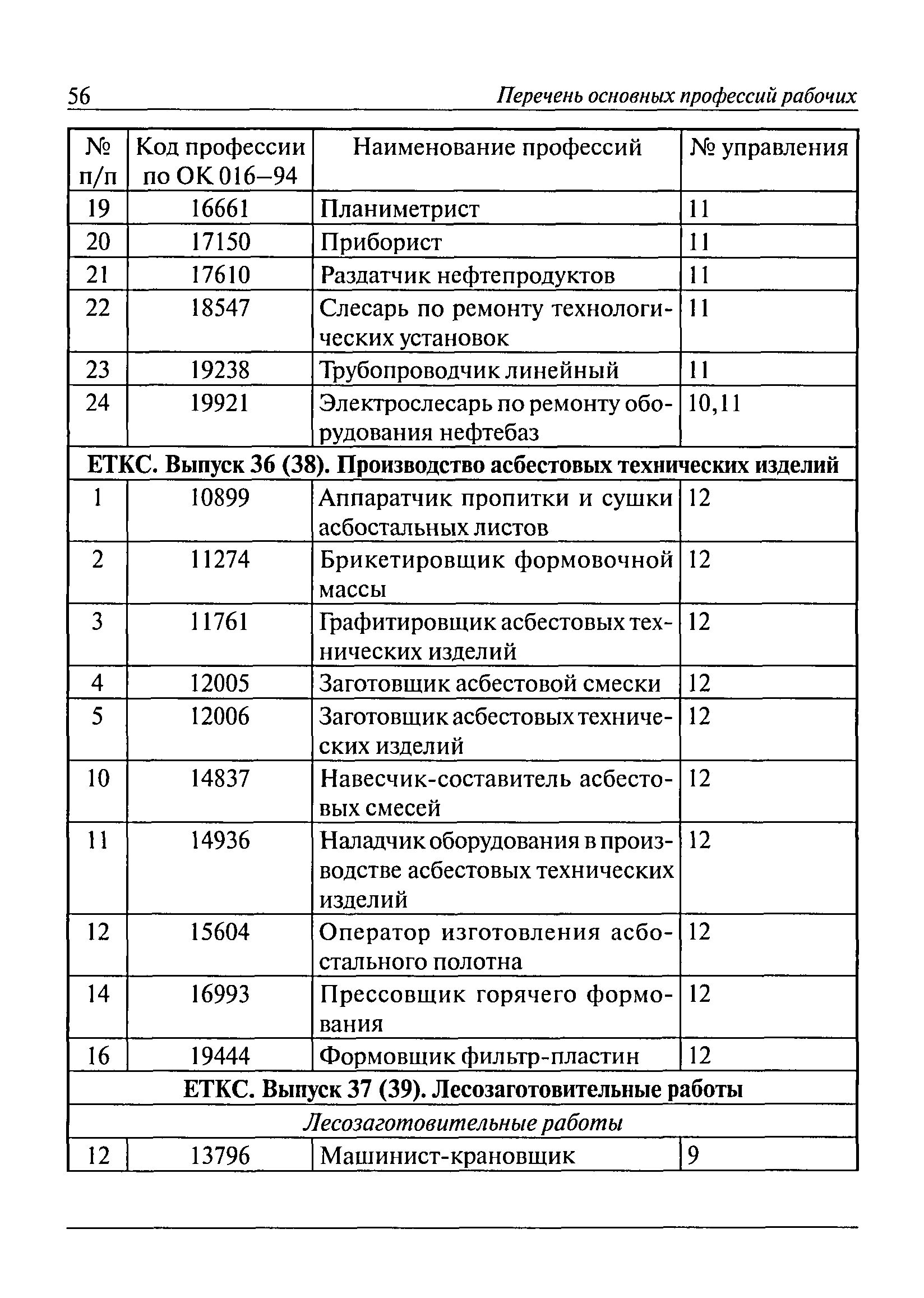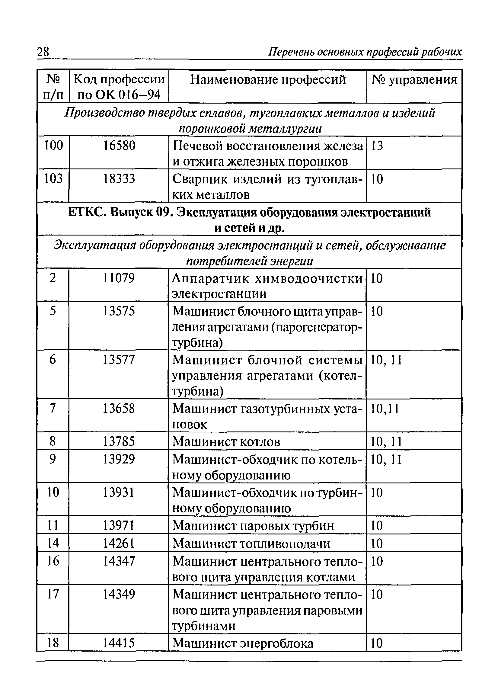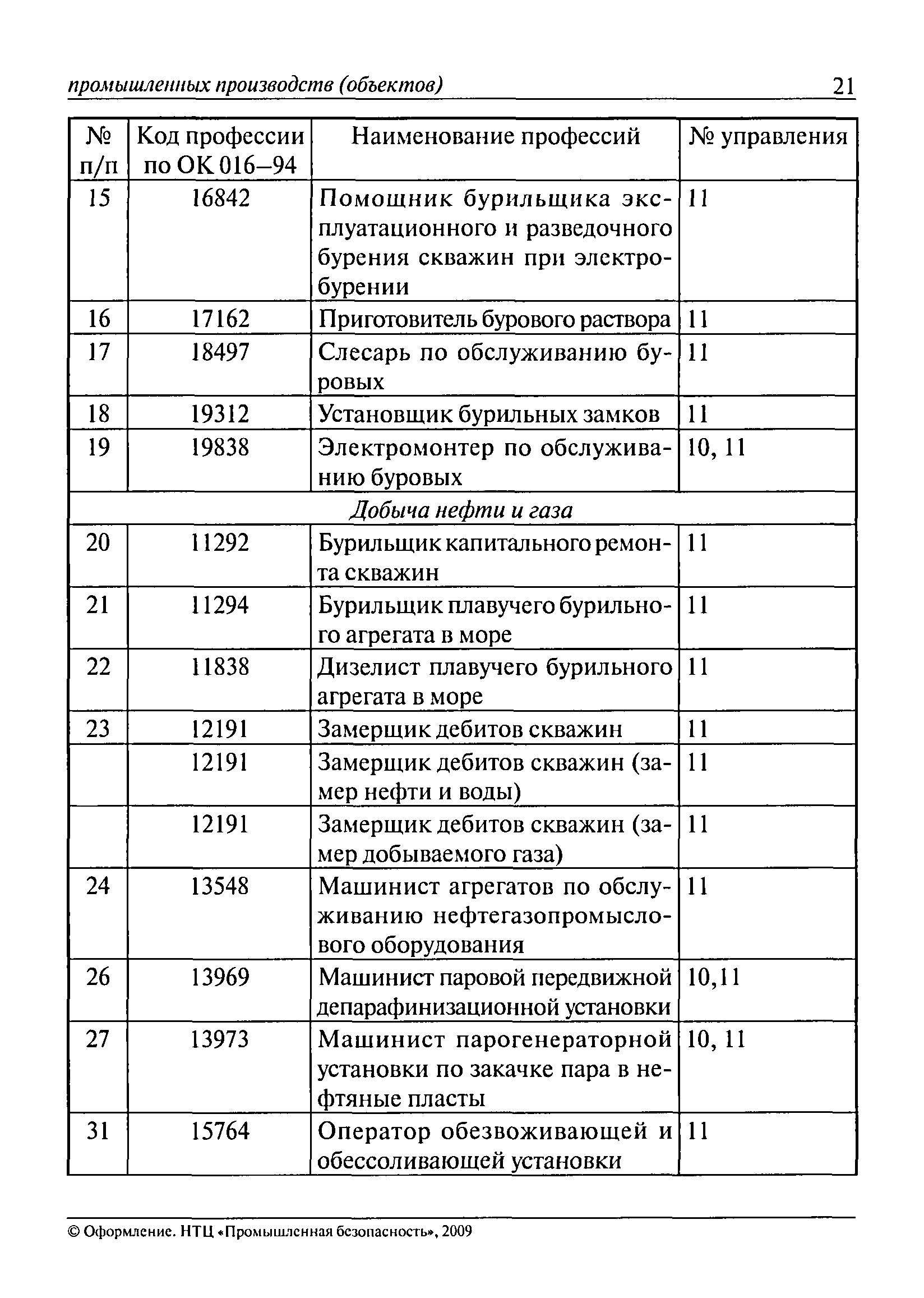 Перечень основных профессий рабочих промышленных производств (объектов), программы обучения которых должны согласовываться с органами федеральной службы по экологическому, технологическому и атомному надзору| Статус: | утратил силу | | Название рус.: | Перечень основных профессий рабочих промышленных производств (объектов), программы обучения которых должны согласовываться с органами федеральной службы по экологическому, технологическому и атомному надзору | | Дата добавления в базу: | 01.09.2013 | | Дата актуализации: | 01.01.2021 | | Дата введения: | 29.12.2006 | | Дата окончания срока действия: | 19.08.2015 | | Область применения: | Перечень разработан в целях систематизации деятельности в области профессионального обучения. Перечень приведен в соответствии с действующими нормативными правовыми актами, определяющими сферу деятельности Федеральной службы по экологическому, технологическому и атомному надзору. | | Оглавление: | ЕТКС. Выпуск 01. Профессии рабочих, общие для всех отраслей экономики ЕТКС. Выпуск 02. ЕТКС. Выпуск 03. Строительные, монтажные и ремонтно-строительные работы ЕТКС. Выпуск 04. Горные работы ЕТКС. Выпуск 06. Добыча нефти и газа ЕТКС. Выпуск 07. Черная металлургия ЕТКС. Выпуск 08. Цветная металлургия ЕТКС. Выпуск 09. Эксплуатация оборудования электростанций и сетей и др. ЕТКС. Выпуск 17. Производство абразивов ЕТКС. Выпуск 19. Электротехническое производство ЕТКС. Выпуск 22. Производство и ремонт летательных аппаратов ЕТКС. Выпуск 23. Судостроение ЕТКС. Выпуск 24. Химическое производство ЕТКС. Выпуск 25. Азотное производство ЕТКС. Выпуск 26. Анилинокрасочное производство ЕТКС. Выпуск 27. Производство синтетических смол и др. ЕТКС. Выпуск 28 (28, 29). Производство стекловолокон и др. ЕТКС. Выпуск 29. (30, 31). Гидролизное производство ЕТКС. Выпуск 30. (32). Производство синтетических каучуков и др. ЕТКС. Выпуск 31. (33). Производство резиновых изделий ЕТКС. Выпуск 32 (34). Химико-фотографическое производство ЕТКС. Выпуск 33 (35). Производство искусственной кожи ЕТКС. Выпуск 34 (36). Переработка нефти ЕТКС. Выпуск 36 (38). Производство асбестовых технических изделий ЕТКС. Выпуск 37 (39). Лесозаготовительные работы ЕТКС. Выпуск 39 (41). Производство целлюлозы и др. ЕТКС. Выпуск 40 (42, 43). Производство строительных материалов ЕТКС. Выпуск 41 (44). Производство стекла стеклоизделий ЕТКС. Выпуск 42 (45). Производство керамических, фарфоровых и других изделий ЕТКС. Выпуск 44 (47). Производство текстиля ЕТКС. Выпуск 45 (48). Легкая промышленность ЕТКС. Выпуск 48 (51). Производство пищевой продукции ЕТКС. Выпуск 49 (52). Производства мясных, молочных и других продуктов ЕТКС. Выпуск 51 (53, 55). Производства: алкогольной и безалкогольной продукции; хлебопекарно-макаронное; сахара; табака; эфирномасляничное; чая; консервов; парфюмерно-косметическое; поваренной соли; общественное питание и торговля и др. ЕТКС. Выпуск 52 (56). Транспорт (железнодорожный, автомобильный, городской, морской, речной, метрополитен) ЕТКС. Выпуск 54 (58). Связь ЕТКС. Выпуск 63 (69). Газовое, водопроводно-канализационное и зеленое хозяйства Категория 73 Наименования управлений | | Утверждён: | 29.12.2006 Федеральная служба по экологическому, технологическому и атомному надзору (1154)