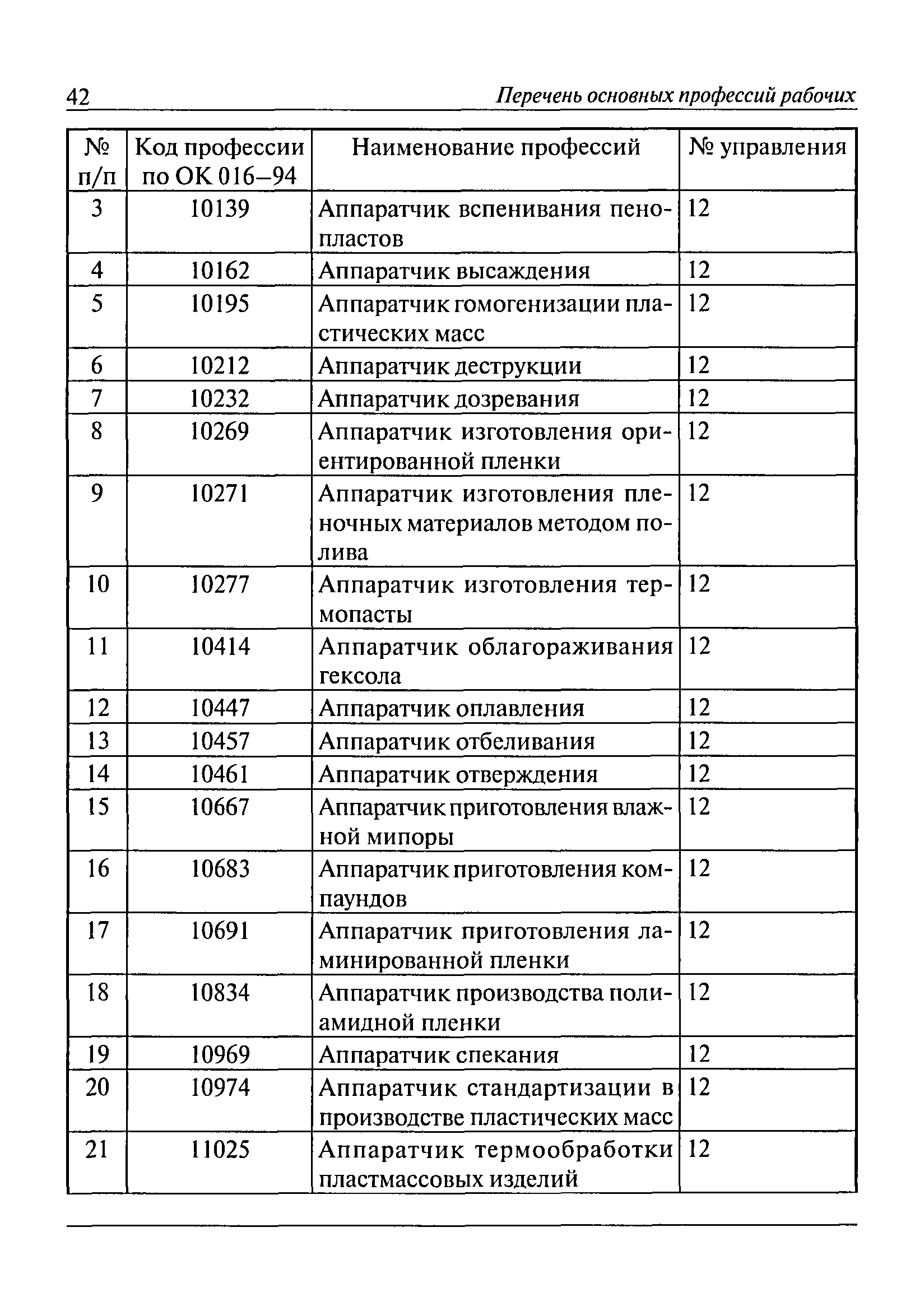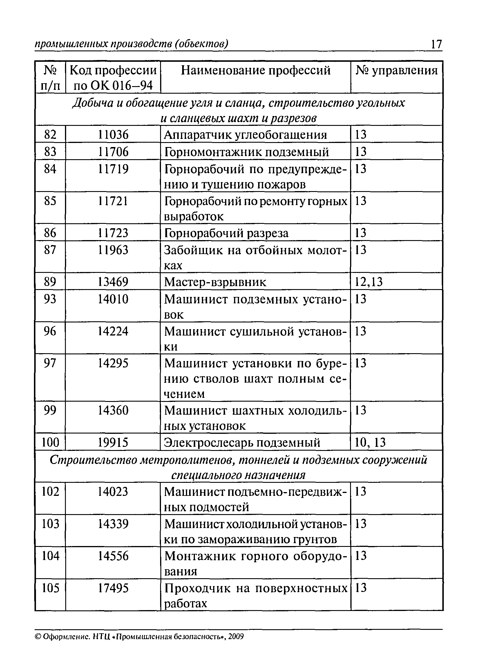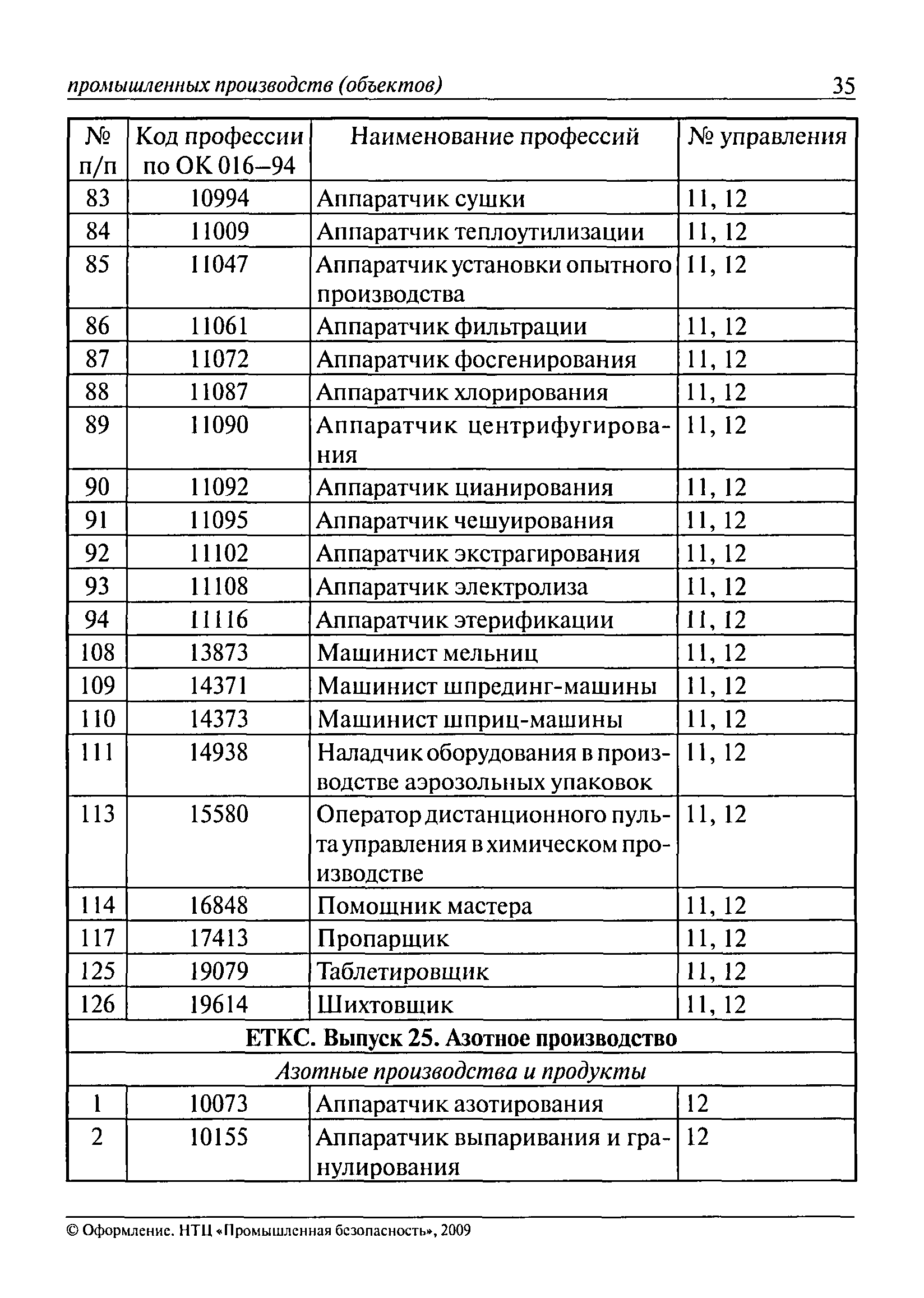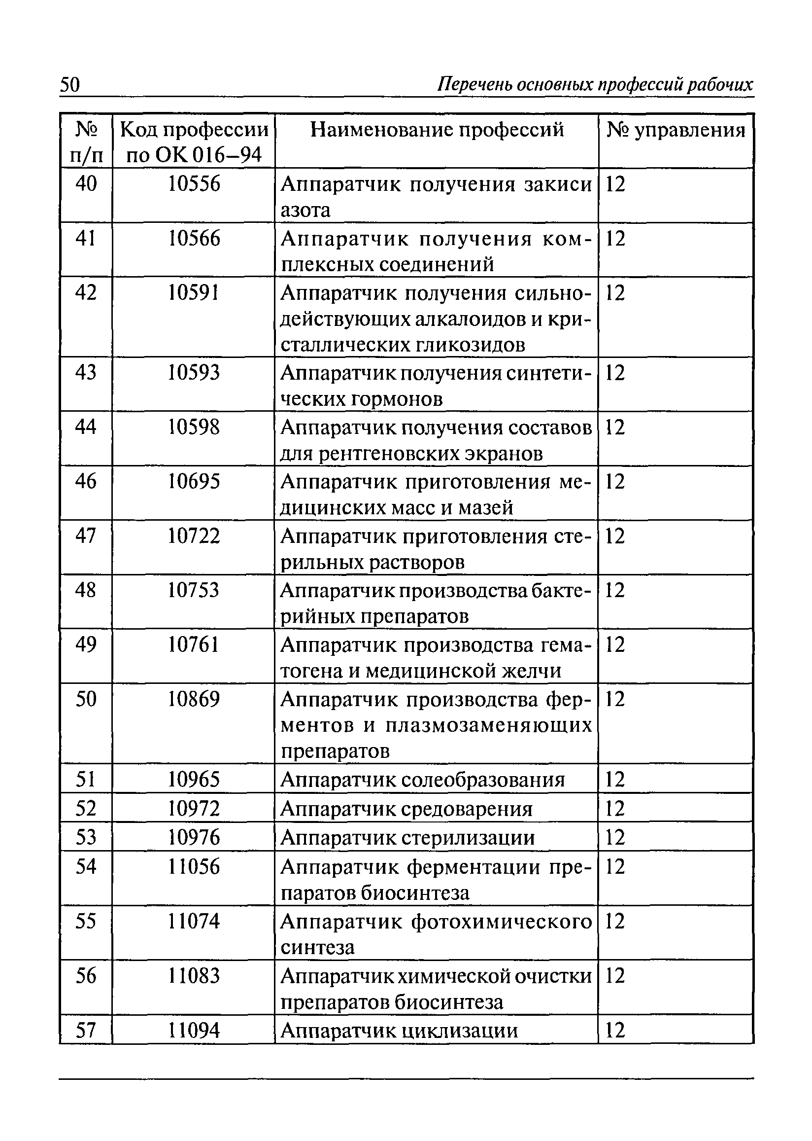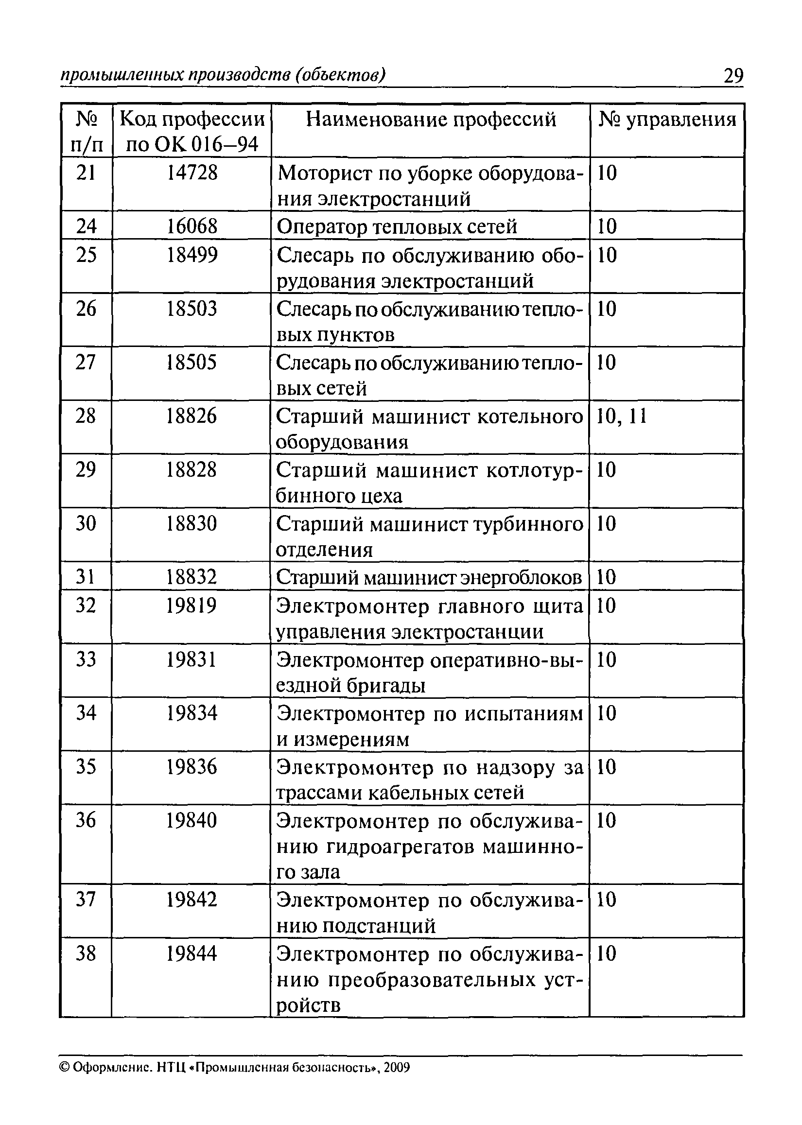 Перечень основных профессий рабочих промышленных производств (объектов), программы обучения которых должны согласовываться с органами федеральной службы по экологическому, технологическому и атомному надзору| Статус: | утратил силу | | Название рус.: | Перечень основных профессий рабочих промышленных производств (объектов), программы обучения которых должны согласовываться с органами федеральной службы по экологическому, технологическому и атомному надзору | | Дата добавления в базу: | 01.09.2013 | | Дата актуализации: | 01.01.2021 | | Дата введения: | 29.12.2006 | | Дата окончания срока действия: | 19.08.2015 | | Область применения: | Перечень разработан в целях систематизации деятельности в области профессионального обучения. Перечень приведен в соответствии с действующими нормативными правовыми актами, определяющими сферу деятельности Федеральной службы по экологическому, технологическому и атомному надзору. | | Оглавление: | ЕТКС. Выпуск 01. Профессии рабочих, общие для всех отраслей экономики ЕТКС. Выпуск 02. ЕТКС. Выпуск 03. Строительные, монтажные и ремонтно-строительные работы ЕТКС. Выпуск 04. Горные работы ЕТКС. Выпуск 06. Добыча нефти и газа ЕТКС. Выпуск 07. Черная металлургия ЕТКС. Выпуск 08. Цветная металлургия ЕТКС. Выпуск 09. Эксплуатация оборудования электростанций и сетей и др. ЕТКС. Выпуск 17. Производство абразивов ЕТКС. Выпуск 19. Электротехническое производство ЕТКС. Выпуск 22. Производство и ремонт летательных аппаратов ЕТКС. Выпуск 23. Судостроение ЕТКС. Выпуск 24. Химическое производство ЕТКС. Выпуск 25. Азотное производство ЕТКС. Выпуск 26. Анилинокрасочное производство ЕТКС. Выпуск 27. Производство синтетических смол и др. ЕТКС. Выпуск 28 (28, 29). Производство стекловолокон и др. ЕТКС. Выпуск 29. (30, 31). Гидролизное производство ЕТКС. Выпуск 30. (32). Производство синтетических каучуков и др. ЕТКС. Выпуск 31. (33). Производство резиновых изделий ЕТКС. Выпуск 32 (34). Химико-фотографическое производство ЕТКС. Выпуск 33 (35). Производство искусственной кожи ЕТКС. Выпуск 34 (36). Переработка нефти ЕТКС. Выпуск 36 (38). Производство асбестовых технических изделий ЕТКС. Выпуск 37 (39). Лесозаготовительные работы ЕТКС. Выпуск 39 (41). Производство целлюлозы и др. ЕТКС. Выпуск 40 (42, 43). Производство строительных материалов ЕТКС. Выпуск 41 (44). Производство стекла стеклоизделий ЕТКС. Выпуск 42 (45). Производство керамических, фарфоровых и других изделий ЕТКС. Выпуск 44 (47). Производство текстиля ЕТКС. Выпуск 45 (48). Легкая промышленность ЕТКС. Выпуск 48 (51). Производство пищевой продукции ЕТКС. Выпуск 49 (52). Производства мясных, молочных и других продуктов ЕТКС. Выпуск 51 (53, 55). Производства: алкогольной и безалкогольной продукции; хлебопекарно-макаронное; сахара; табака; эфирномасляничное; чая; консервов; парфюмерно-косметическое; поваренной соли; общественное питание и торговля и др. ЕТКС. Выпуск 52 (56). Транспорт (железнодорожный, автомобильный, городской, морской, речной, метрополитен) ЕТКС. Выпуск 54 (58). Связь ЕТКС. Выпуск 63 (69). Газовое, водопроводно-канализационное и зеленое хозяйства Категория 73 Наименования управлений | | Утверждён: | 29.12.2006 Федеральная служба по экологическому, технологическому и атомному надзору (1154)